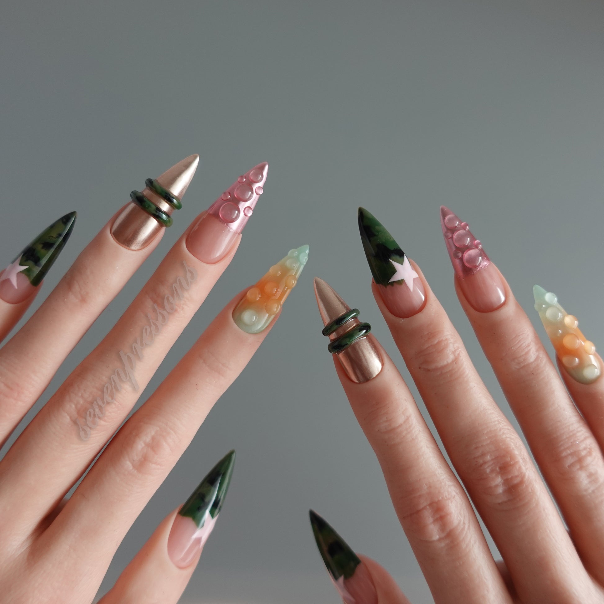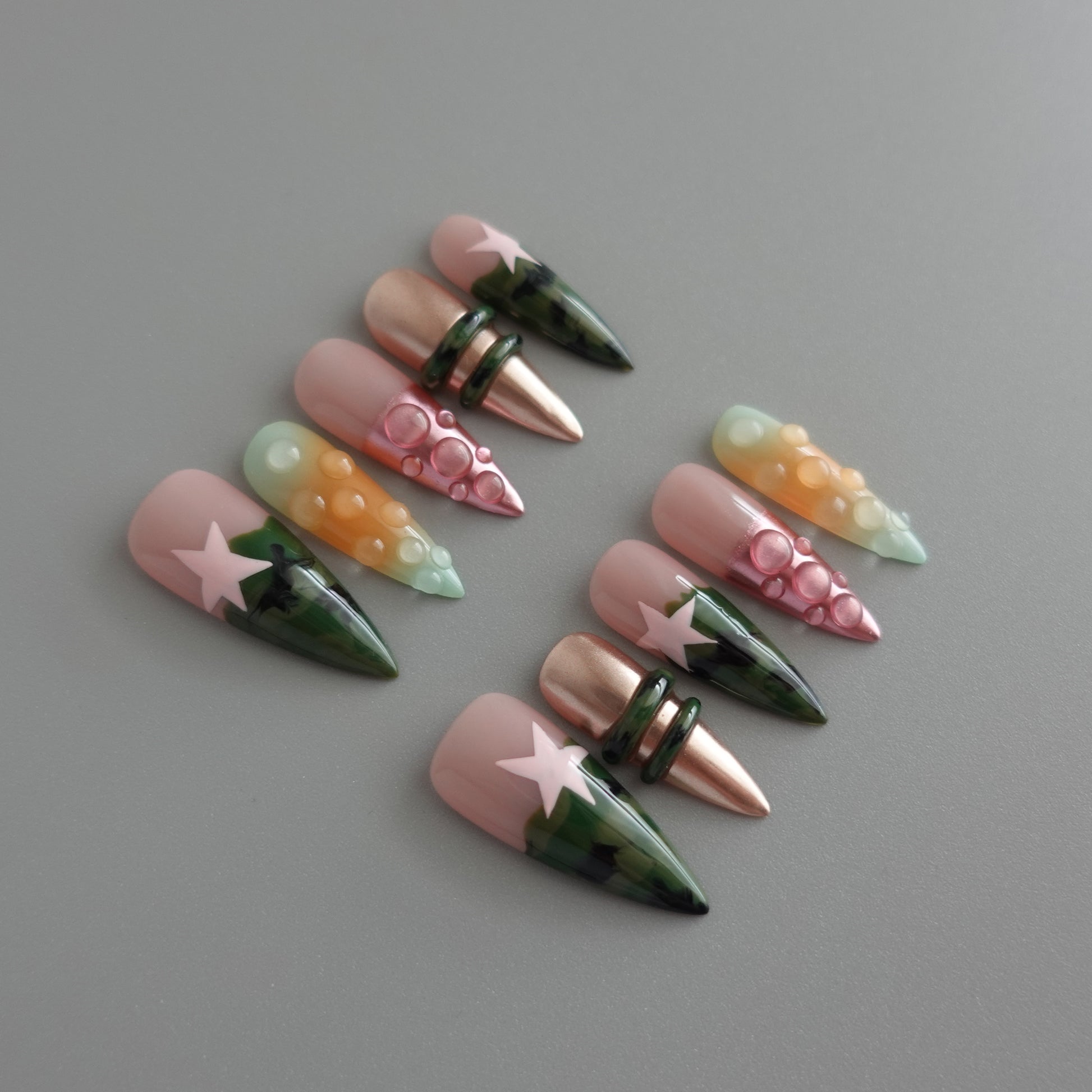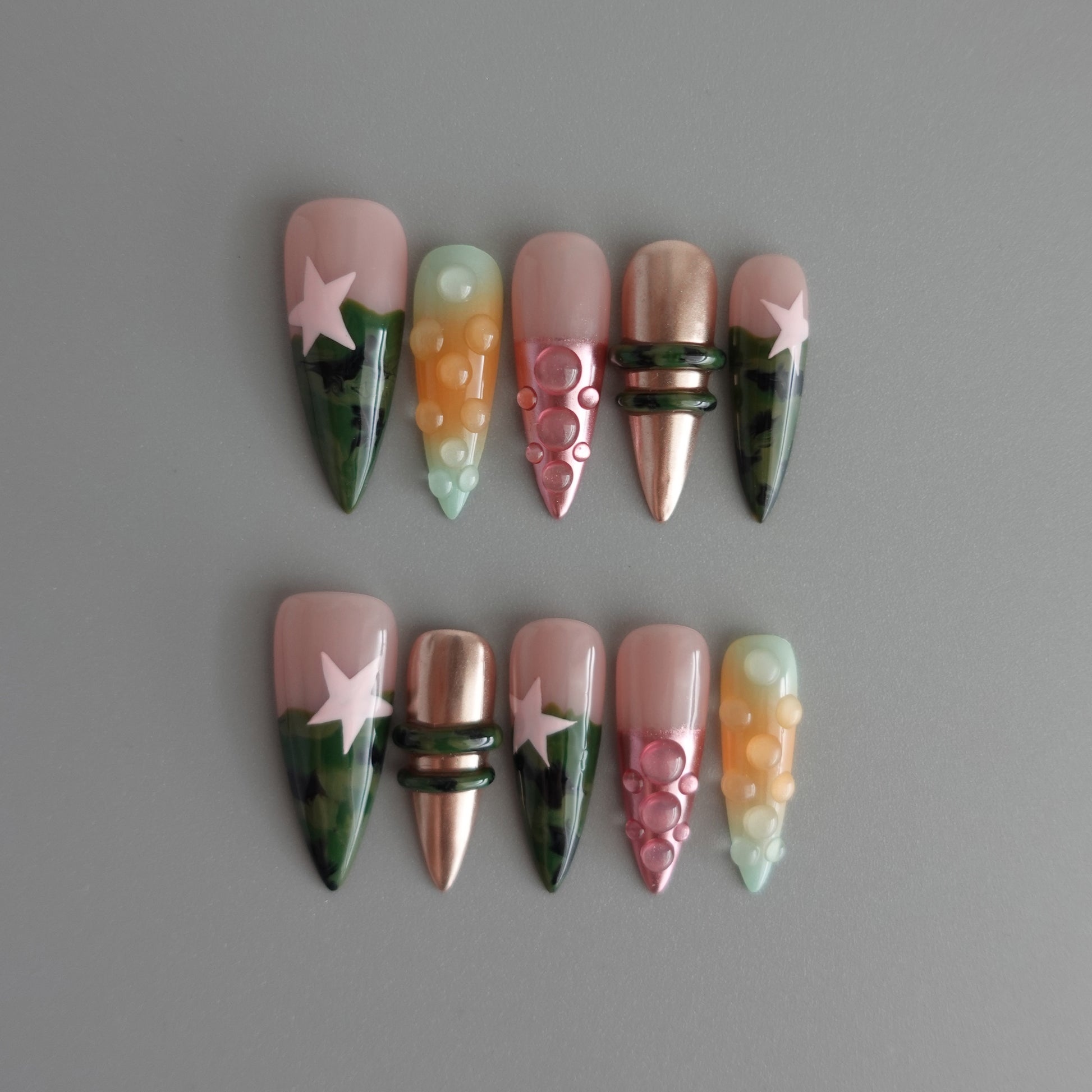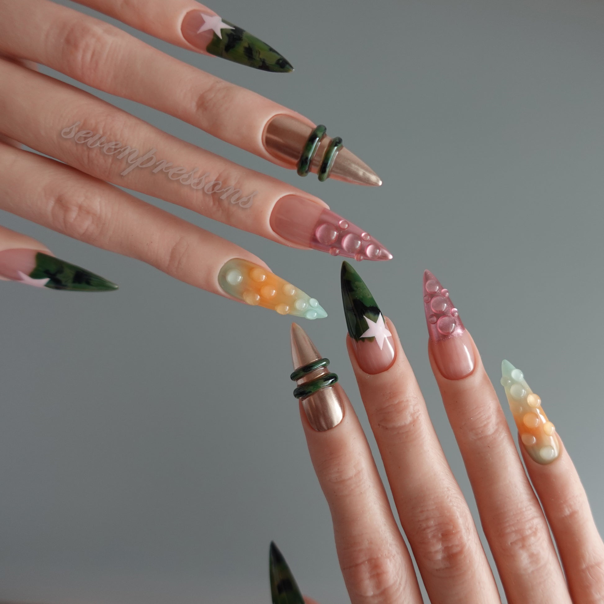 Playful, surreal, and deliciously retro-futuristic โ Galactic Pop is a cosmic candy dream in motion. Metallic bronze spikes meet bubblegum gradients of mint, tangerine, and rose pink, accented with glossy bubble domes and jade-like rings. Camouflage greens and pastel stars add a twist of mischief, like stardust mixed with soda fizz. A perfect balance of pop-art energy and alien chic โ for those who orbit style itself.