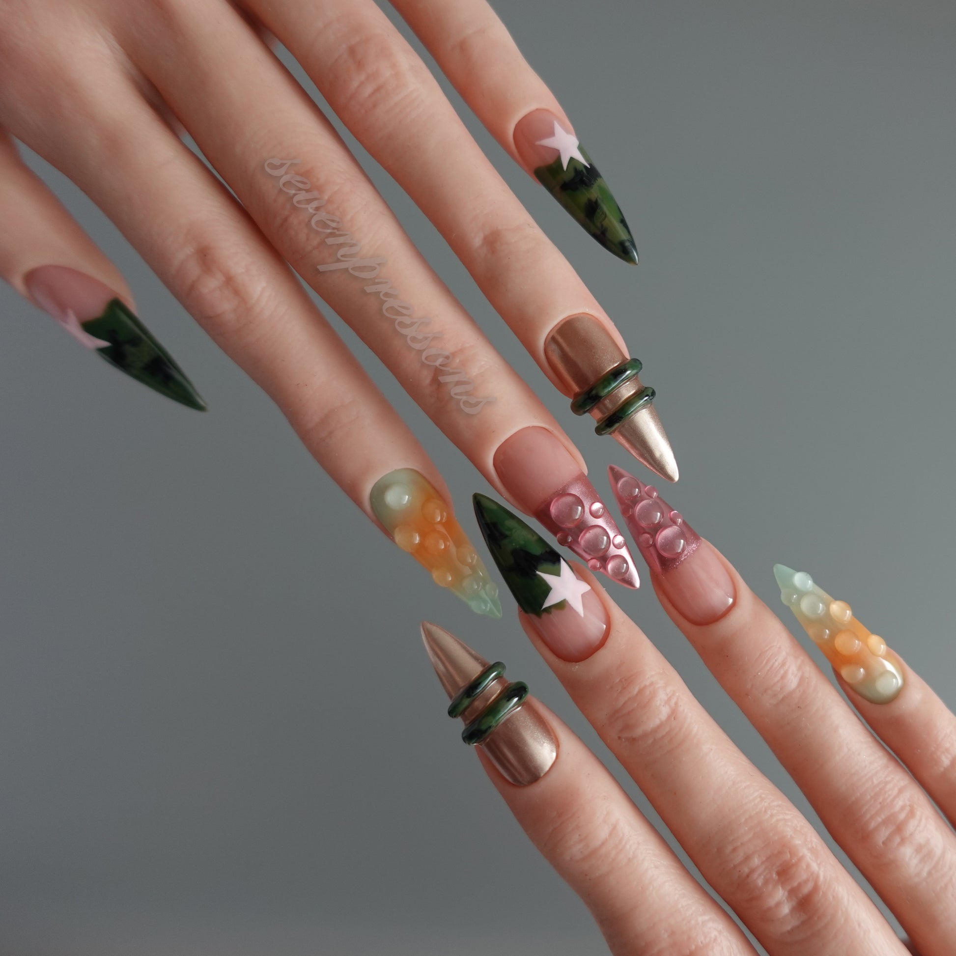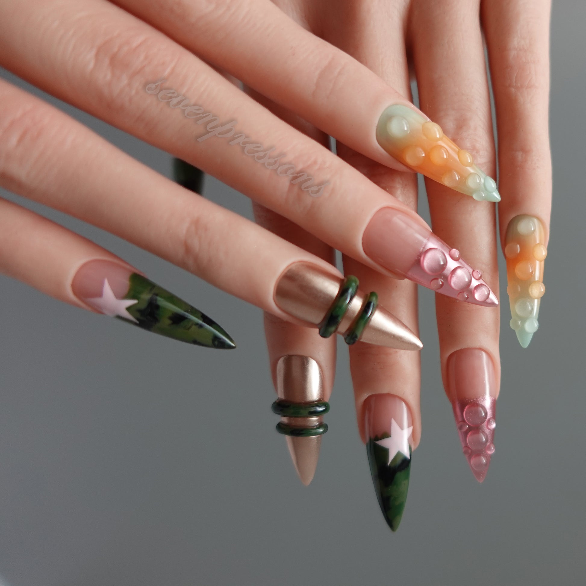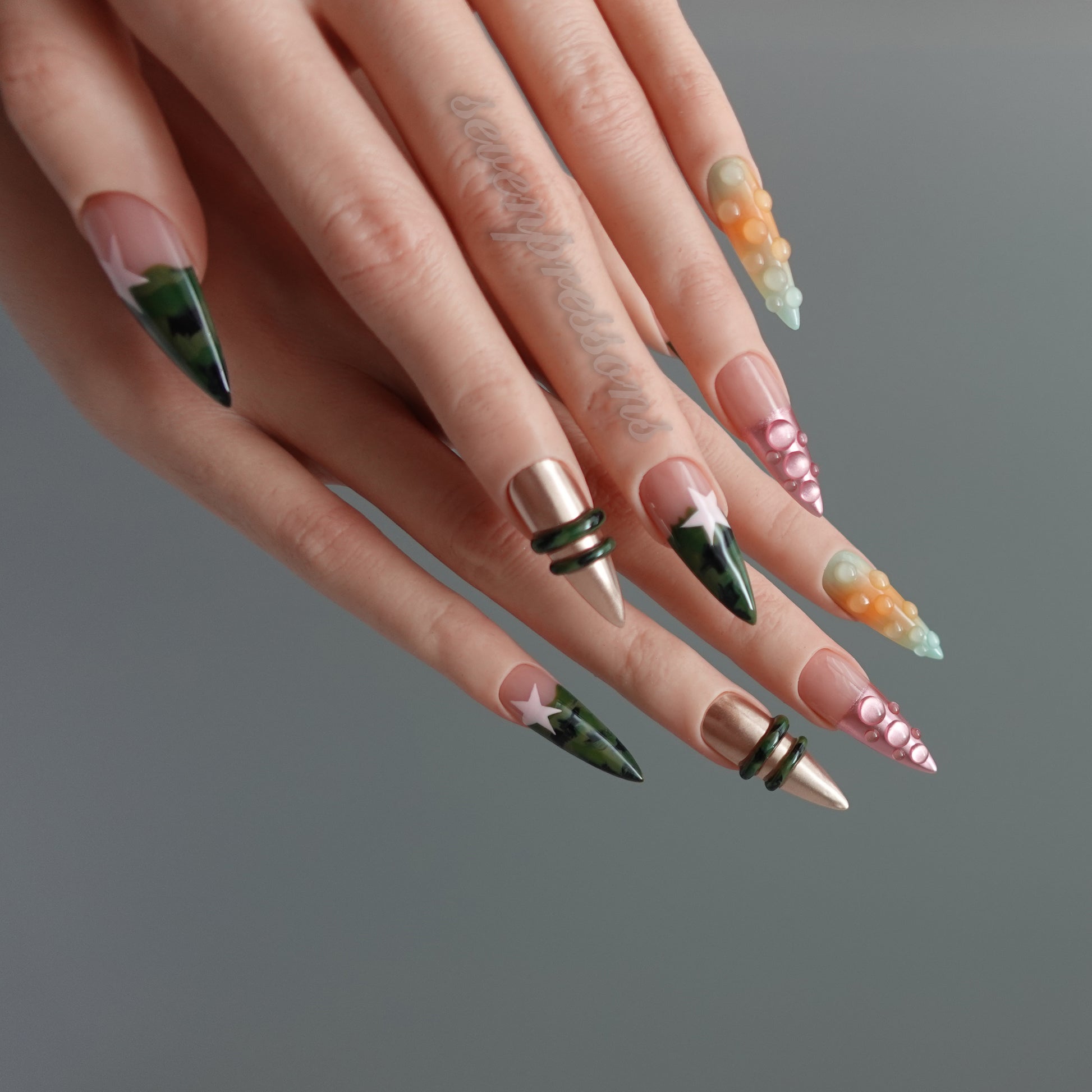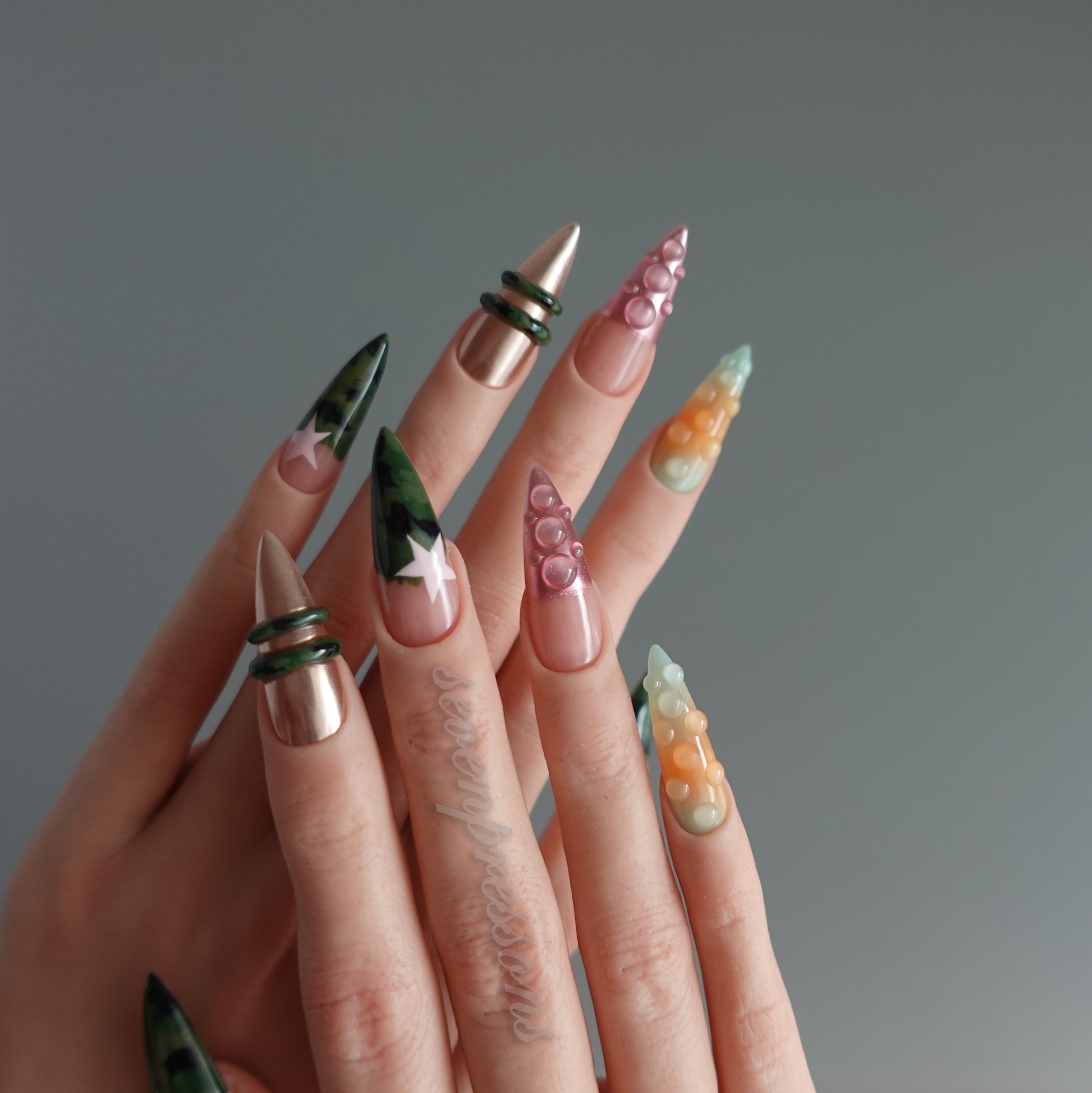 Playful, surreal, and deliciously retro-futuristic โ Galactic Pop is a cosmic candy dream in motion. Metallic bronze spikes meet bubblegum gradients of mint, tangerine, and rose pink, accented with glossy bubble domes and jade-like rings. Camouflage greens and pastel stars add a twist of mischief, like stardust mixed with soda fizz. A perfect balance of pop-art energy and alien chic โ for those who orbit style itself.