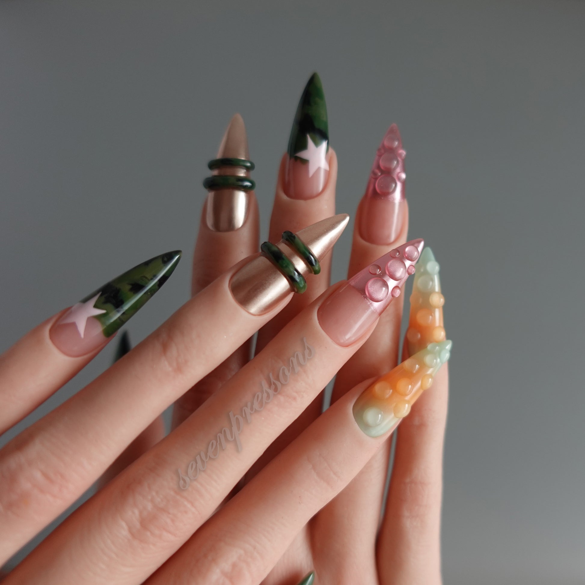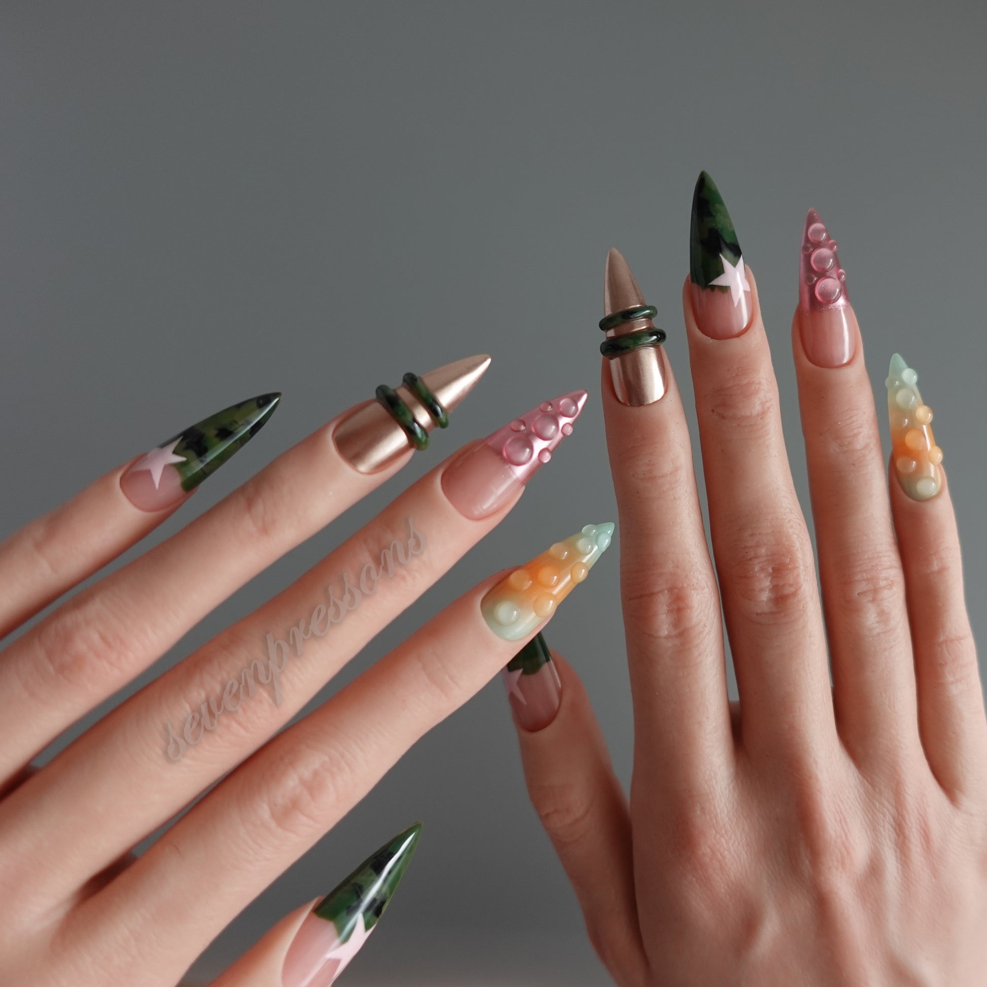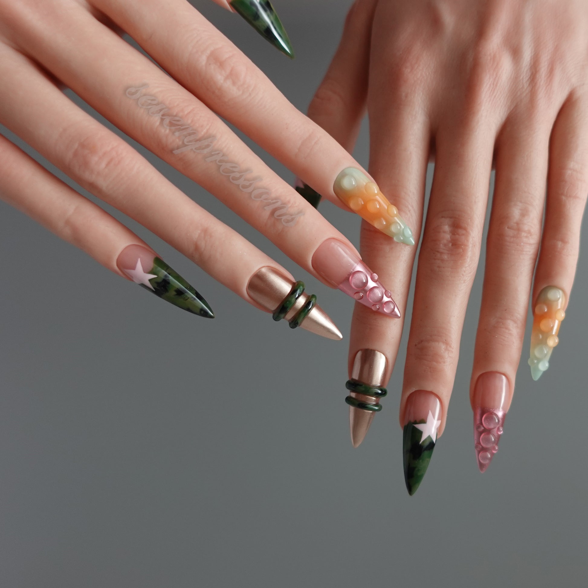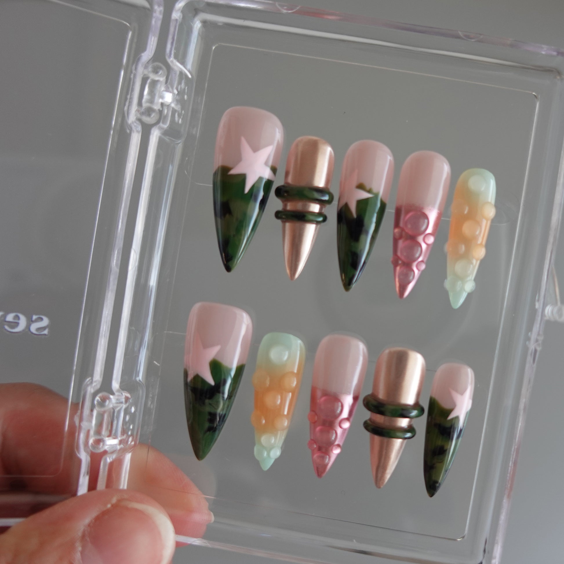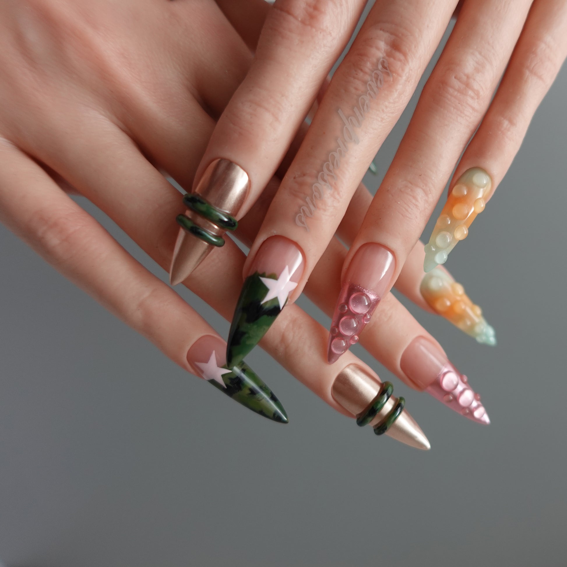 Playful, surreal, and deliciously retro-futuristic โ Galactic Pop is a cosmic candy dream in motion. Metallic bronze spikes meet bubblegum gradients of mint, tangerine, and rose pink, accented with glossy bubble domes and jade-like rings. Camouflage greens and pastel stars add a twist of mischief, like stardust mixed with soda fizz. A perfect balance of pop-art energy and alien chic โ for those who orbit style itself.