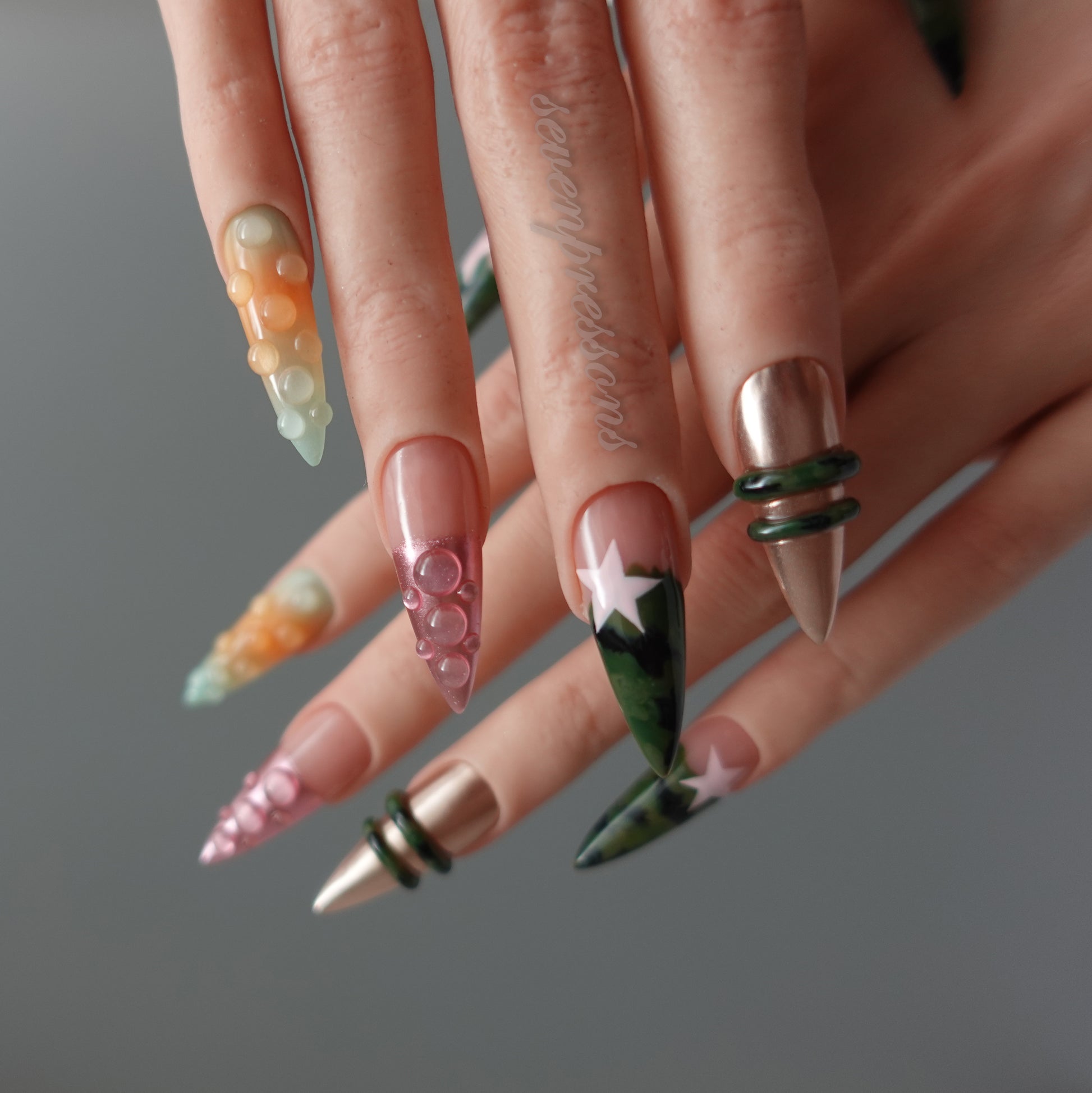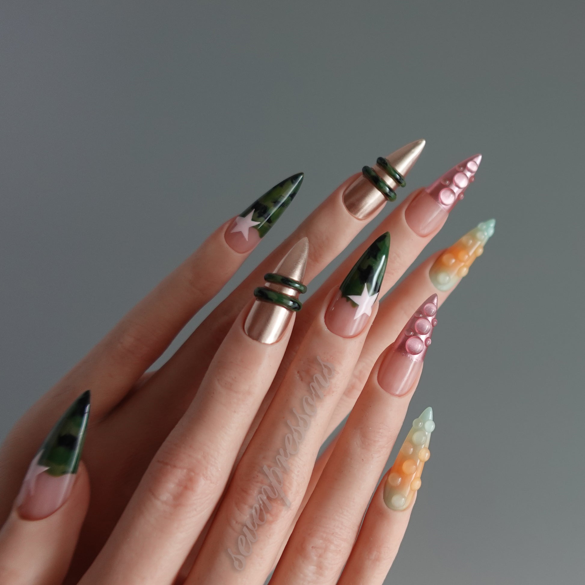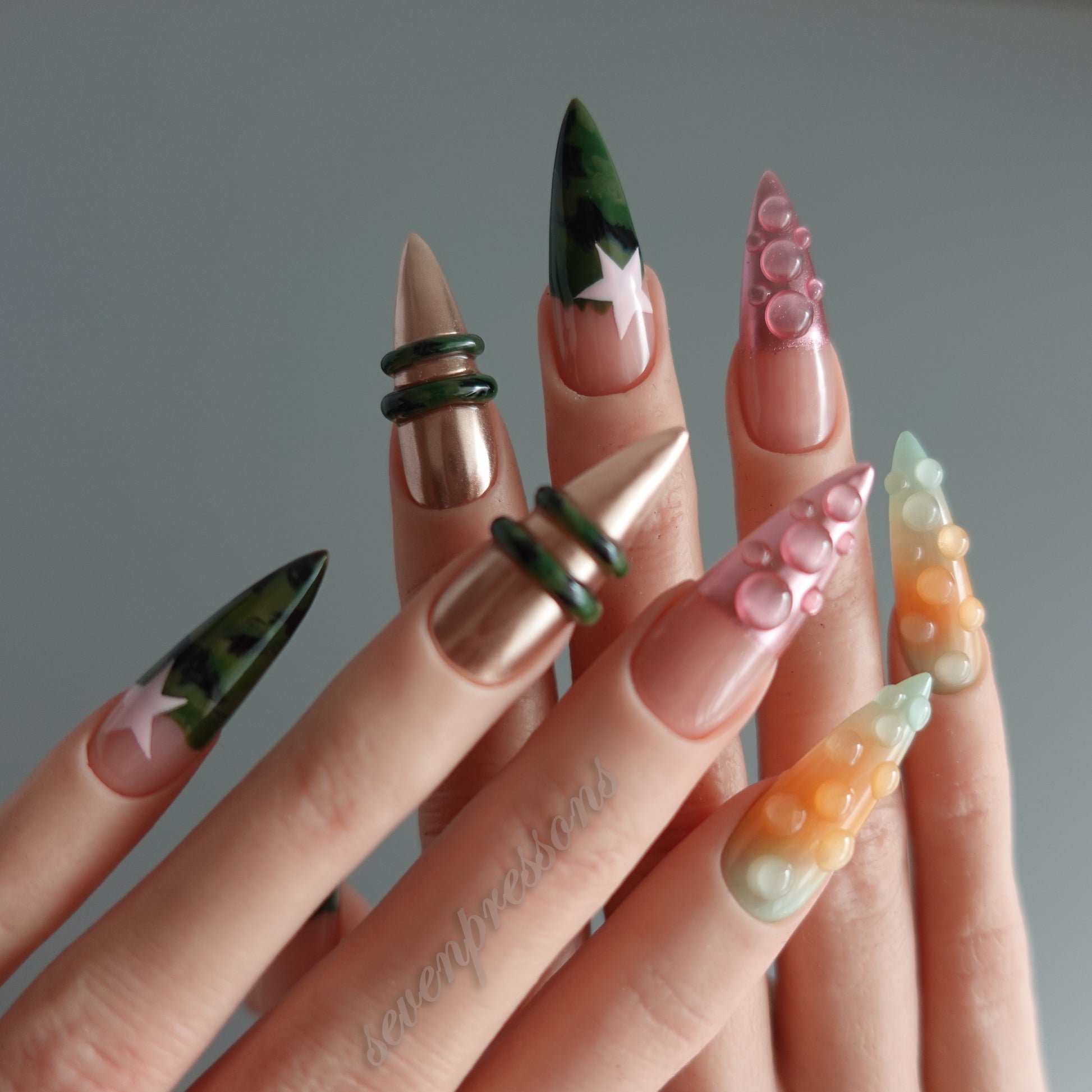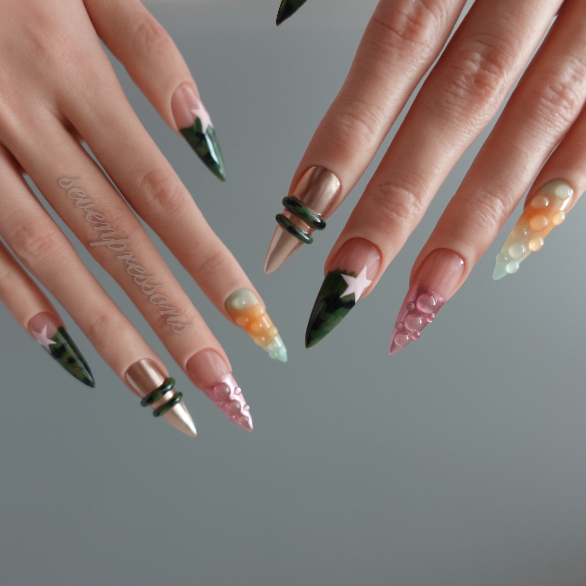 Playful, surreal, and deliciously retro-futuristic โ Galactic Pop is a cosmic candy dream in motion. Metallic bronze spikes meet bubblegum gradients of mint, tangerine, and rose pink, accented with glossy bubble domes and jade-like rings. Camouflage greens and pastel stars add a twist of mischief, like stardust mixed with soda fizz. A perfect balance of pop-art energy and alien chic โ for those who orbit style itself.