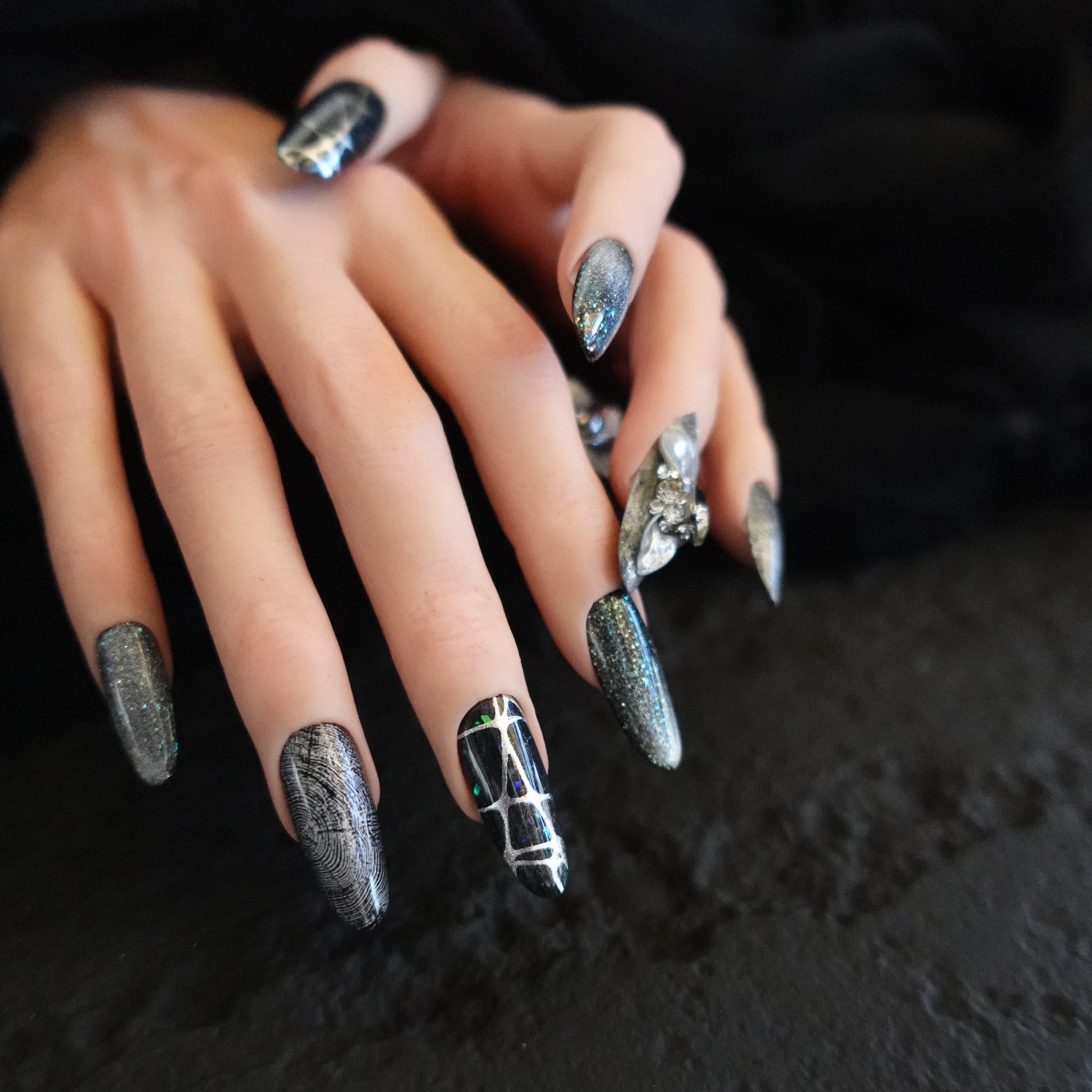 Black chrome meets holographic webbing, etched metallic spirals, and glistening graphite gradients โ€” all anchored by two sculptural silver florals crowned with obsidian-like gems.