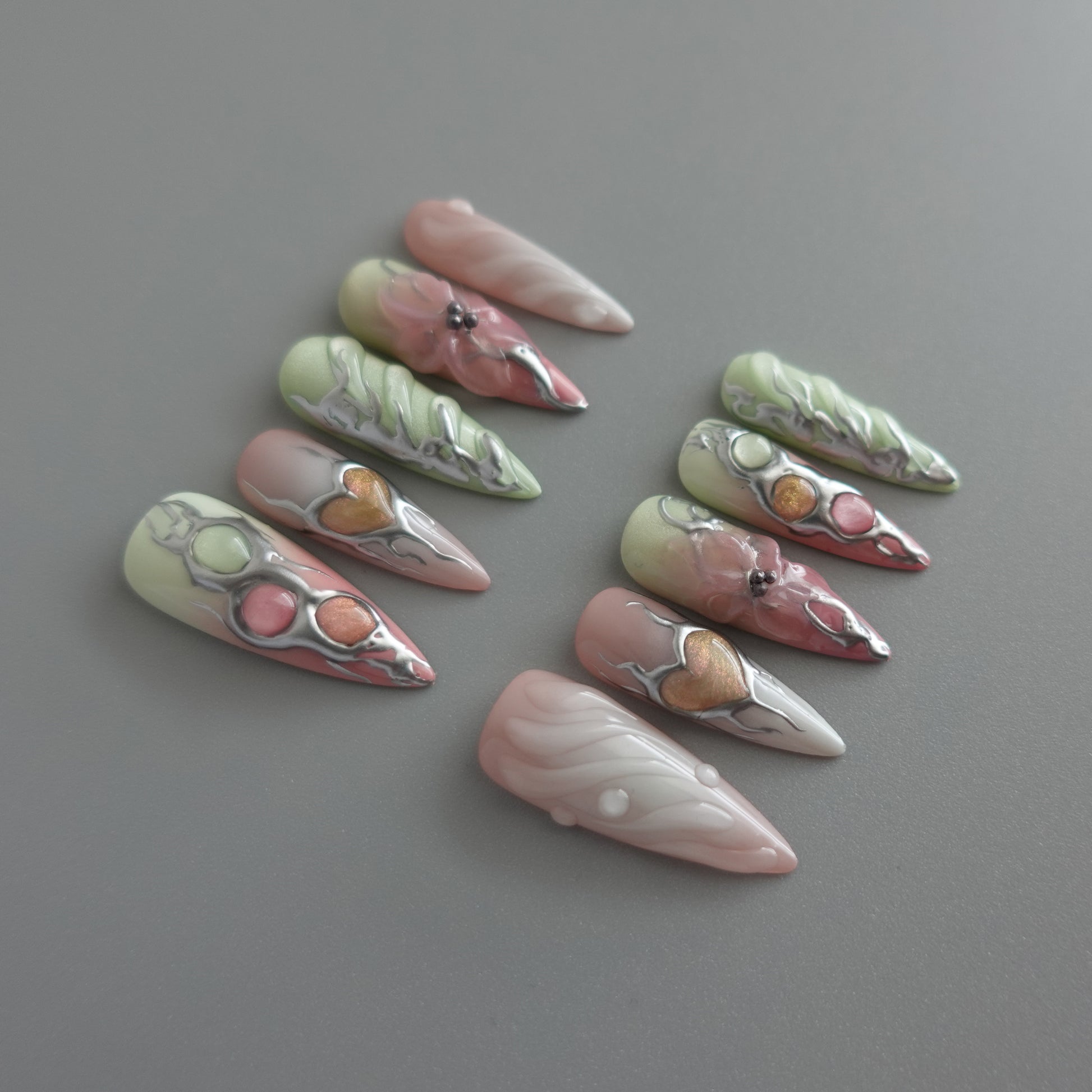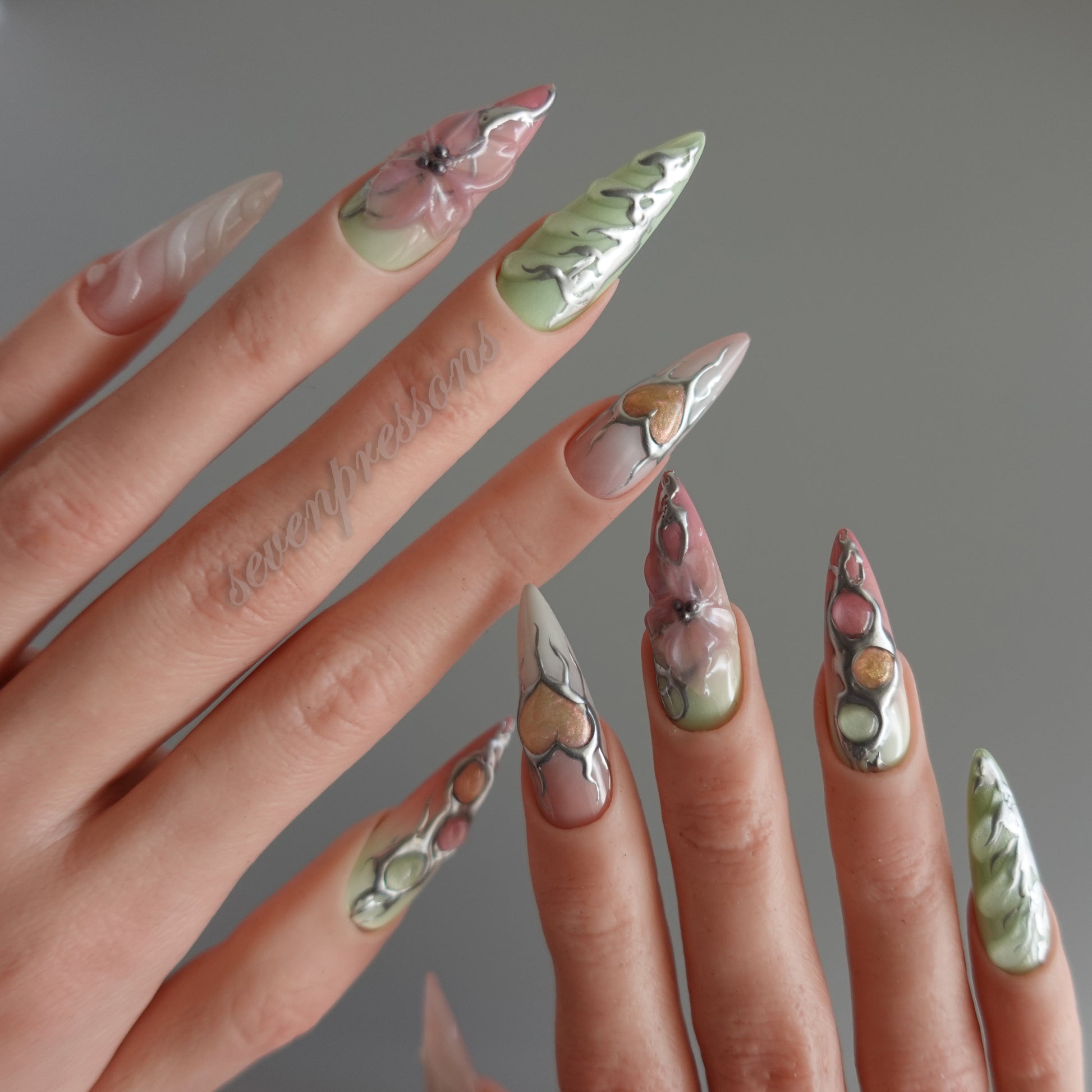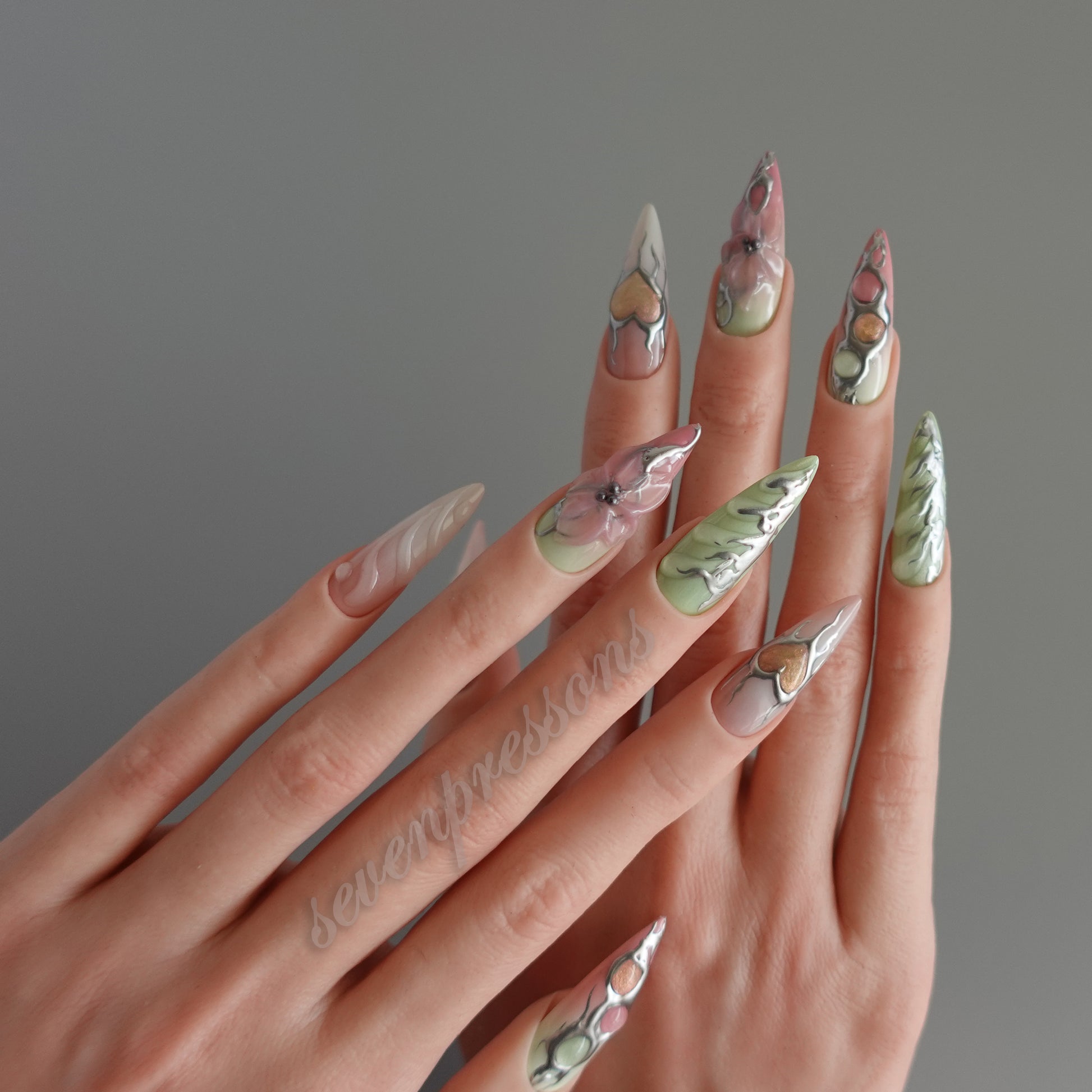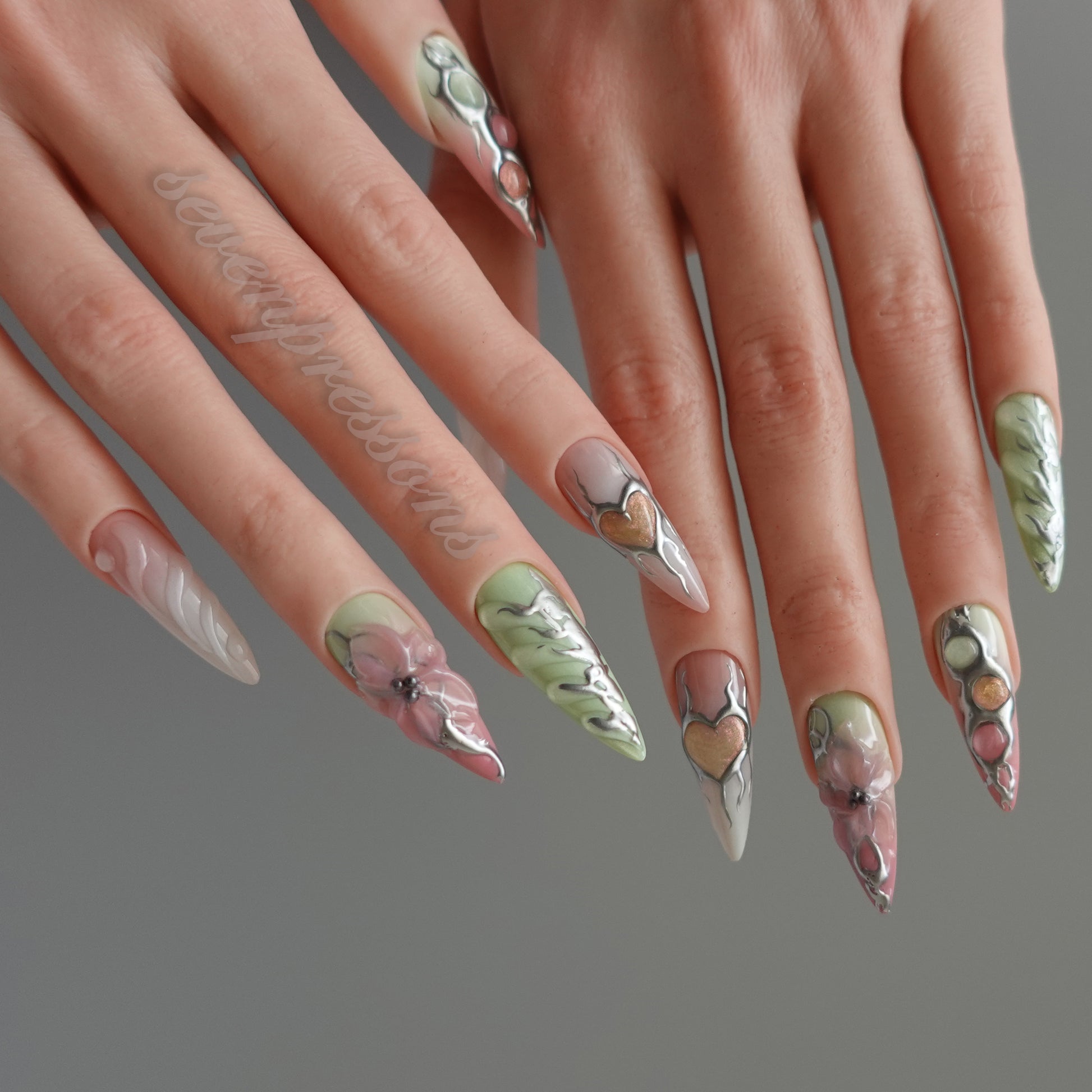 Molten Bloom captures the moment where nature melts into metal — where petals meet chrome, and softness burns with brilliance. Shades of blush pink and spring green flow together beneath sculpted silver veins, cradling iridescent orbs and molten hearts. Each petal and ripple feels alive, as if formed by fire and bloom. A delicate chaos for the dreamers who thrive in contrast — organic yet futuristic, tender yet untamed.