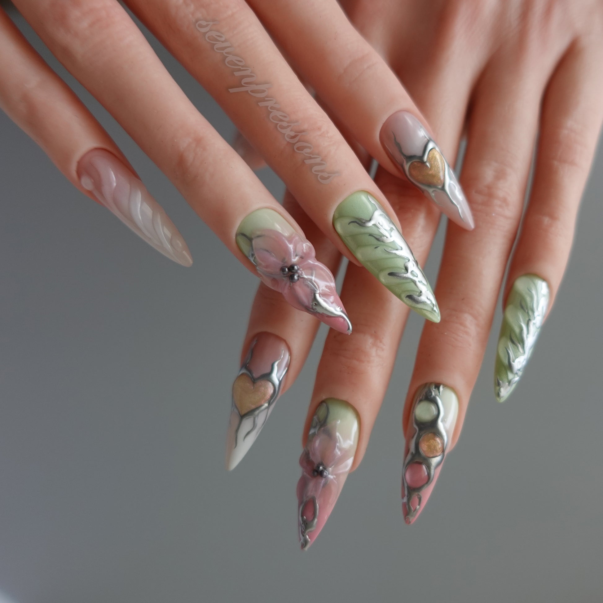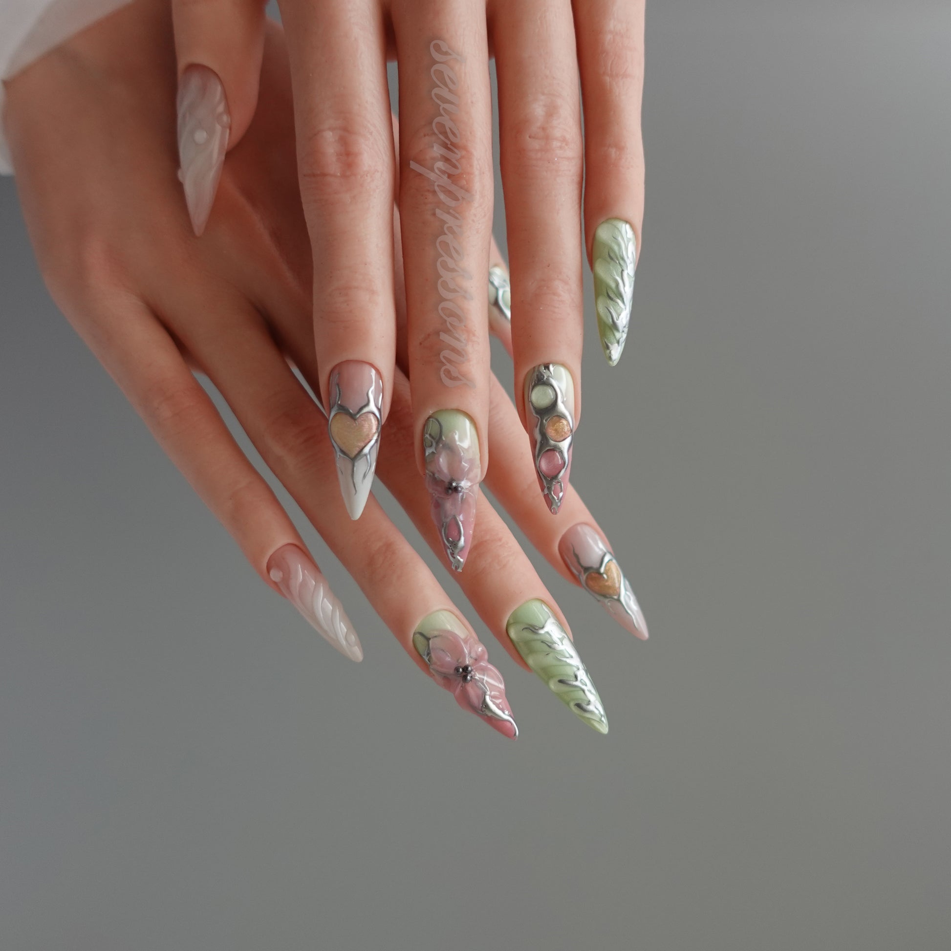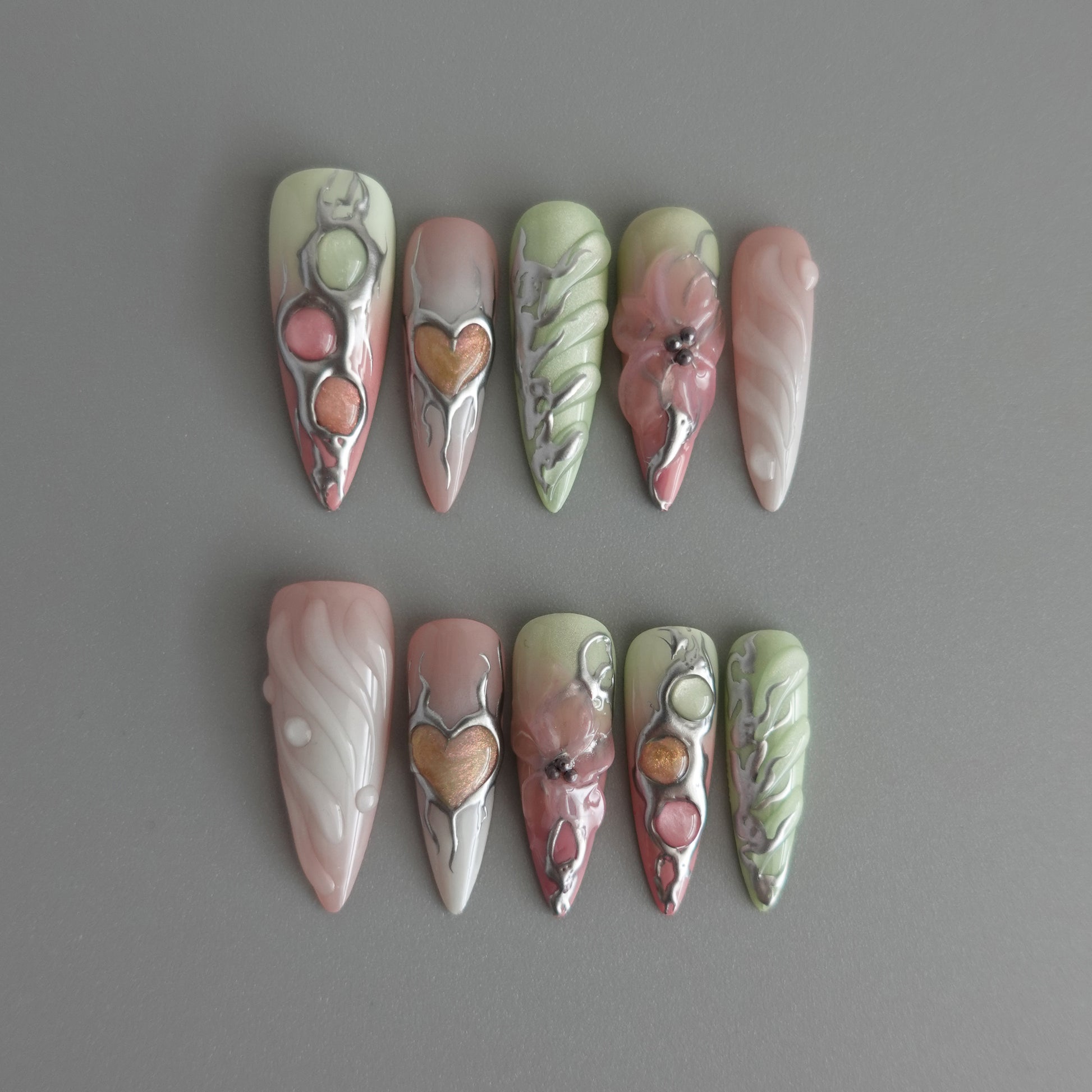 Molten Bloom captures the moment where nature melts into metal — where petals meet chrome, and softness burns with brilliance. Shades of blush pink and spring green flow together beneath sculpted silver veins, cradling iridescent orbs and molten hearts. Each petal and ripple feels alive, as if formed by fire and bloom. A delicate chaos for the dreamers who thrive in contrast — organic yet futuristic, tender yet untamed.