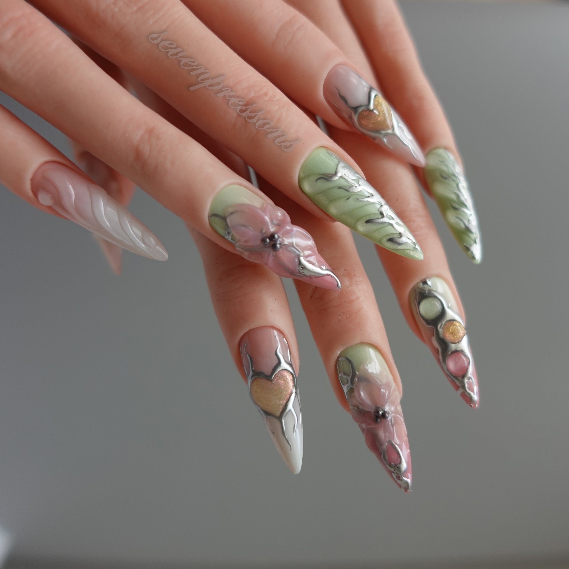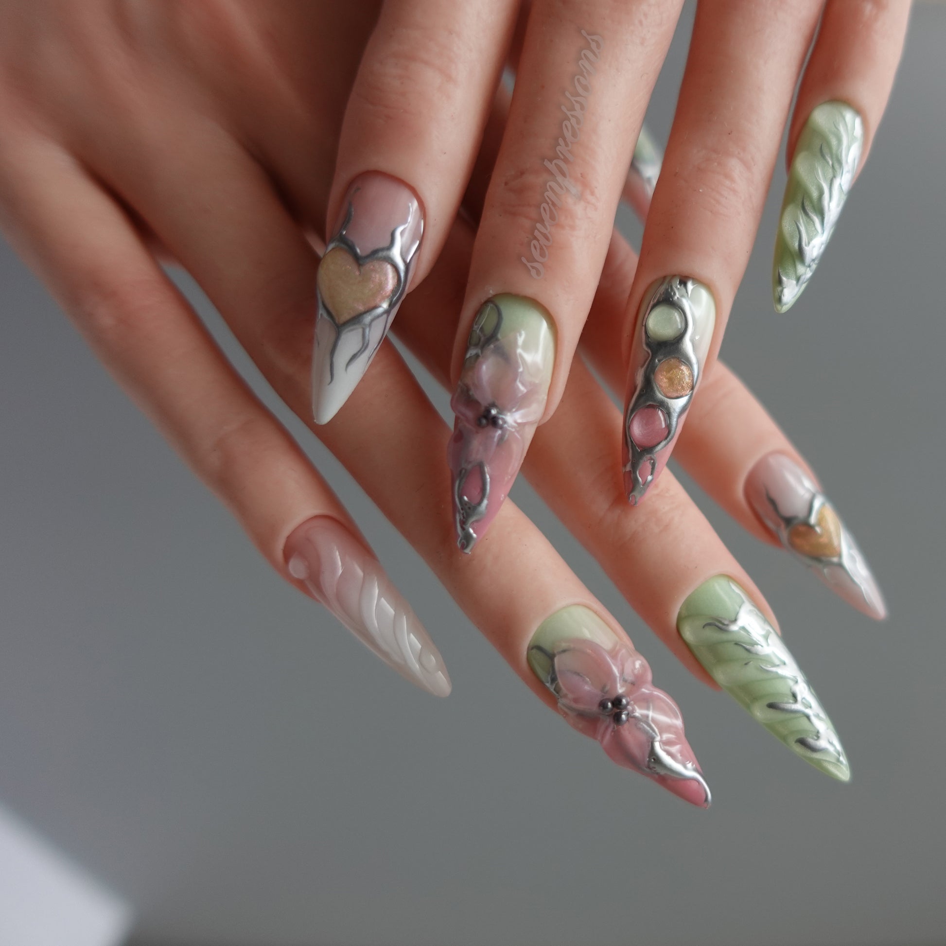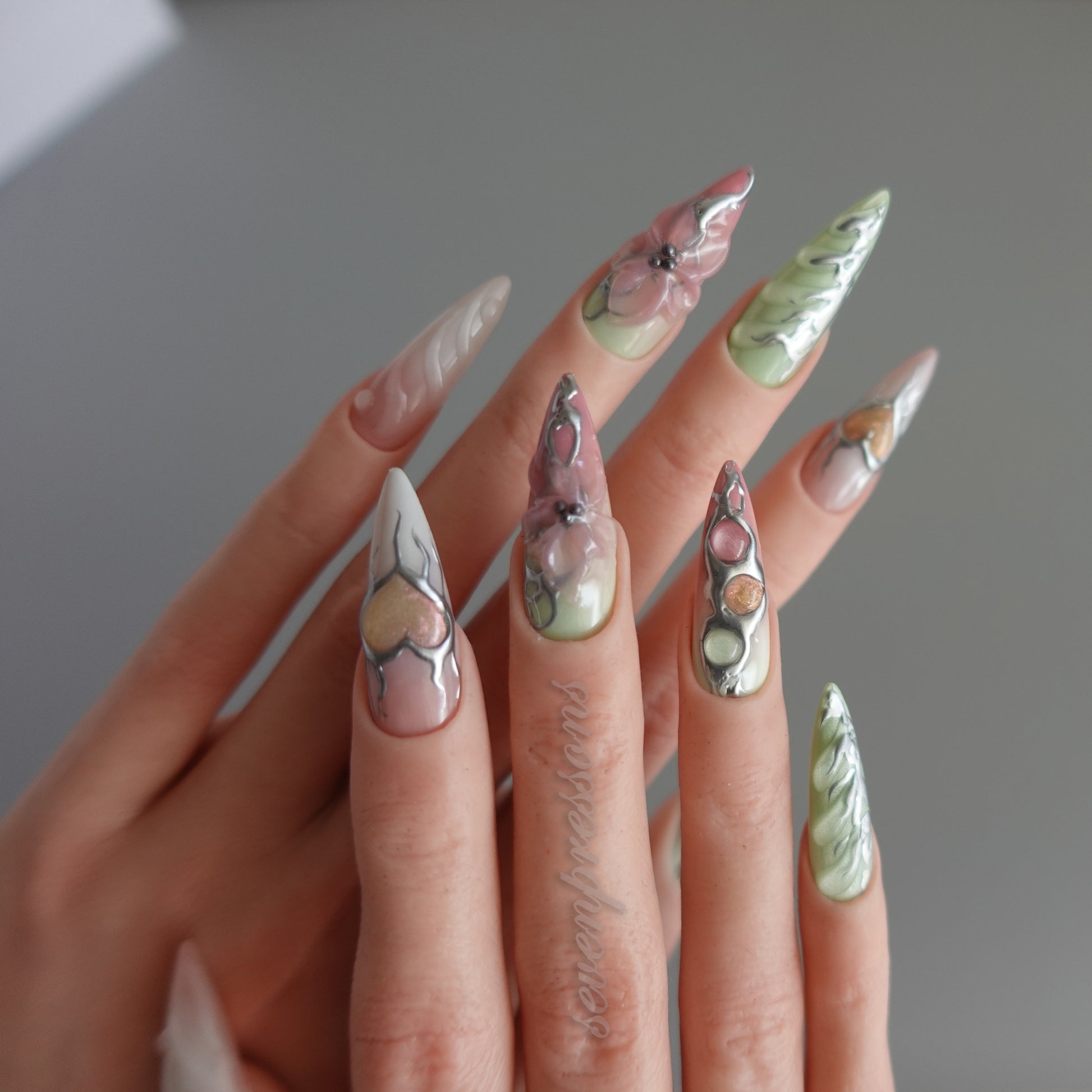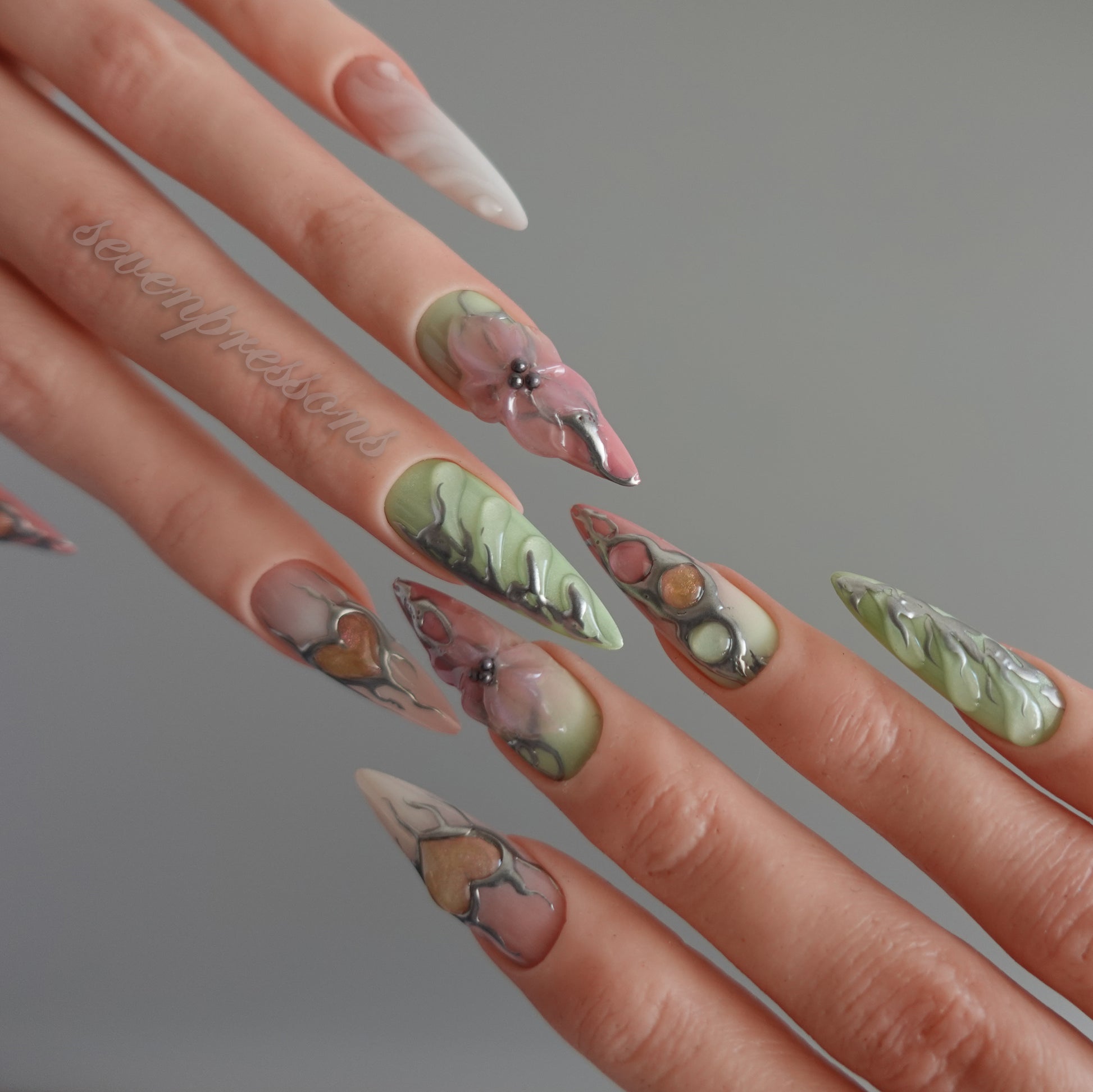 Molten Bloom captures the moment where nature melts into metal — where petals meet chrome, and softness burns with brilliance. Shades of blush pink and spring green flow together beneath sculpted silver veins, cradling iridescent orbs and molten hearts. Each petal and ripple feels alive, as if formed by fire and bloom. A delicate chaos for the dreamers who thrive in contrast — organic yet futuristic, tender yet untamed.