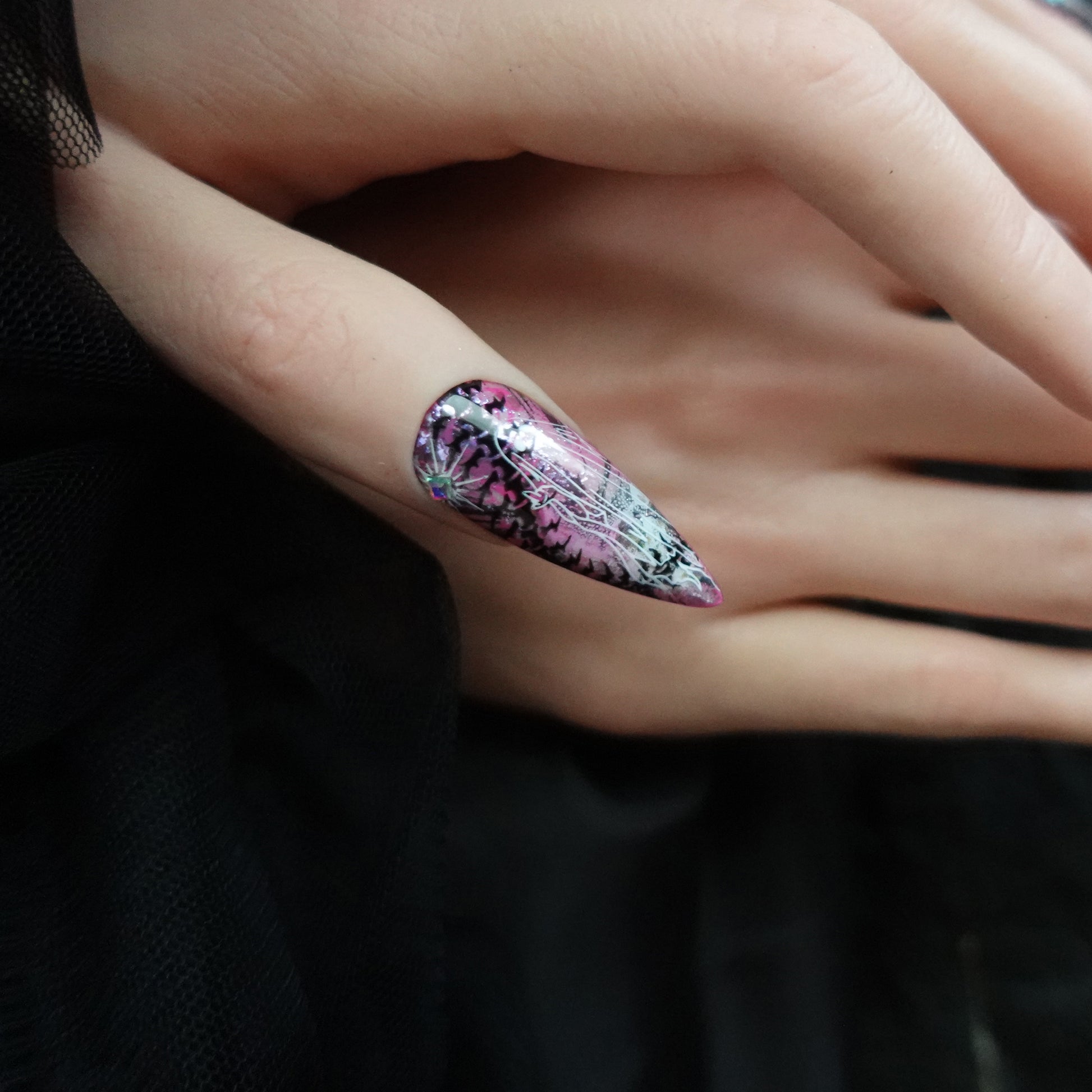 Candy Crypt is a rebellious collision of neon pink chaos and gothic darkness โ where skeletons dance, spiders crawl, and fractured bones are scattered across a sugar-spun backdrop. The graffiti-style splatter art and holographic flashes make every nail a miniature haunted mural.