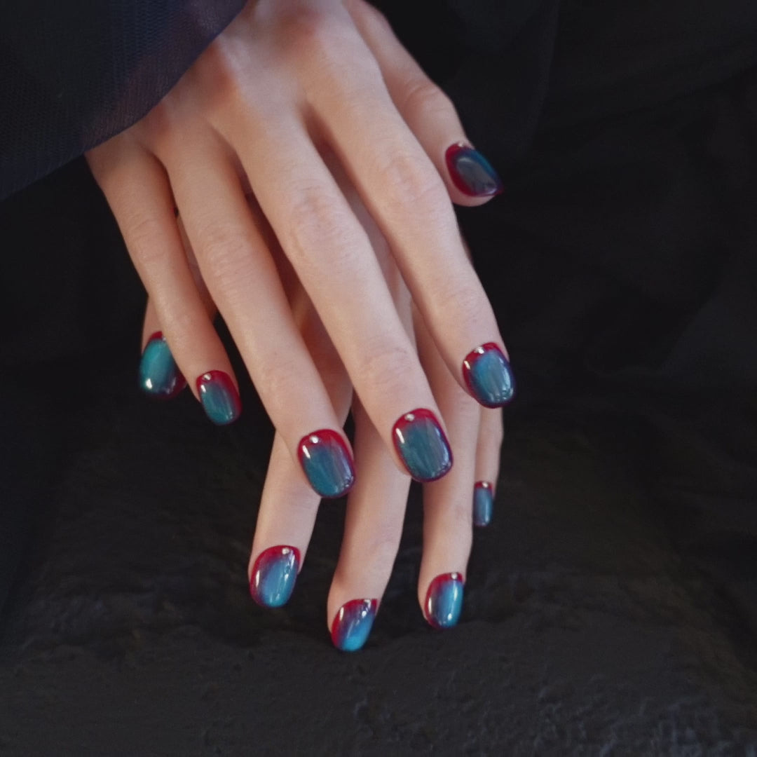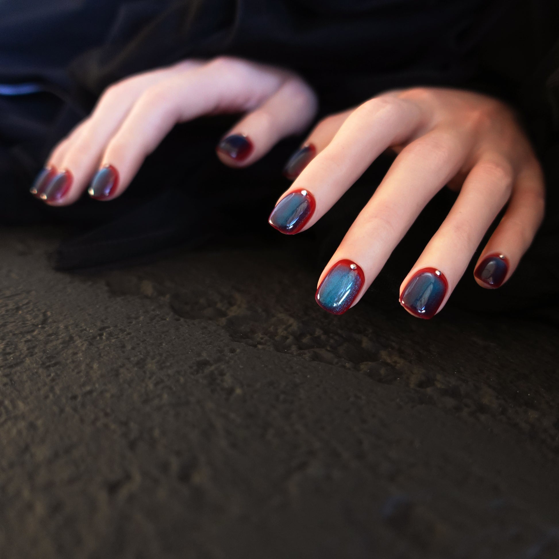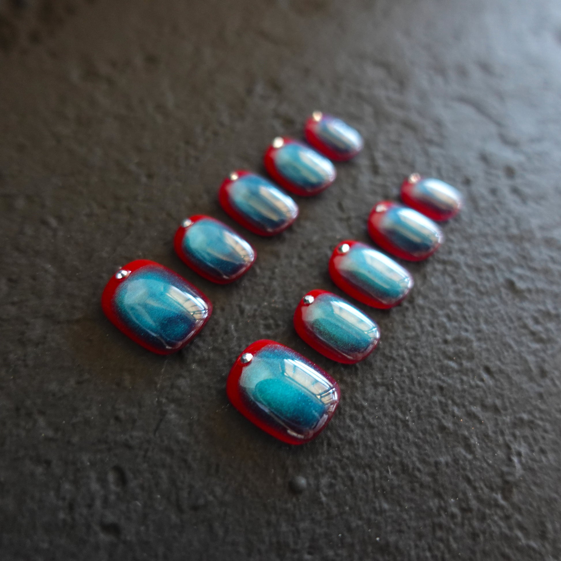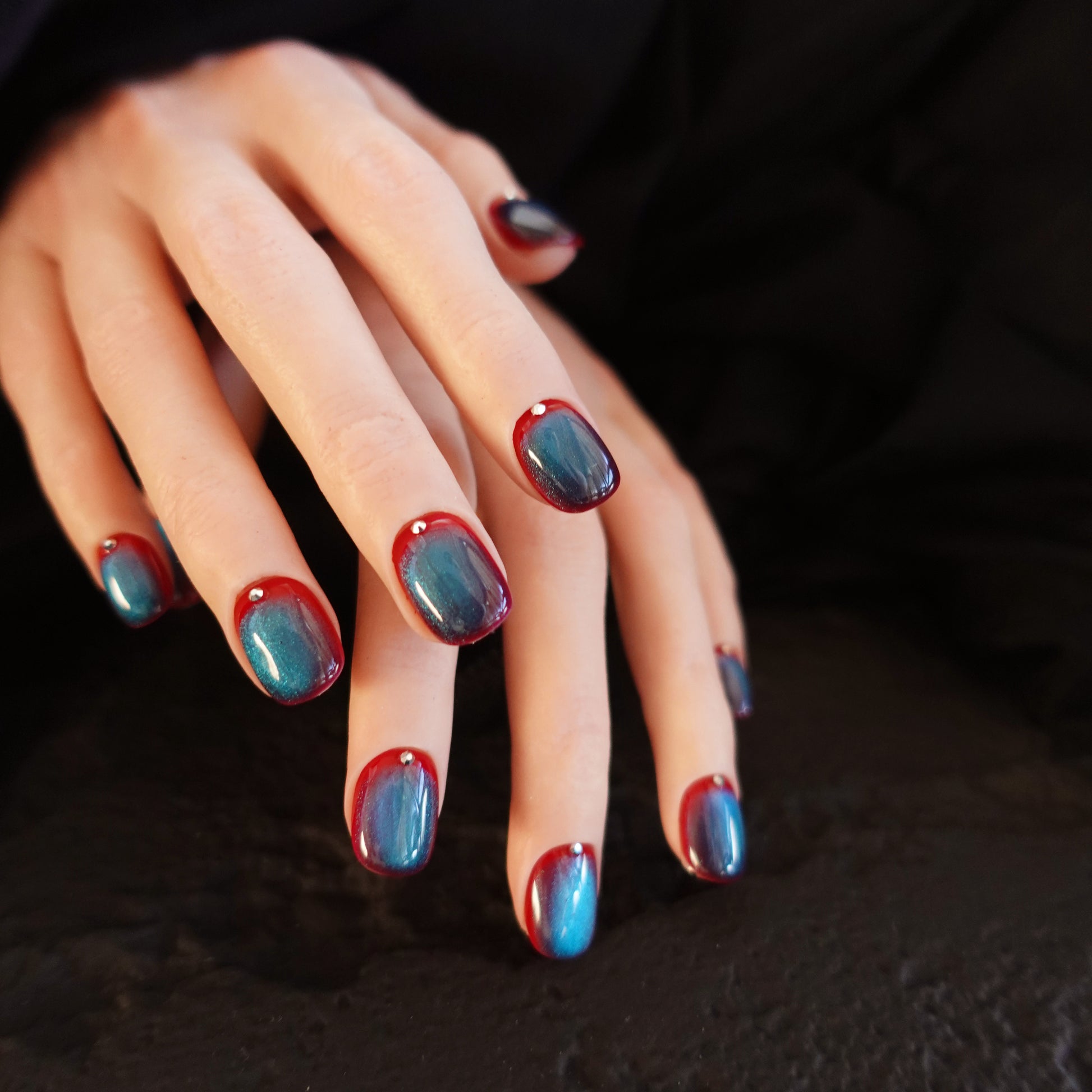 A rich sapphire blue core glows with shimmer beneath a blood-red border, each nail crowned with a delicate crystal gem for subtle sparkle.