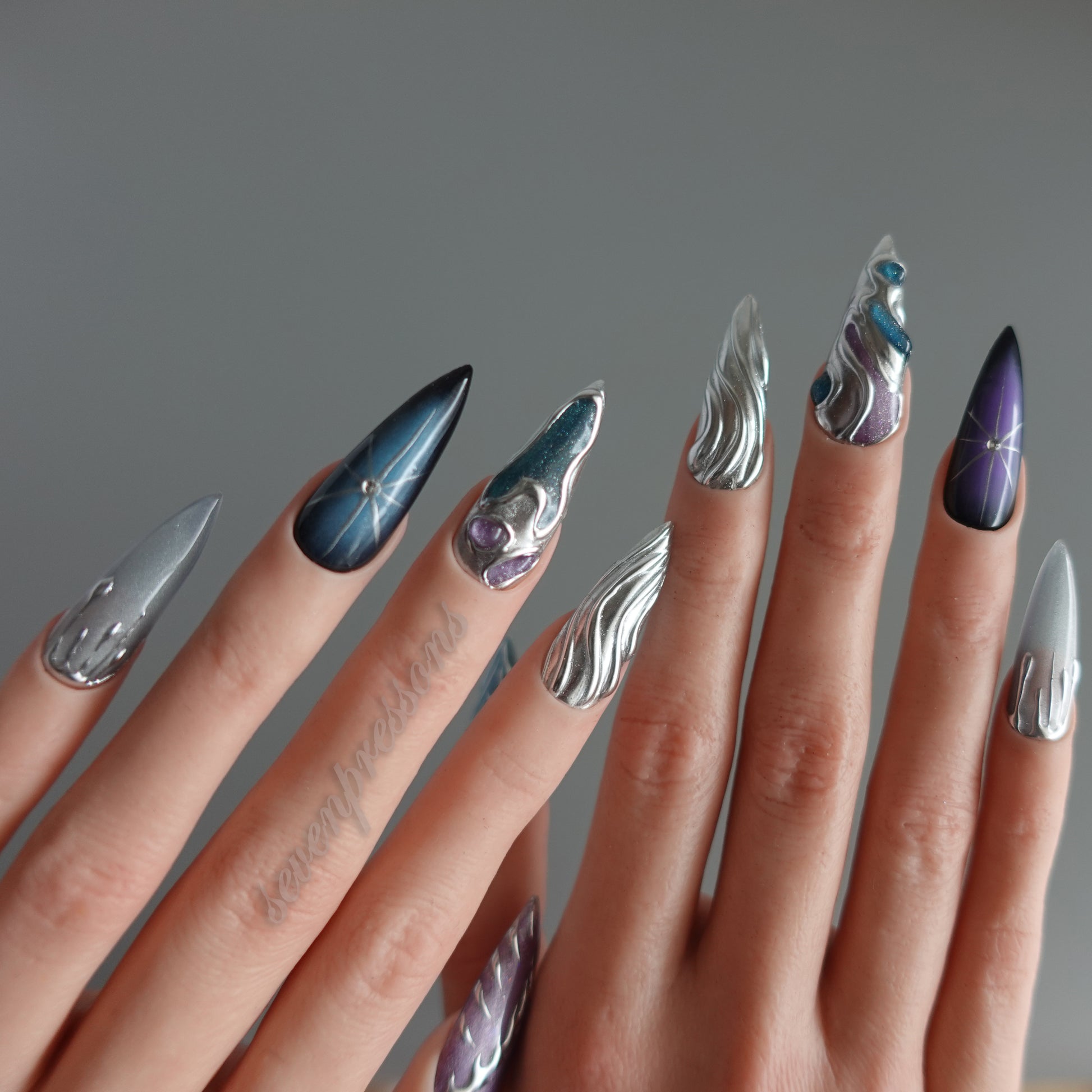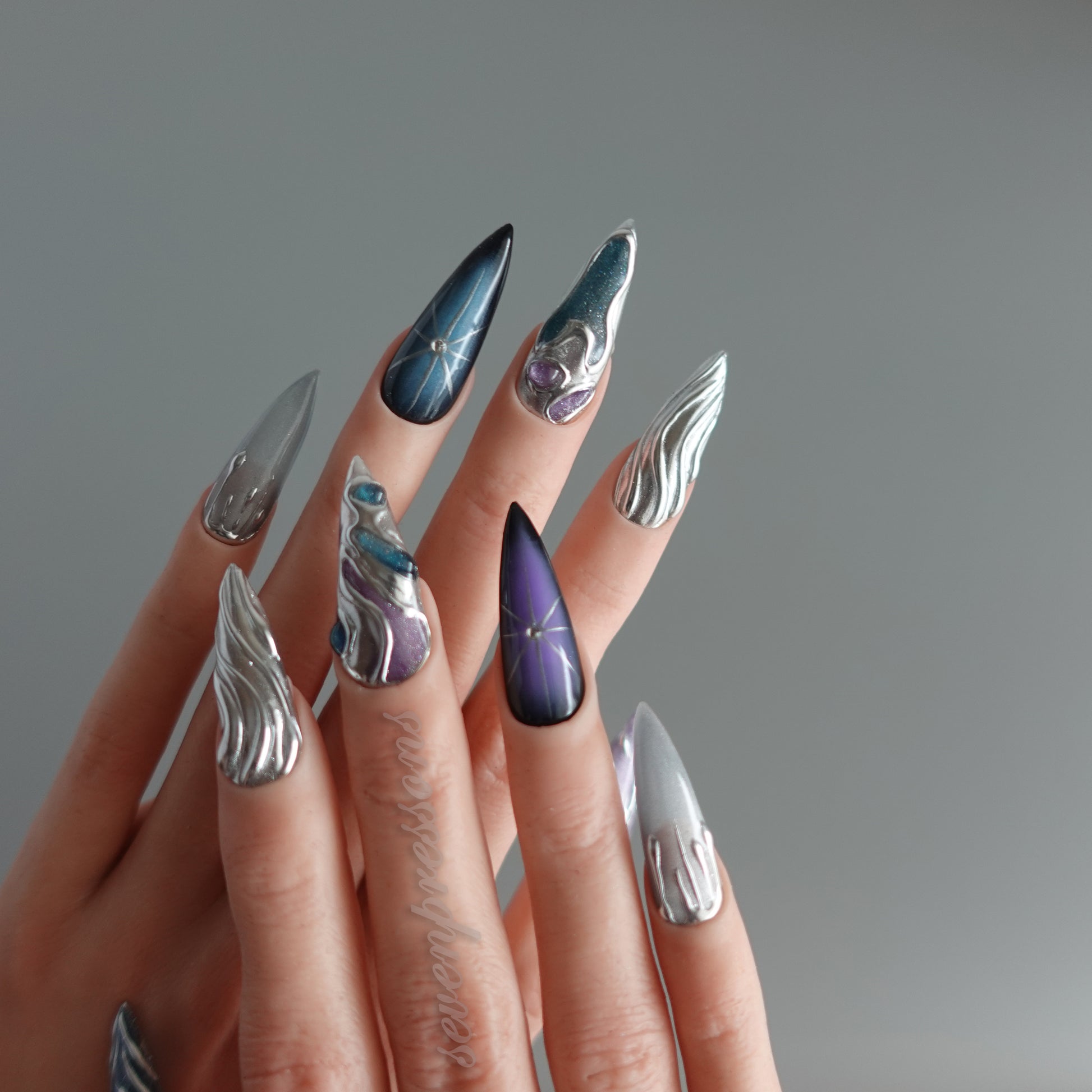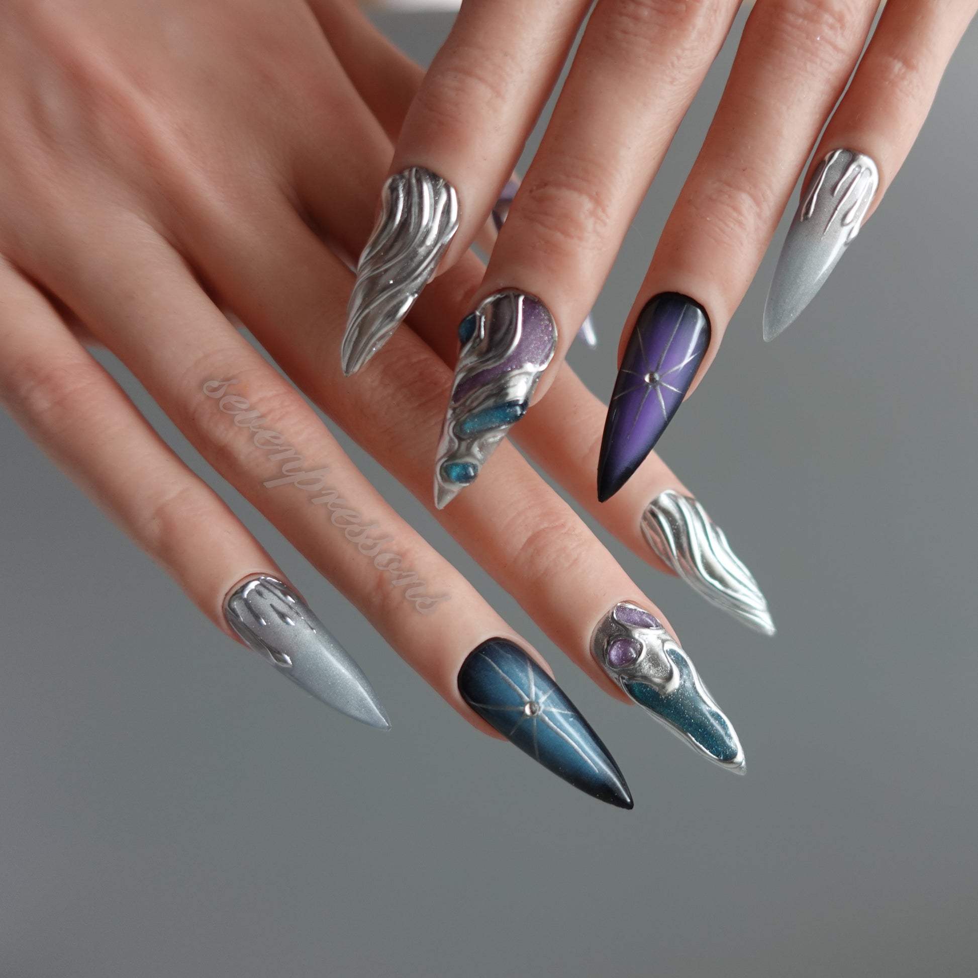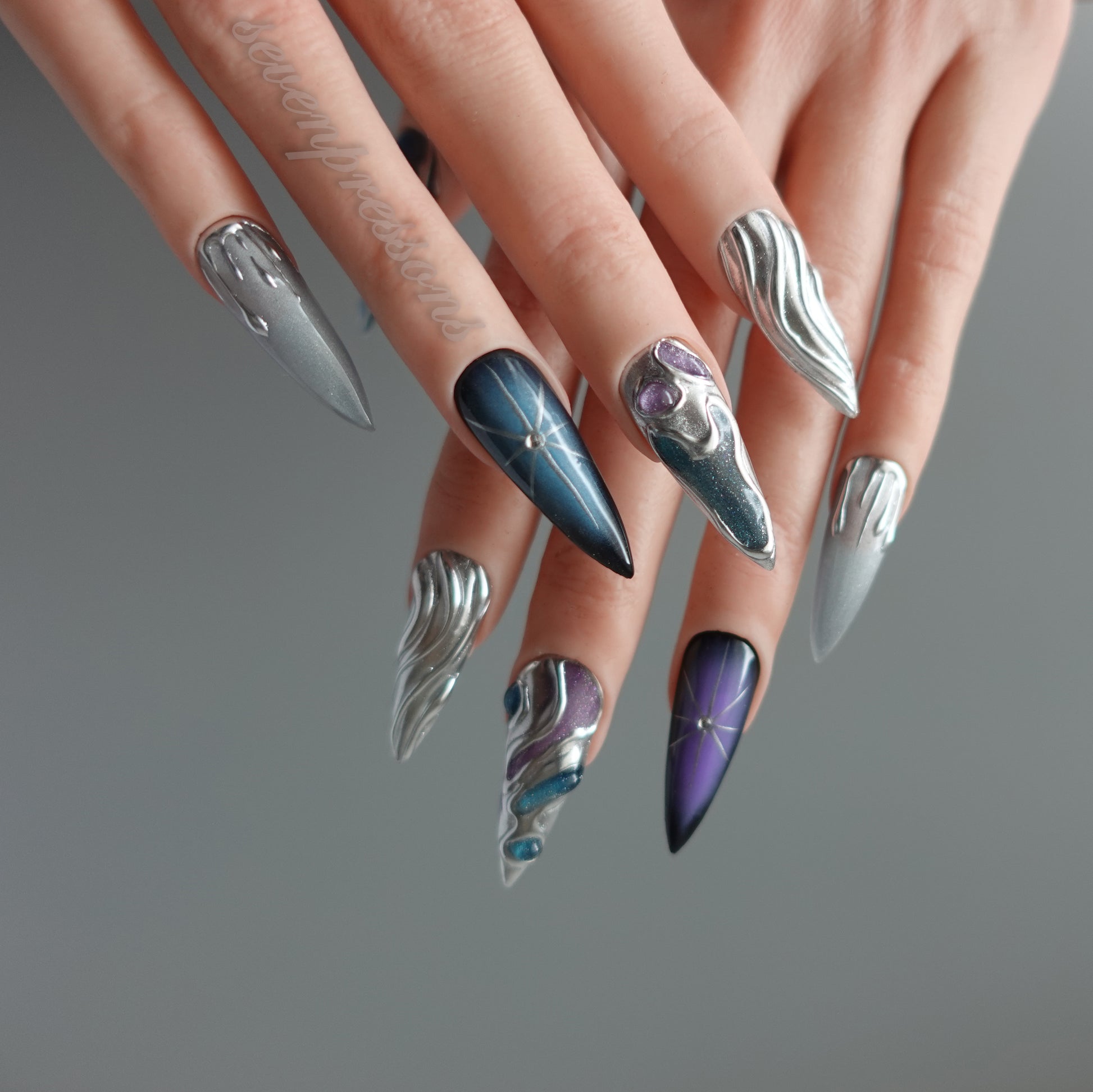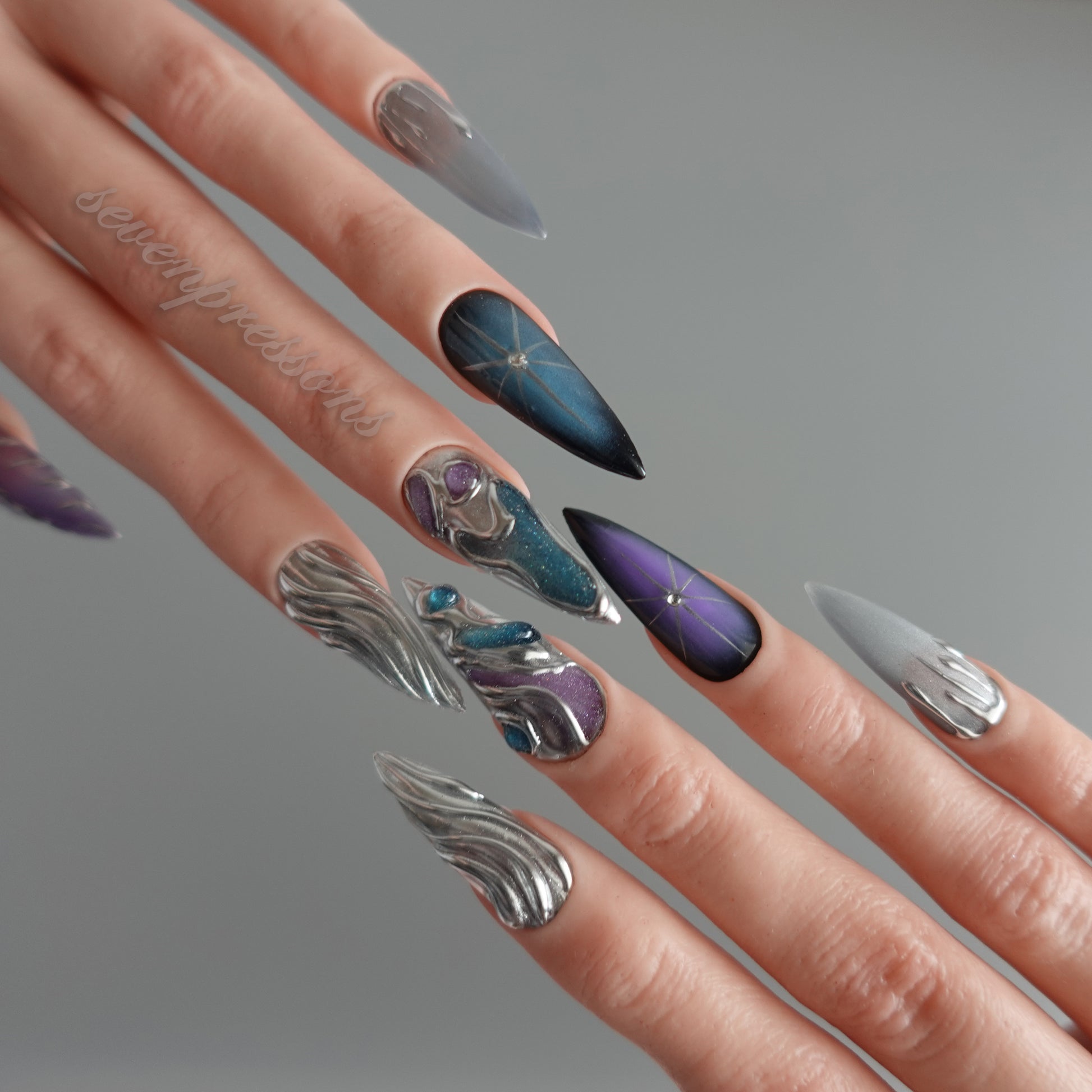 Nebula Alloy channels the power of cosmic metal — a collision of galaxies, chrome, and starlight. Layers of liquid silver sculpted into flowing molten forms wrap around deep-space gradients of amethyst, teal, and obsidian blue. Each nail reflects a starburst’s glint, a nebula’s glow, and the metallic hush of interstellar calm. A perfect balance between elegance and edge — for those who shimmer in the dark.