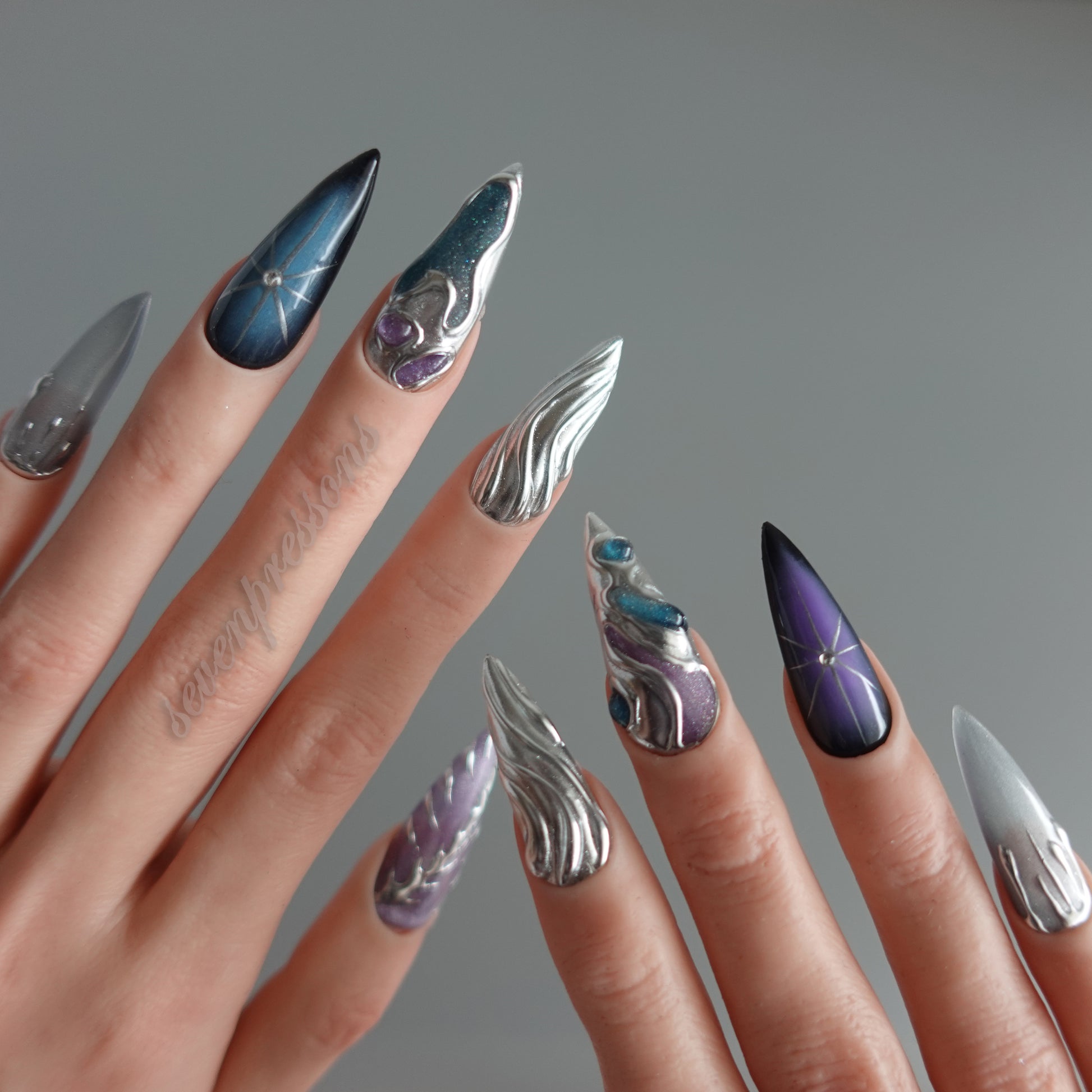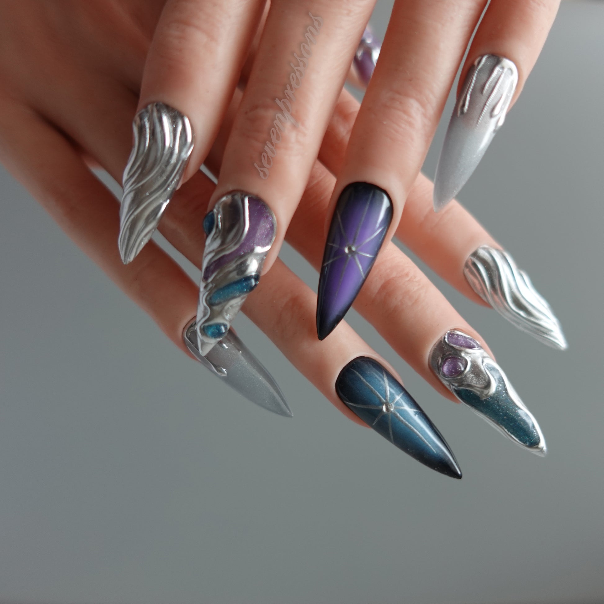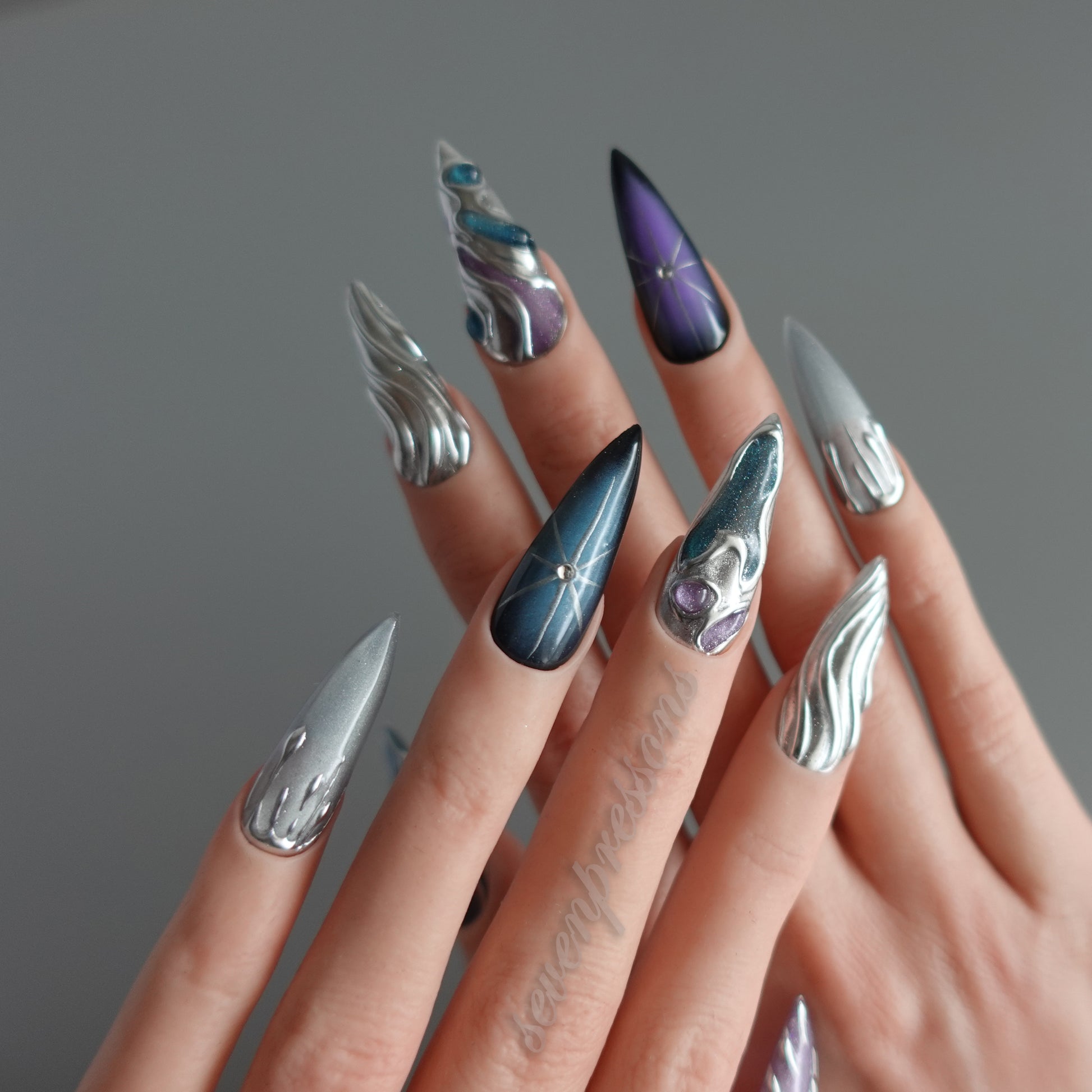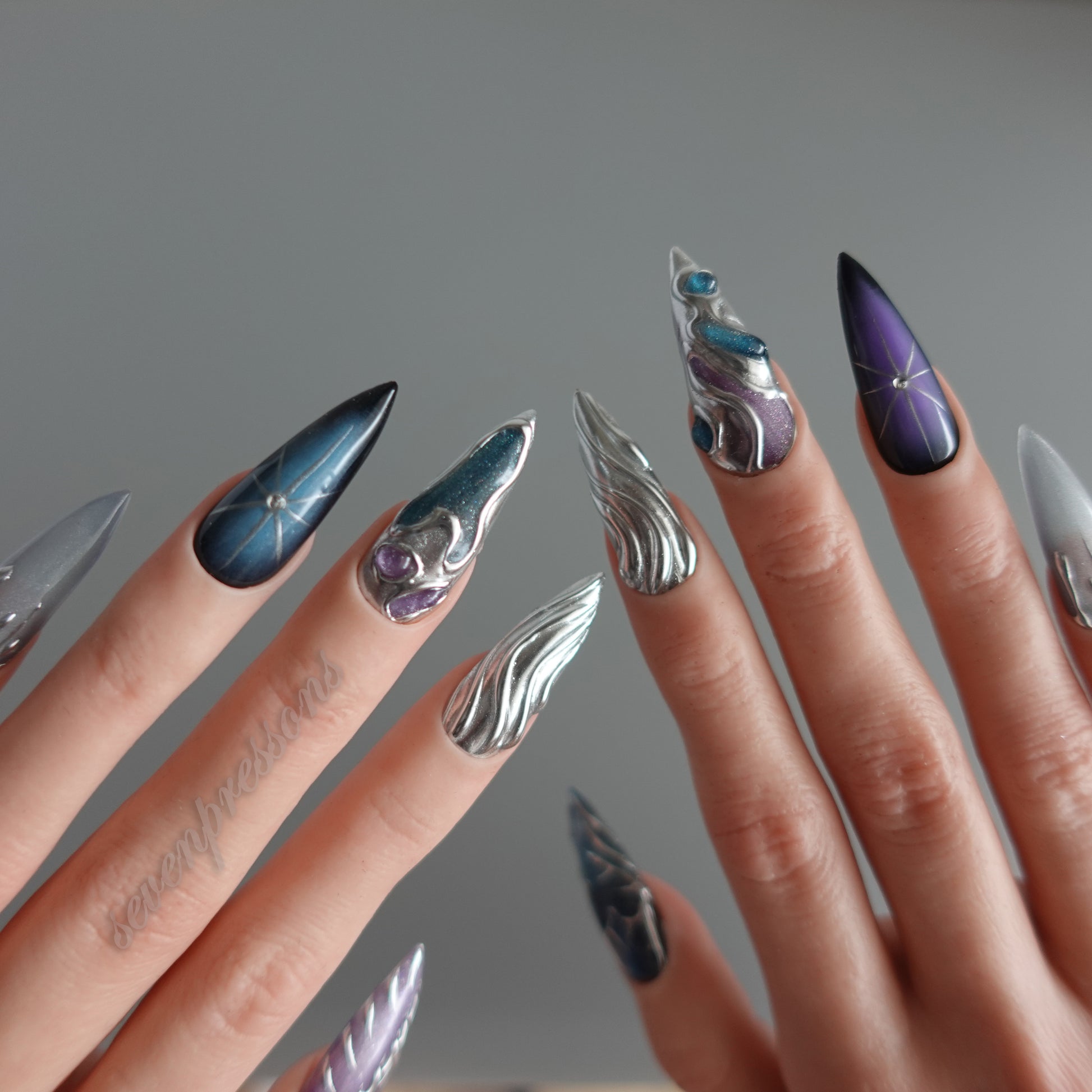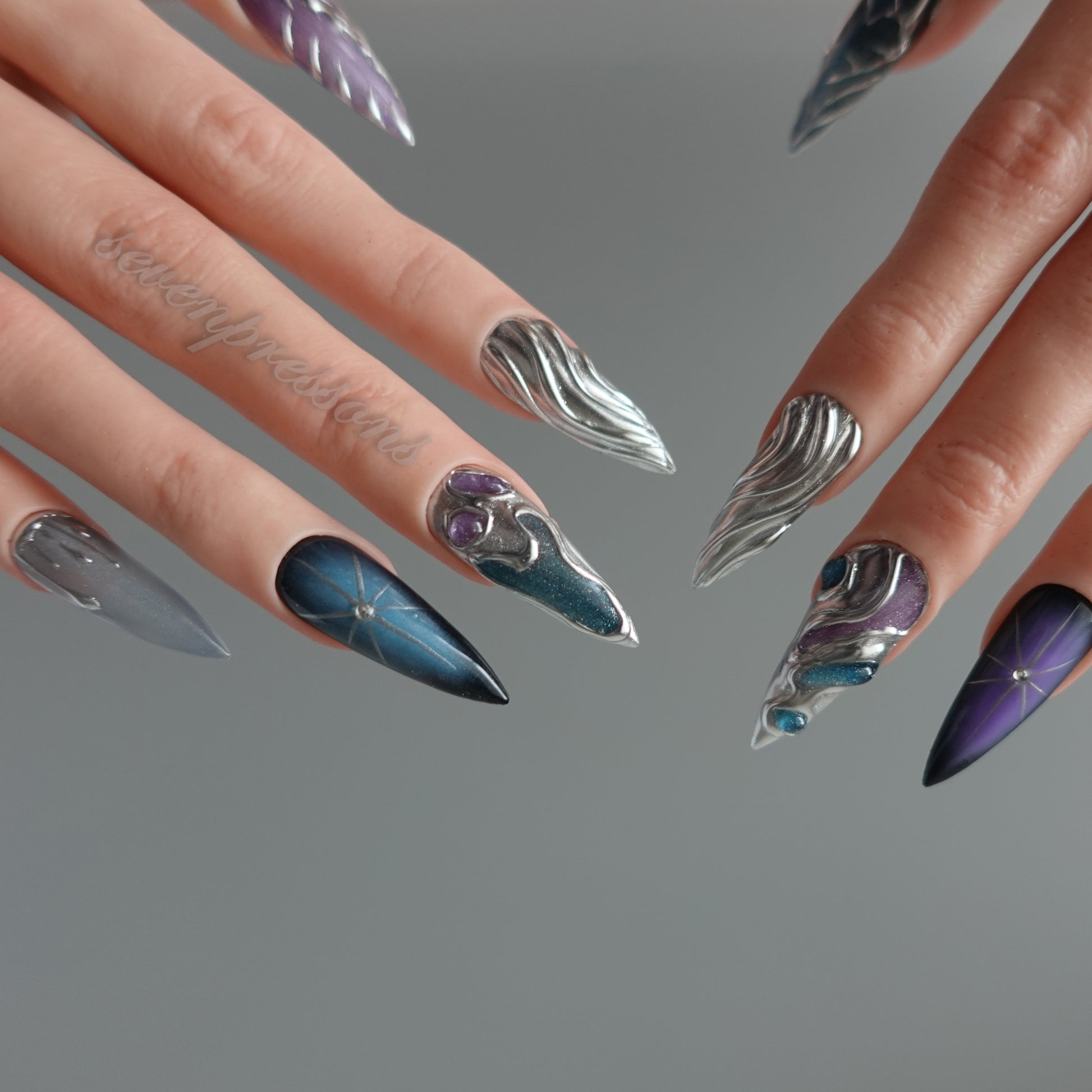 Nebula Alloy channels the power of cosmic metal — a collision of galaxies, chrome, and starlight. Layers of liquid silver sculpted into flowing molten forms wrap around deep-space gradients of amethyst, teal, and obsidian blue. Each nail reflects a starburst’s glint, a nebula’s glow, and the metallic hush of interstellar calm. A perfect balance between elegance and edge — for those who shimmer in the dark.