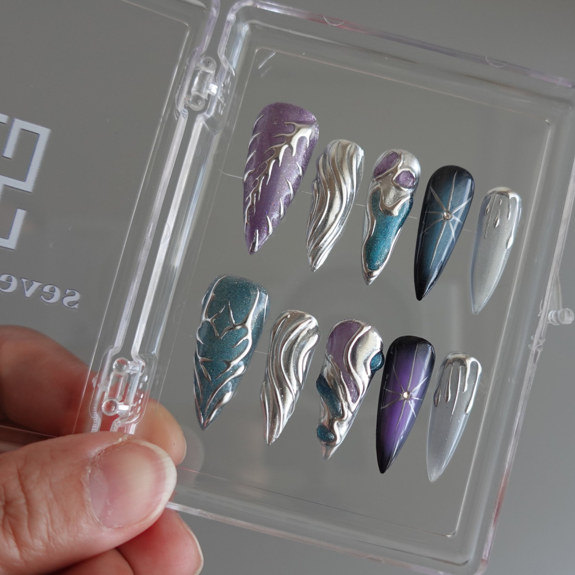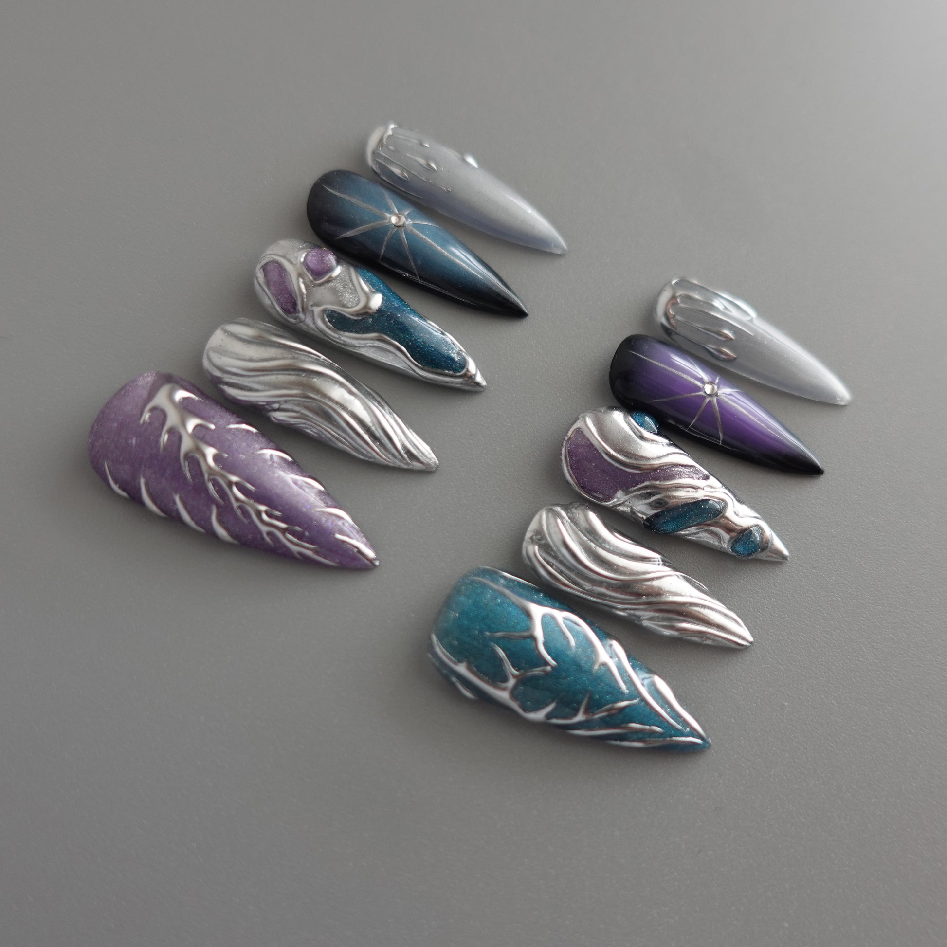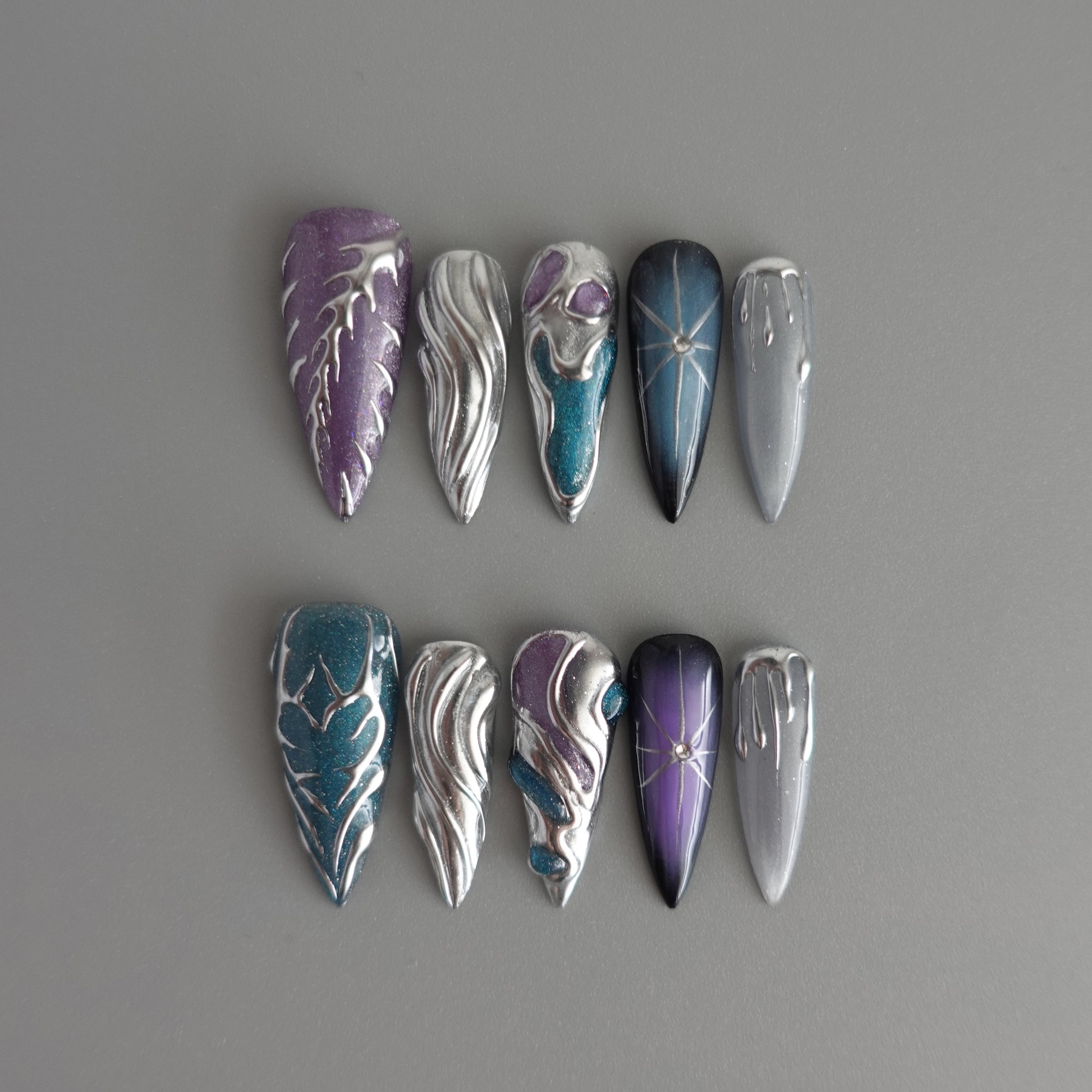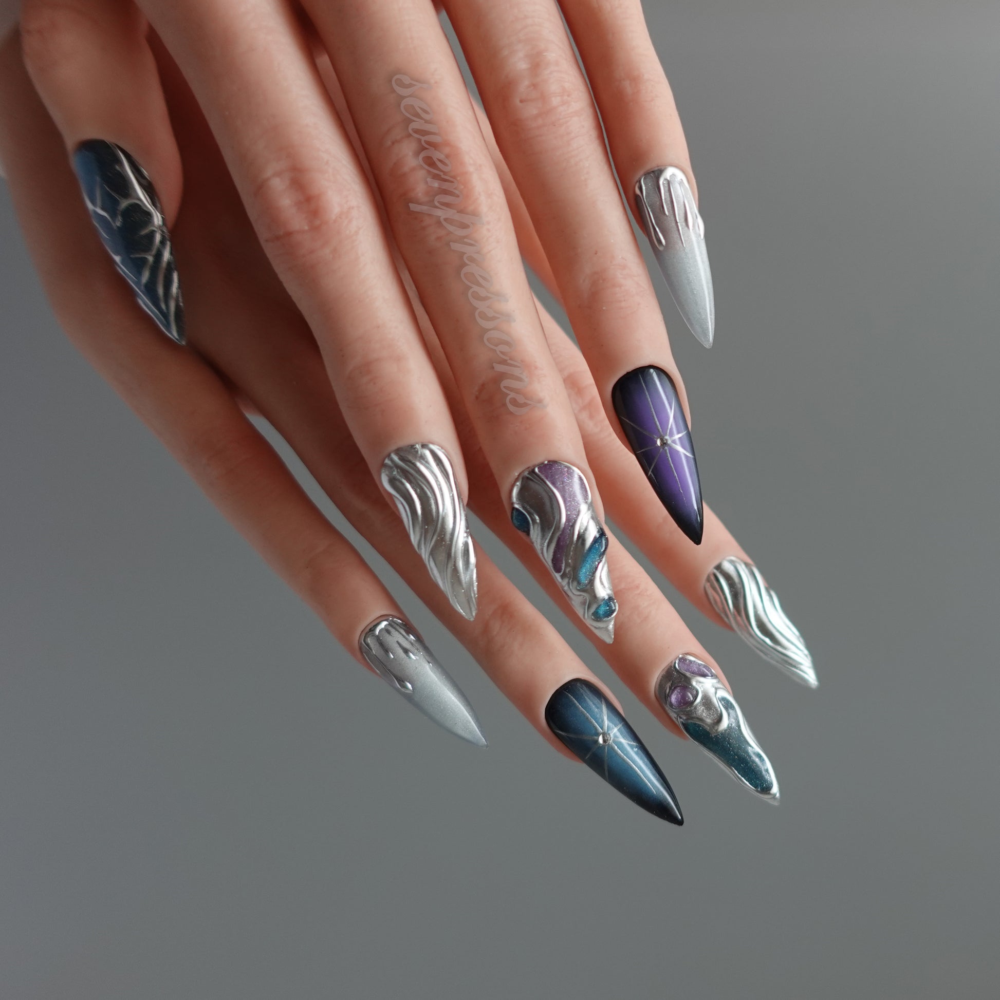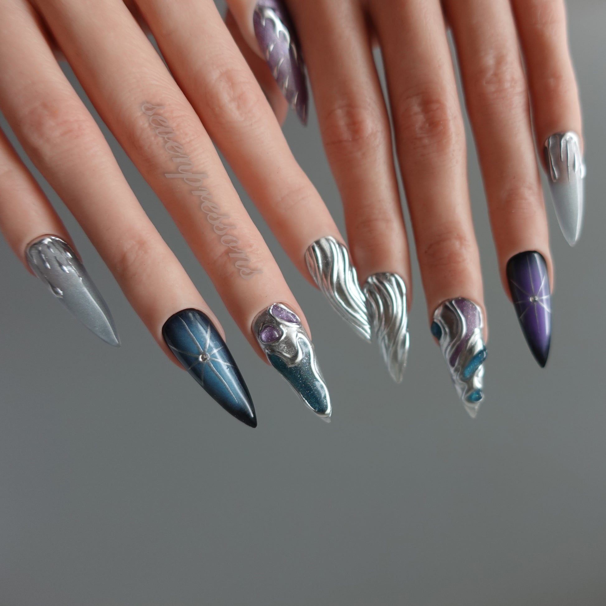 Nebula Alloy channels the power of cosmic metal — a collision of galaxies, chrome, and starlight. Layers of liquid silver sculpted into flowing molten forms wrap around deep-space gradients of amethyst, teal, and obsidian blue. Each nail reflects a starburst’s glint, a nebula’s glow, and the metallic hush of interstellar calm. A perfect balance between elegance and edge — for those who shimmer in the dark.