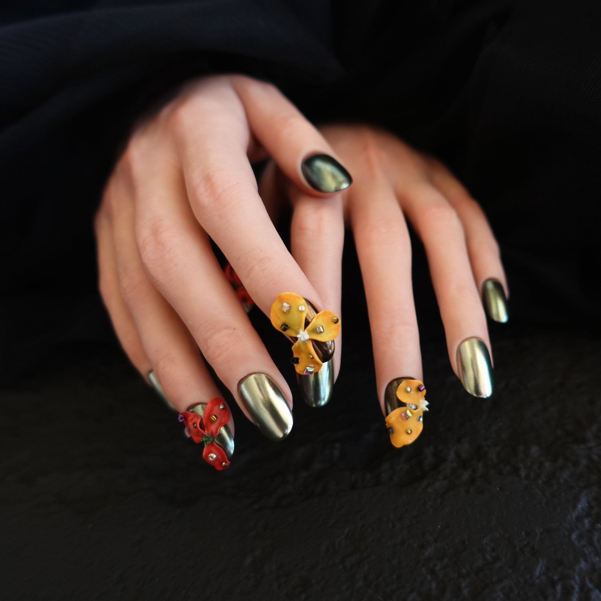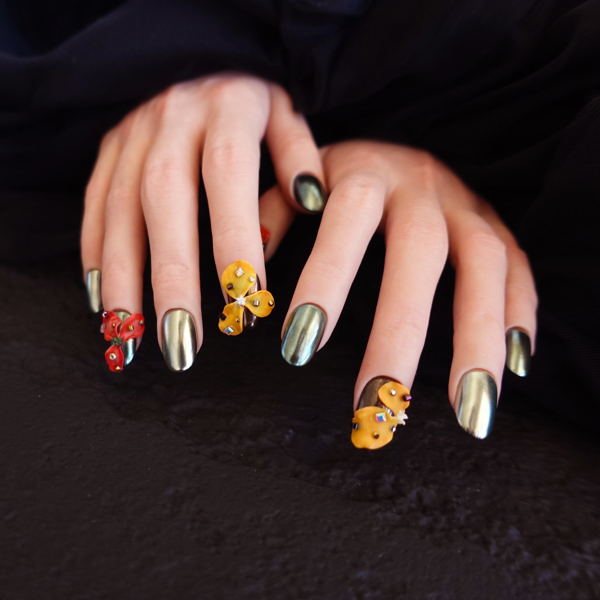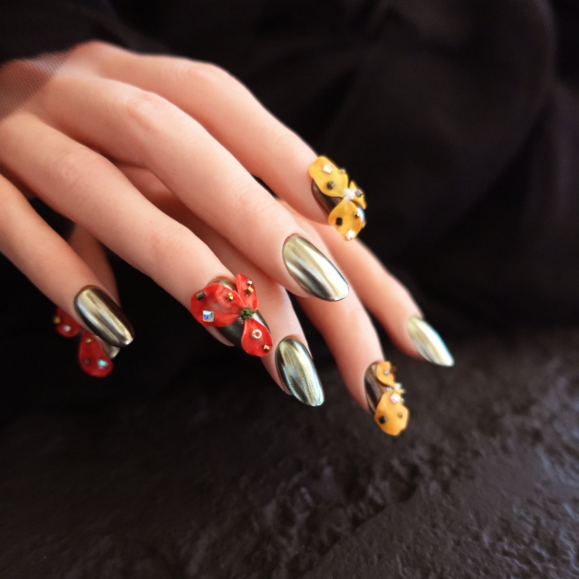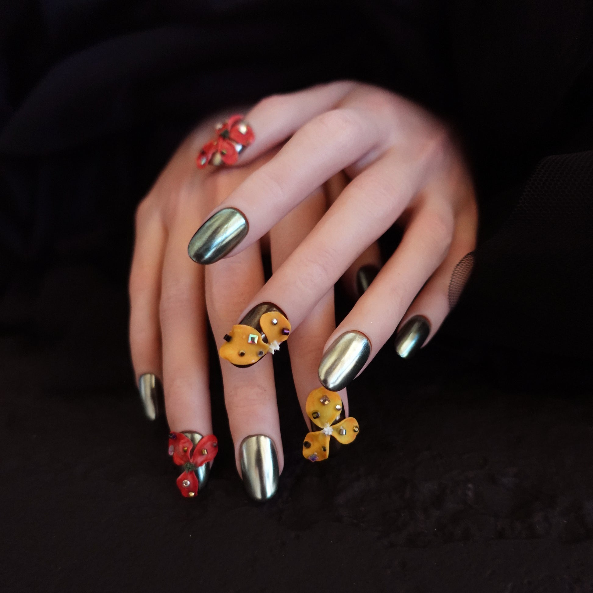 Butterfly Reverie flutters between fantasy and fashion. Bold red and golden yellow 3D butterflies perch delicately atop olive chrome nails, each wing adorned with tiny gemstones that sparkle like morning dew. The sculptural contrast of warm tones against a sleek metallic base brings a surreal, fairytale touch to modern elegance.