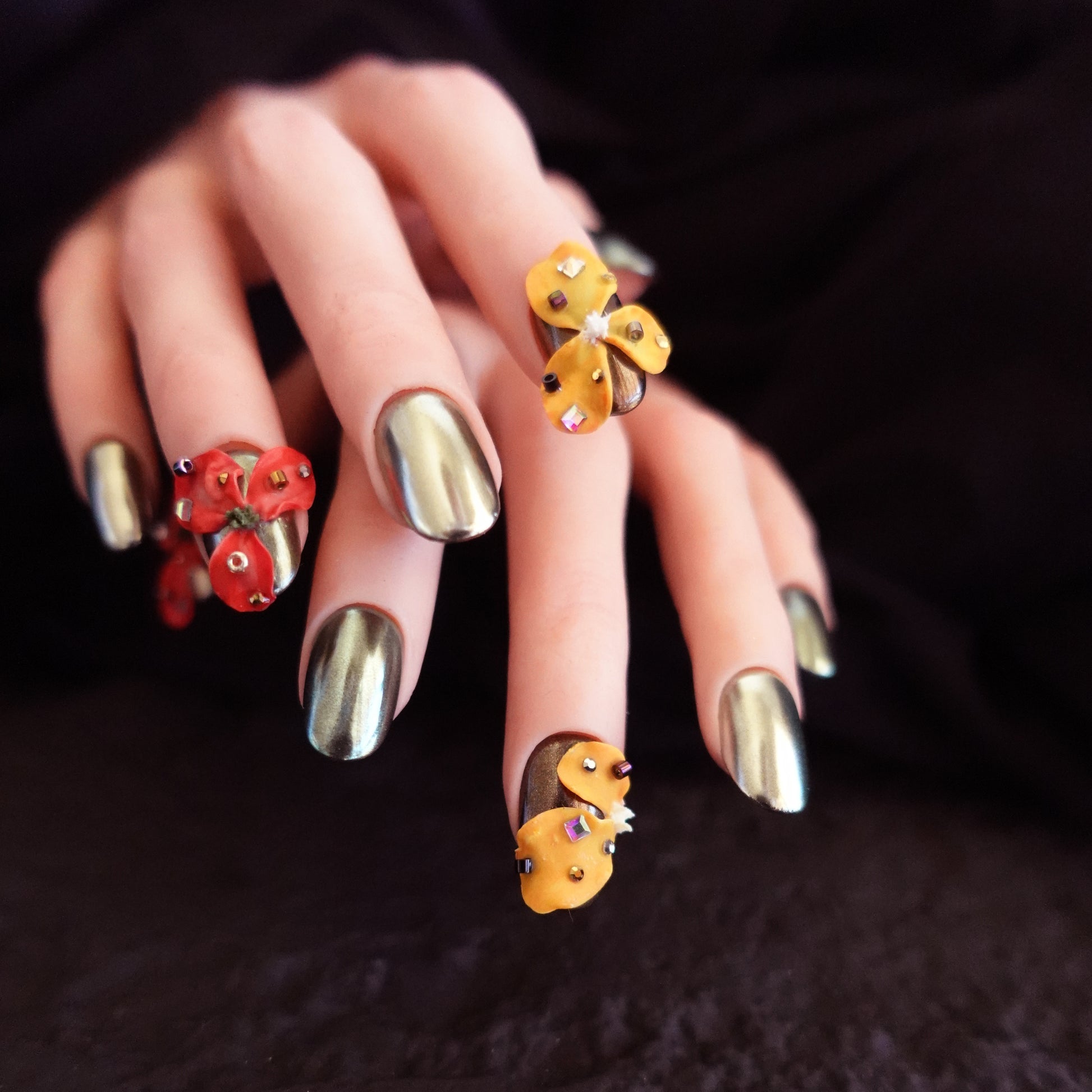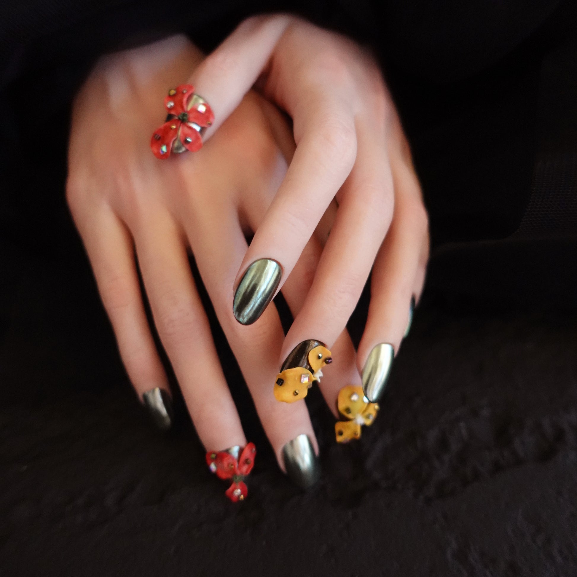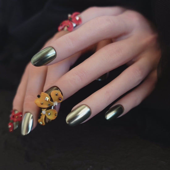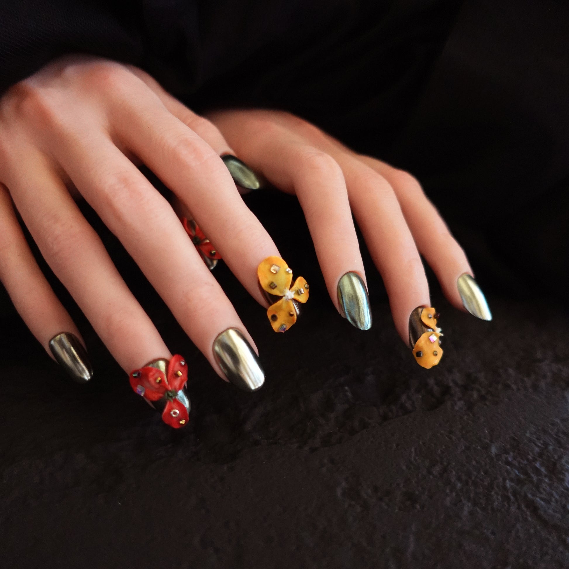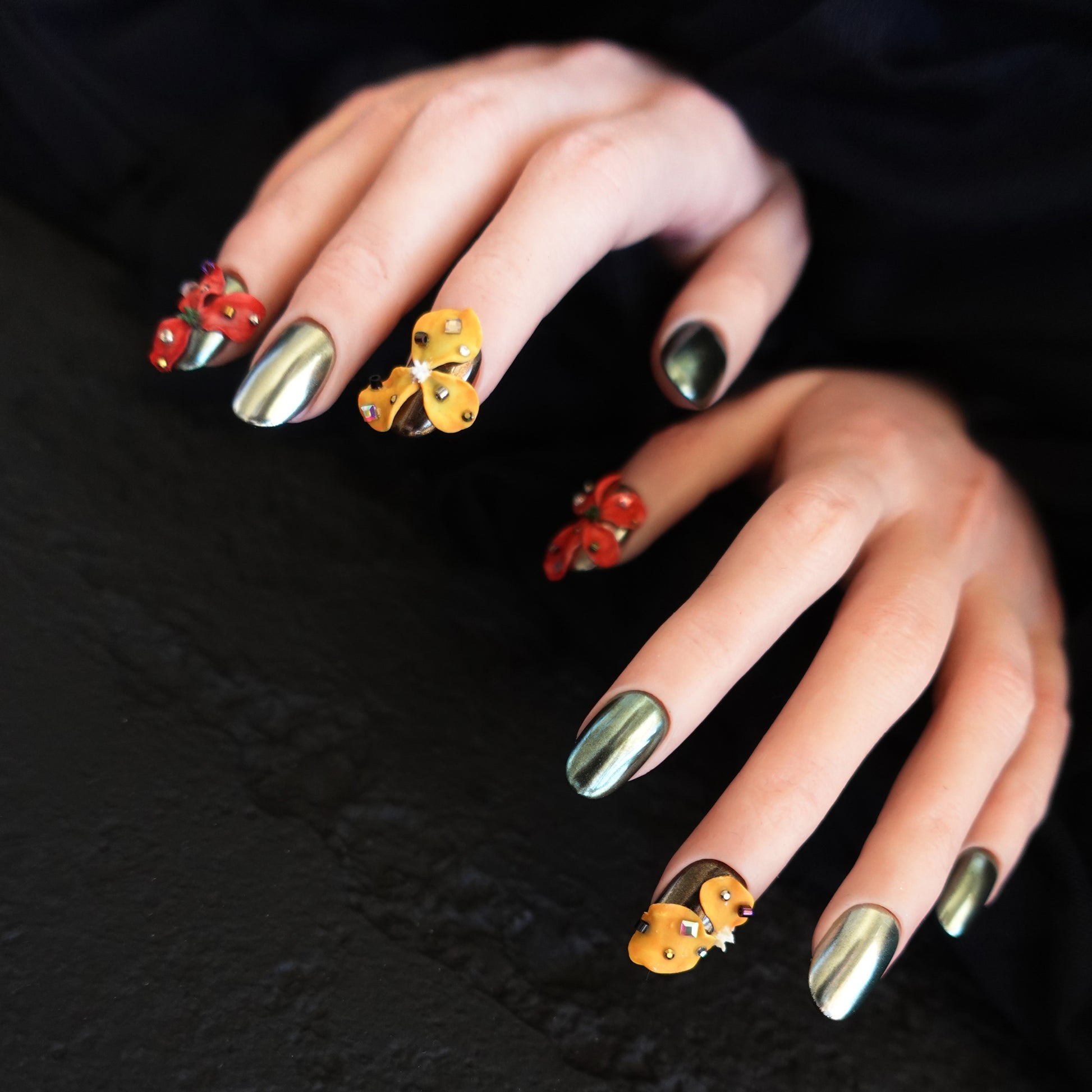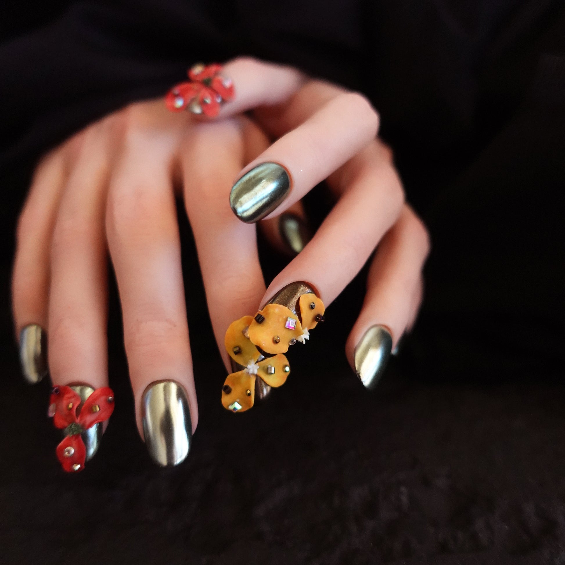 Butterfly Reverie flutters between fantasy and fashion. Bold red and golden yellow 3D butterflies perch delicately atop olive chrome nails, each wing adorned with tiny gemstones that sparkle like morning dew. The sculptural contrast of warm tones against a sleek metallic base brings a surreal, fairytale touch to modern elegance.