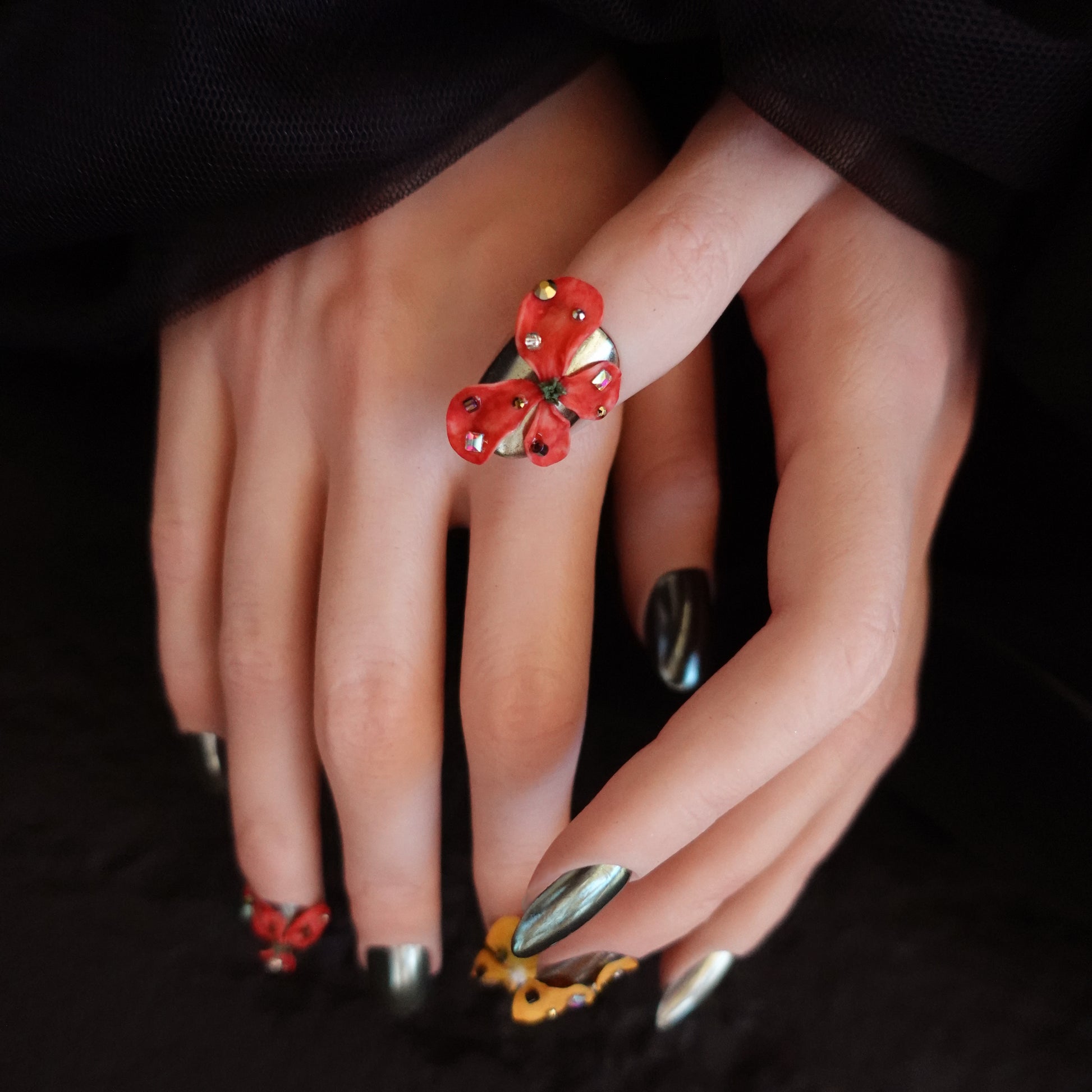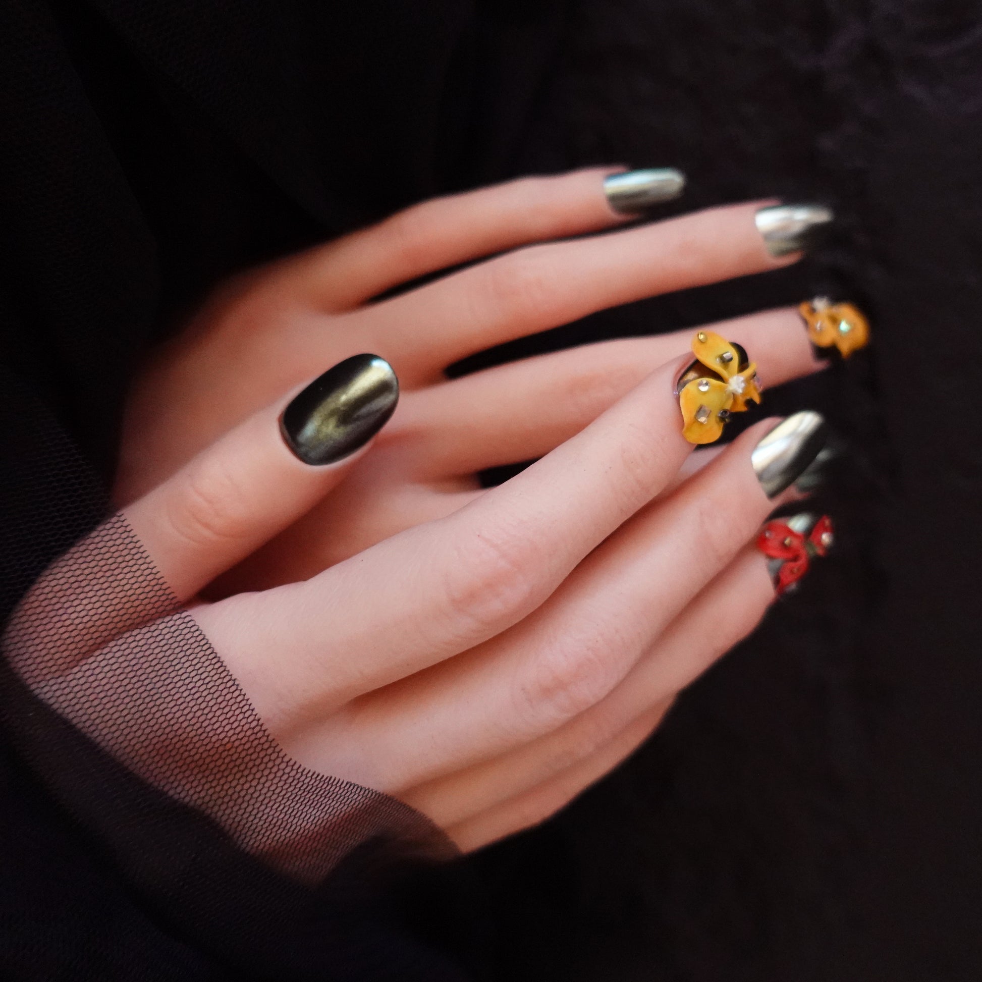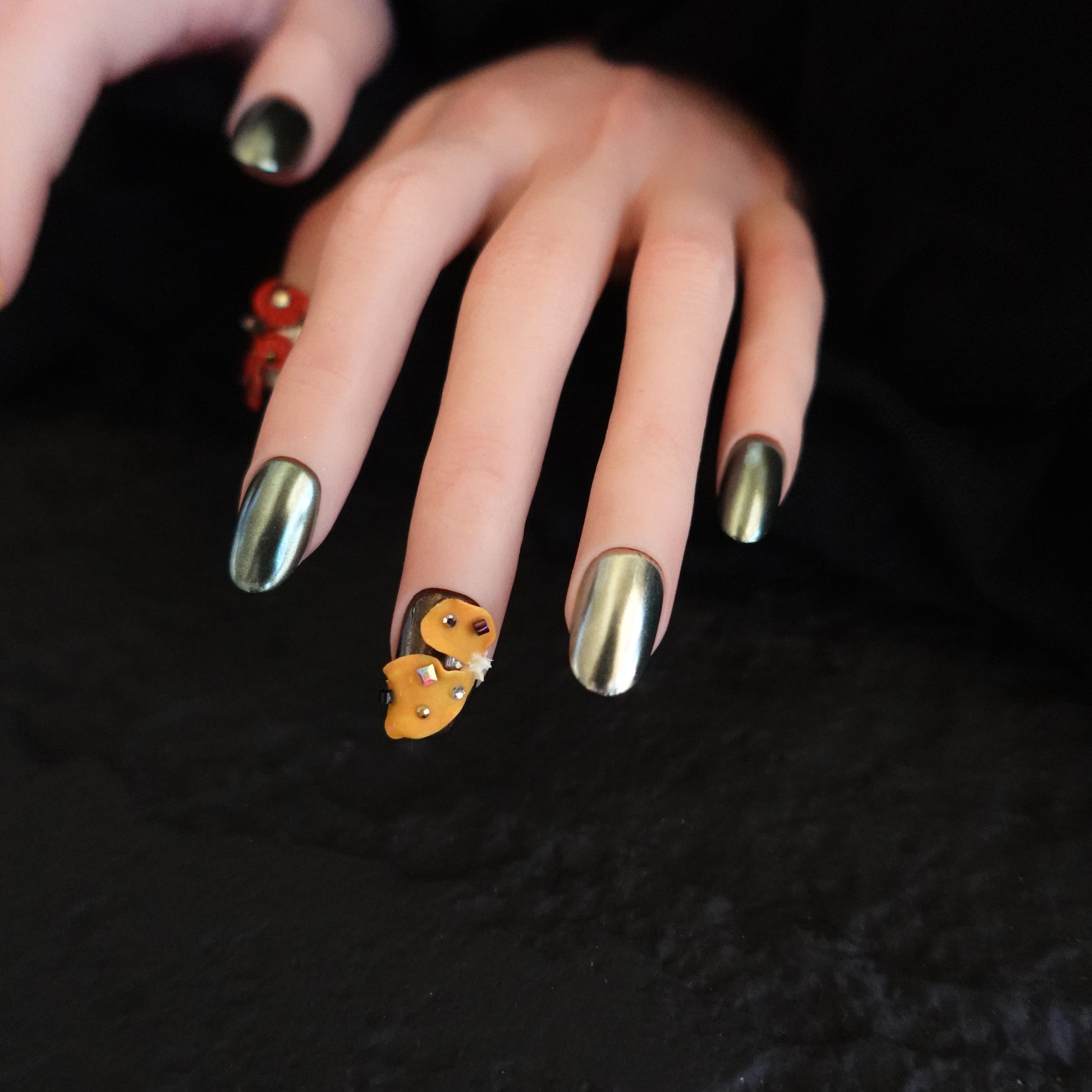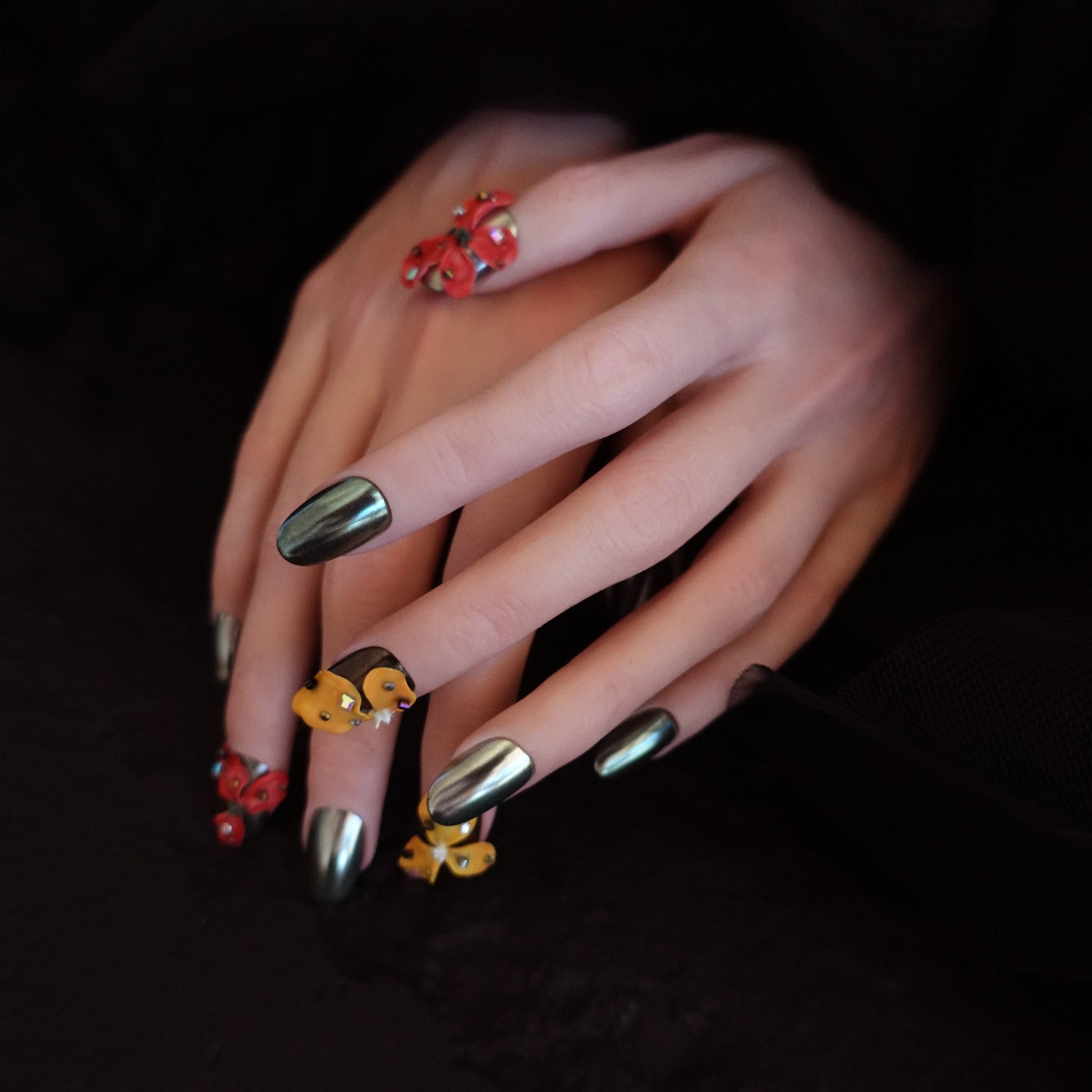 Butterfly Reverie flutters between fantasy and fashion. Bold red and golden yellow 3D butterflies perch delicately atop olive chrome nails, each wing adorned with tiny gemstones that sparkle like morning dew. The sculptural contrast of warm tones against a sleek metallic base brings a surreal, fairytale touch to modern elegance.