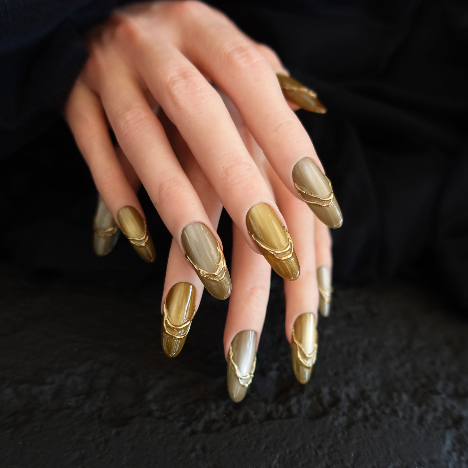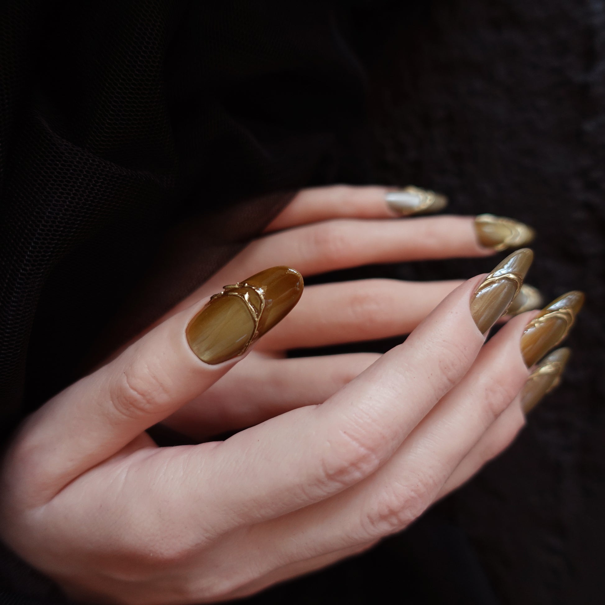 Golden Dune is a journey across shifting sands and molten sunlight. With silky yellow-gold cat-eye shimmer and fluid golden ridges, this set evokes the undulating curves of desert dunes under a glowing horizon. The warm, earthy tones paired with sculptural metal accents make every nail a miniature sculpture — grounded, glowing, and quietly powerful.