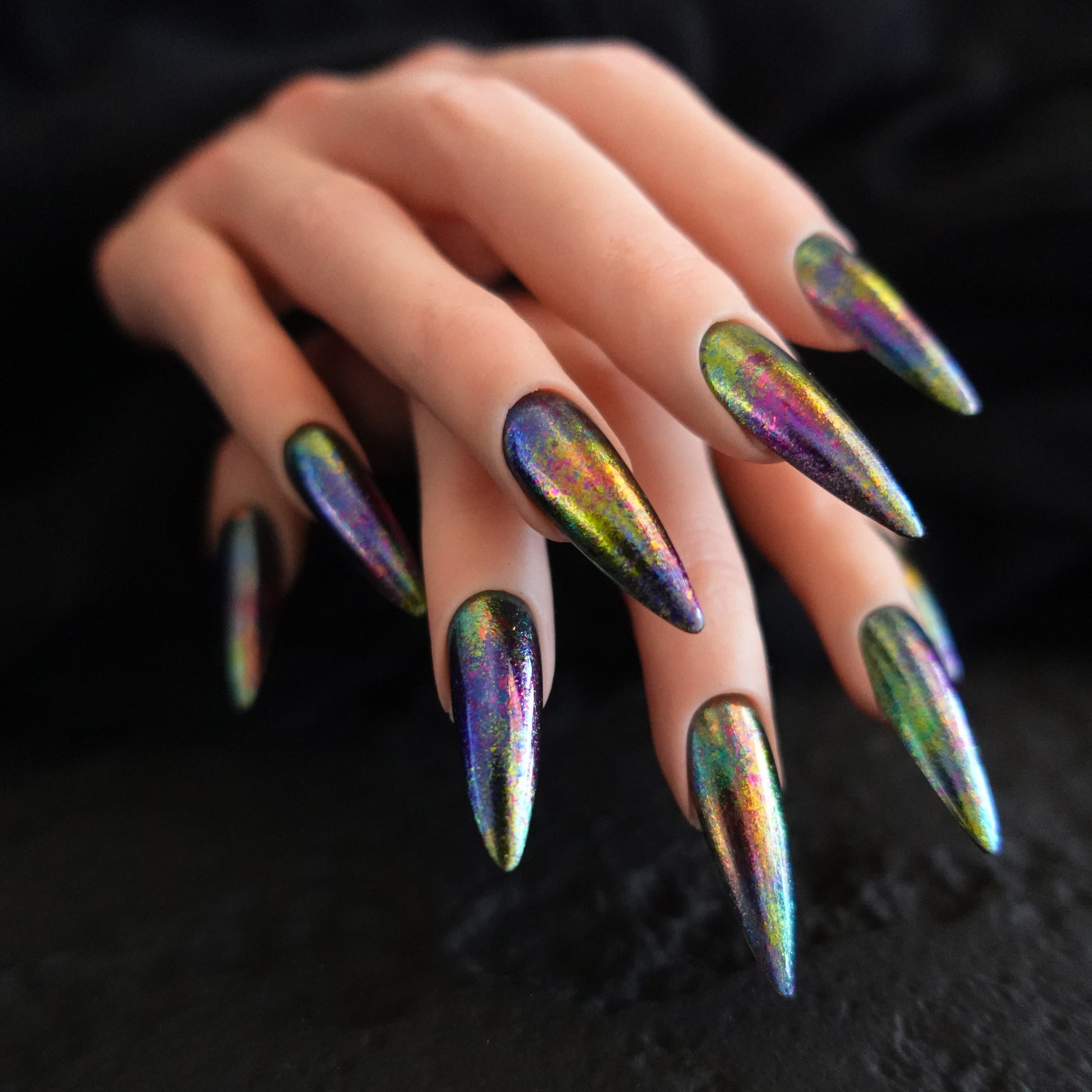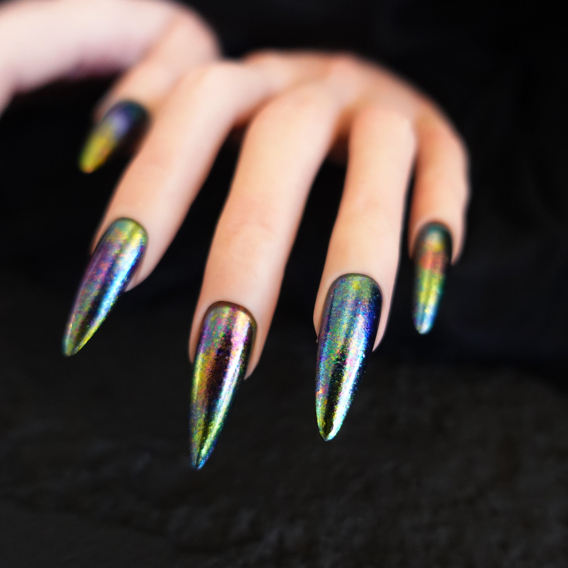 Step into a spectrum of light with Prism Arc — a dazzling burst of iridescent wonder. Like sunlight refracted through a crystal, this multidimensional set shifts between electric emerald, sapphire flame, and flashes of fuchsia with every flick of your fingers.