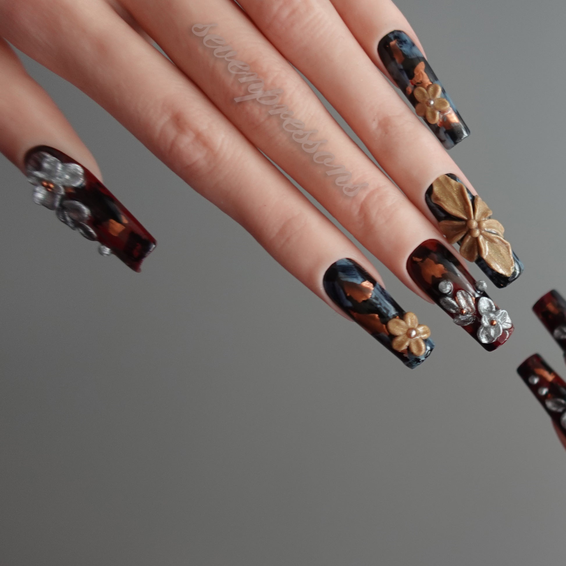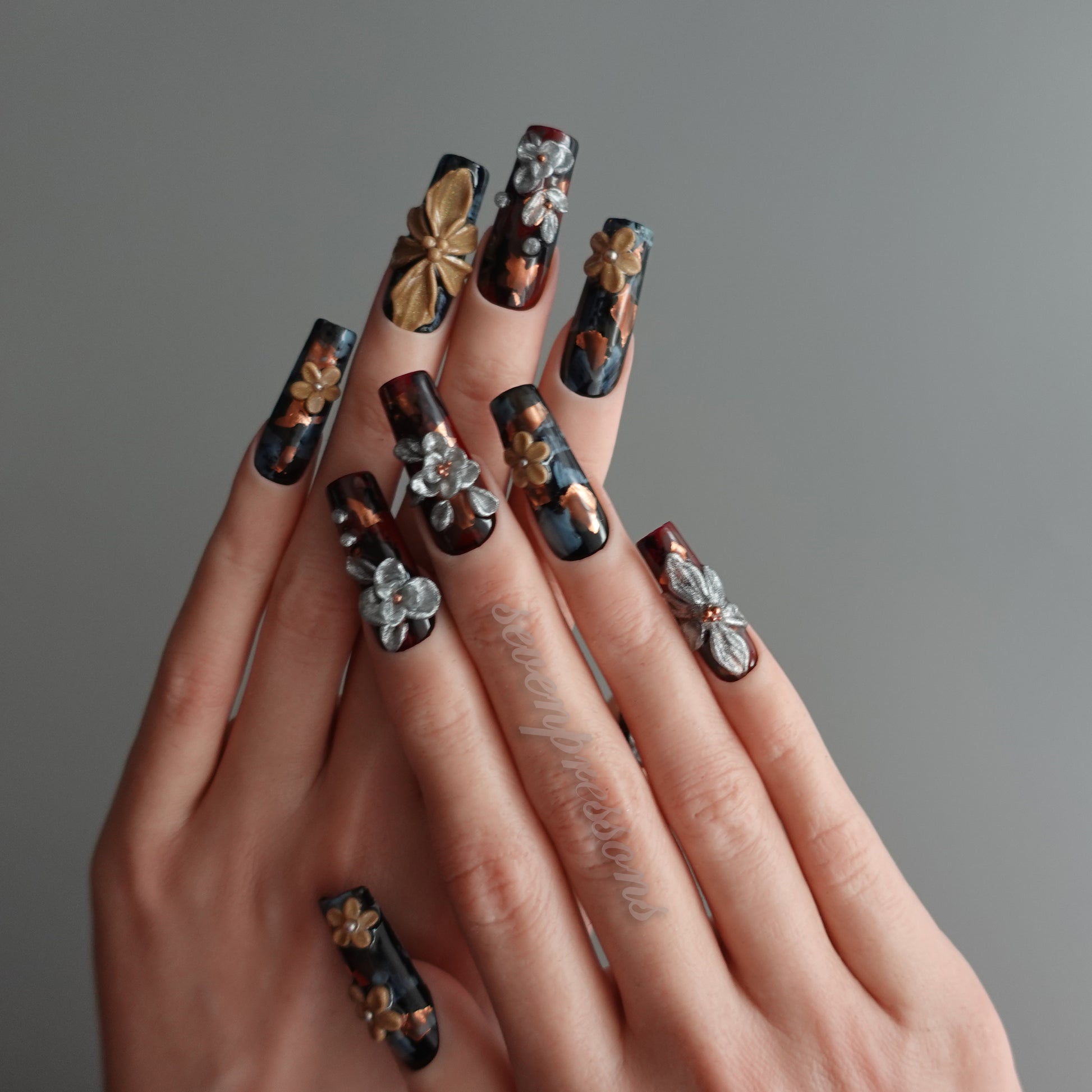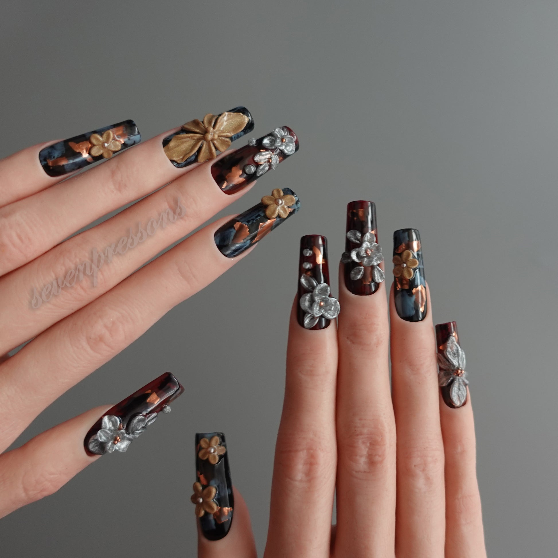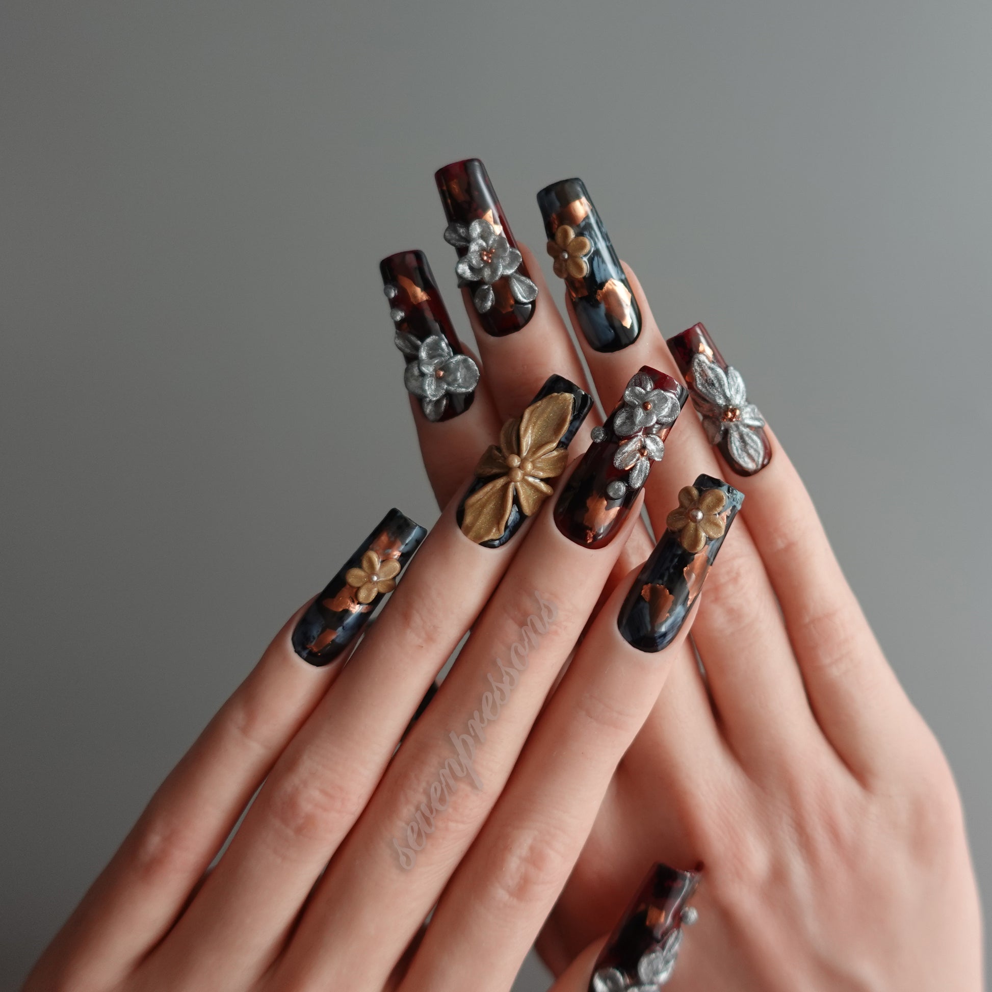 Smoldering layers of black, ember-red, and molten copper create a lava-like tortoise pattern beneath hand-molded 3D flowers in antique gold and silver. Each nail blends depth, sheen, and sculptural texture, forming a look that channels dark romance and imperial strength.
