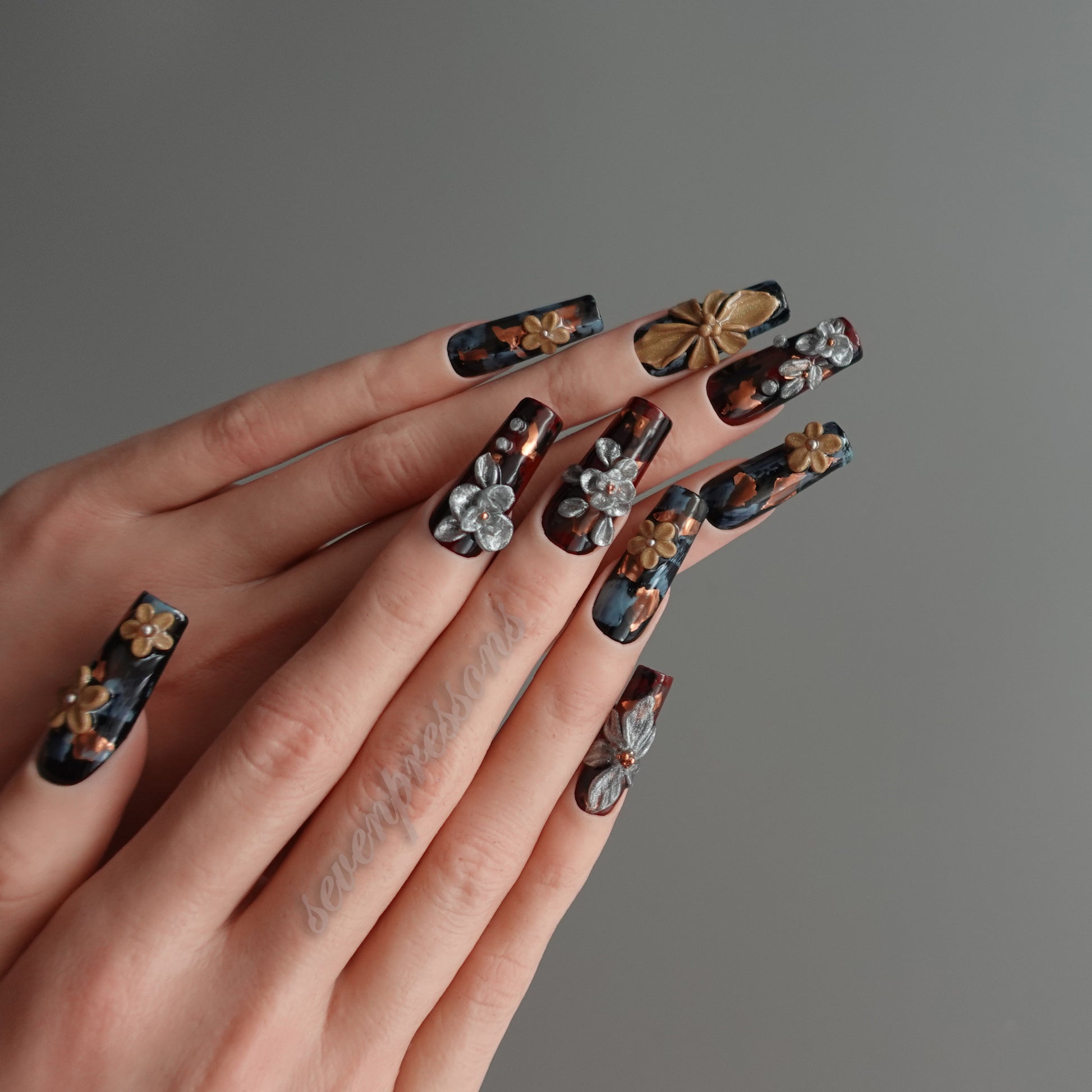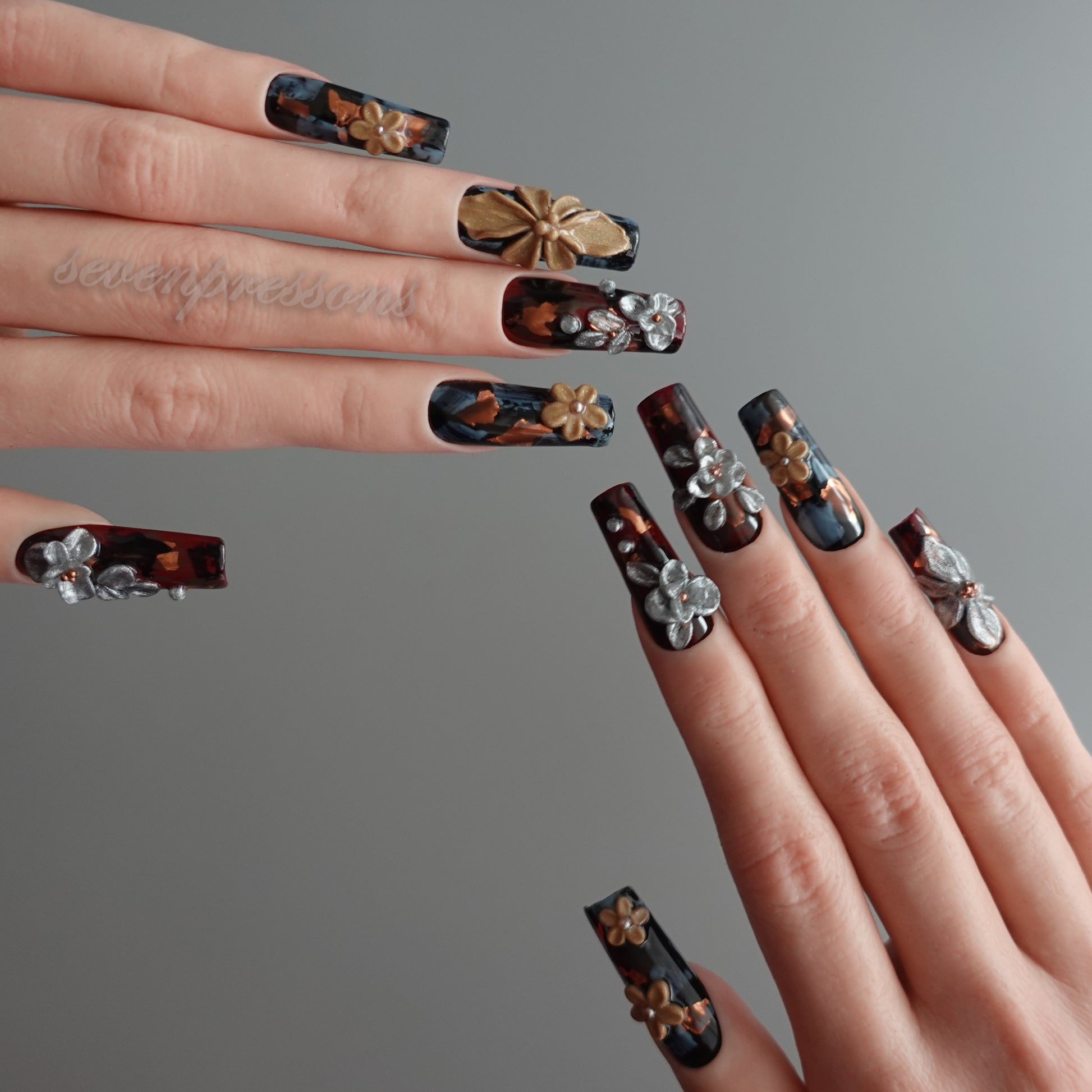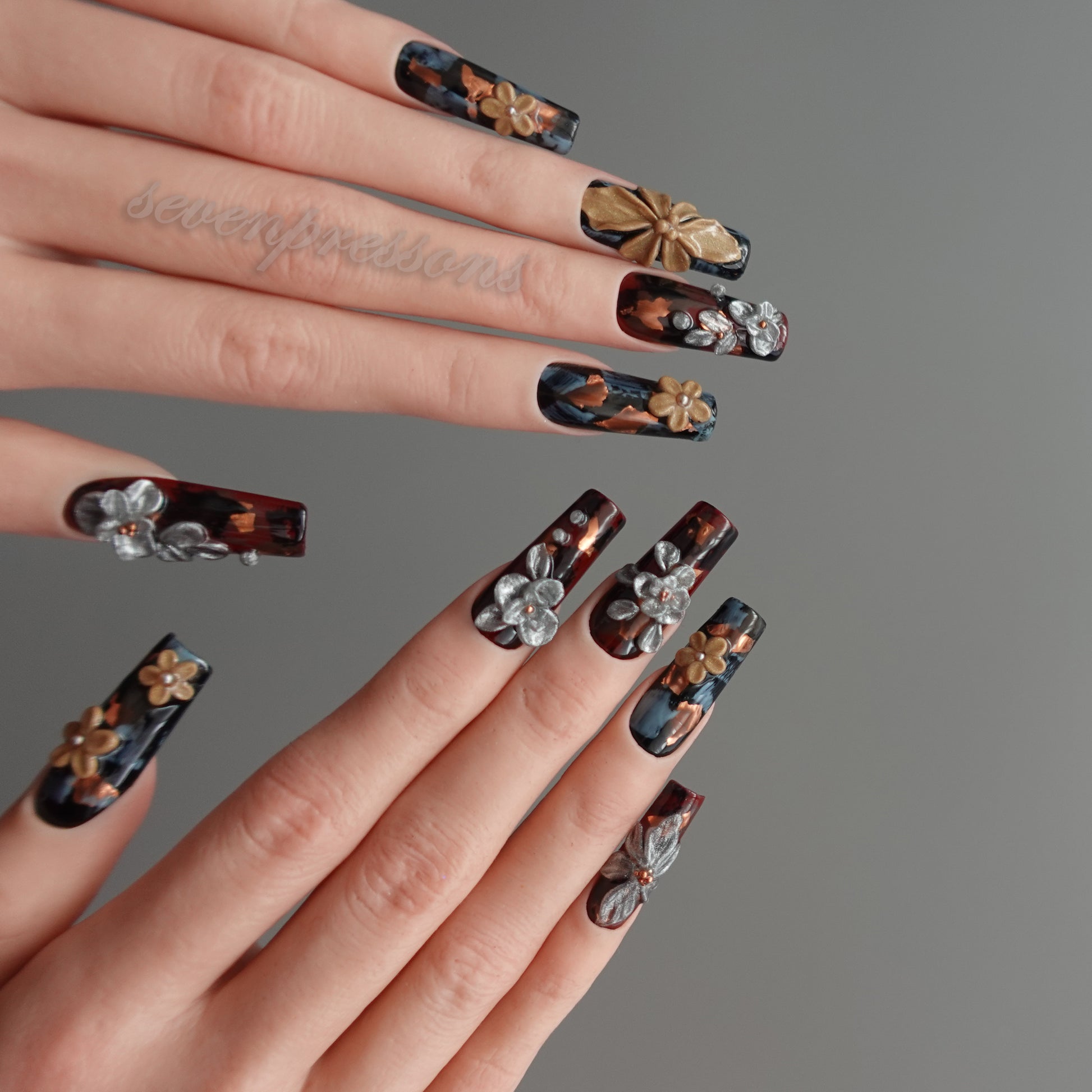 Smoldering layers of black, ember-red, and molten copper create a lava-like tortoise pattern beneath hand-molded 3D flowers in antique gold and silver. Each nail blends depth, sheen, and sculptural texture, forming a look that channels dark romance and imperial strength.