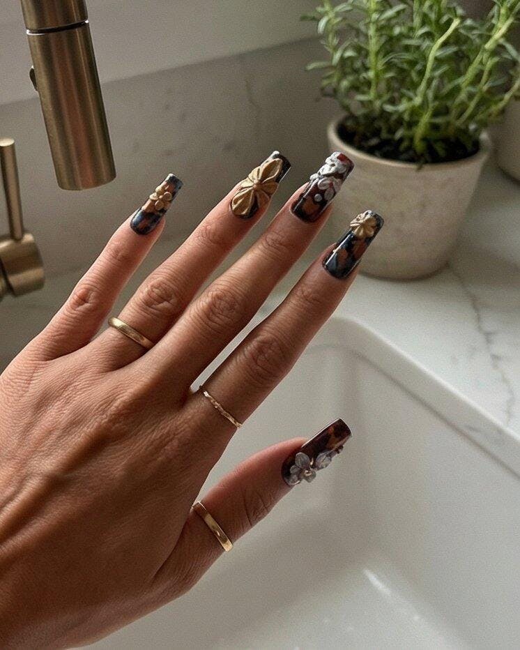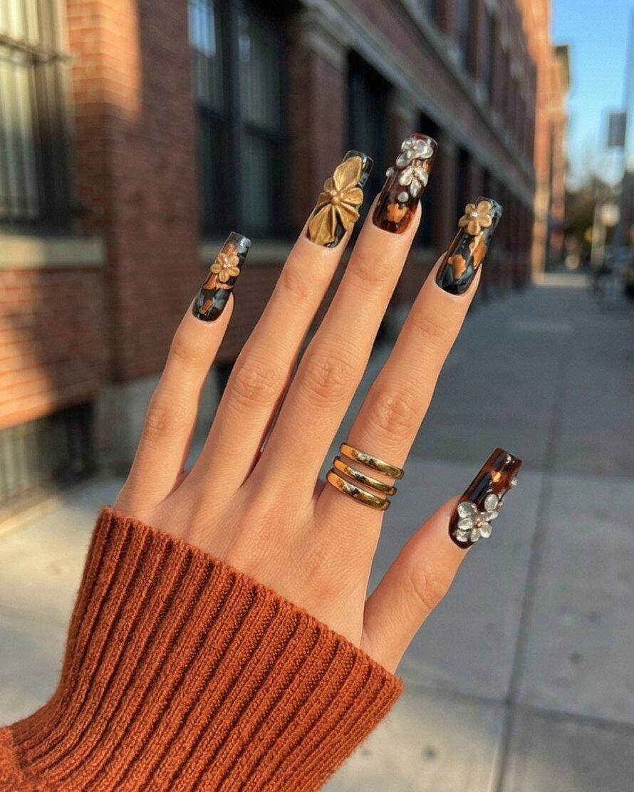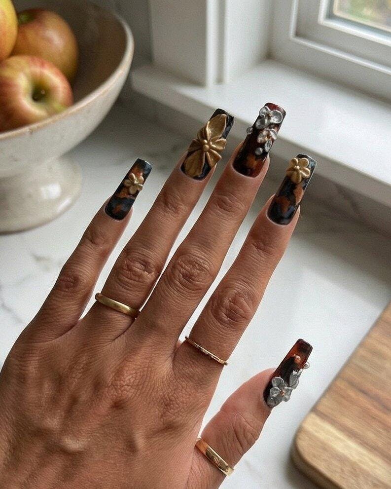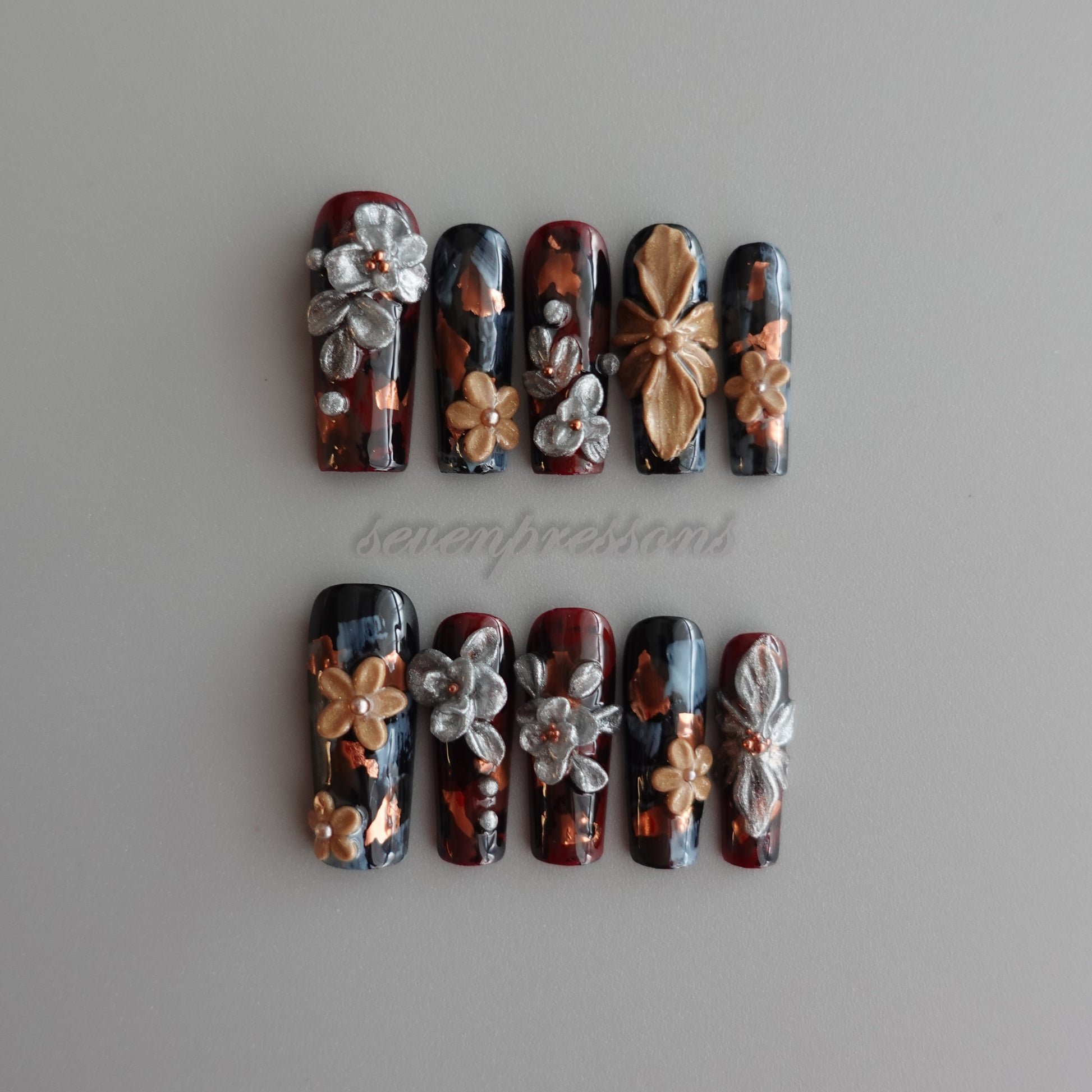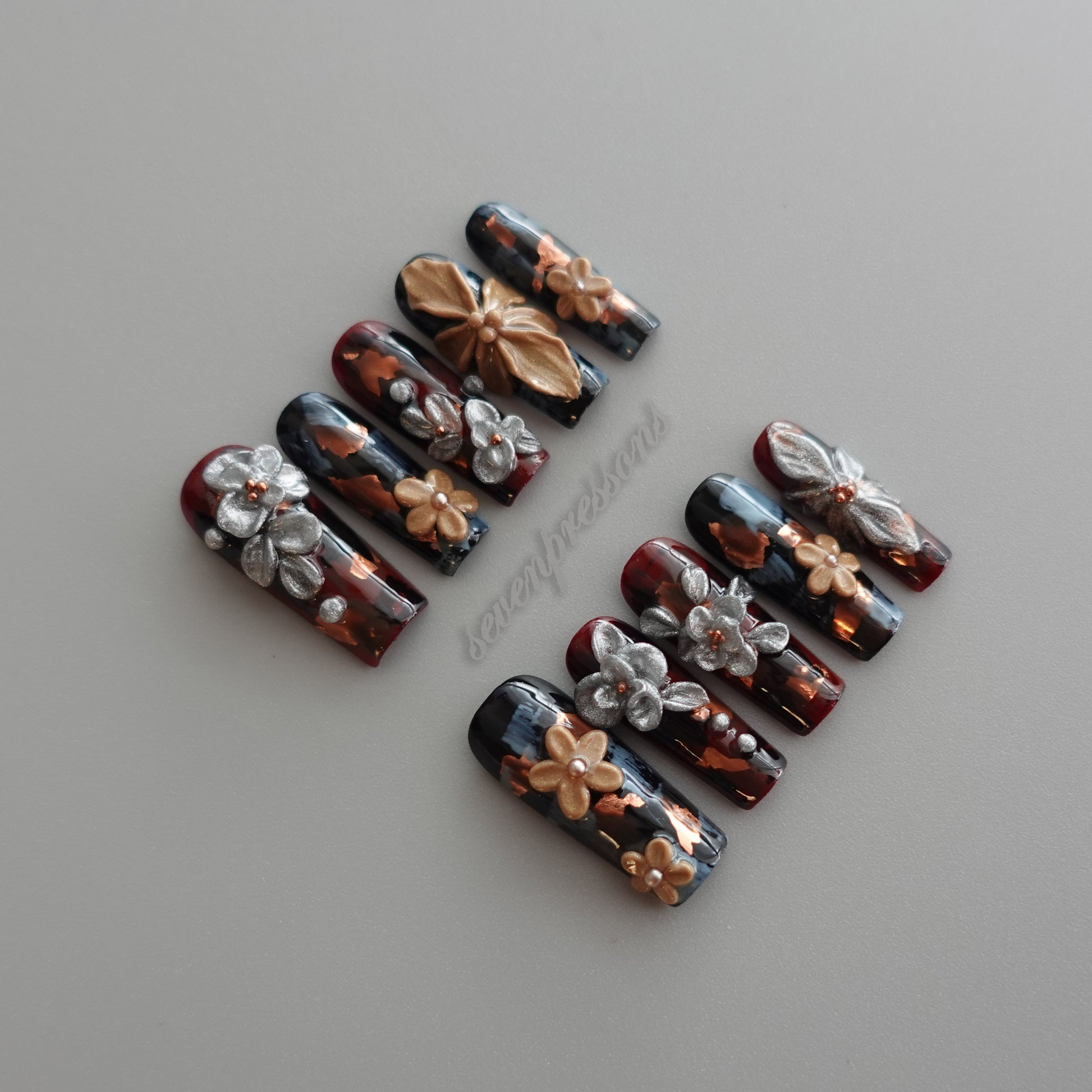 Smoldering layers of black, ember-red, and molten copper create a lava-like tortoise pattern beneath hand-molded 3D flowers in antique gold and silver. Each nail blends depth, sheen, and sculptural texture, forming a look that channels dark romance and imperial strength.