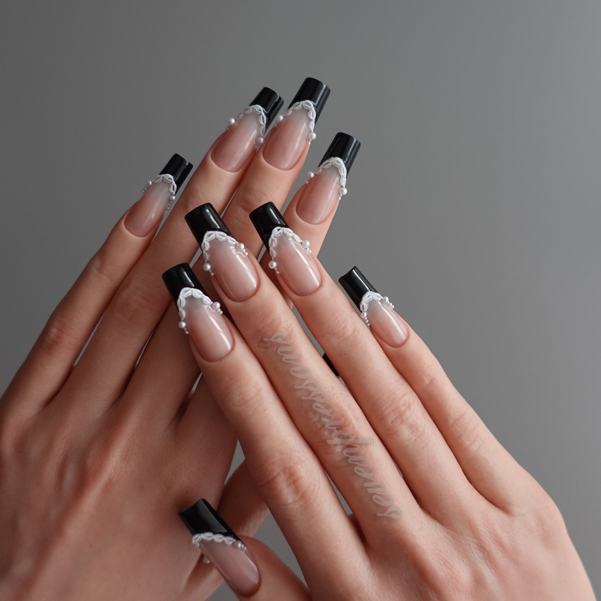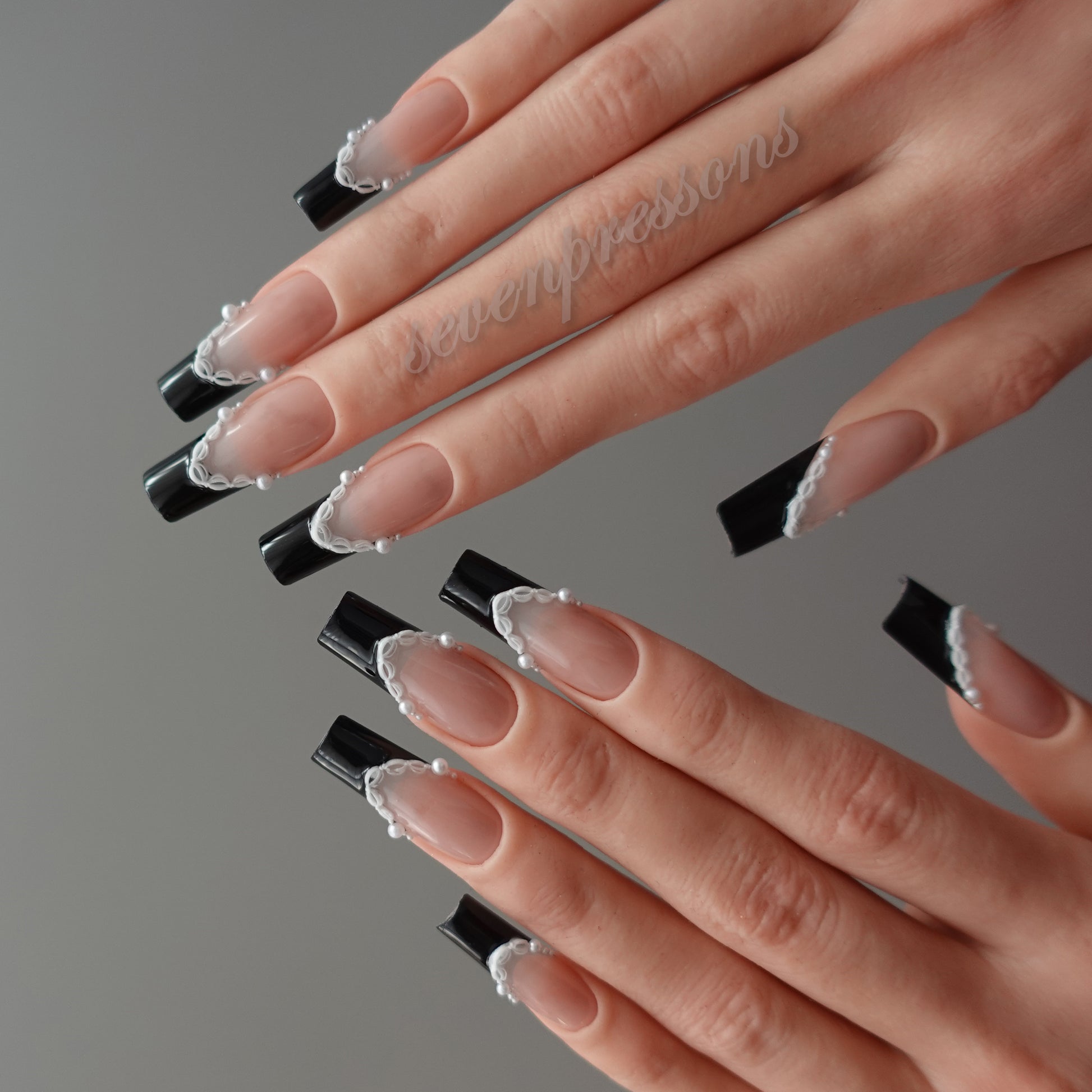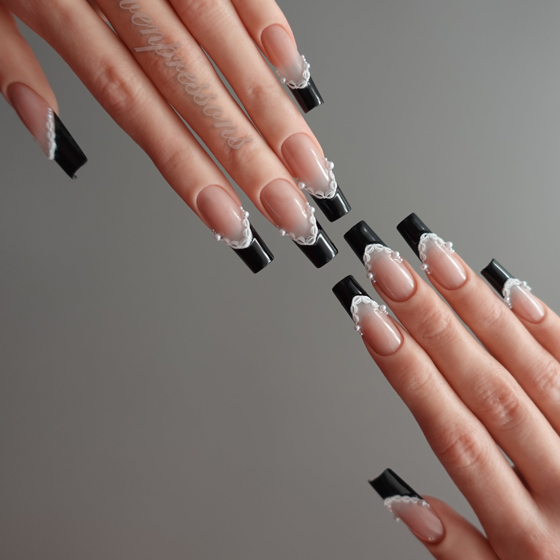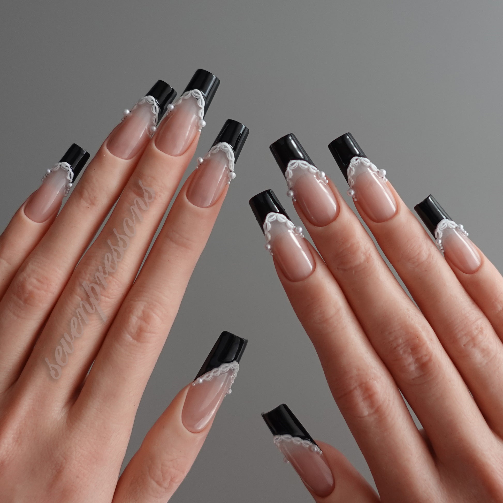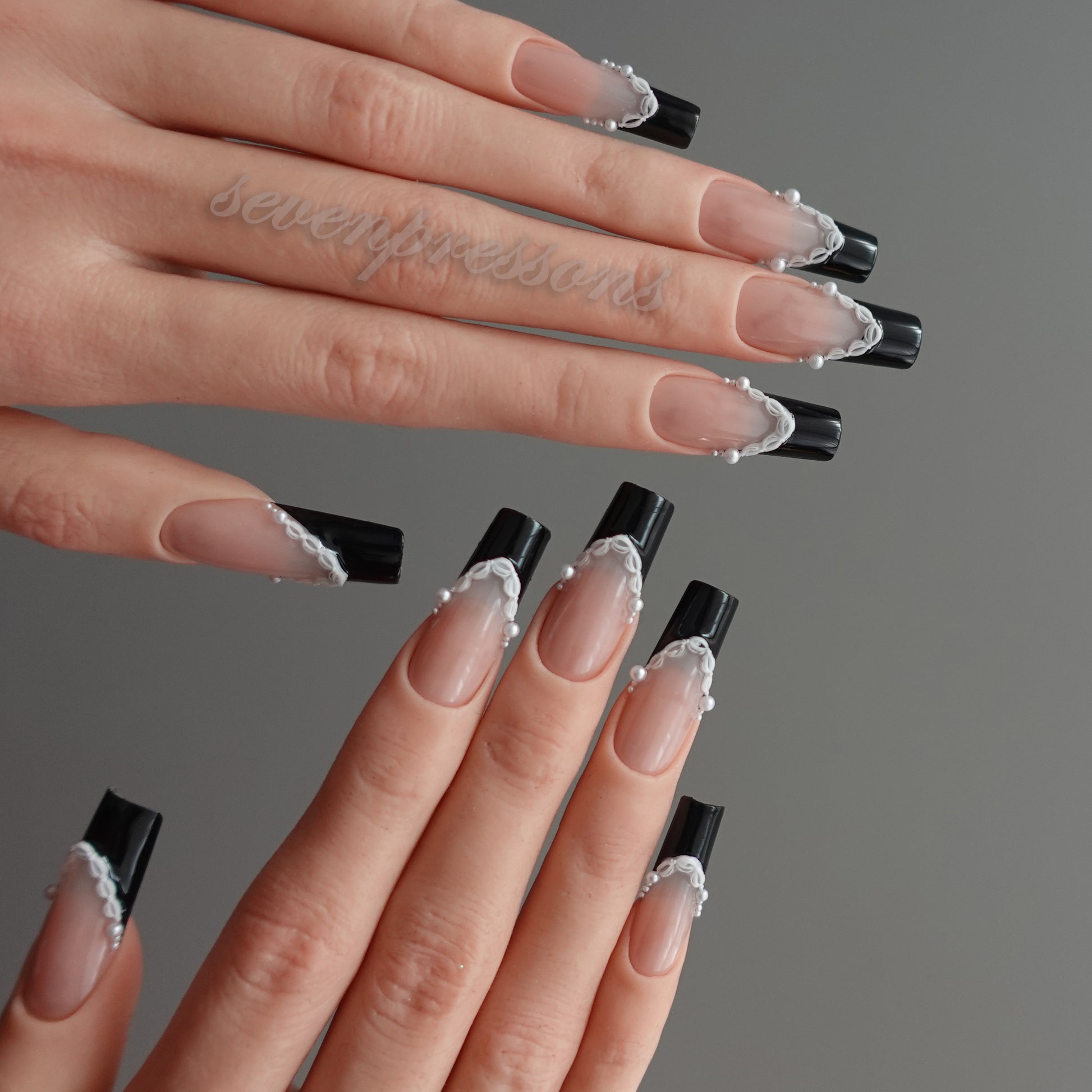 Midnight Pearl Veil is a study in contrast and quiet luxury — pairing deep onyx tips with soft nude translucence, all crowned with delicate pearl-laced borders.