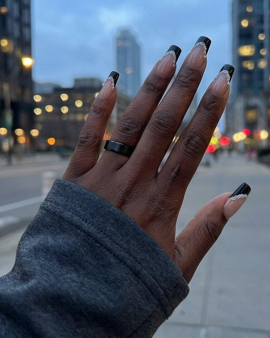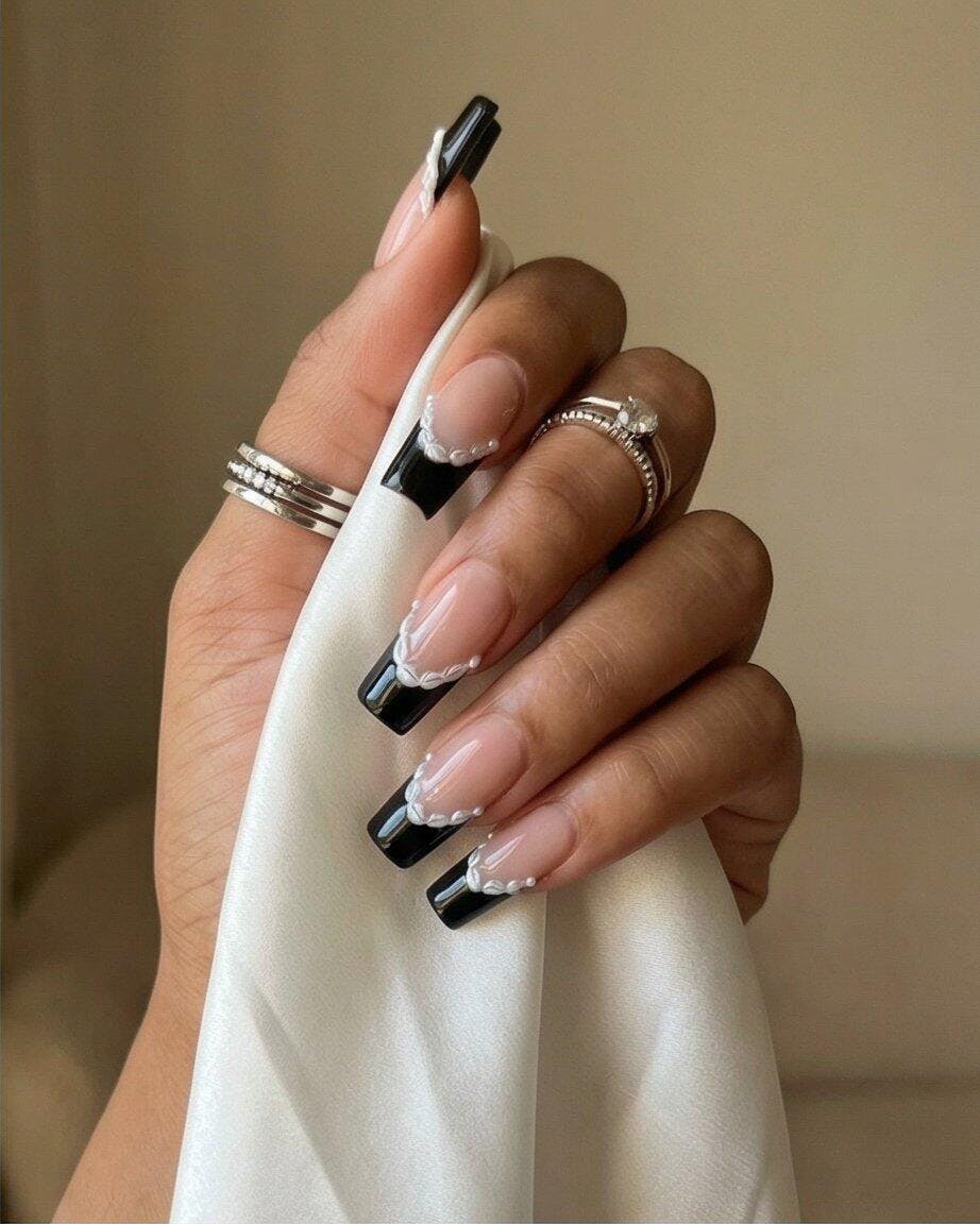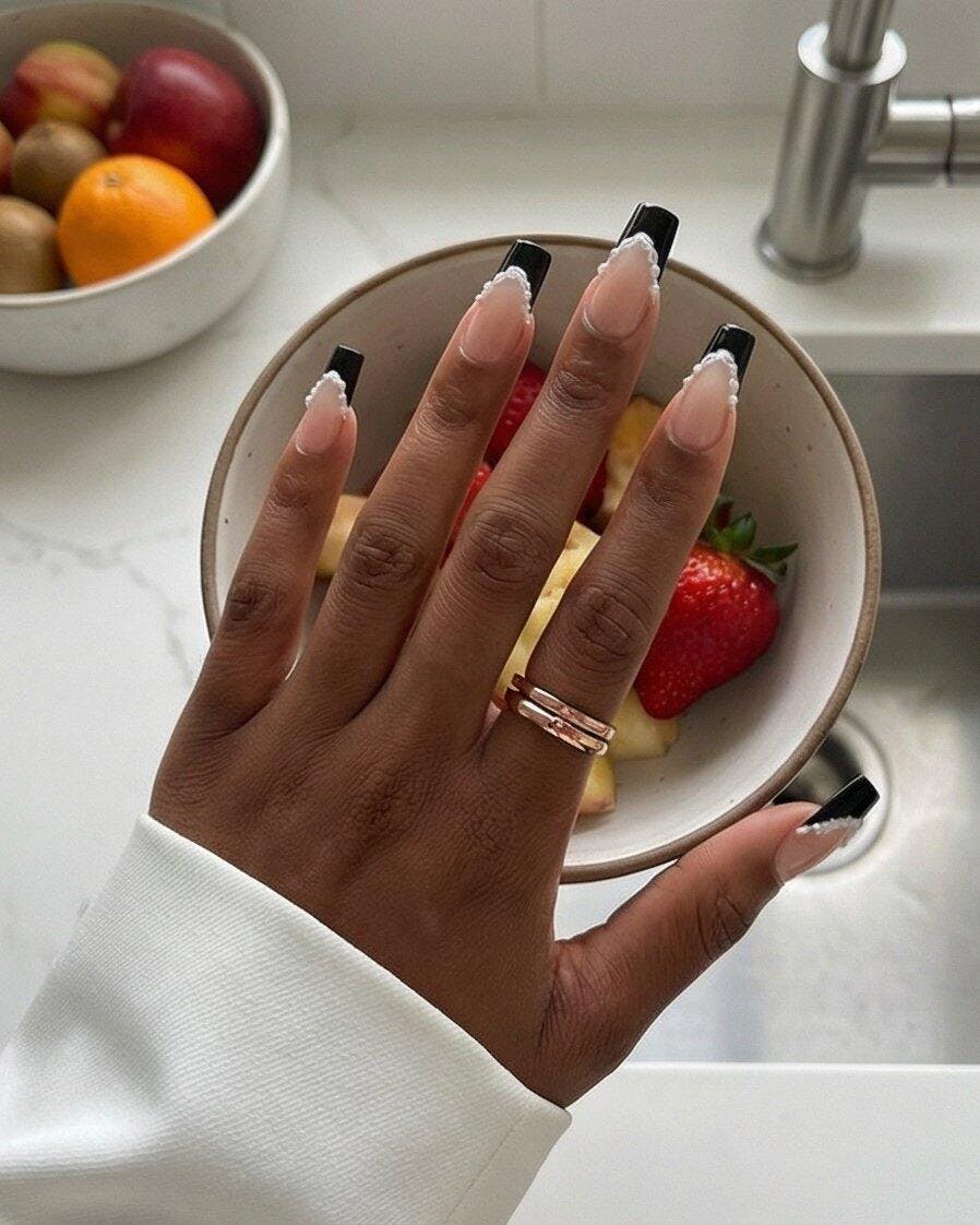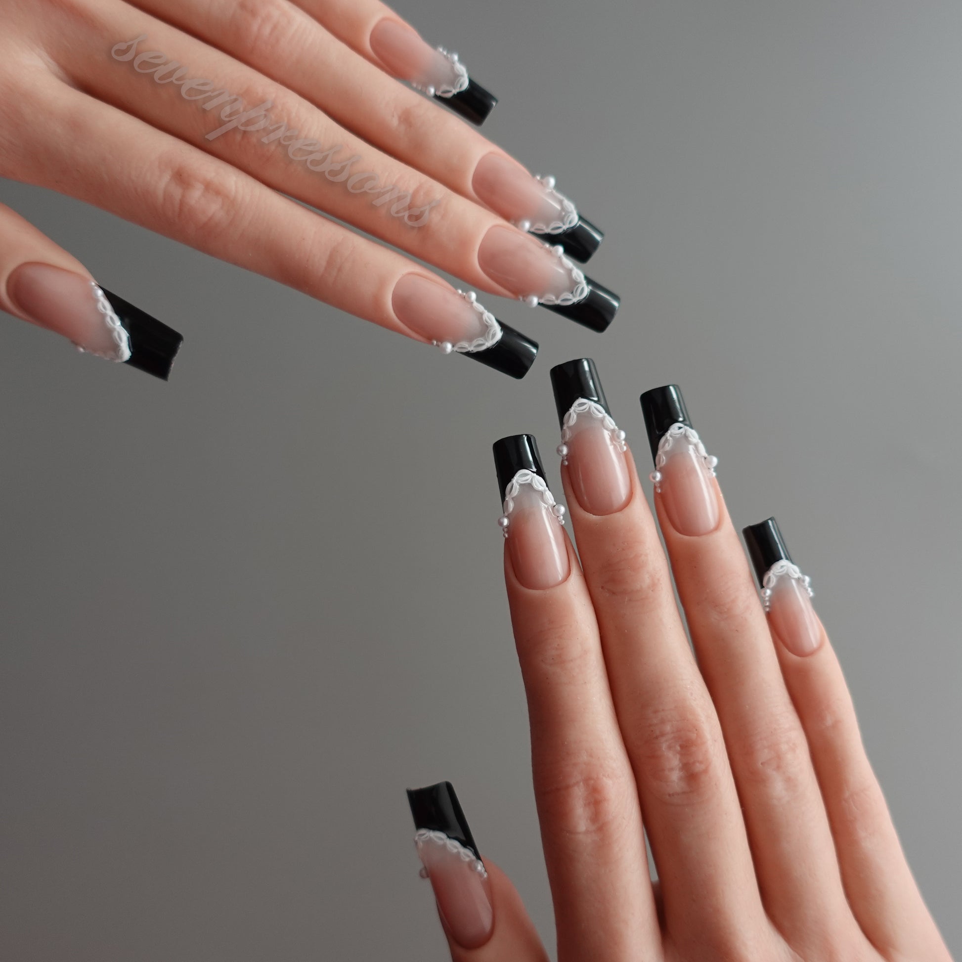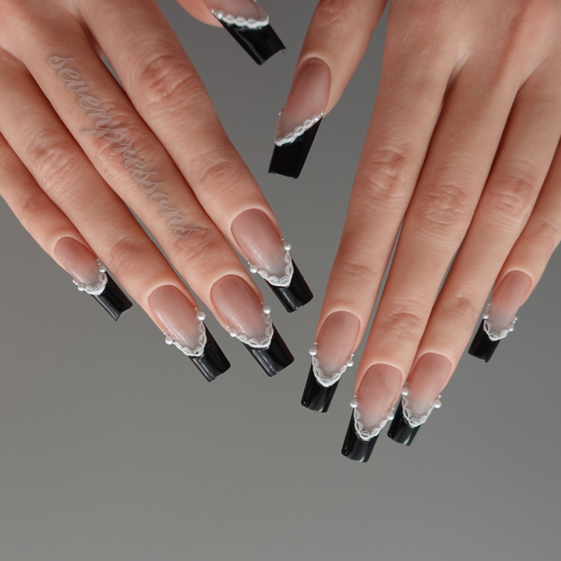 Midnight Pearl Veil is a study in contrast and quiet luxury — pairing deep onyx tips with soft nude translucence, all crowned with delicate pearl-laced borders.