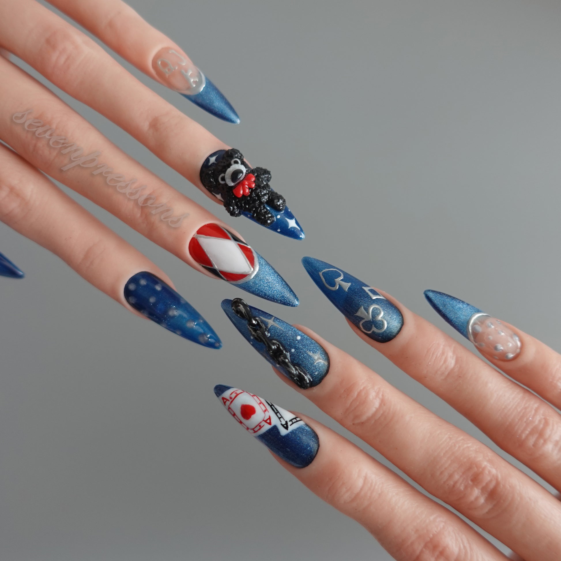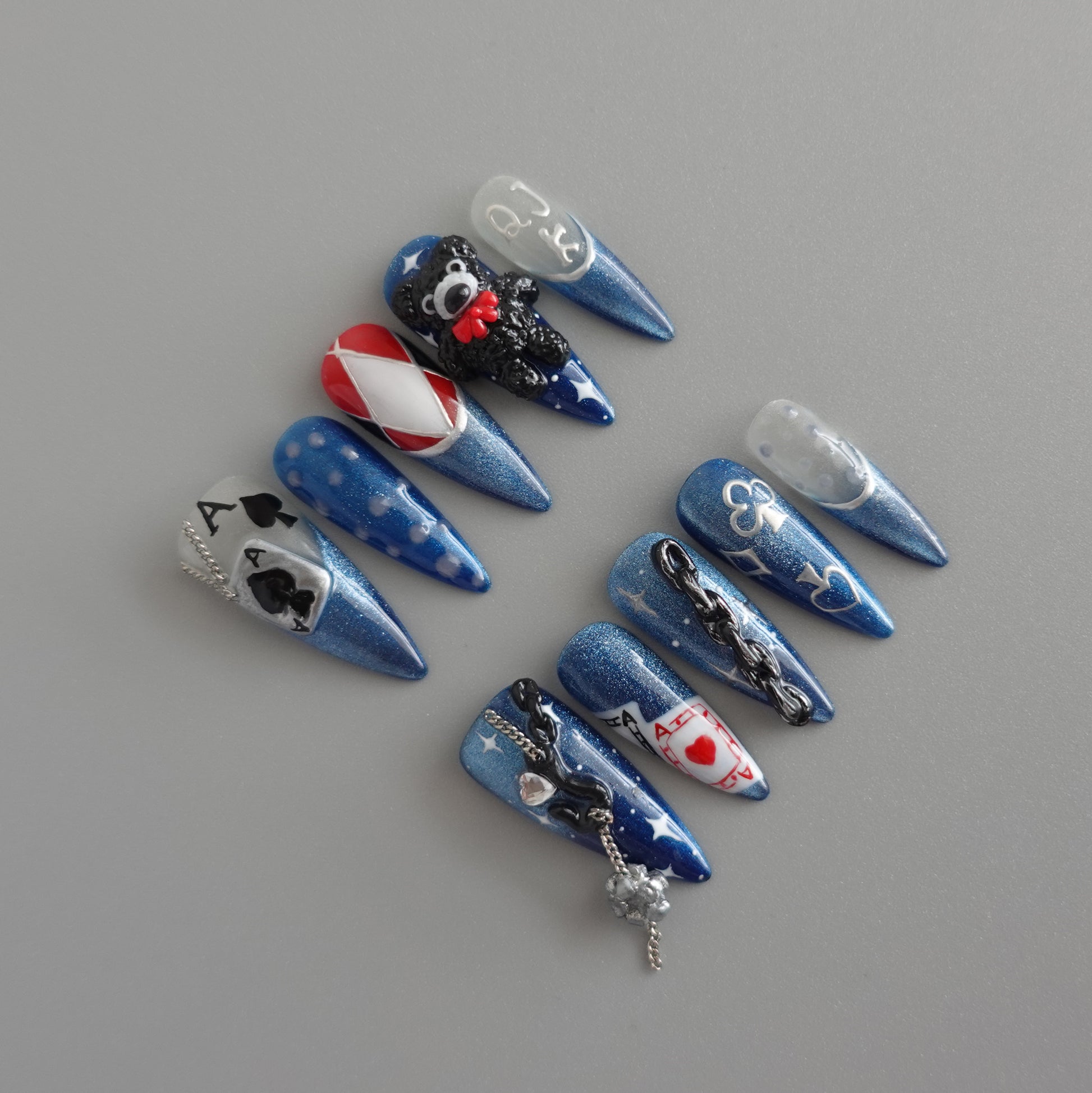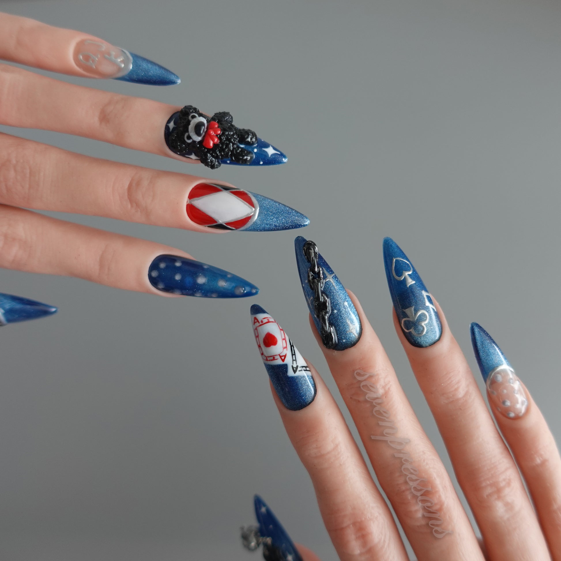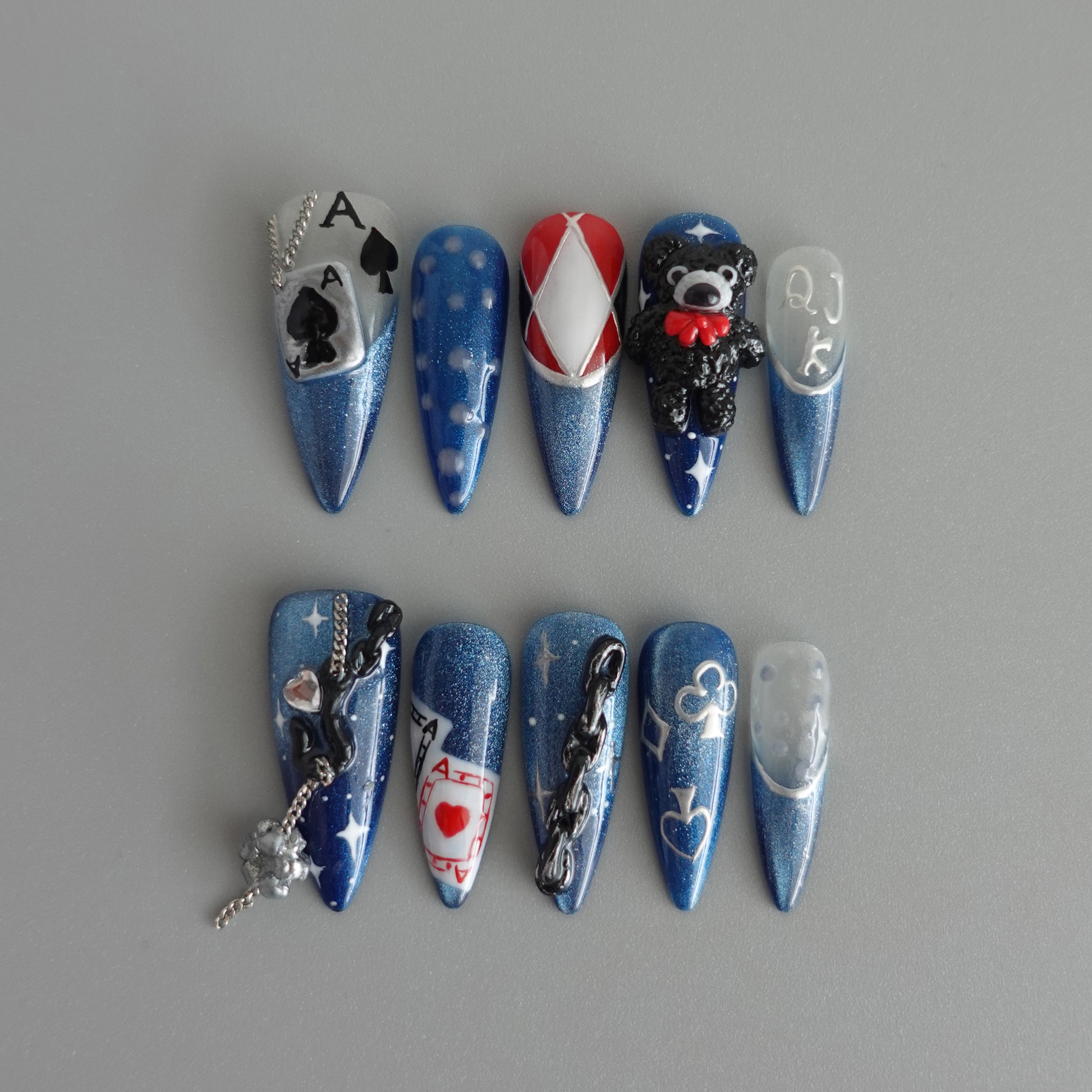 Step into a midnight circus where whimsy meets mischief. Royal Trickster plays with the symbols of fate โ glossy playing cards, harlequin diamonds, and a jet-black bear guarding his crimson bow. Chains, charms, and shimmering cosmic blue bases bring a surreal touch of rebellion and play. Itโs a set made for those who love to bend the rules and win hearts with a wink.