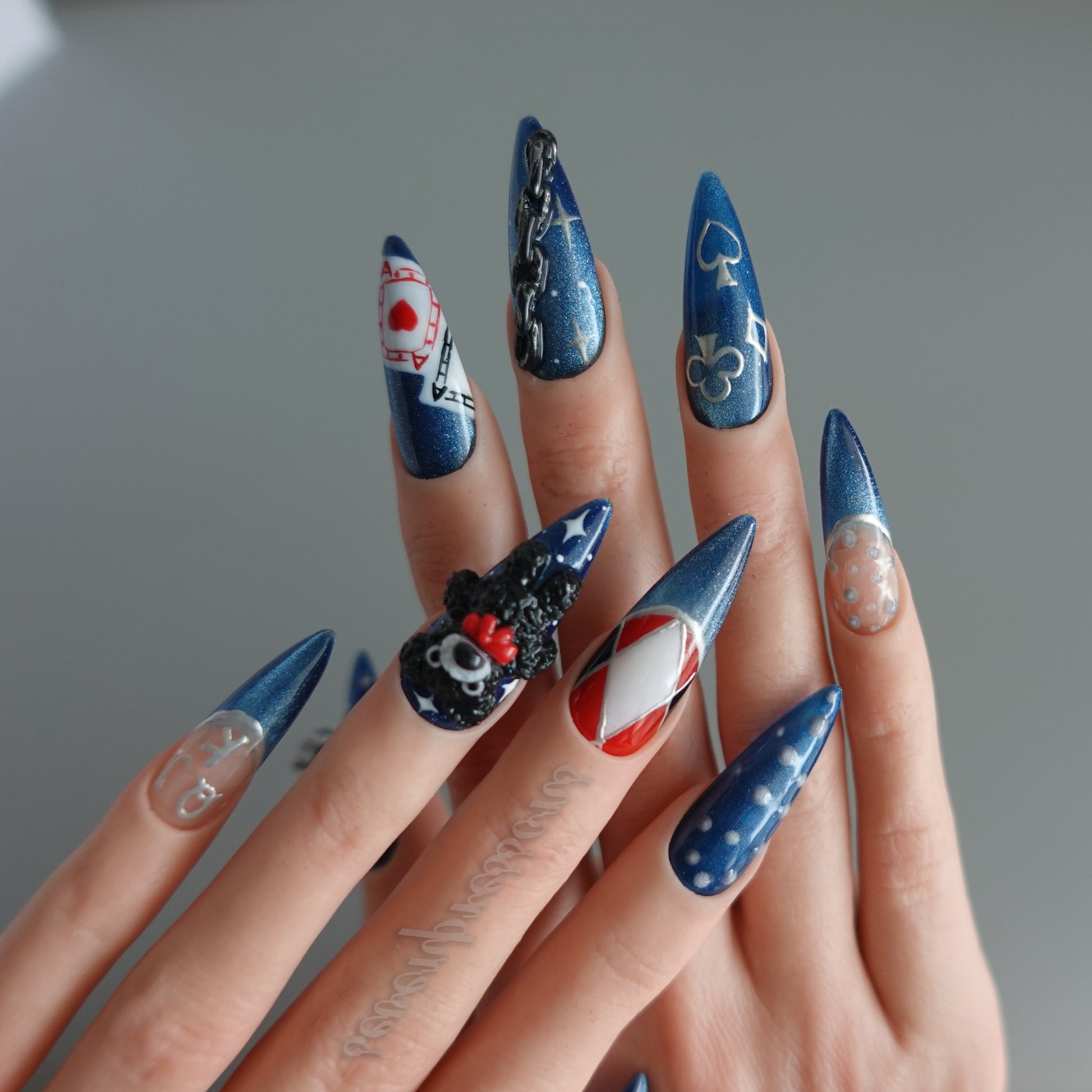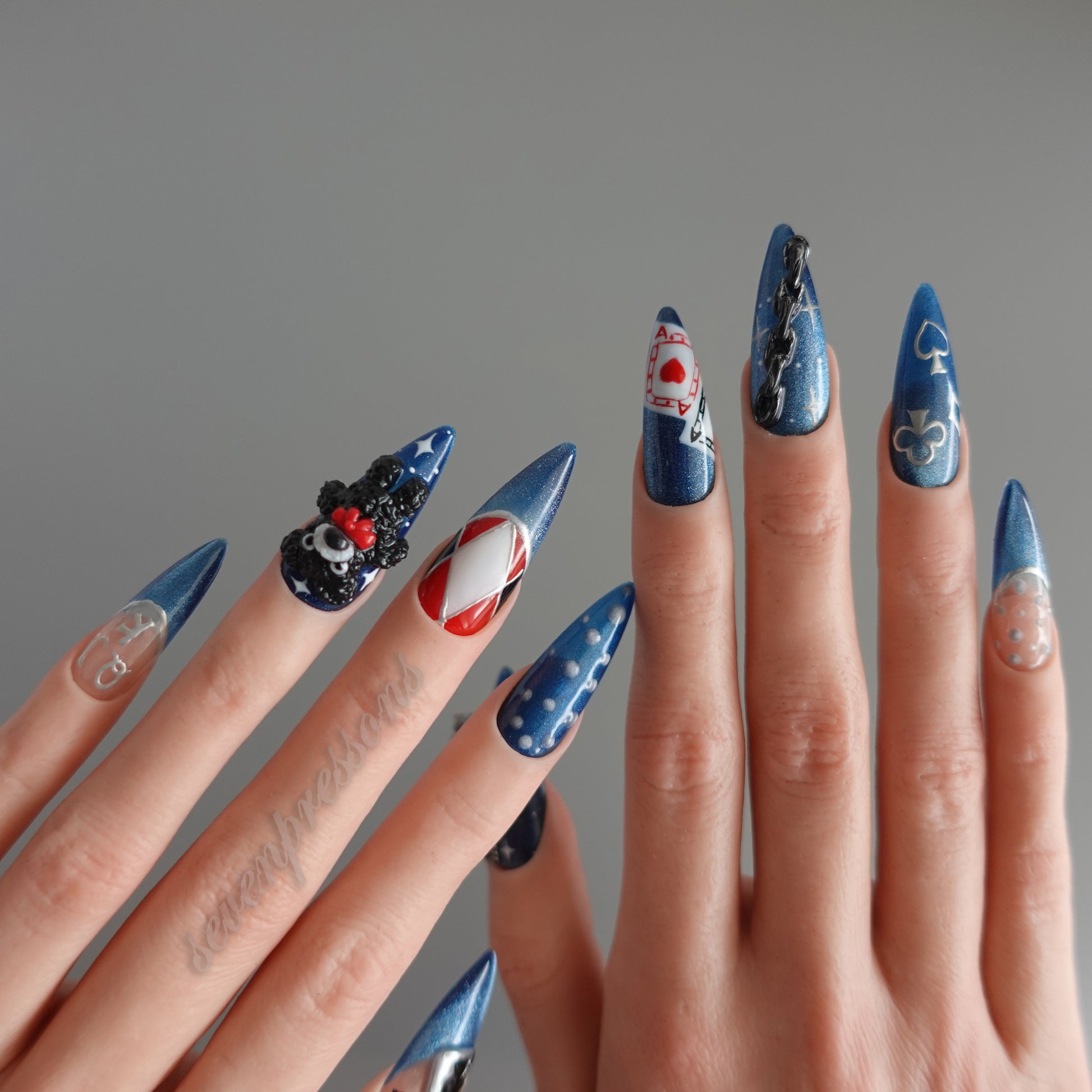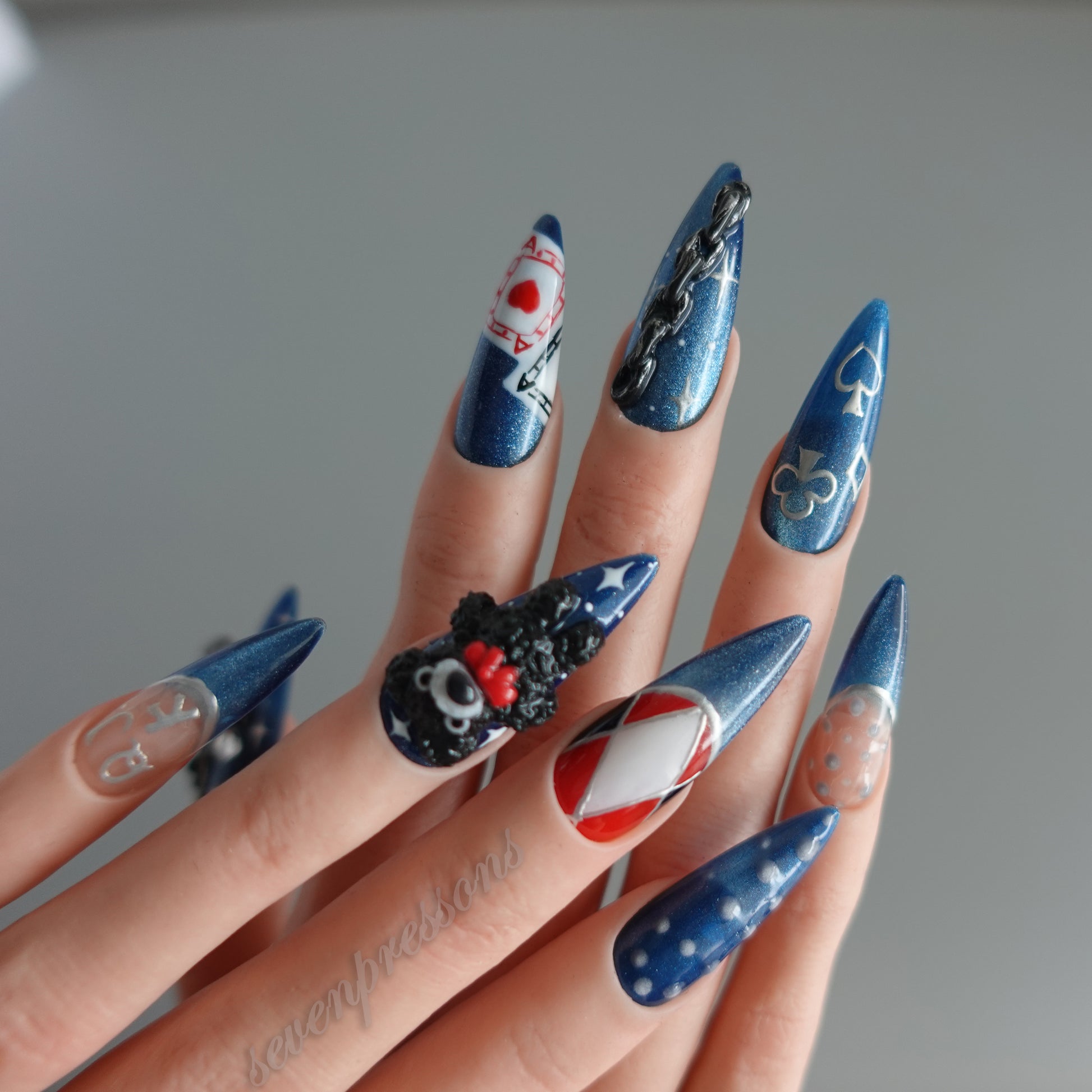 Step into a midnight circus where whimsy meets mischief. Royal Trickster plays with the symbols of fate โ glossy playing cards, harlequin diamonds, and a jet-black bear guarding his crimson bow. Chains, charms, and shimmering cosmic blue bases bring a surreal touch of rebellion and play. Itโs a set made for those who love to bend the rules and win hearts with a wink.
