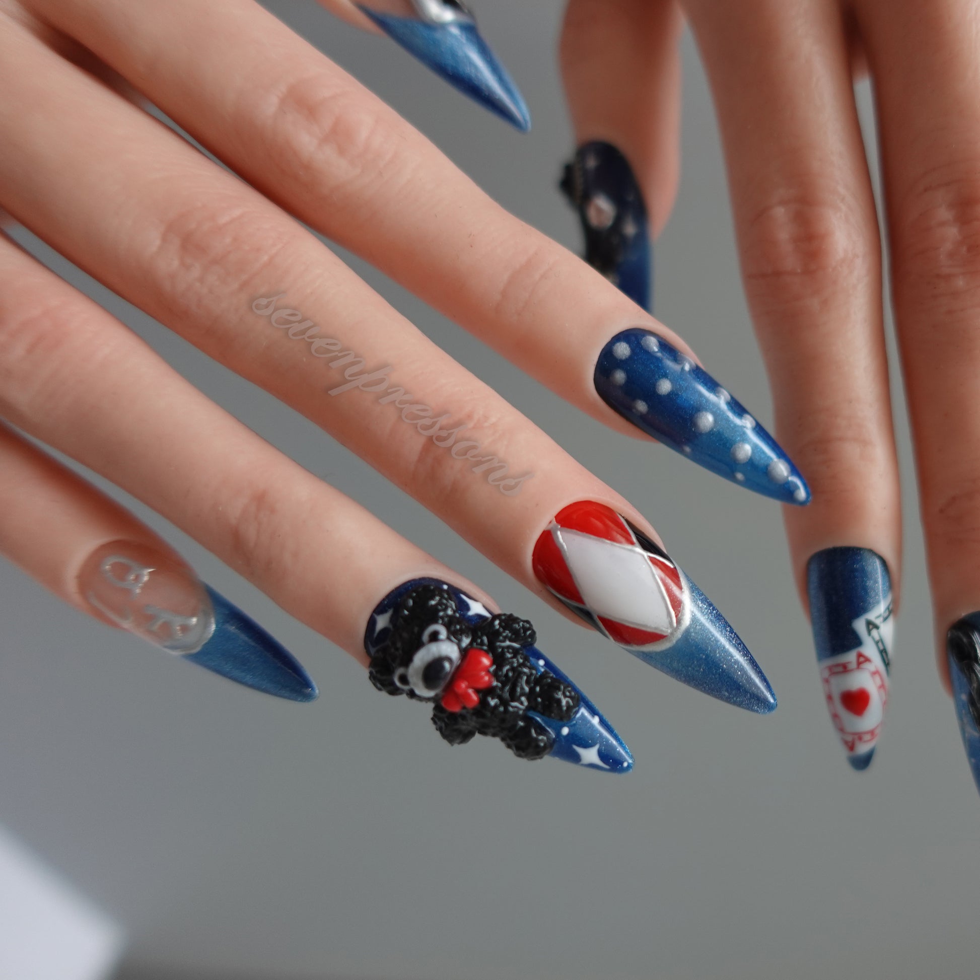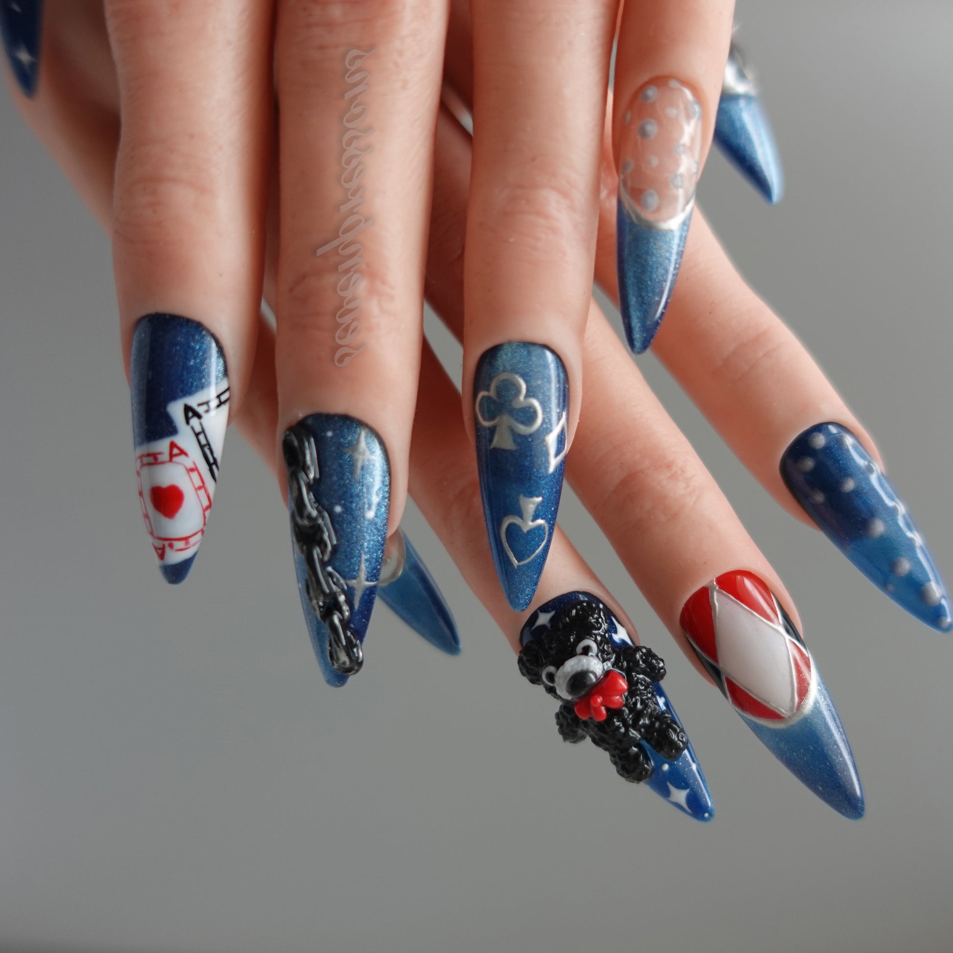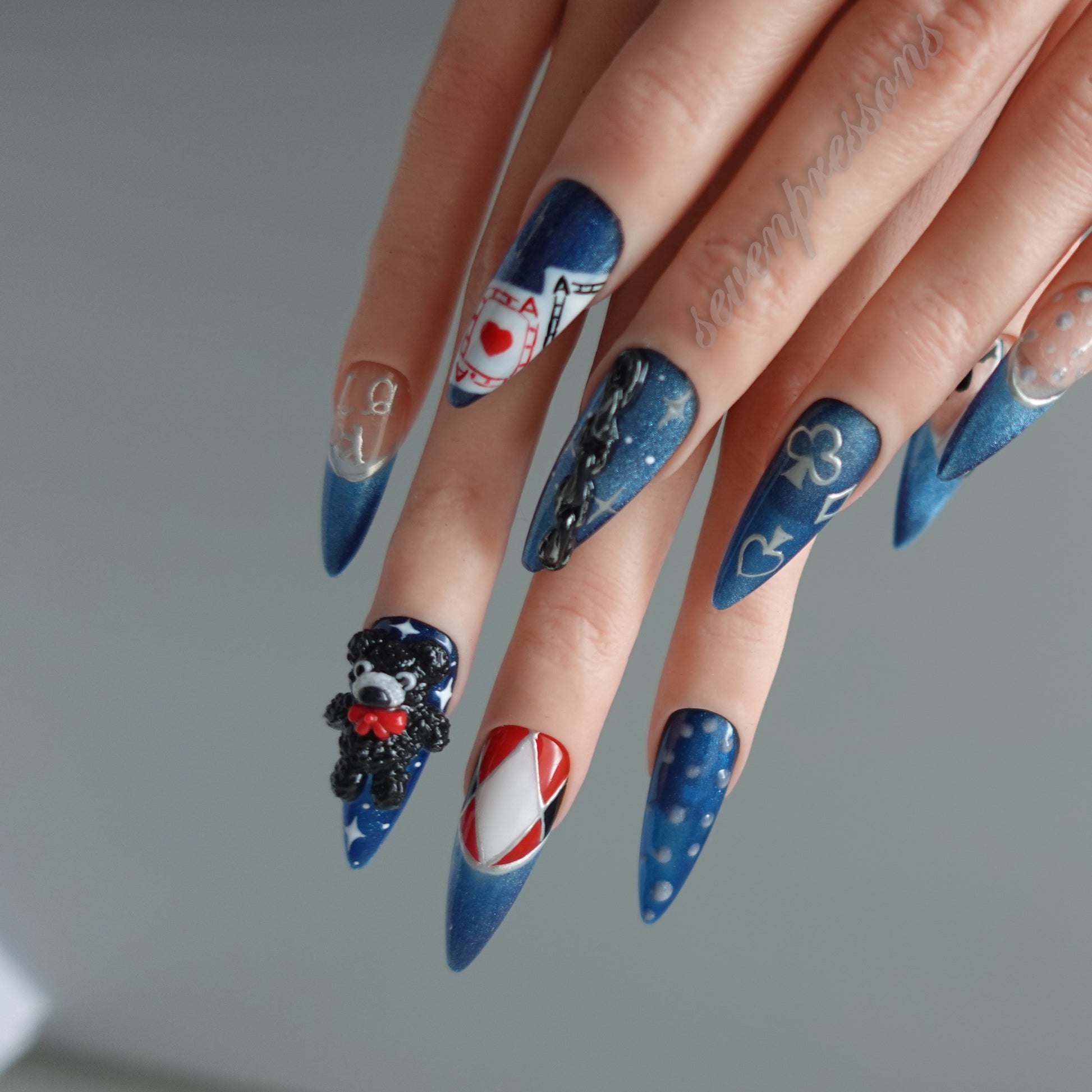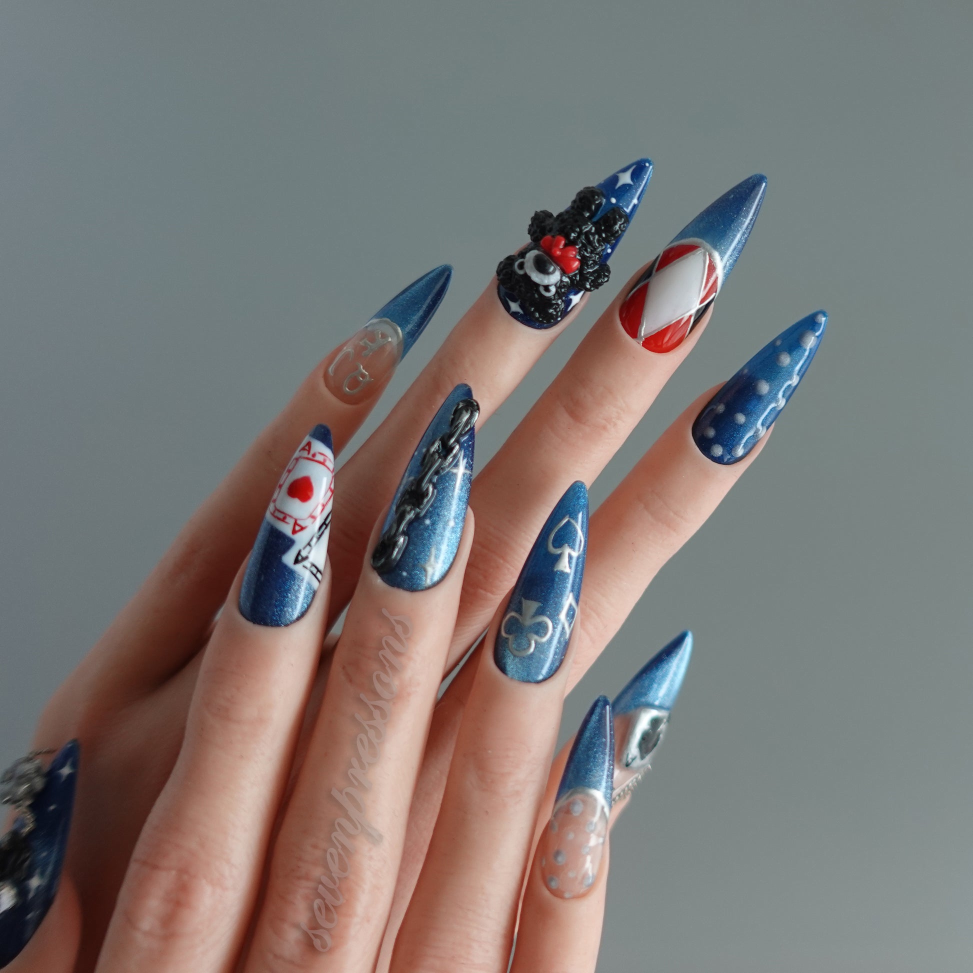Step into a midnight circus where whimsy meets mischief. Royal Trickster plays with the symbols of fate โ glossy playing cards, harlequin diamonds, and a jet-black bear guarding his crimson bow. Chains, charms, and shimmering cosmic blue bases bring a surreal touch of rebellion and play. Itโs a set made for those who love to bend the rules and win hearts with a wink.