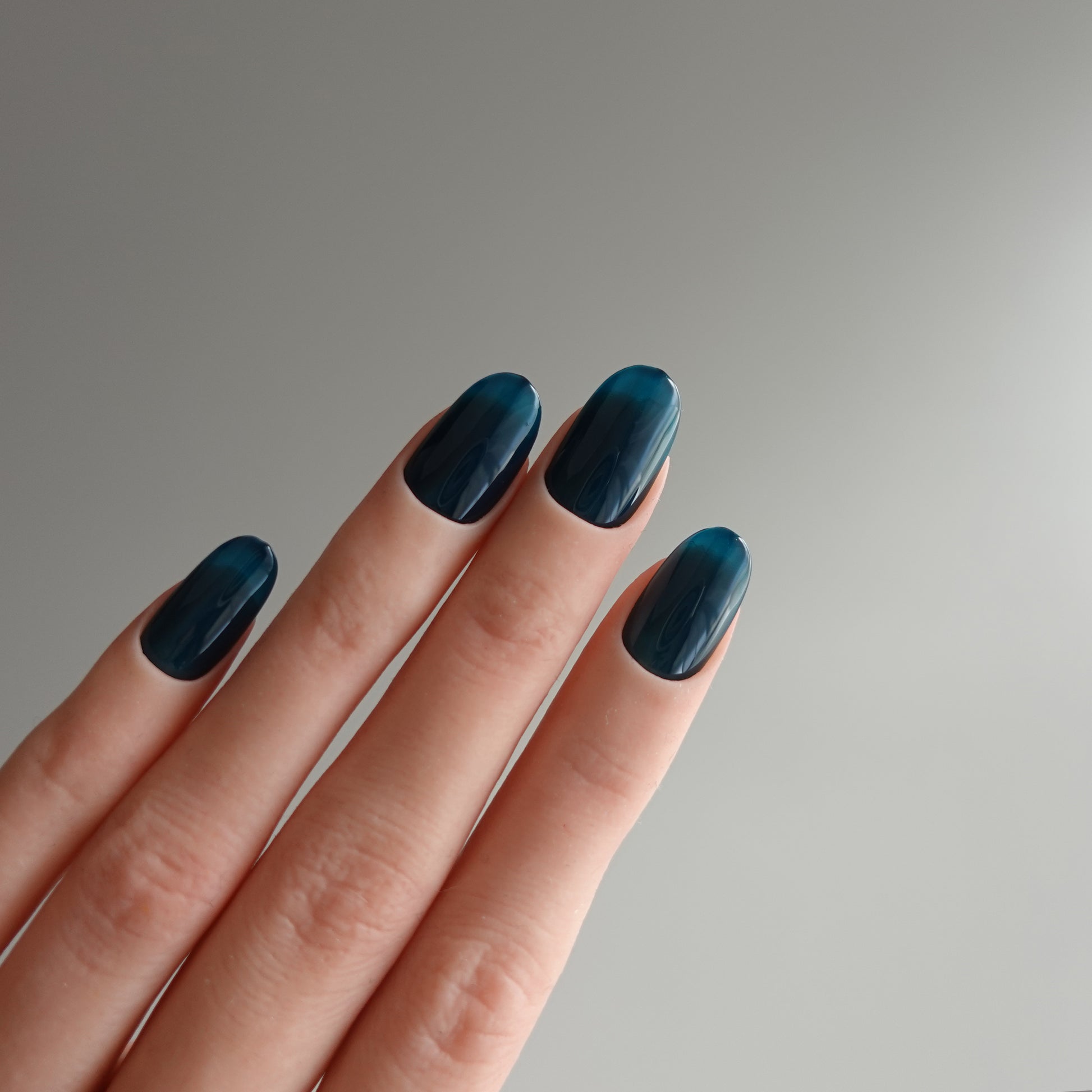 The color shifts richly under natural light, creating a liquid, dimensional effect reminiscent of deep waters and quiet midnight tides.