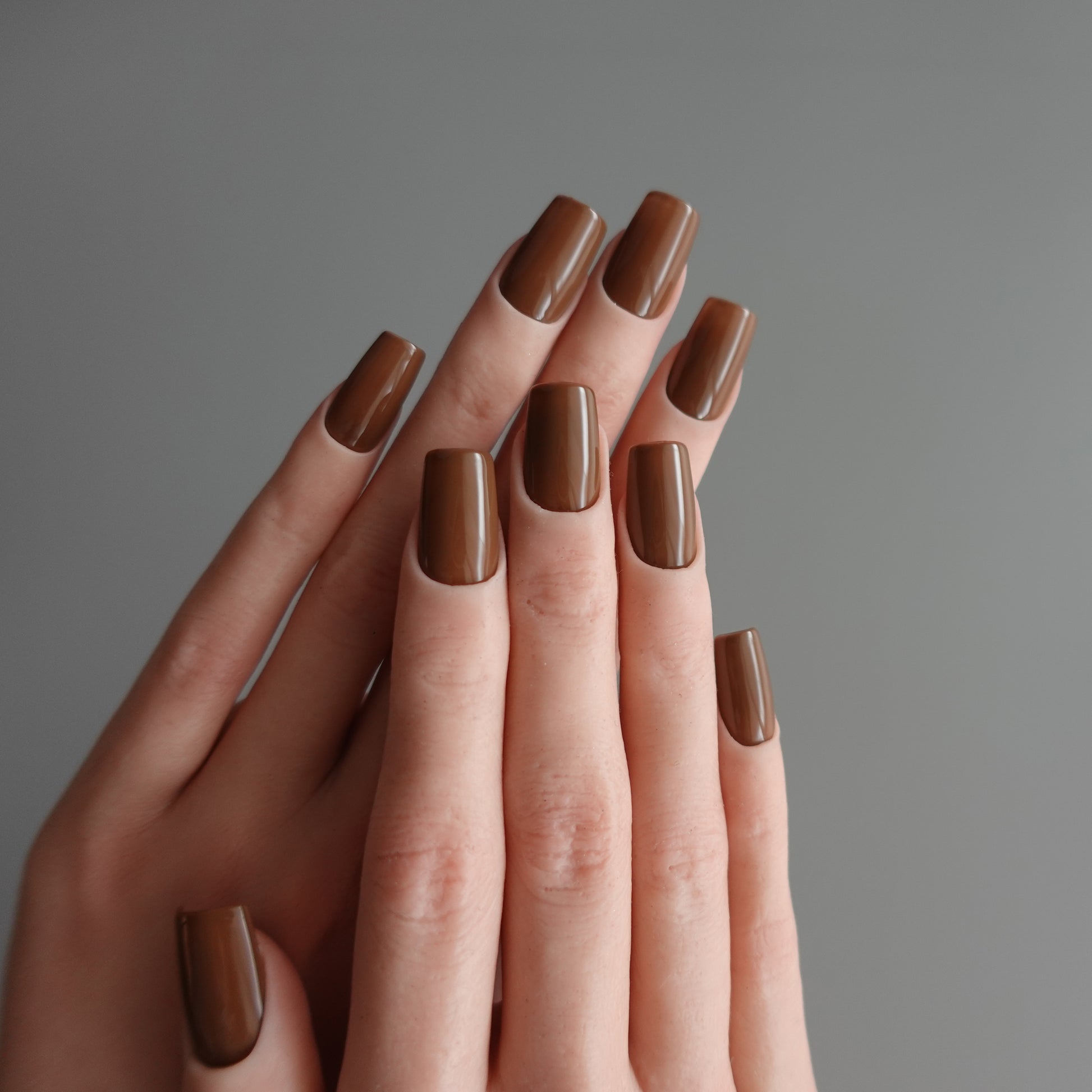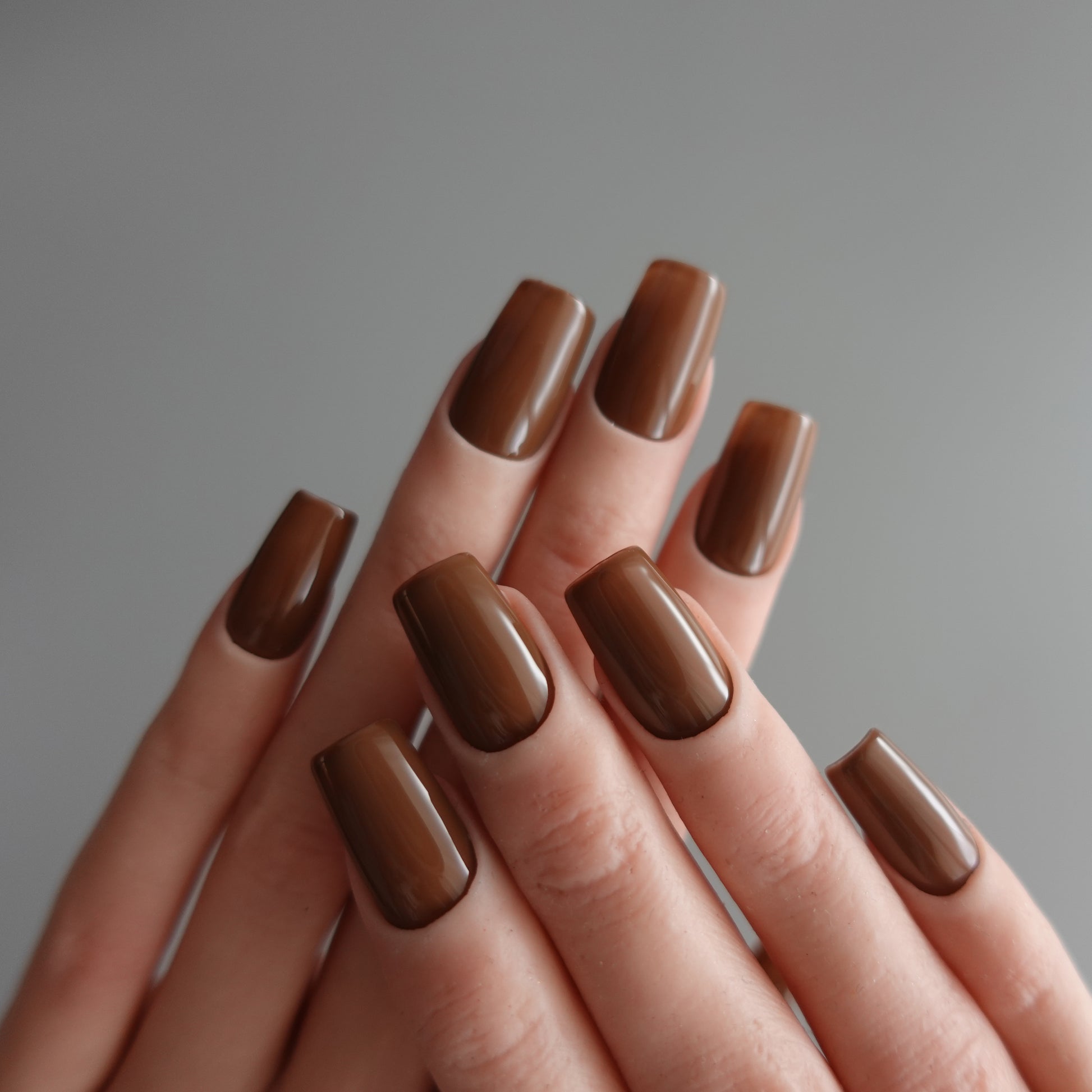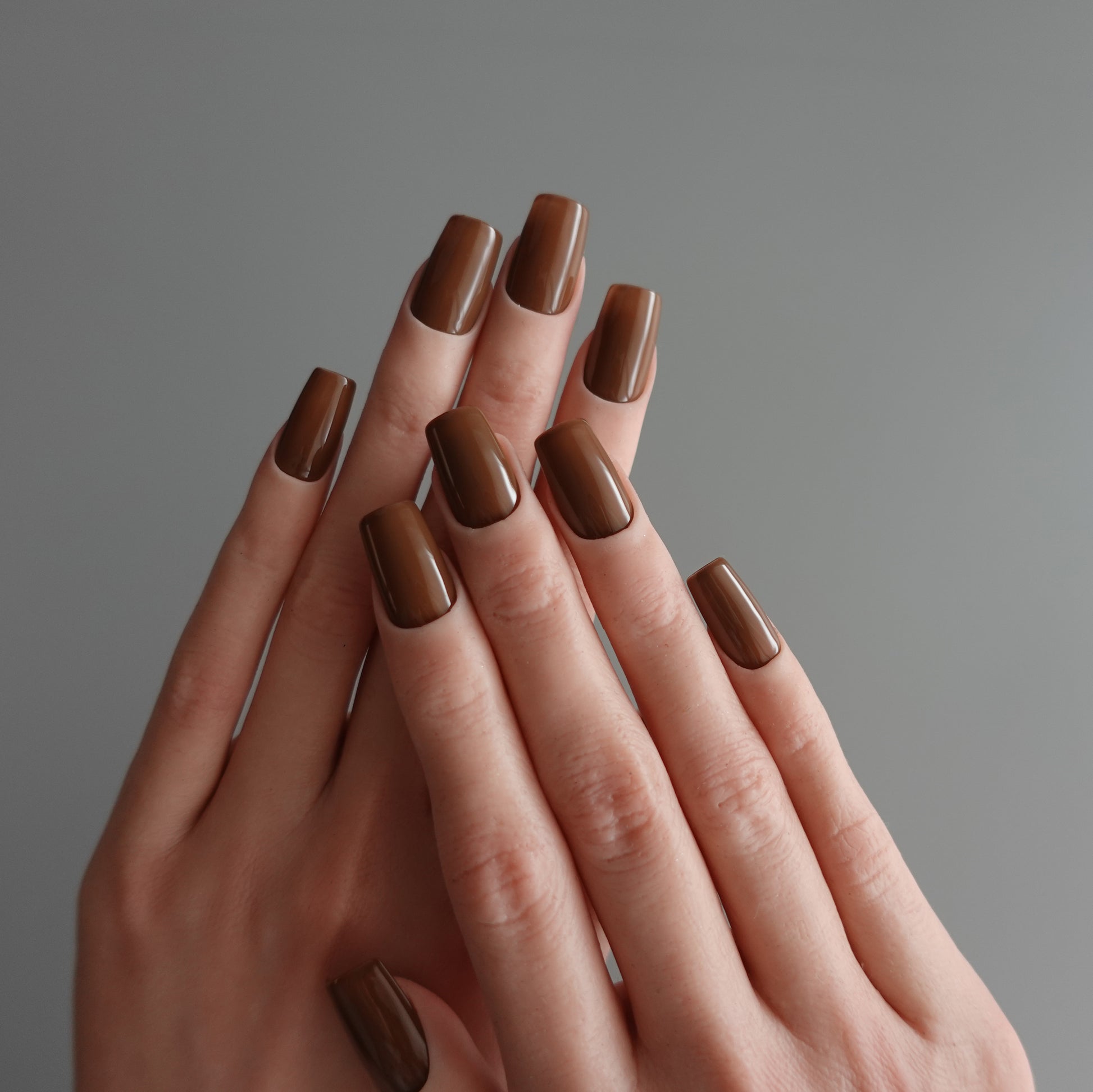 Cocoa Mirage is a warm, velvety cocoa brown with a soft translucent sheen, creating a smooth, melted-chocolate glow.