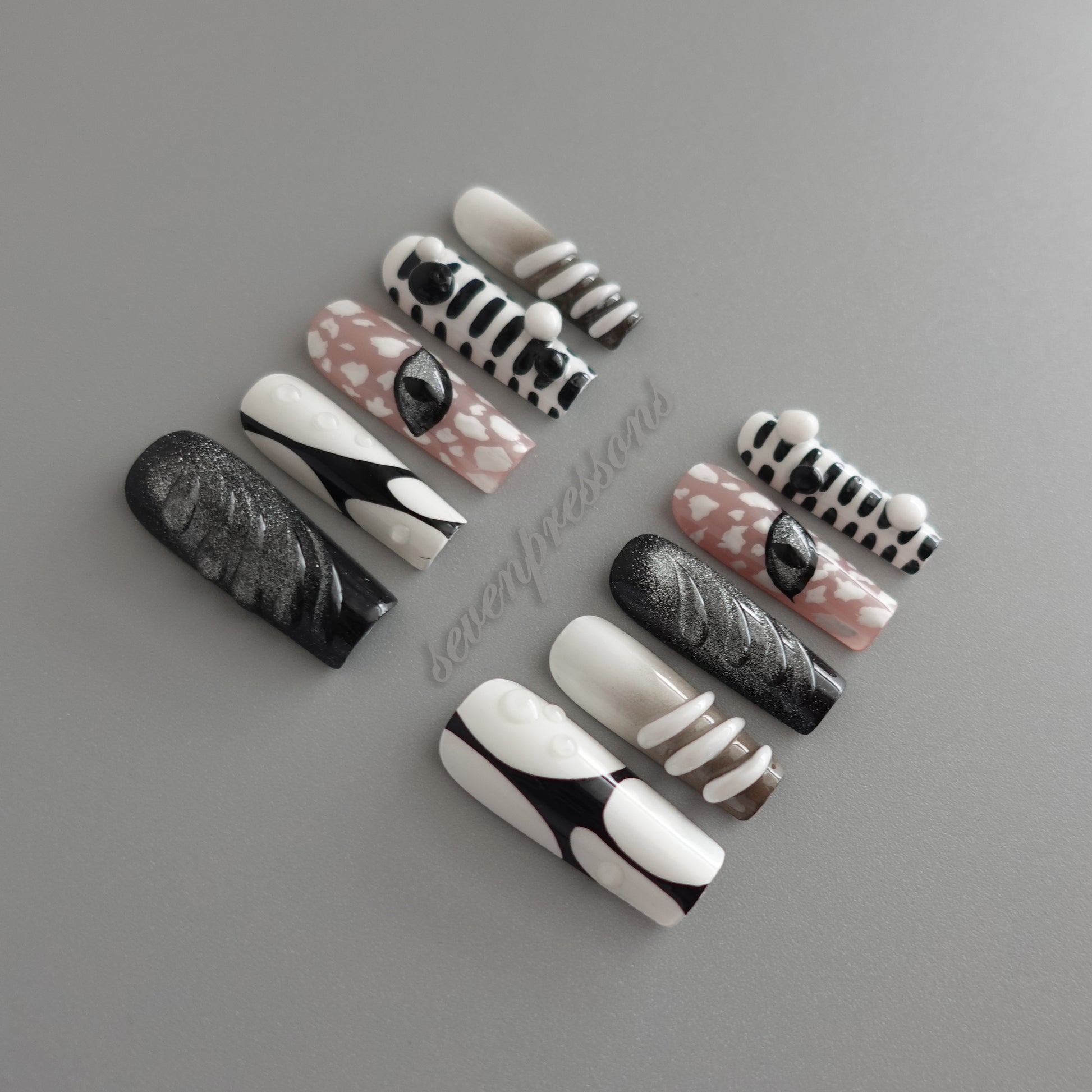 Futuristic, bold, and hypnotic. Midnight Reflex merges edgy contrast with surreal illusions — metallic charcoal gradients, raised chrome “tubes”, glossy bubbles, zebra-coded stripes, and an iconic 3D eye motif that seems to watch back.