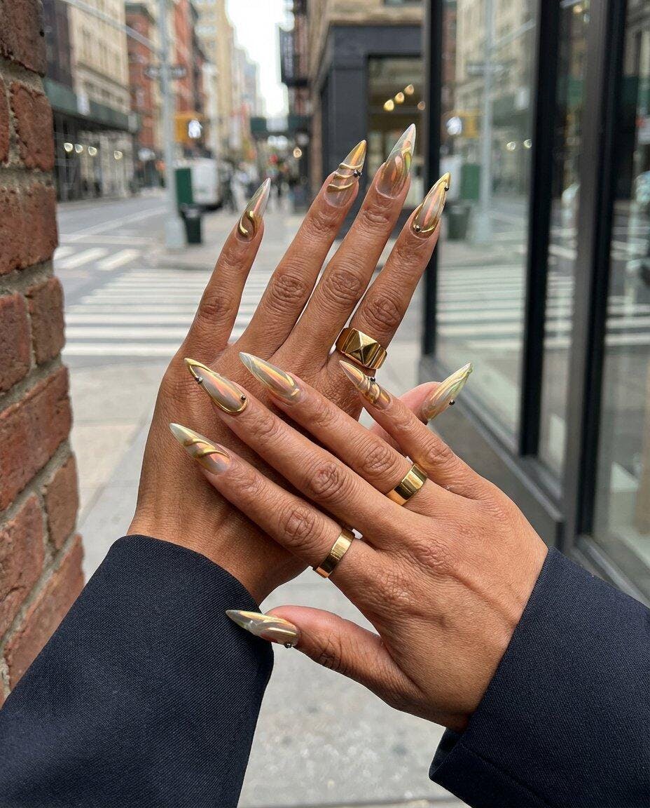 Aurora Alloy channels the otherworldly glow of shifting auroras — molten gold sculpted over iridescent chrome that changes with every movement.
