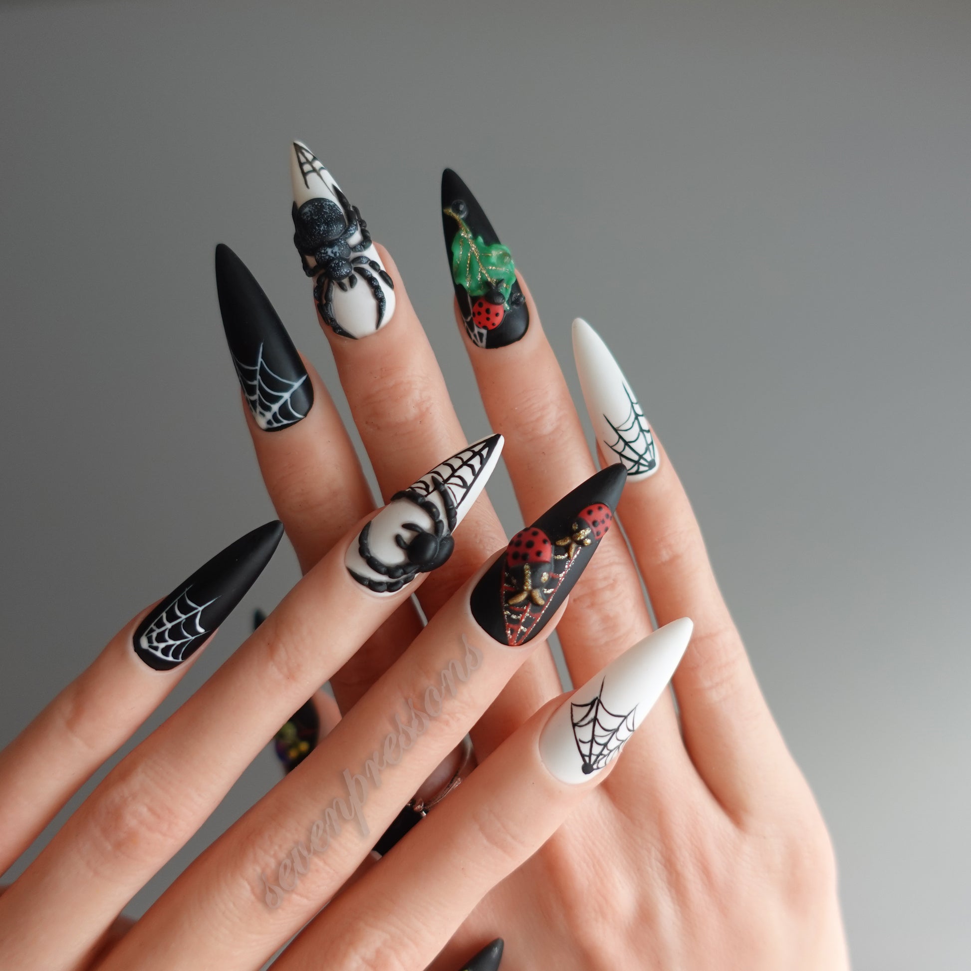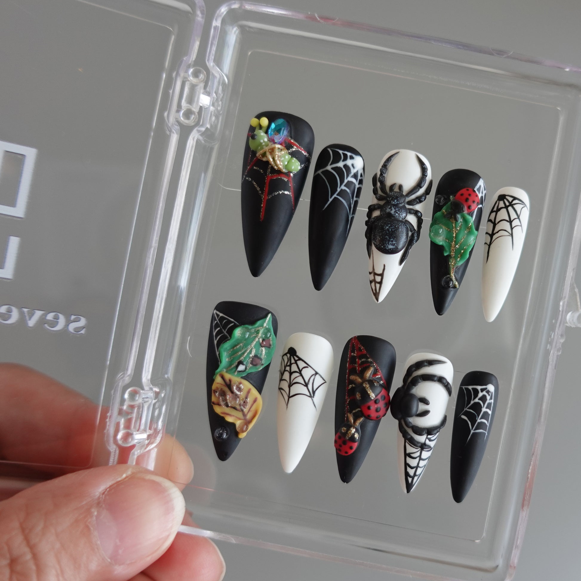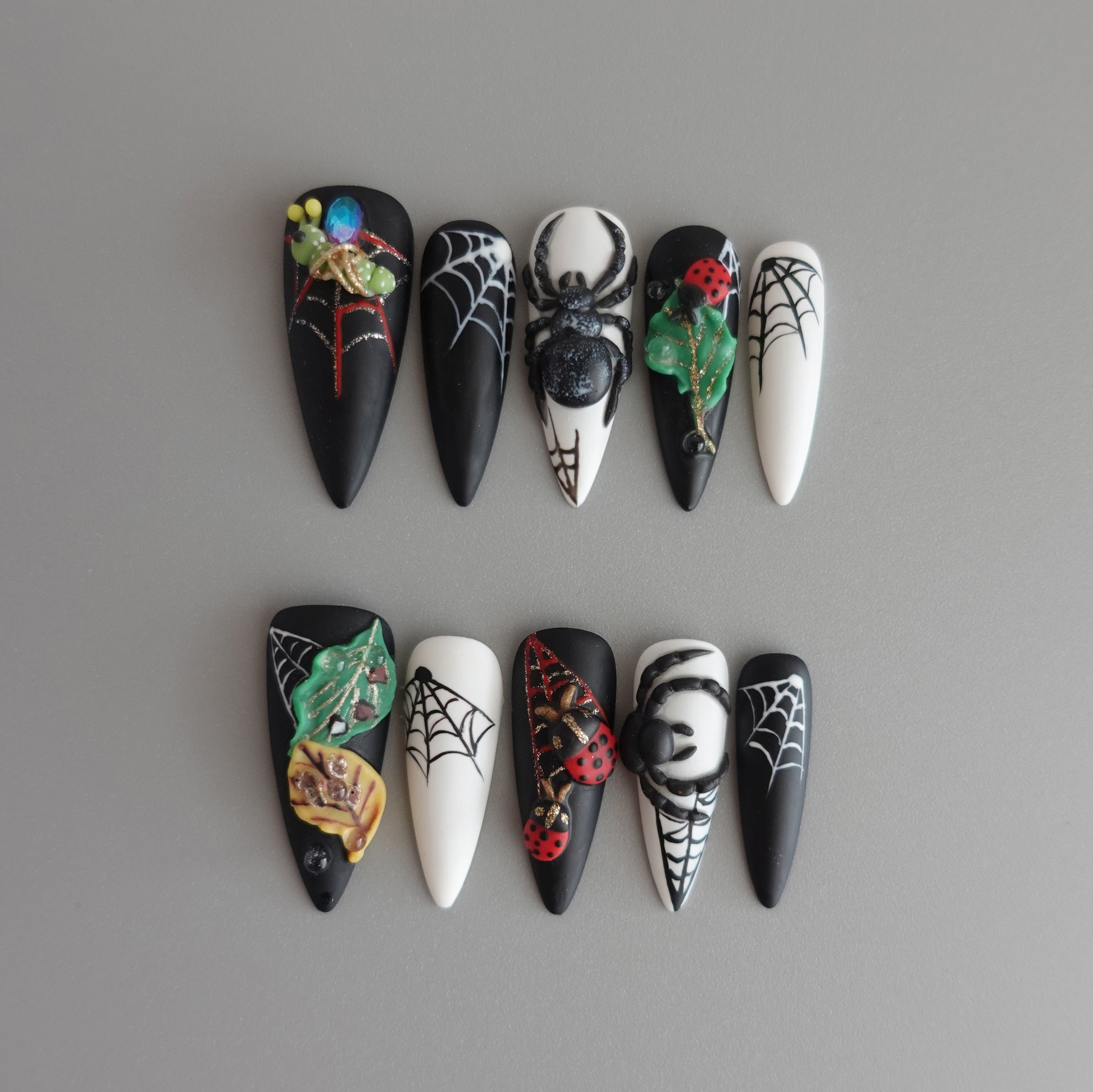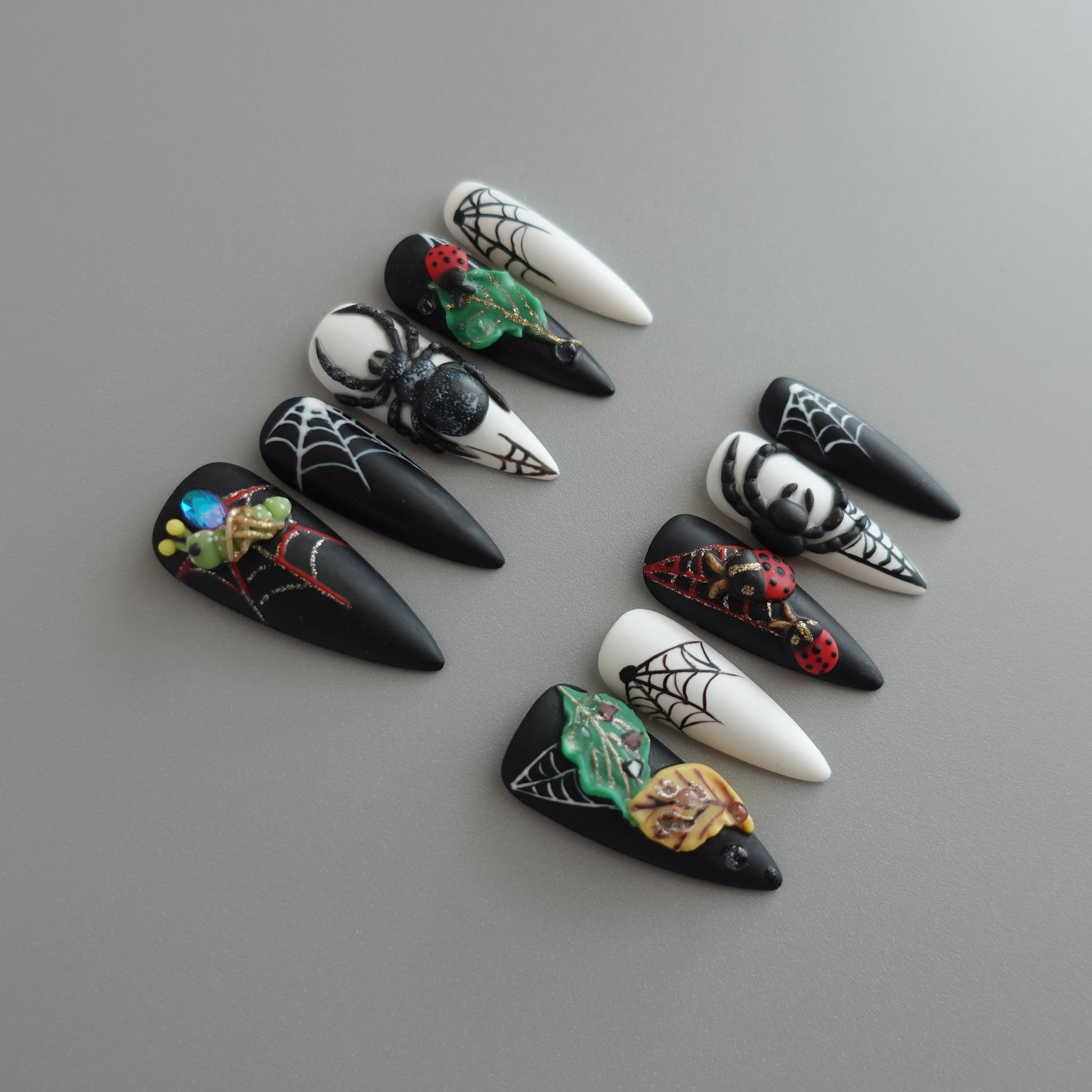 Hand-sculpted spiders crawl across matte black and ivory white tips, tangled in shimmering webs of silver and red. Each creature—adorned with gems, leaves, and scarlet beetles—captures the haunting beauty of decay and rebirth. This set is both eerie and exquisite, perfect for those who dance on the edge of darkness and glamour.