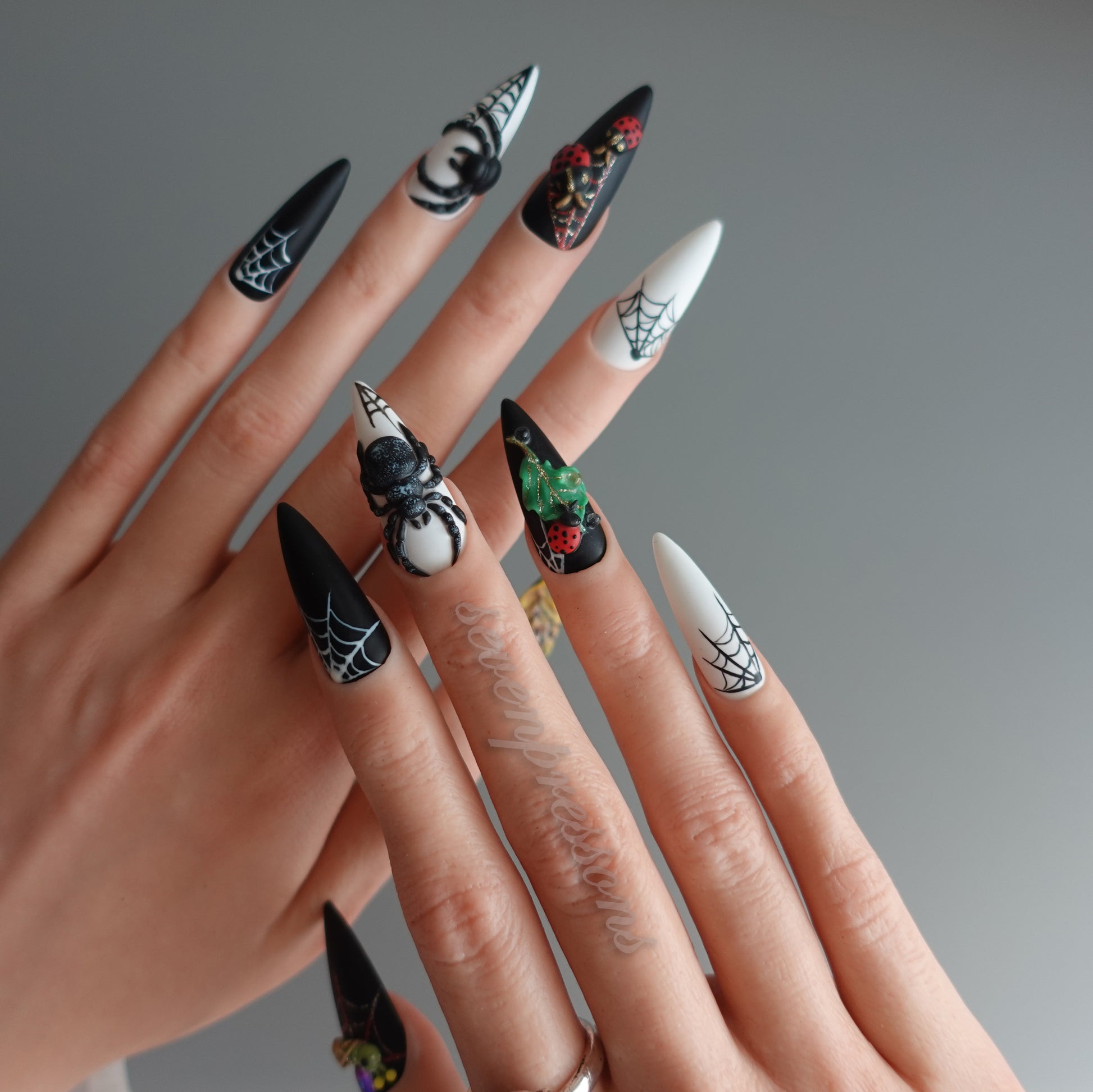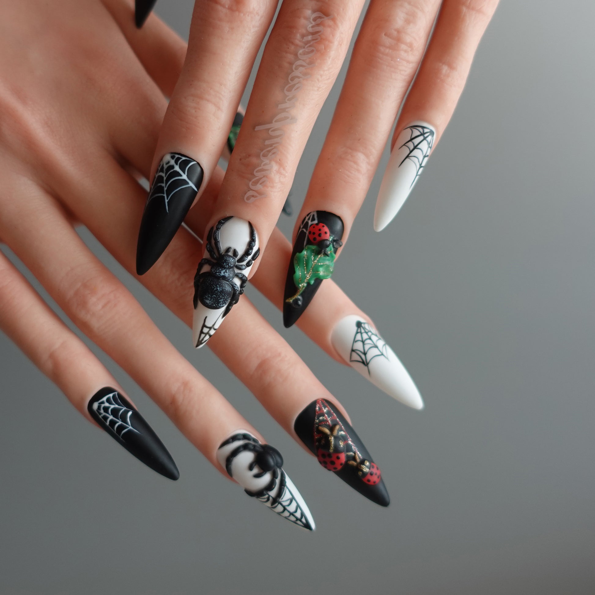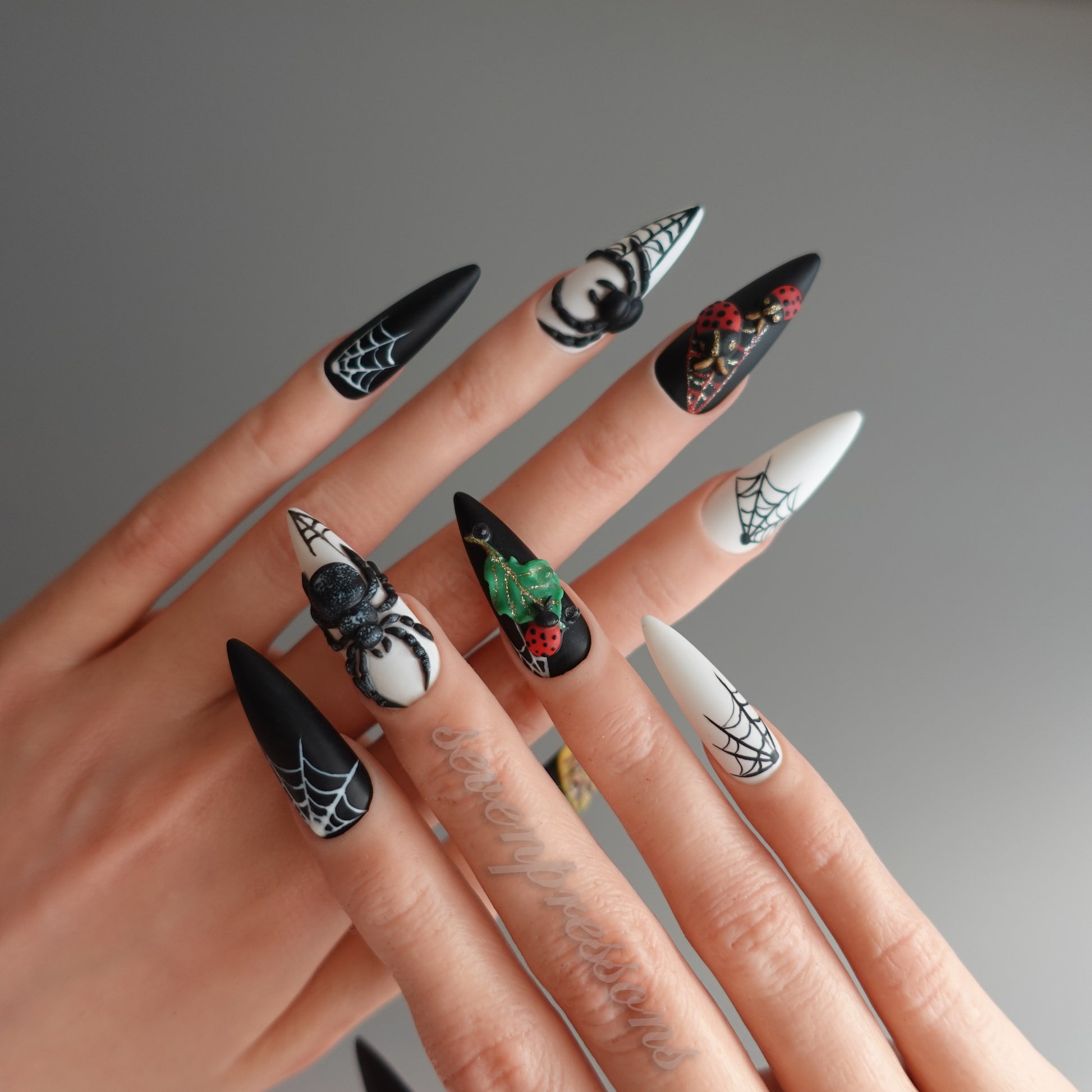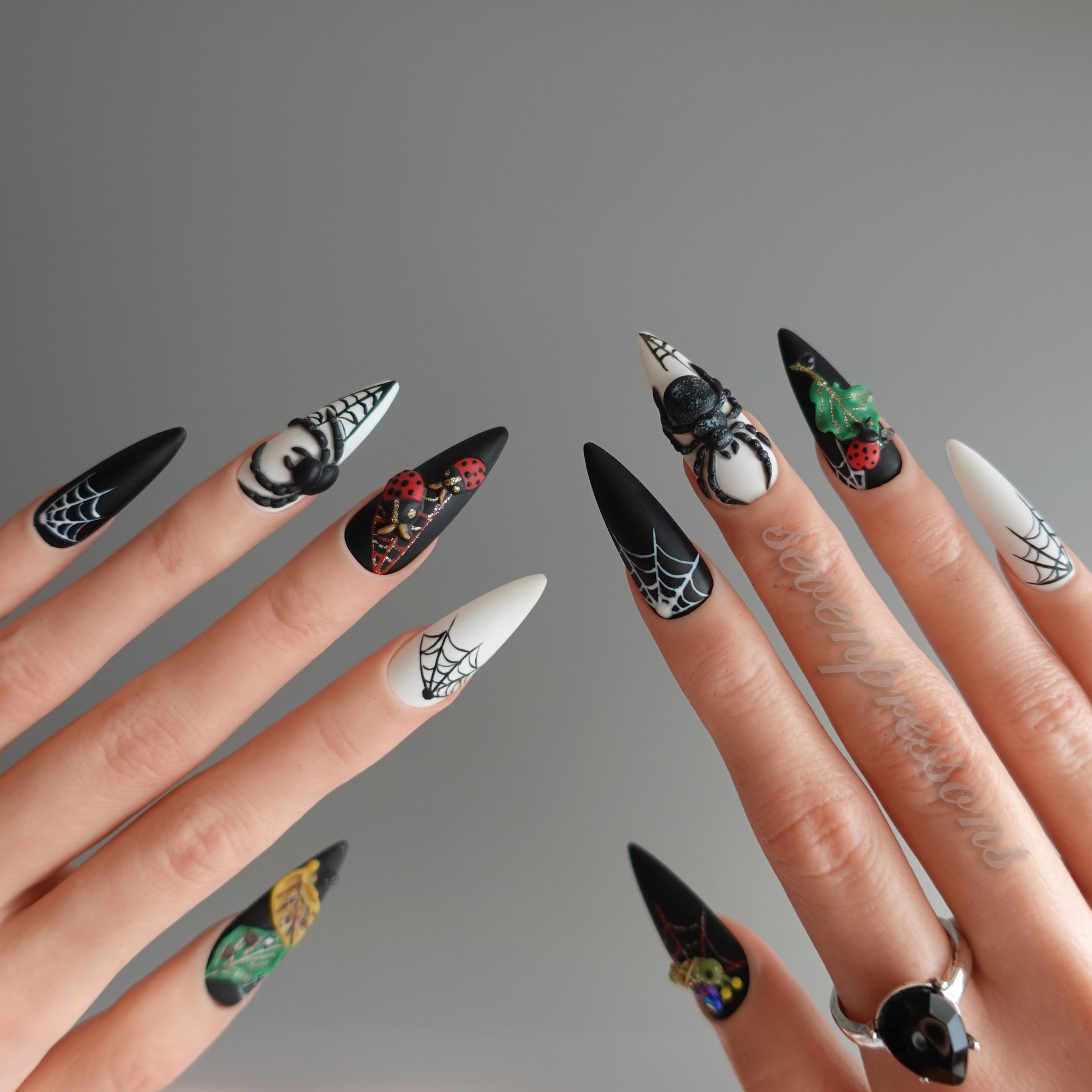 Hand-sculpted spiders crawl across matte black and ivory white tips, tangled in shimmering webs of silver and red. Each creature—adorned with gems, leaves, and scarlet beetles—captures the haunting beauty of decay and rebirth. This set is both eerie and exquisite, perfect for those who dance on the edge of darkness and glamour.