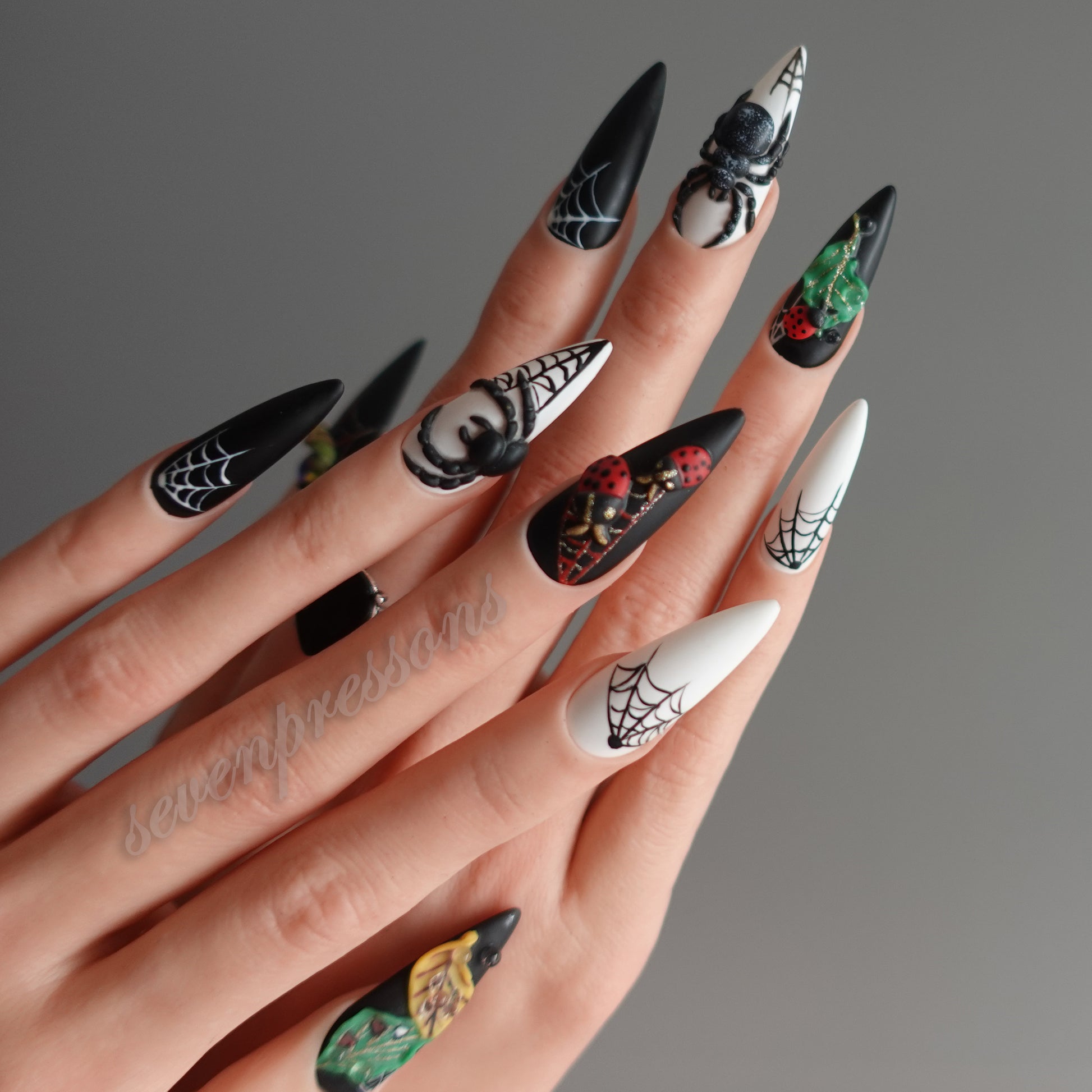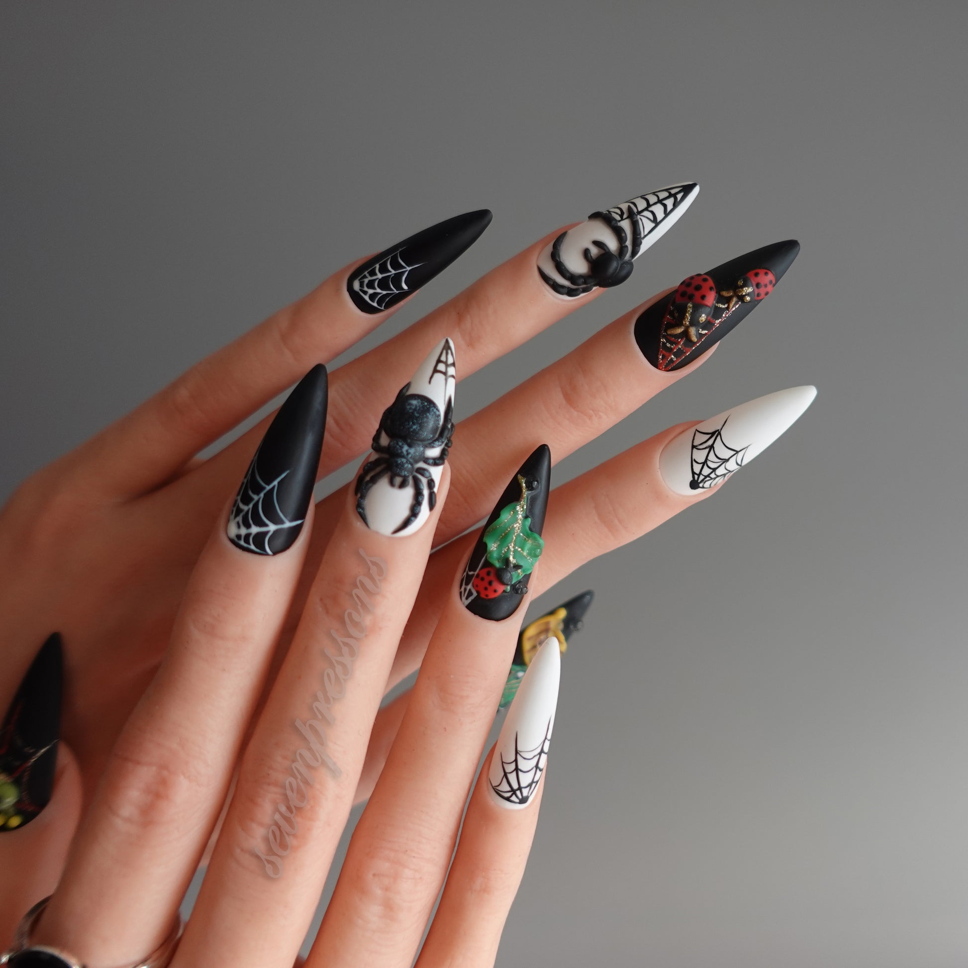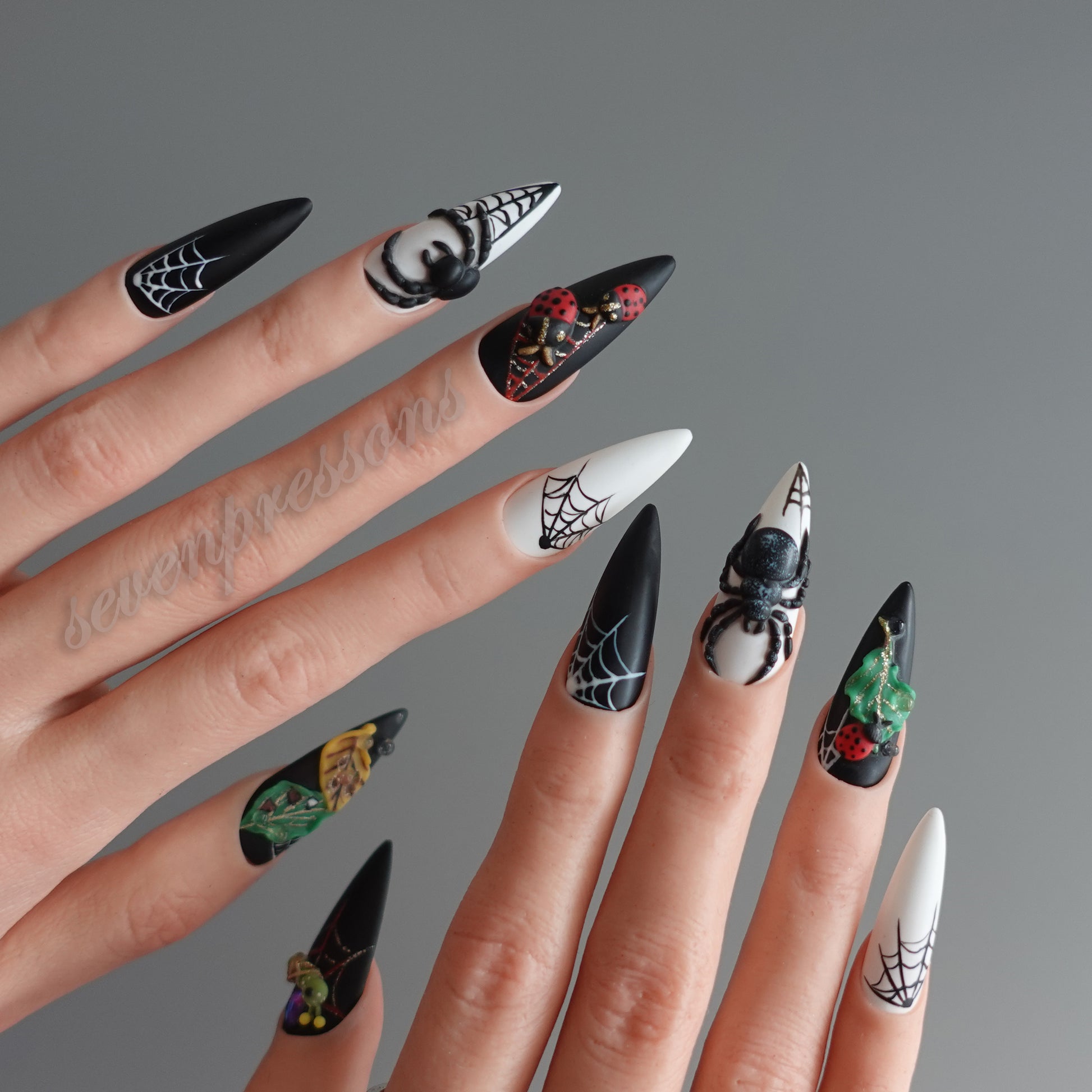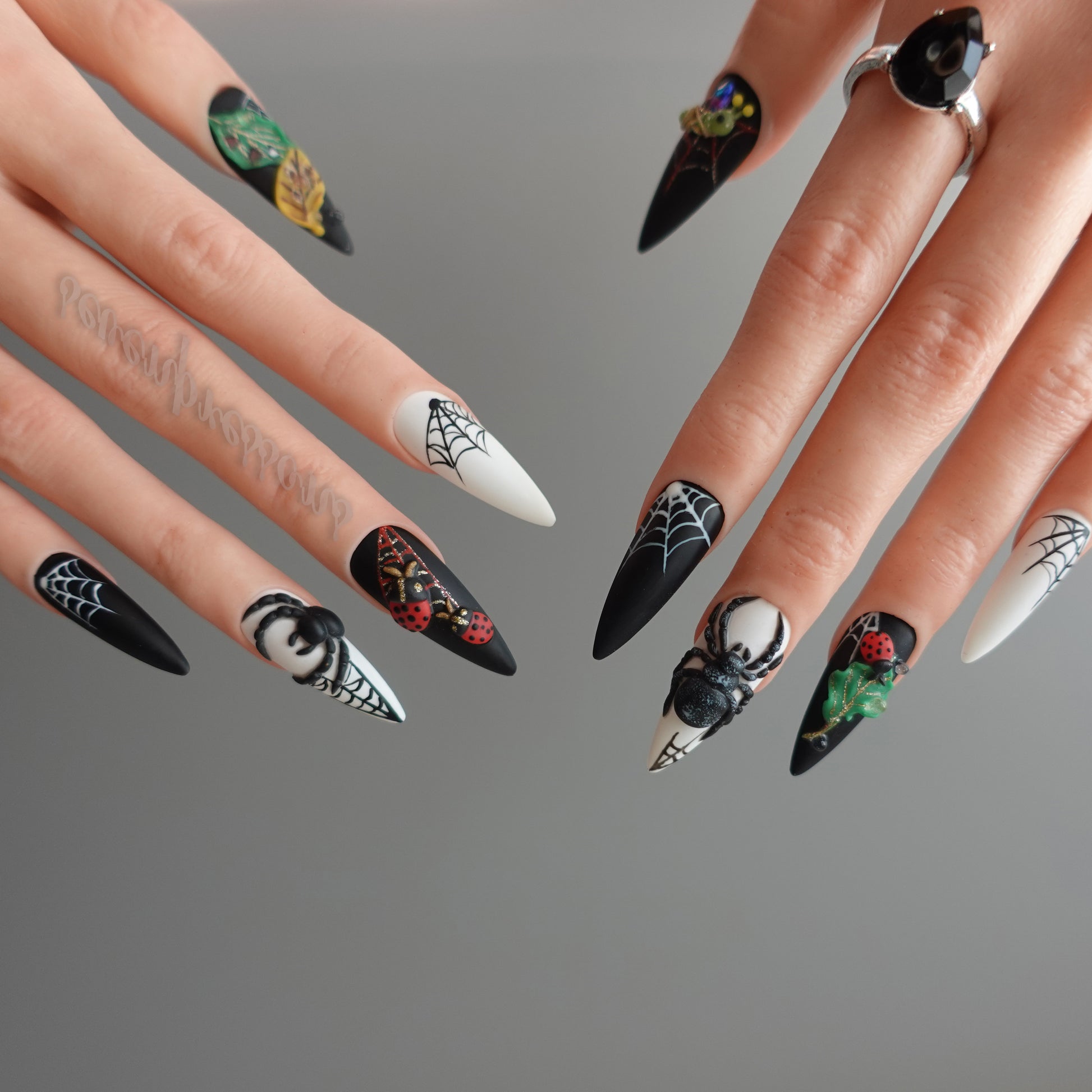 Hand-sculpted spiders crawl across matte black and ivory white tips, tangled in shimmering webs of silver and red. Each creature—adorned with gems, leaves, and scarlet beetles—captures the haunting beauty of decay and rebirth. This set is both eerie and exquisite, perfect for those who dance on the edge of darkness and glamour.