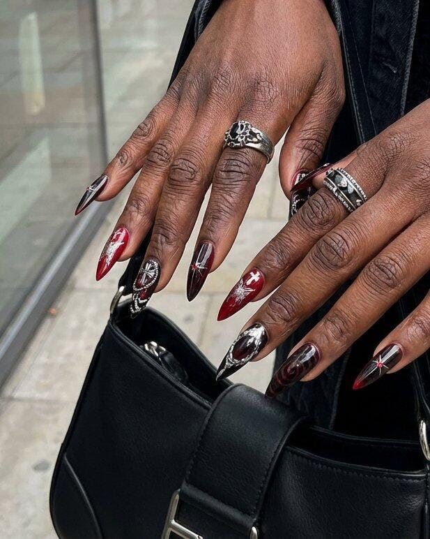 Deep blood-red jelly fades into inky black, wrapped in molten silver chains, crosses, and butterfly silhouettes — symbols of rebellion and rebirth. Dark spirals draw you inward like a forbidden spell, while sculpted frames and jewels radiate a sinister elegance.