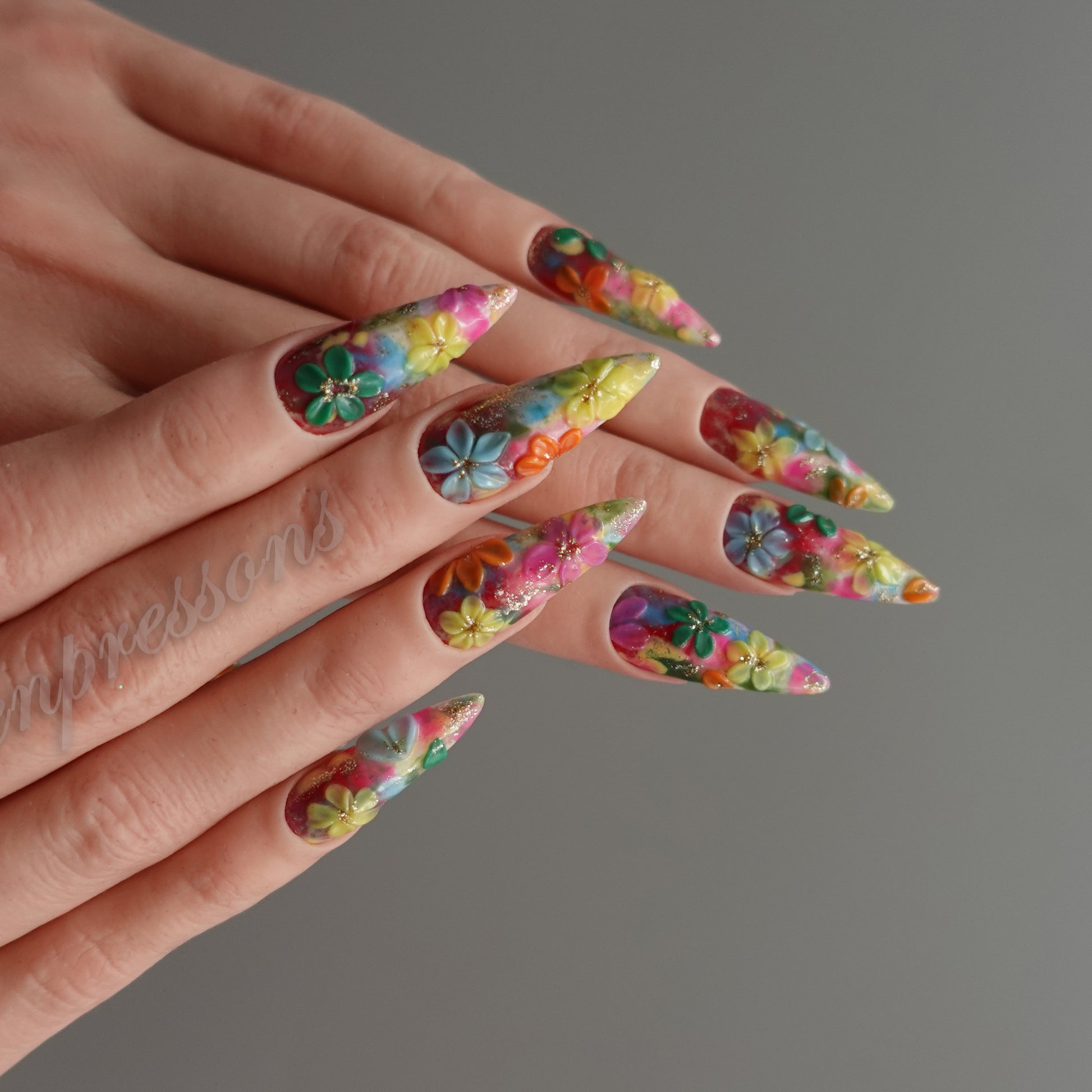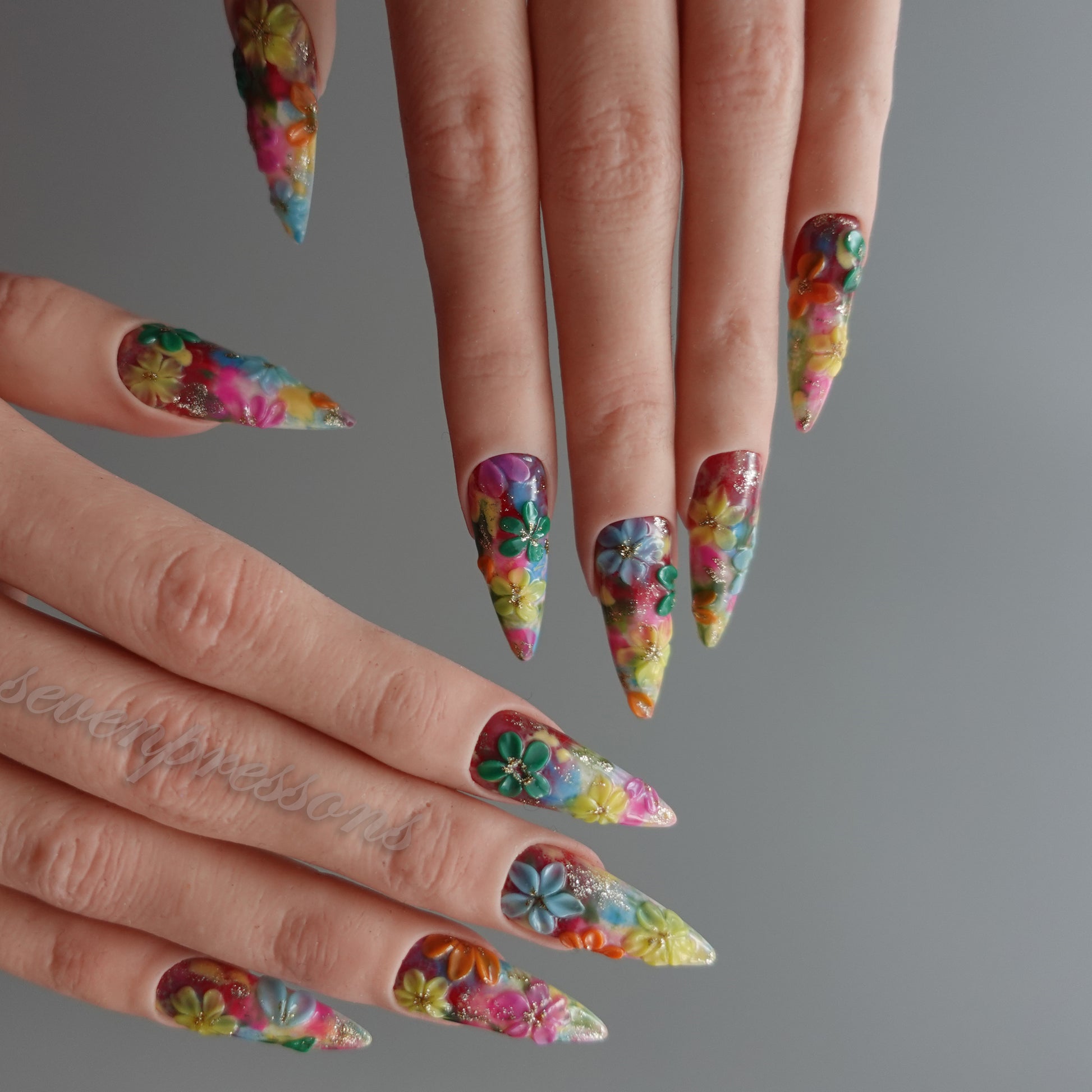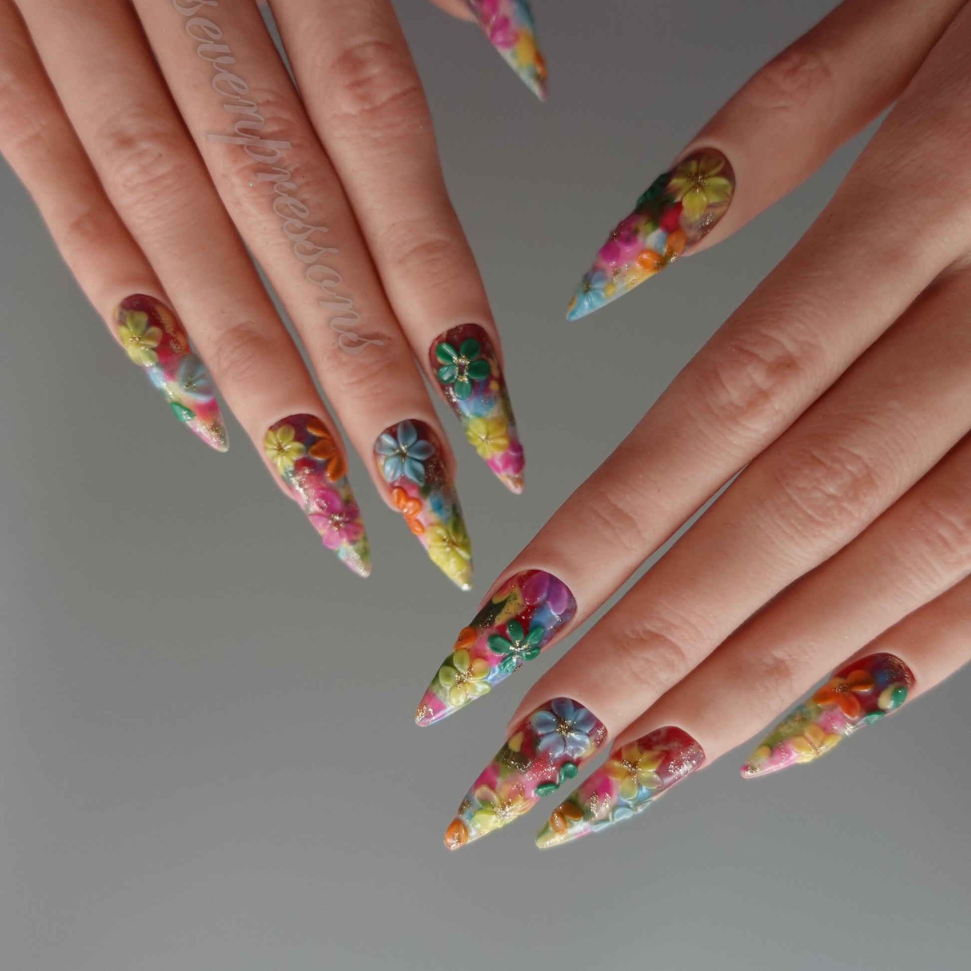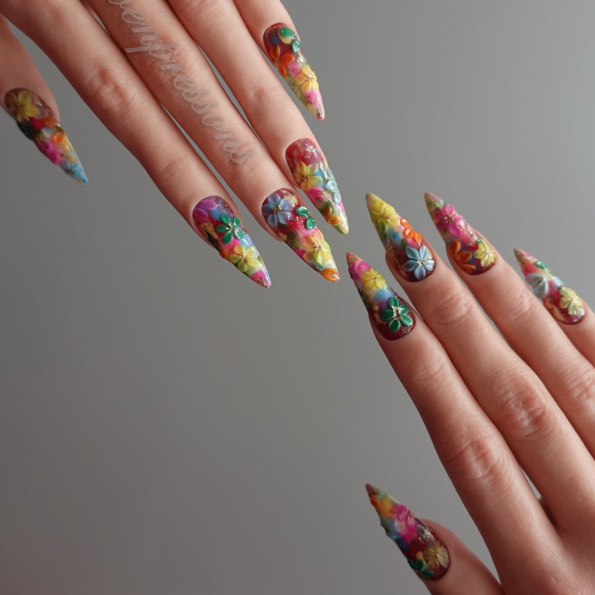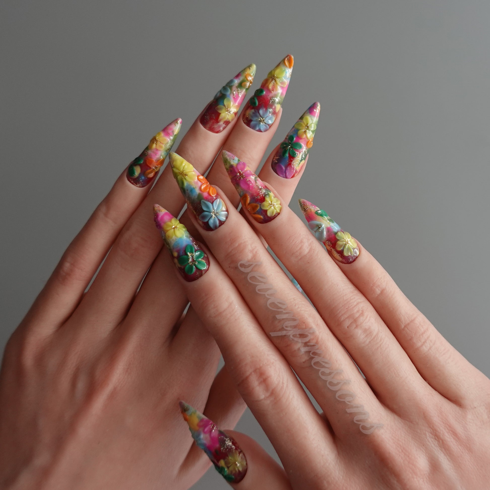 Floral Mirage Bloomscape is a kaleidoscopic garden brought to life โ€” a vivid, dreamlike fusion of watercolor hues, 3D sculpted florals, and soft iridescent shimmer. Each nail feels like a miniature enchanted landscape, where colors melt into one another and blossoms unfurl in lively layers. The result is bold, joyful, and irresistibly artistic โ€” perfect for anyone who loves maximalist beauty, festival glamour, or wearable art that radiates pure happiness.