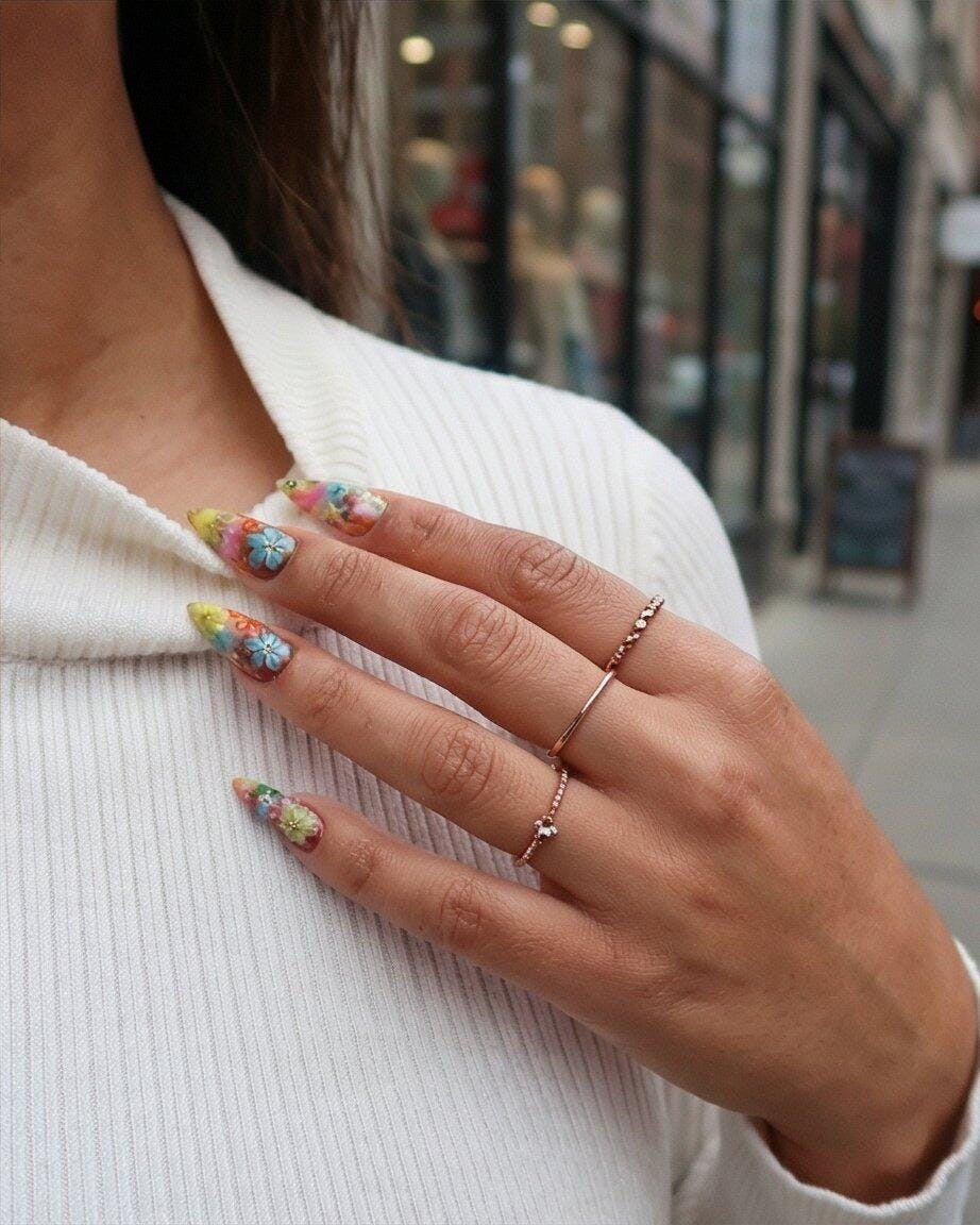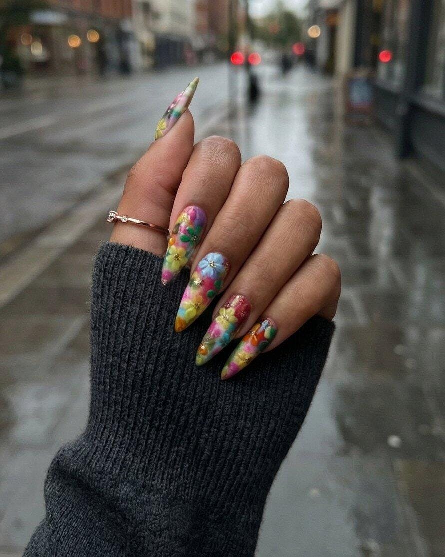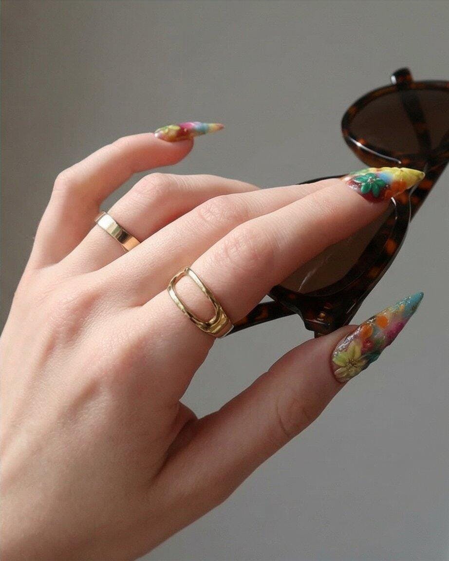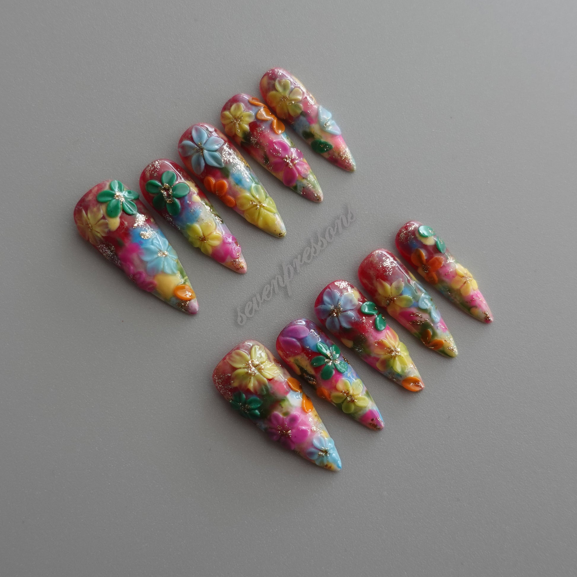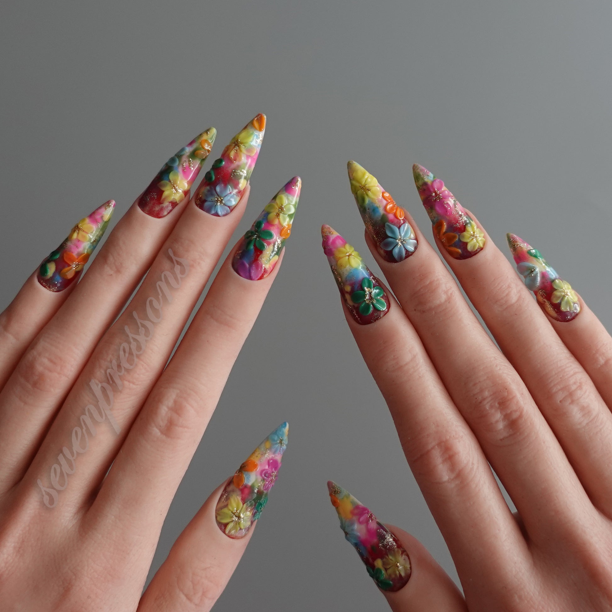 Floral Mirage Bloomscape is a kaleidoscopic garden brought to life โ€” a vivid, dreamlike fusion of watercolor hues, 3D sculpted florals, and soft iridescent shimmer. Each nail feels like a miniature enchanted landscape, where colors melt into one another and blossoms unfurl in lively layers. The result is bold, joyful, and irresistibly artistic โ€” perfect for anyone who loves maximalist beauty, festival glamour, or wearable art that radiates pure happiness.