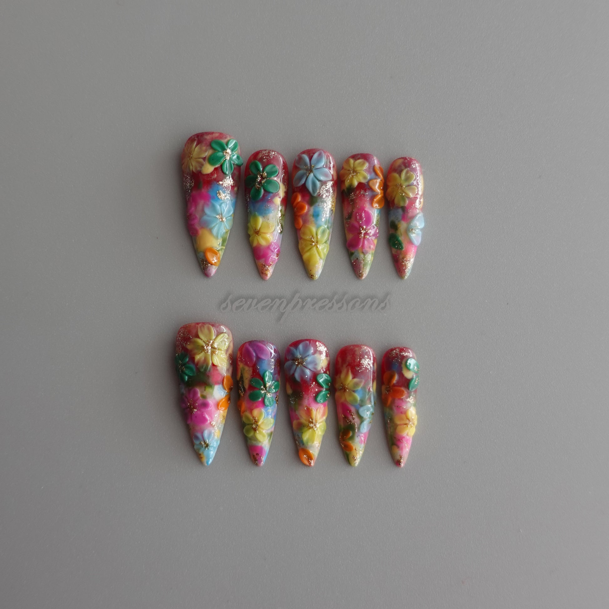 A symphony of neon pinks, ocean blues, citrus yellows, and emerald greens blend seamlessly across the set, crowned with hand-sculpted flowers and delicate reflective highlights. This design transforms every gesture into a burst of color and creativity โ€” a celebration of summer, freedom, and lush botanical fantasy.