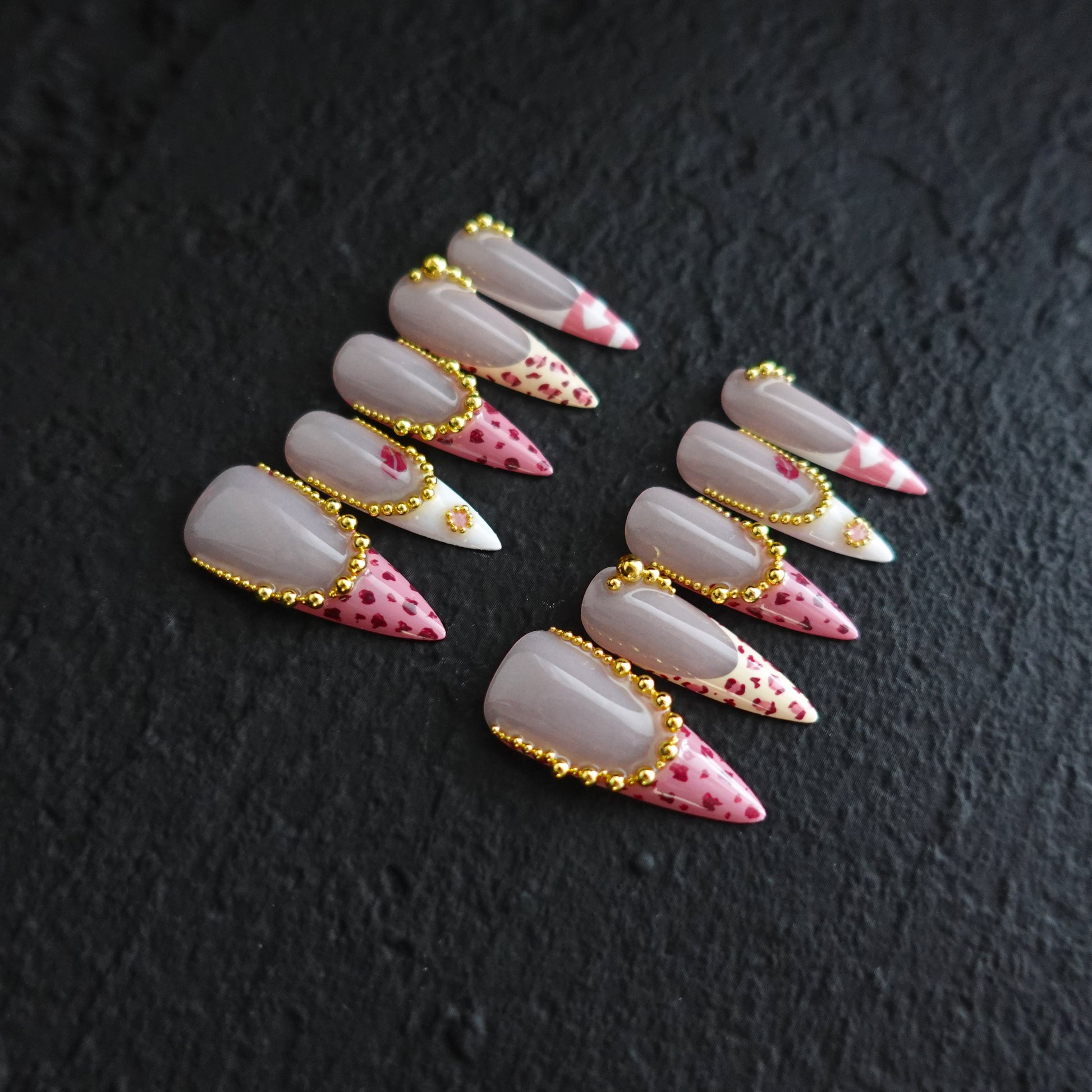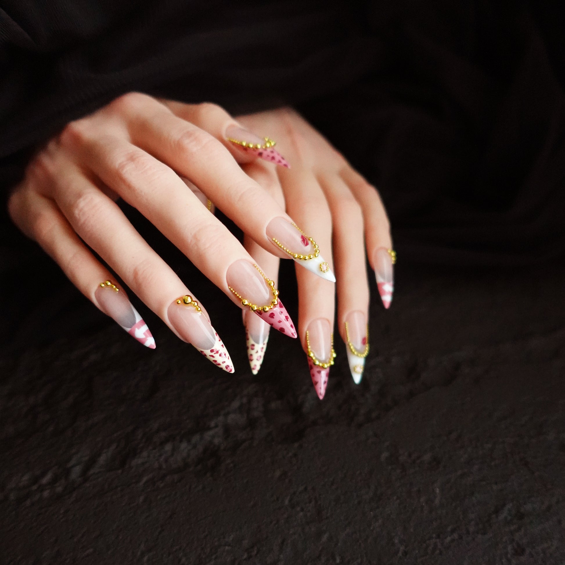 Flirty, gilded, and a little wild. Kissed Leopard pairs blush-nude bases with hand-painted pink leopard French tips and candy-stripe accents. Draped gold micro-bead โ€œchainsโ€ add jewelry-level shine, while a tiny lip print winks for a playful finish. Coquette energy, big attitude.