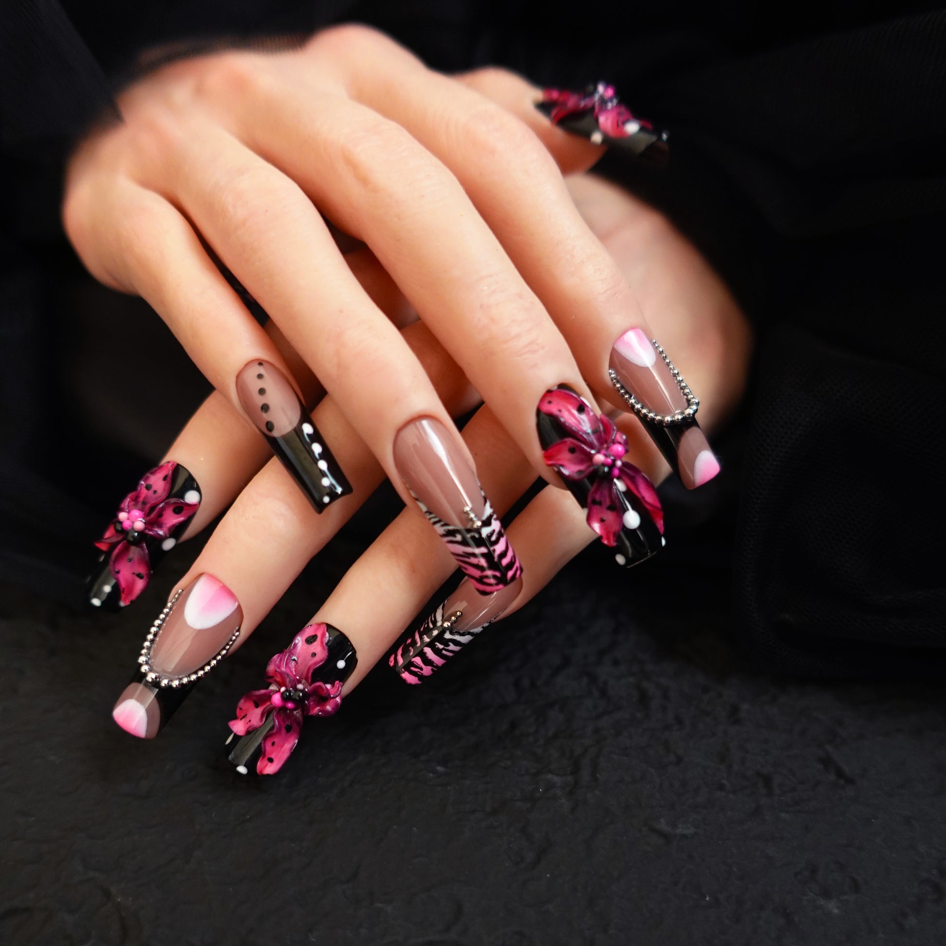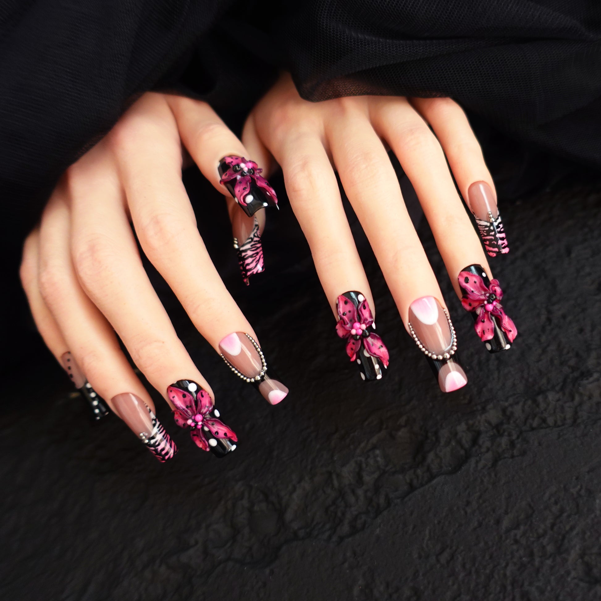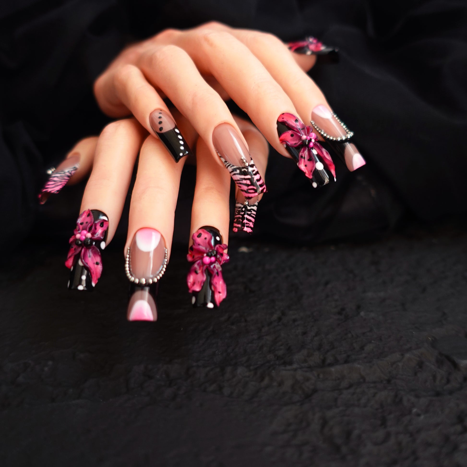 Featuring a glossy nude and jet-black split design, this set is brought to life with hand-sculpted hot-pink bows, zebra stripes, and silver bead chains that create a high-contrast, eye-catching look. The mix of French tips, 3D florals, and dotted accents adds drama and dimension โ perfect for turning every hand movement into a bold statement.