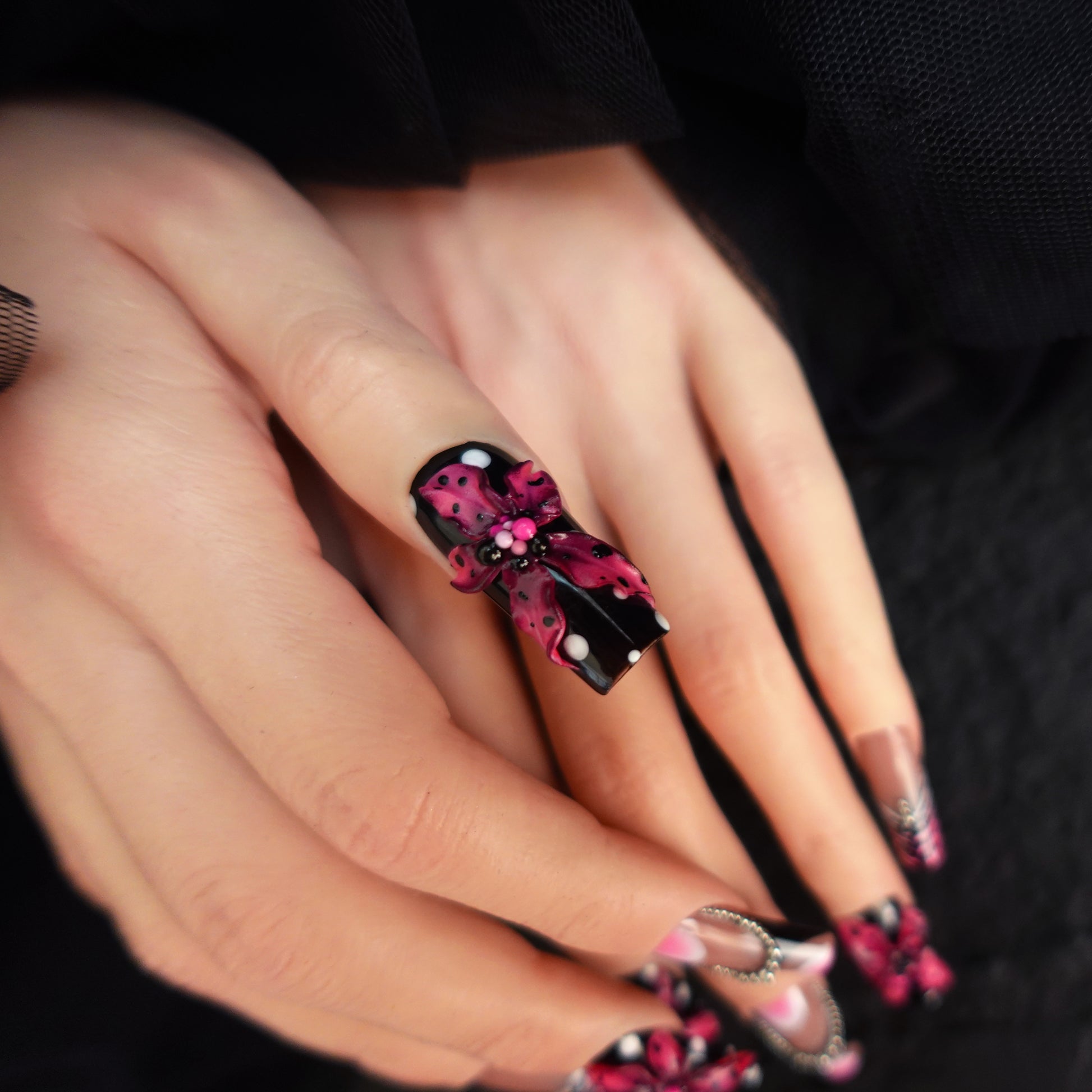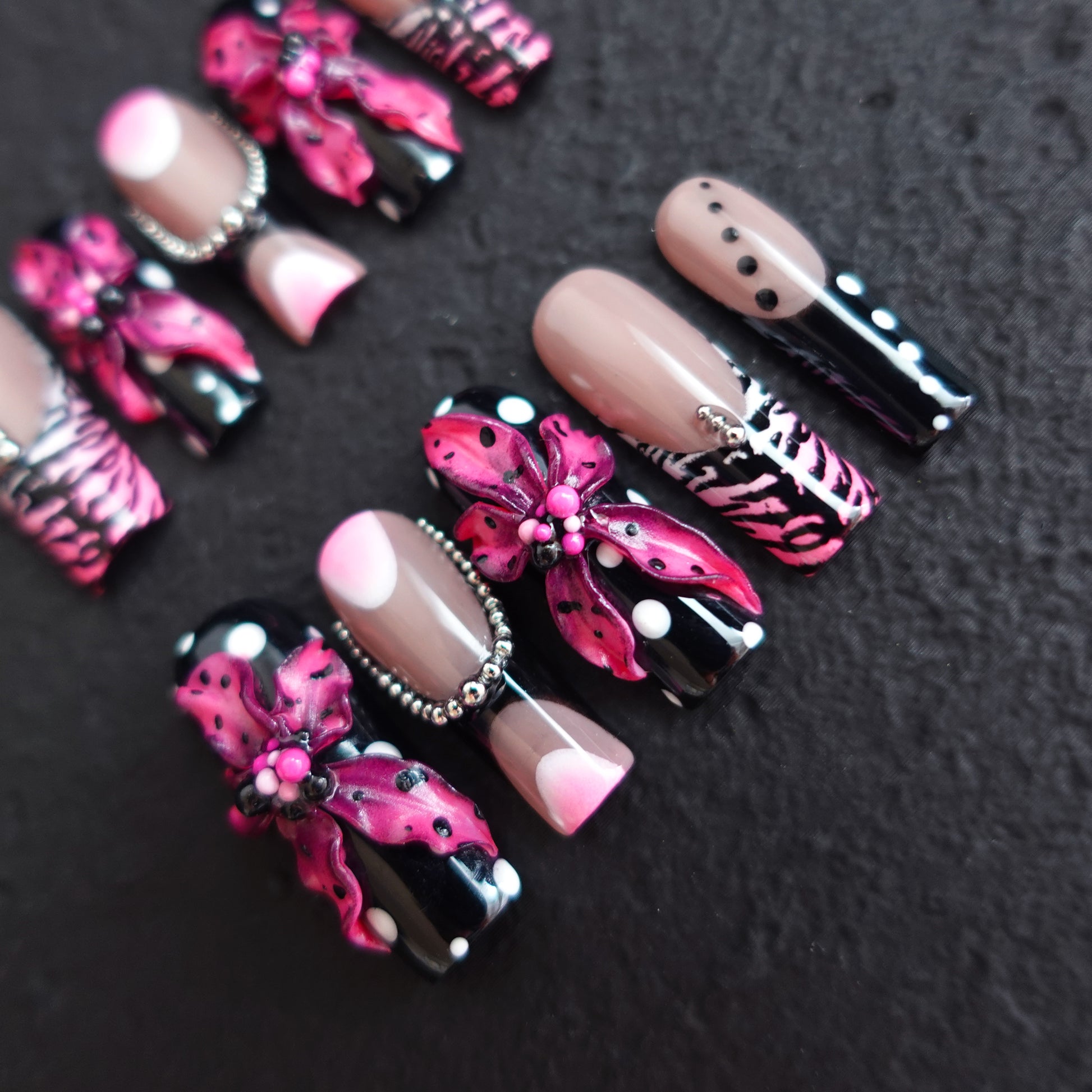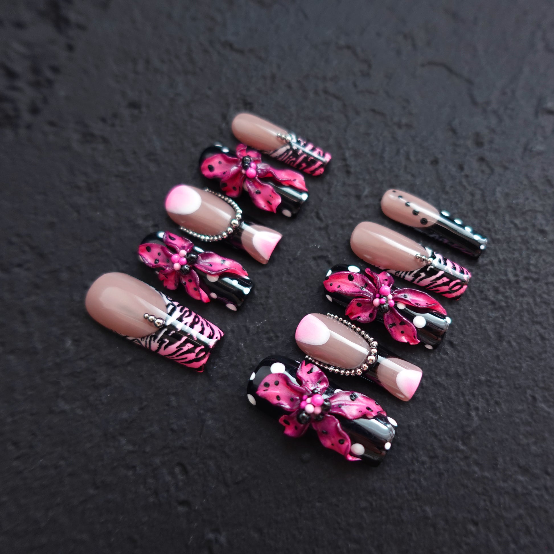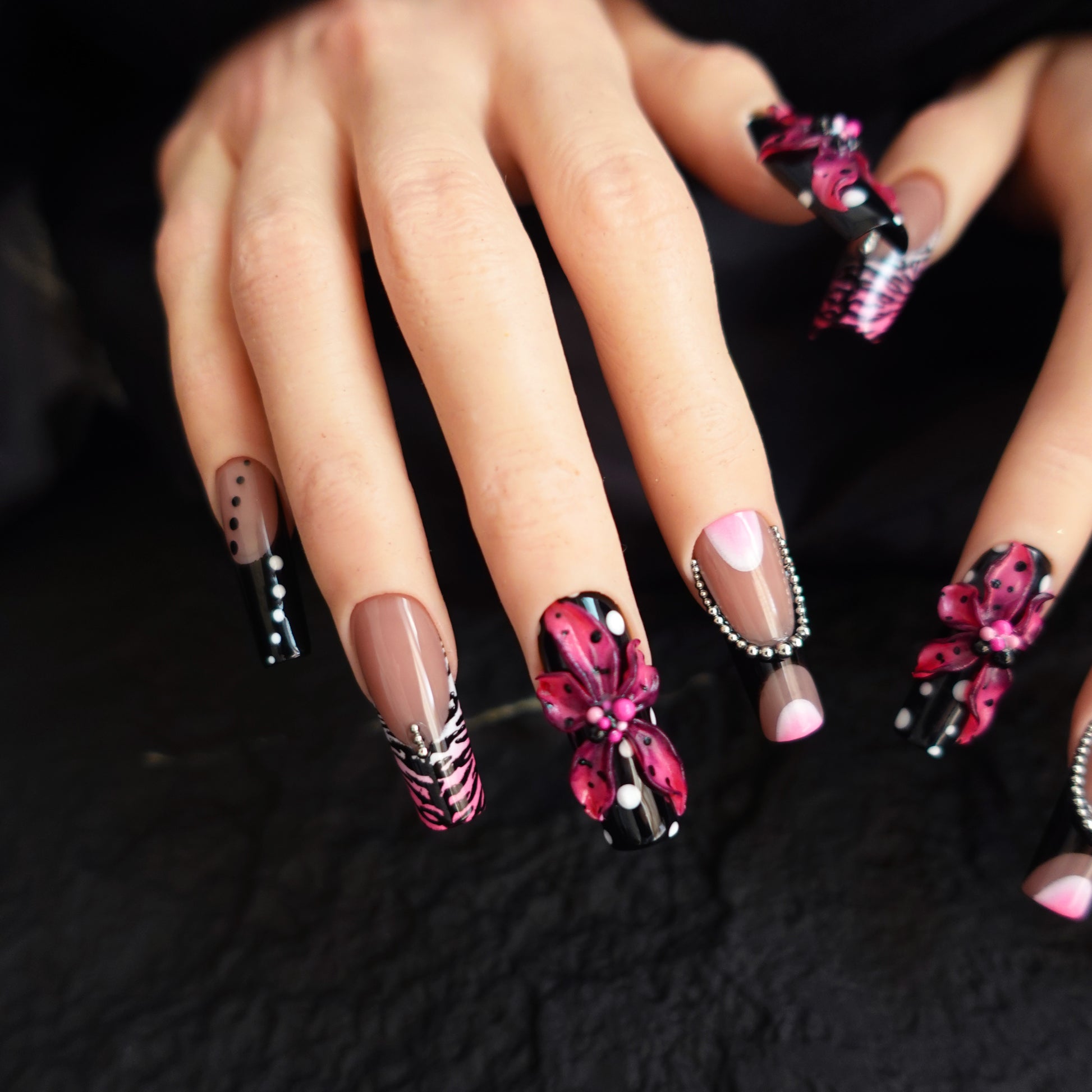 Featuring a glossy nude and jet-black split design, this set is brought to life with hand-sculpted hot-pink bows, zebra stripes, and silver bead chains that create a high-contrast, eye-catching look. The mix of French tips, 3D florals, and dotted accents adds drama and dimension โ perfect for turning every hand movement into a bold statement.