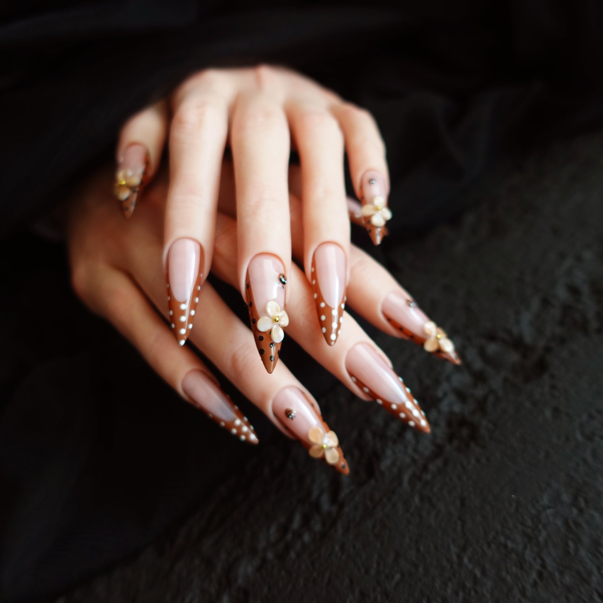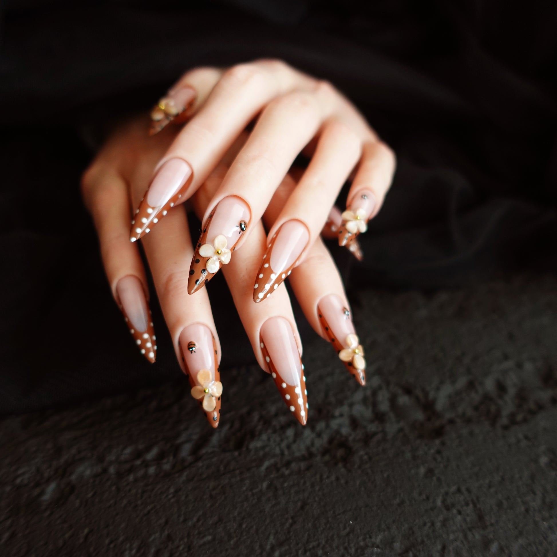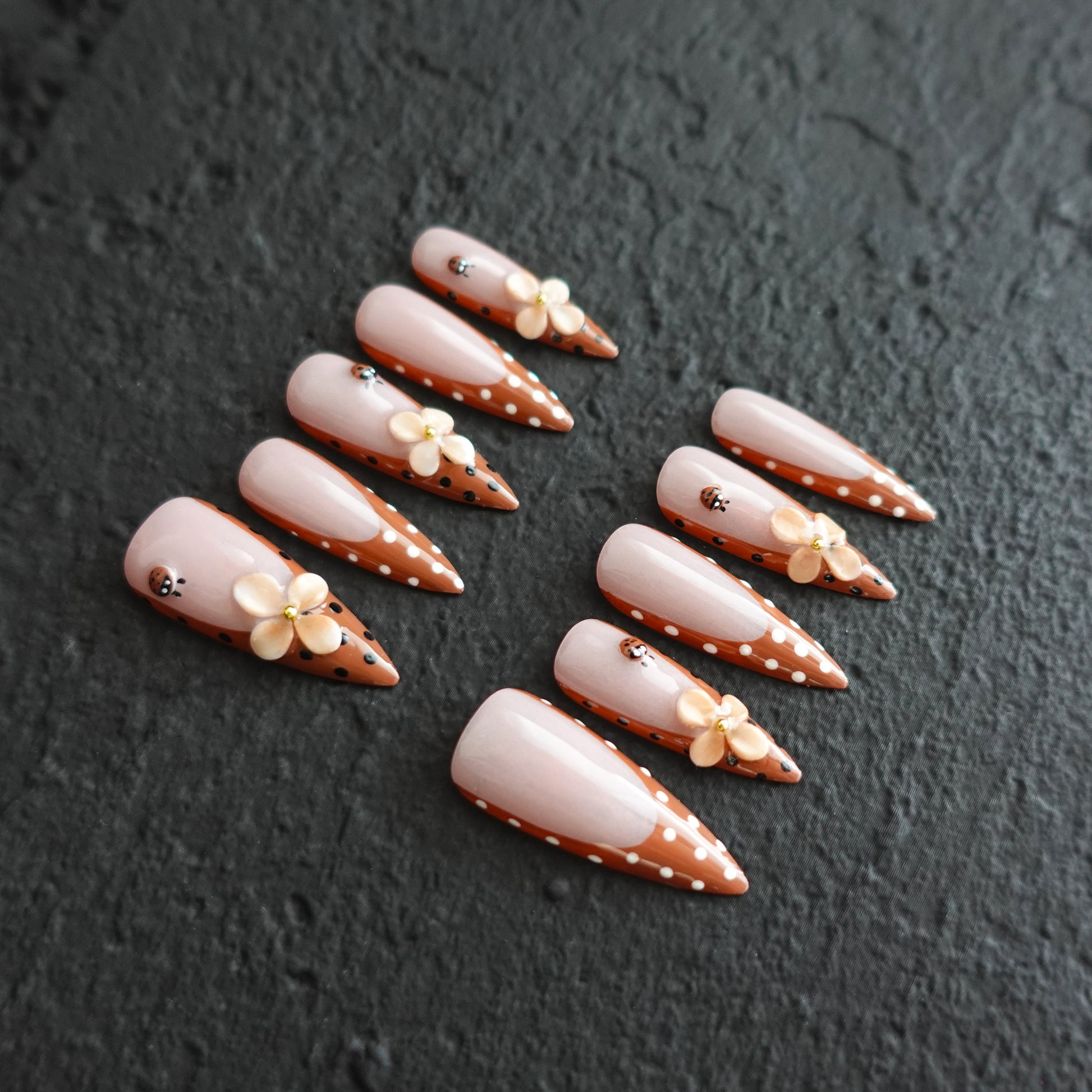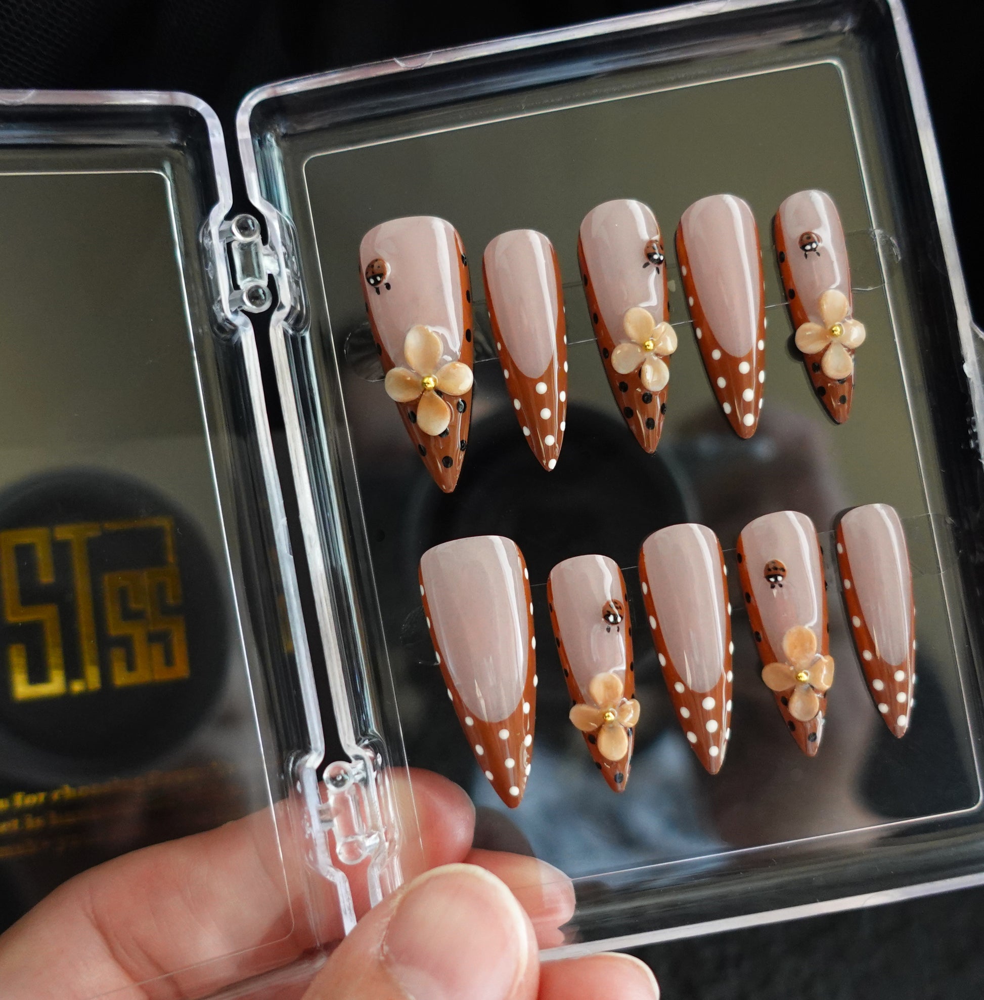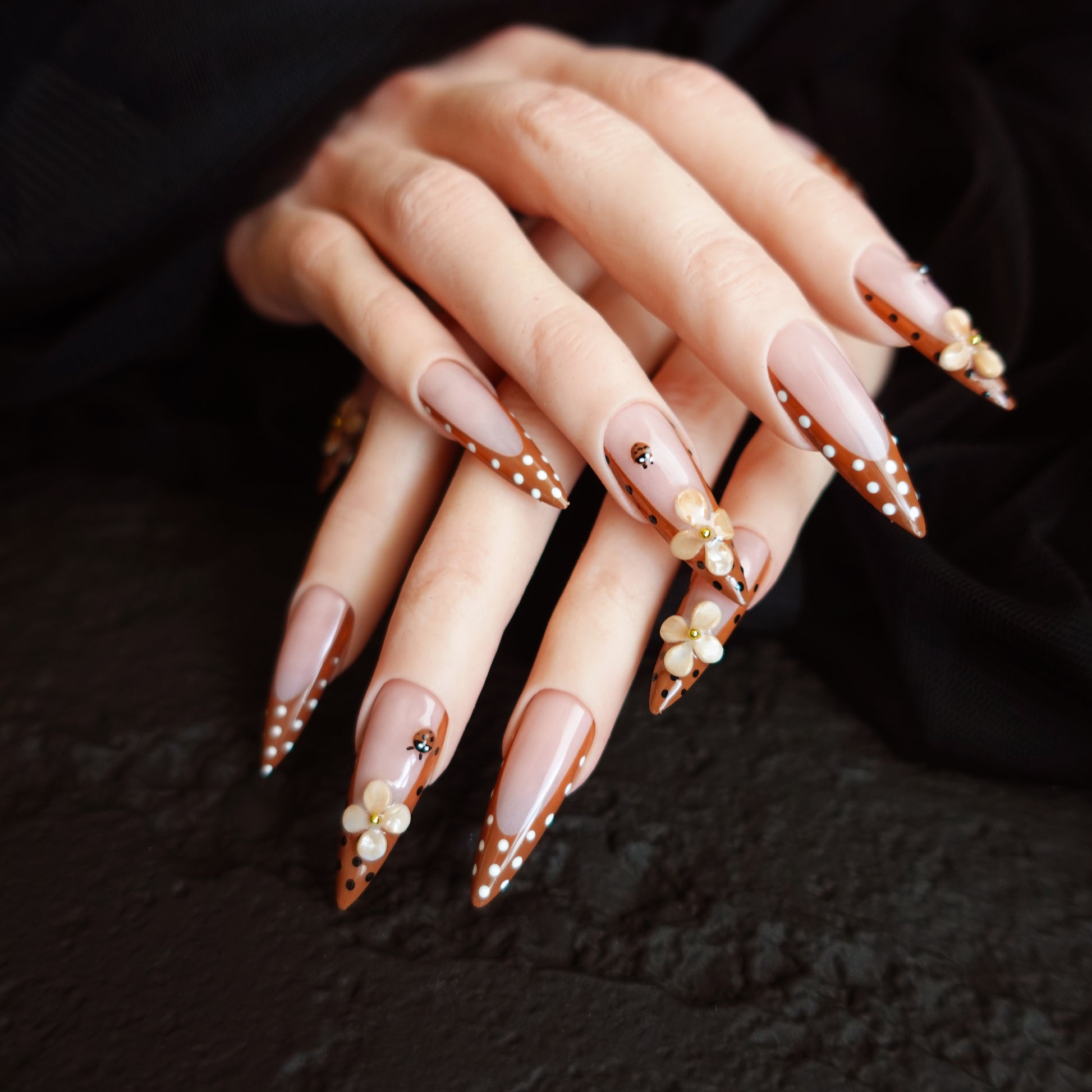 Seven Treasures โ Where Every Nail Tells a Story. A retro-sweet day in the countryside. Polka Meadow pairs caramel French tips and playful white dots with 3D butter-cream blossoms and tiny hand-painted ladybugs. The soft nude base keeps it chic; the details keep it charming. Dress them up with a slip dress or keep it cozy with denimโeither way, theyโre irresistible.
