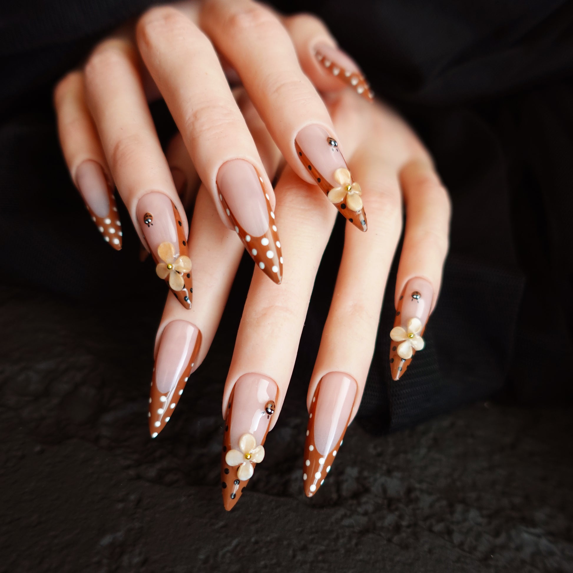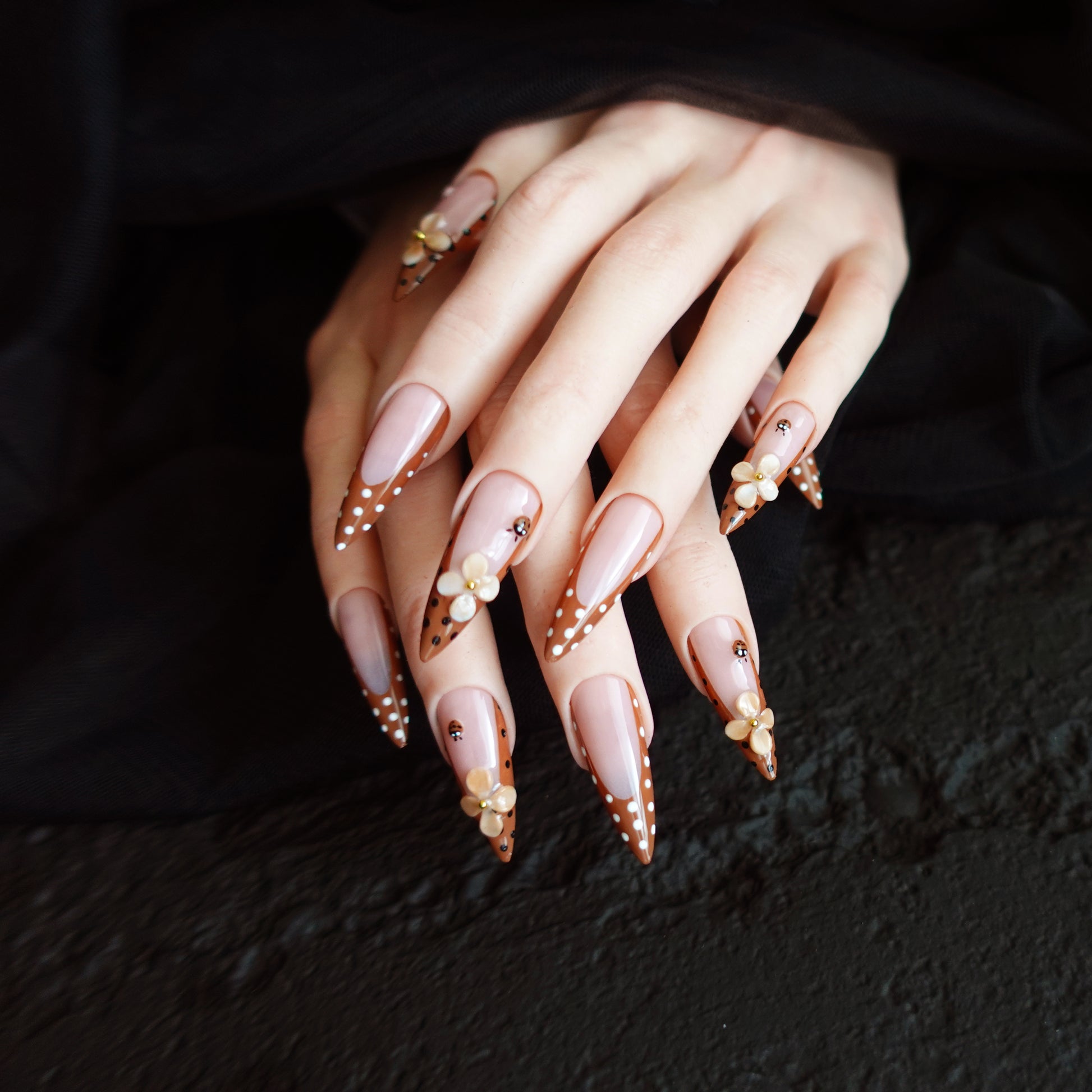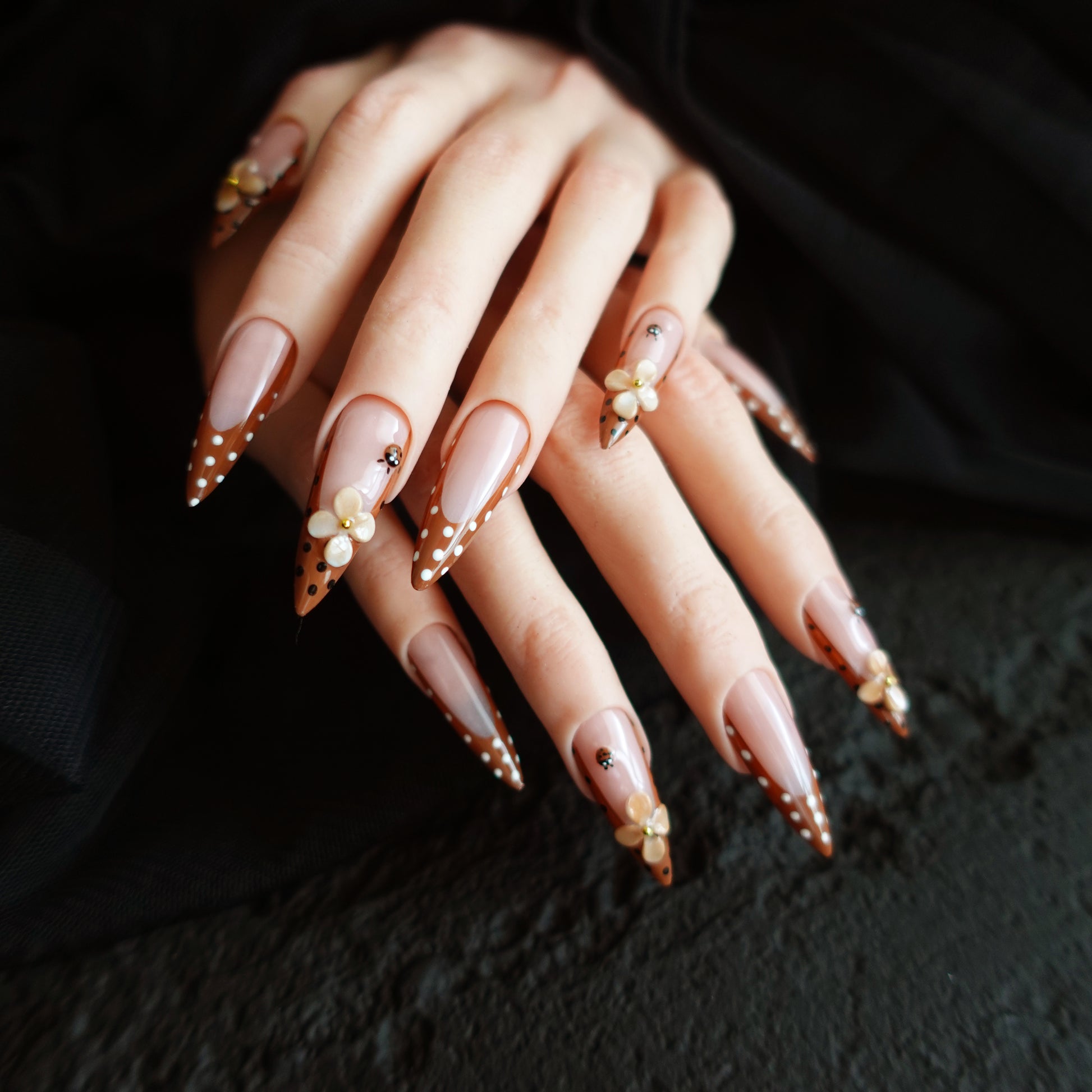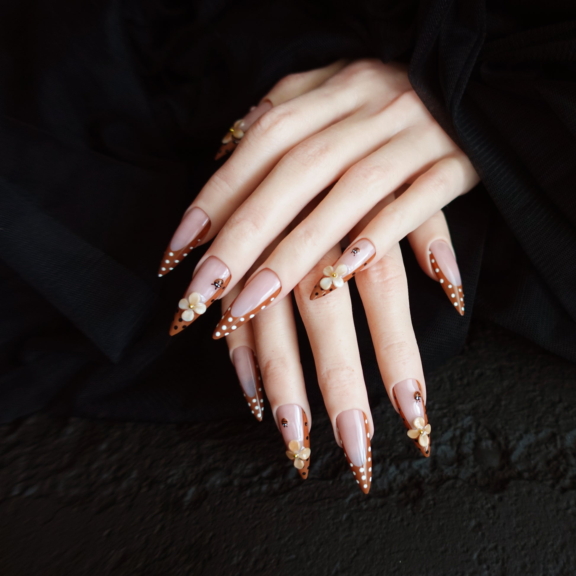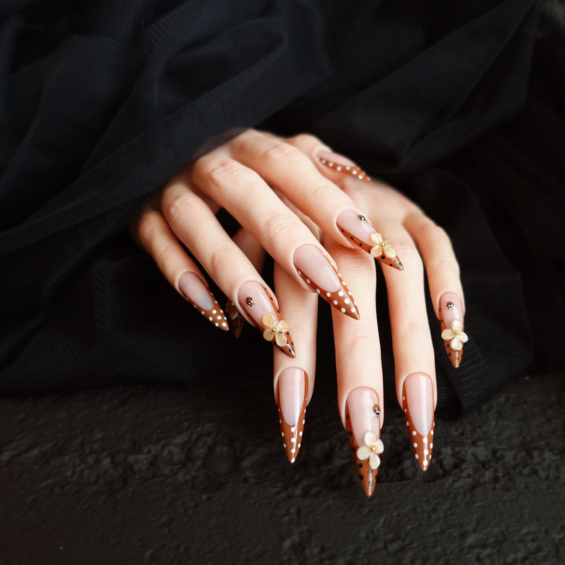 Seven Treasures โ Where Every Nail Tells a Story. A retro-sweet day in the countryside. Polka Meadow pairs caramel French tips and playful white dots with 3D butter-cream blossoms and tiny hand-painted ladybugs. The soft nude base keeps it chic; the details keep it charming. Dress them up with a slip dress or keep it cozy with denimโeither way, theyโre irresistible.