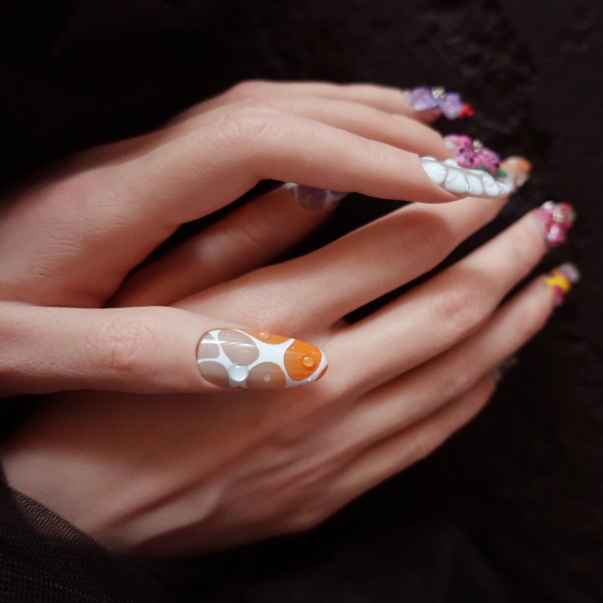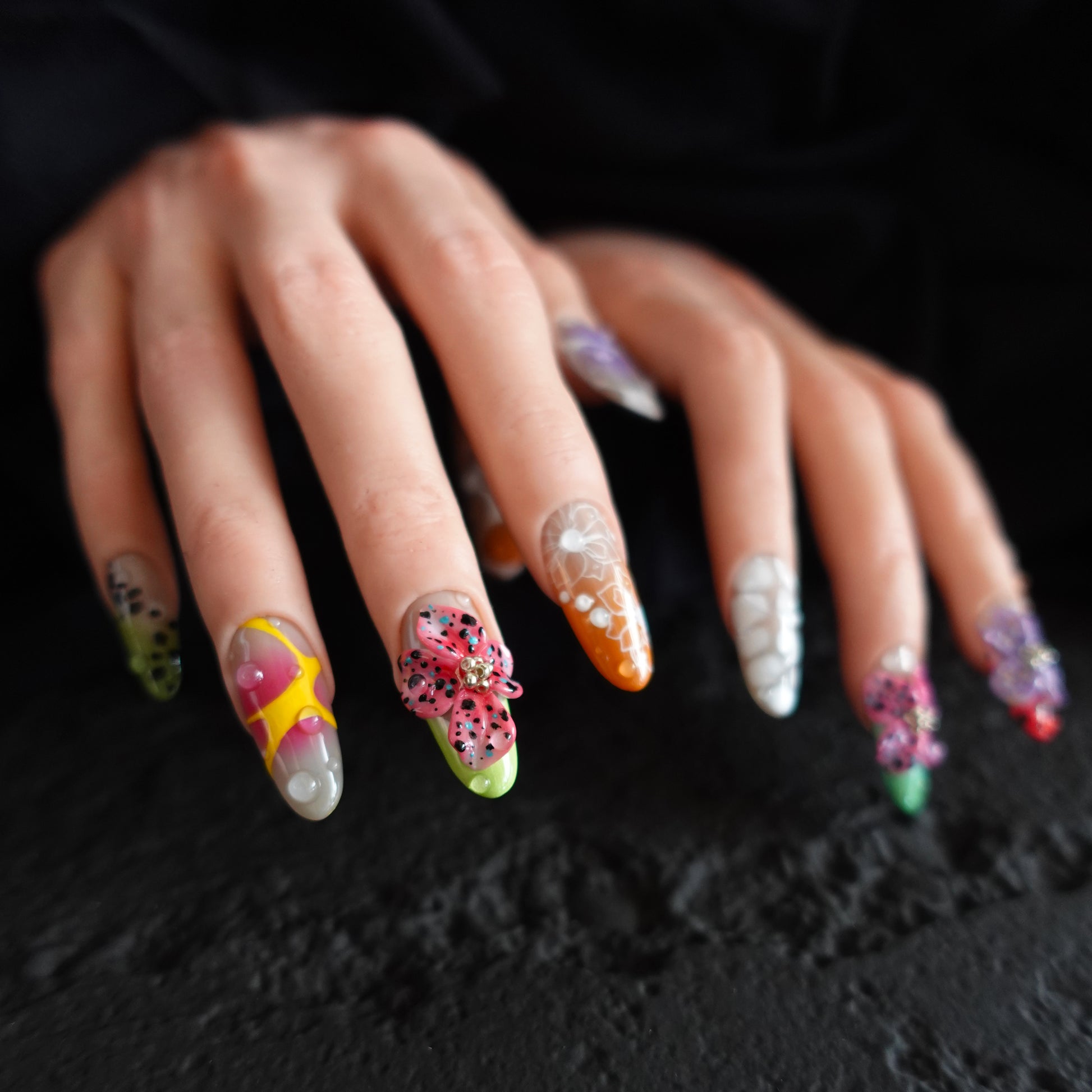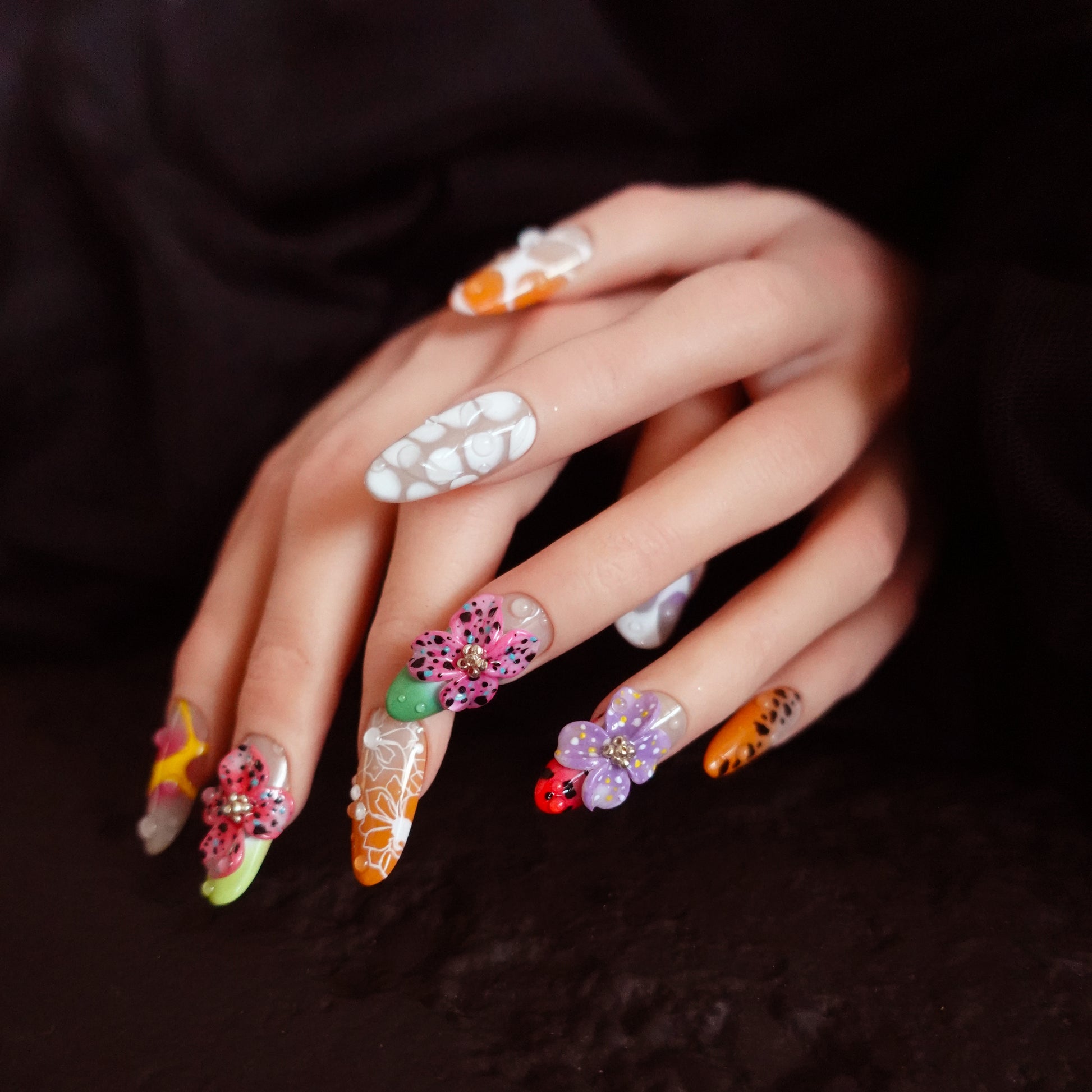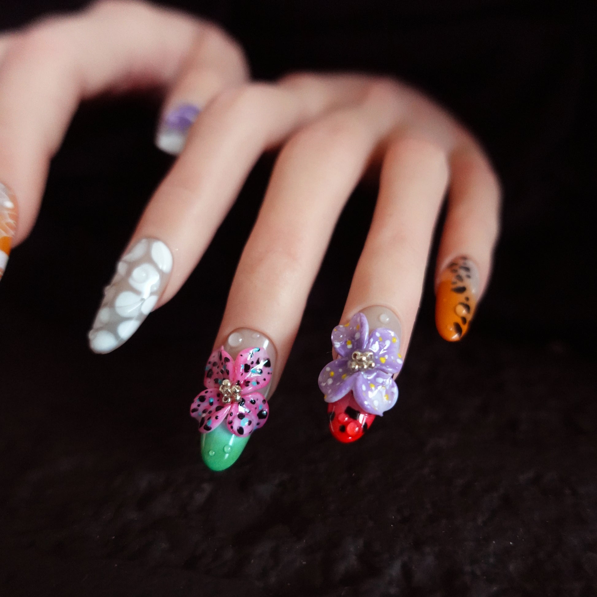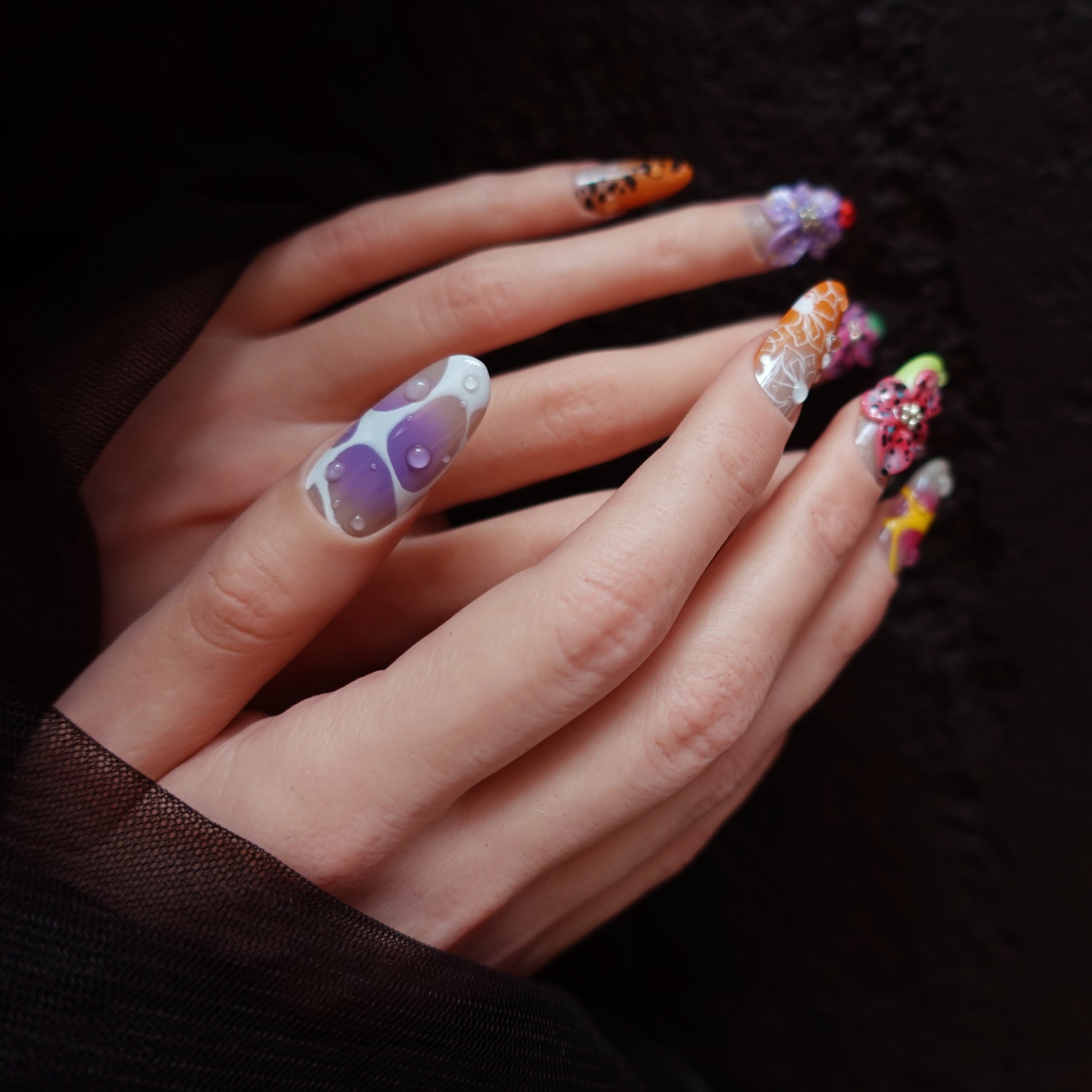 Safari Petals is a wild celebration of color, pattern, and natureโs untamed charm. Hand-sculpted 3D flowers bloom boldly in vibrant hues of pink and lilac, dotted like the skin of a jungle creature. Each nail is a playful exploration of abstract animal spots, oversized droplets, and safari-inspired line art, blending soft matte gradients with juicy gloss finishes.