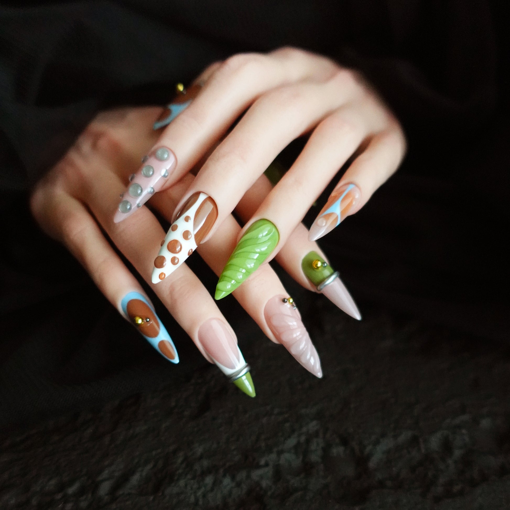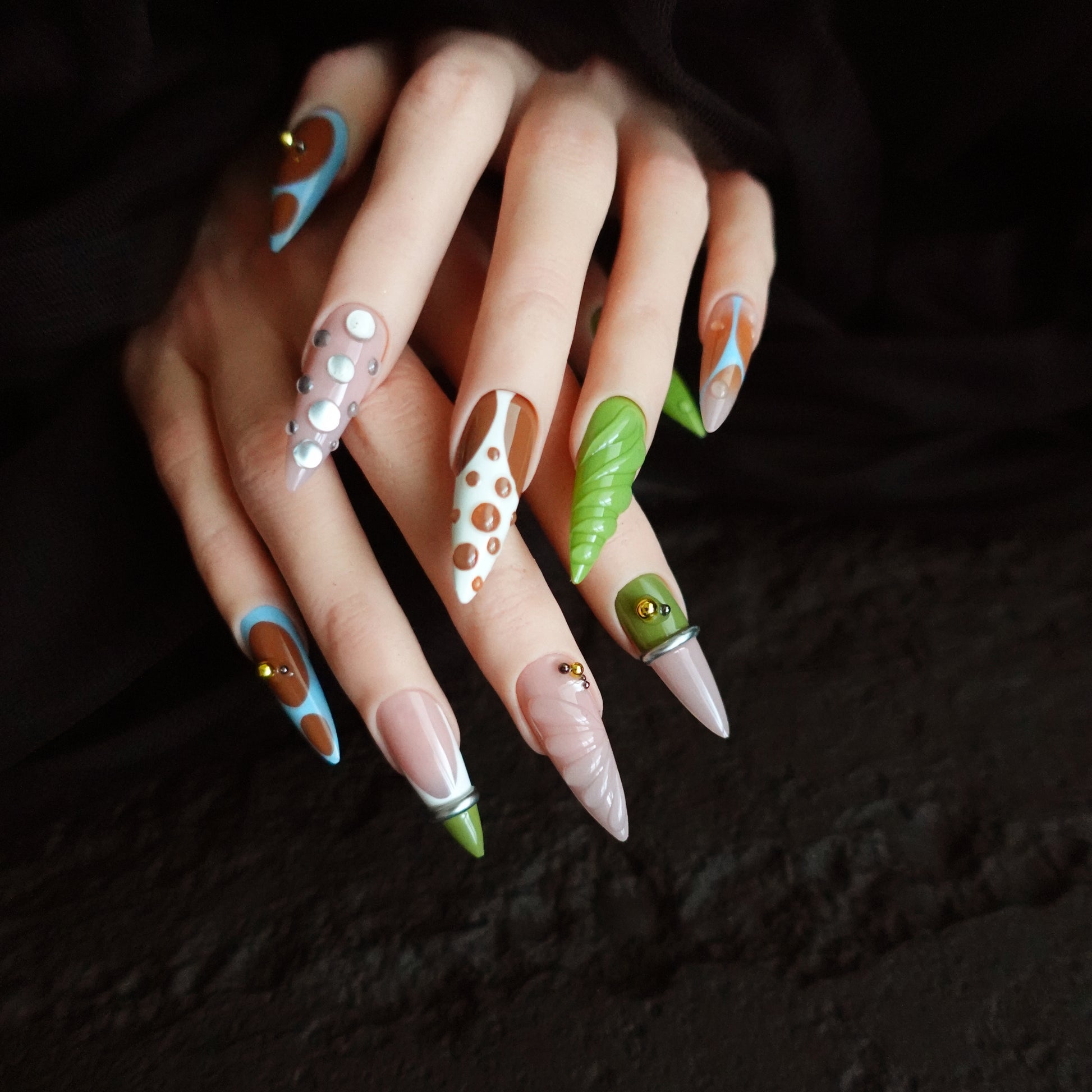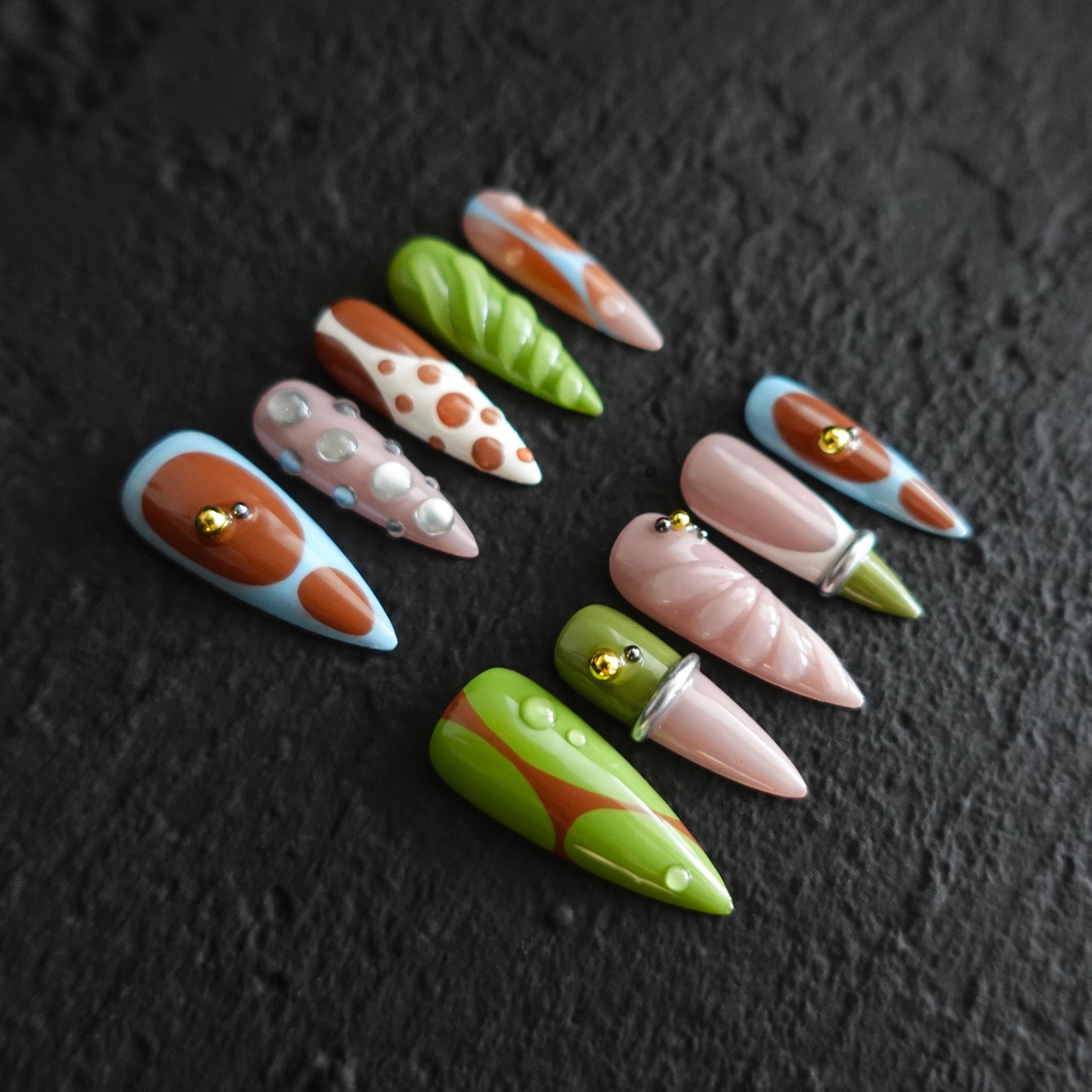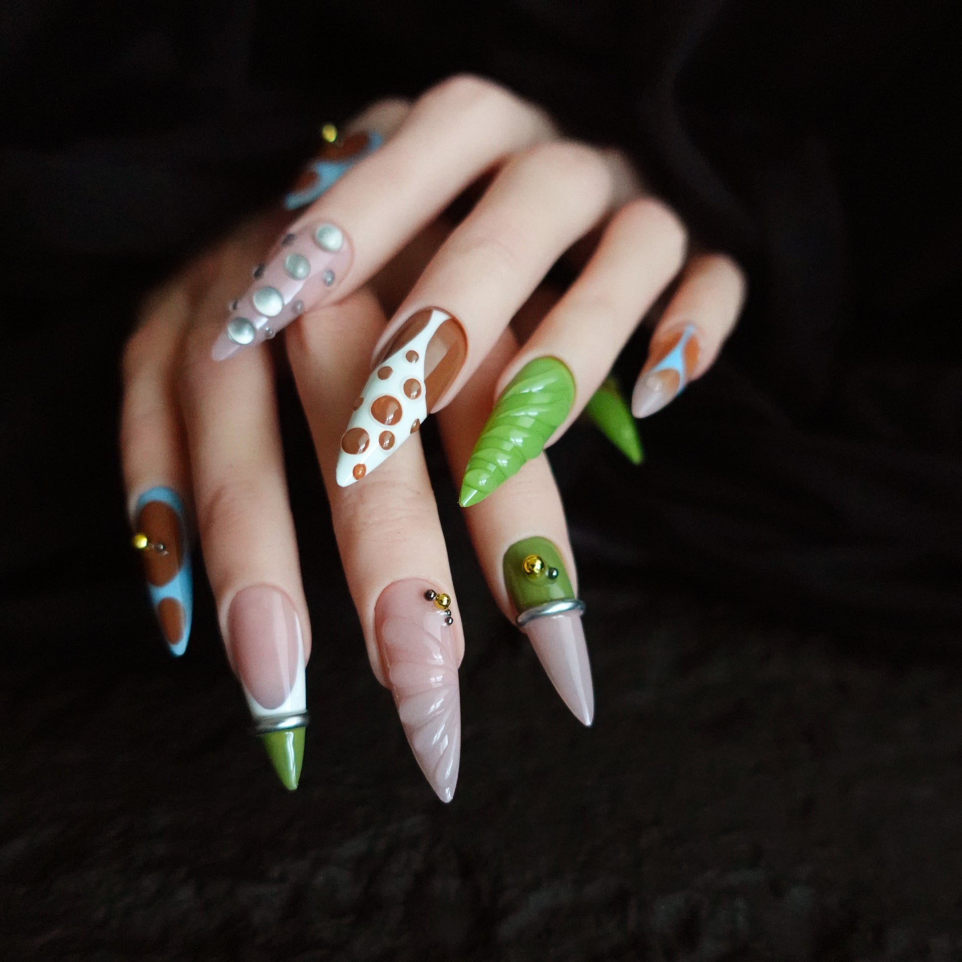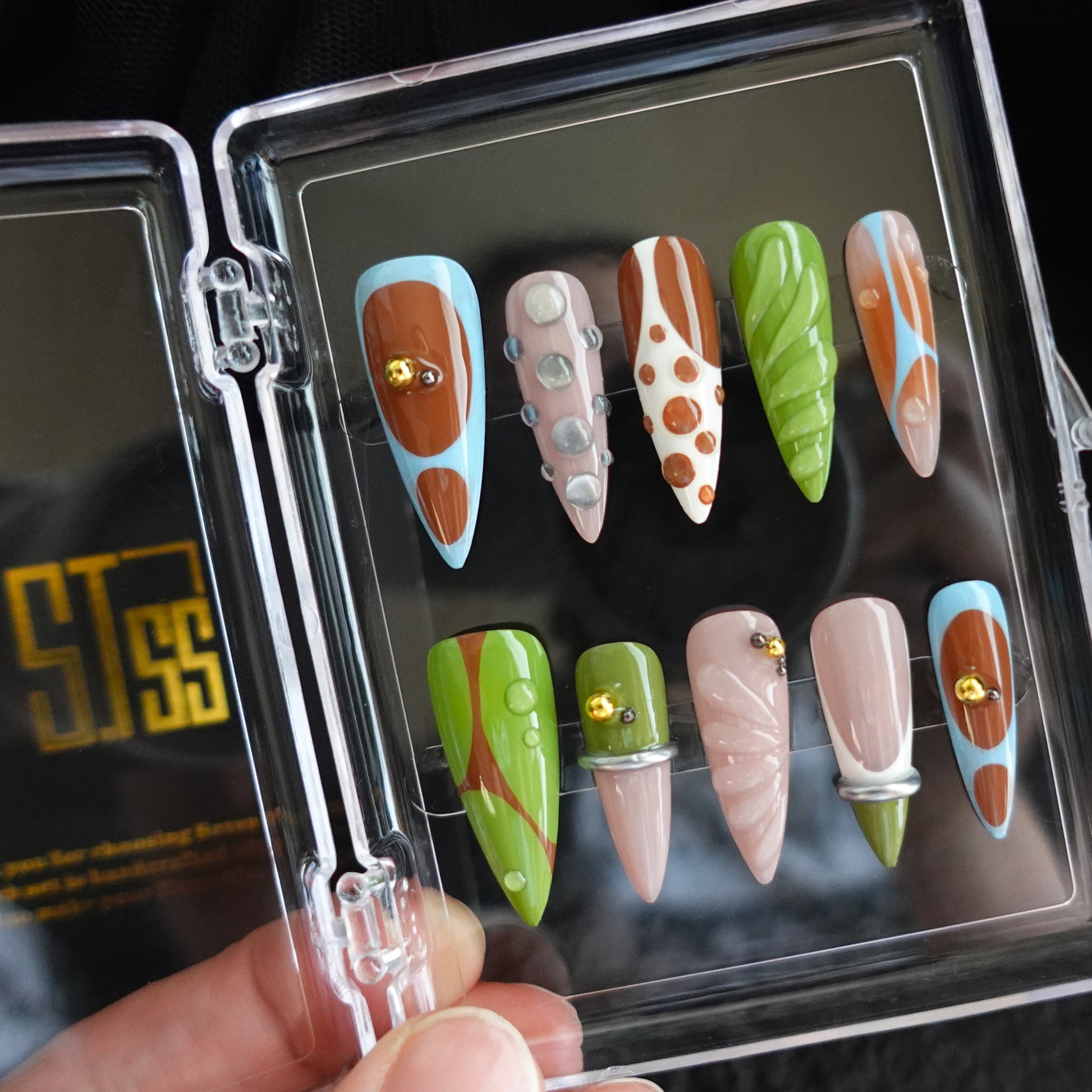 Where earth tones meet future-forward details. Verdant Echo blends sage greens and terracotta clays with sky-blue frames and creamy ivory tips. Sculpted โpodโ droplets, leaf-swirl relief, and petite gold beads are paired with sleek silver ring accents for an organic-meets-modern statement.