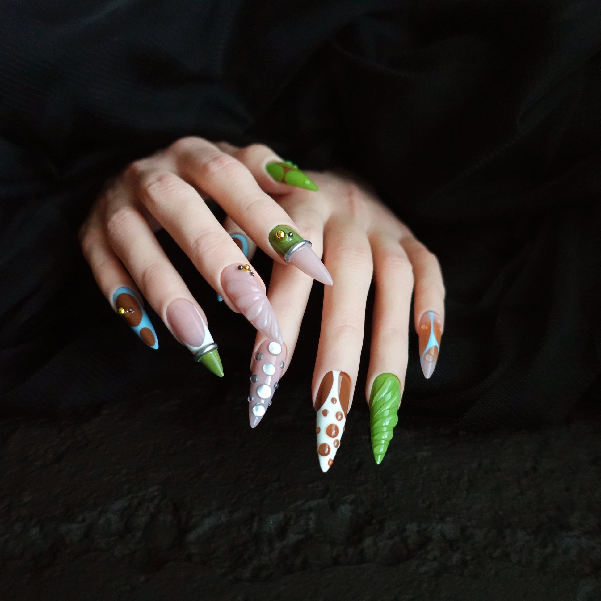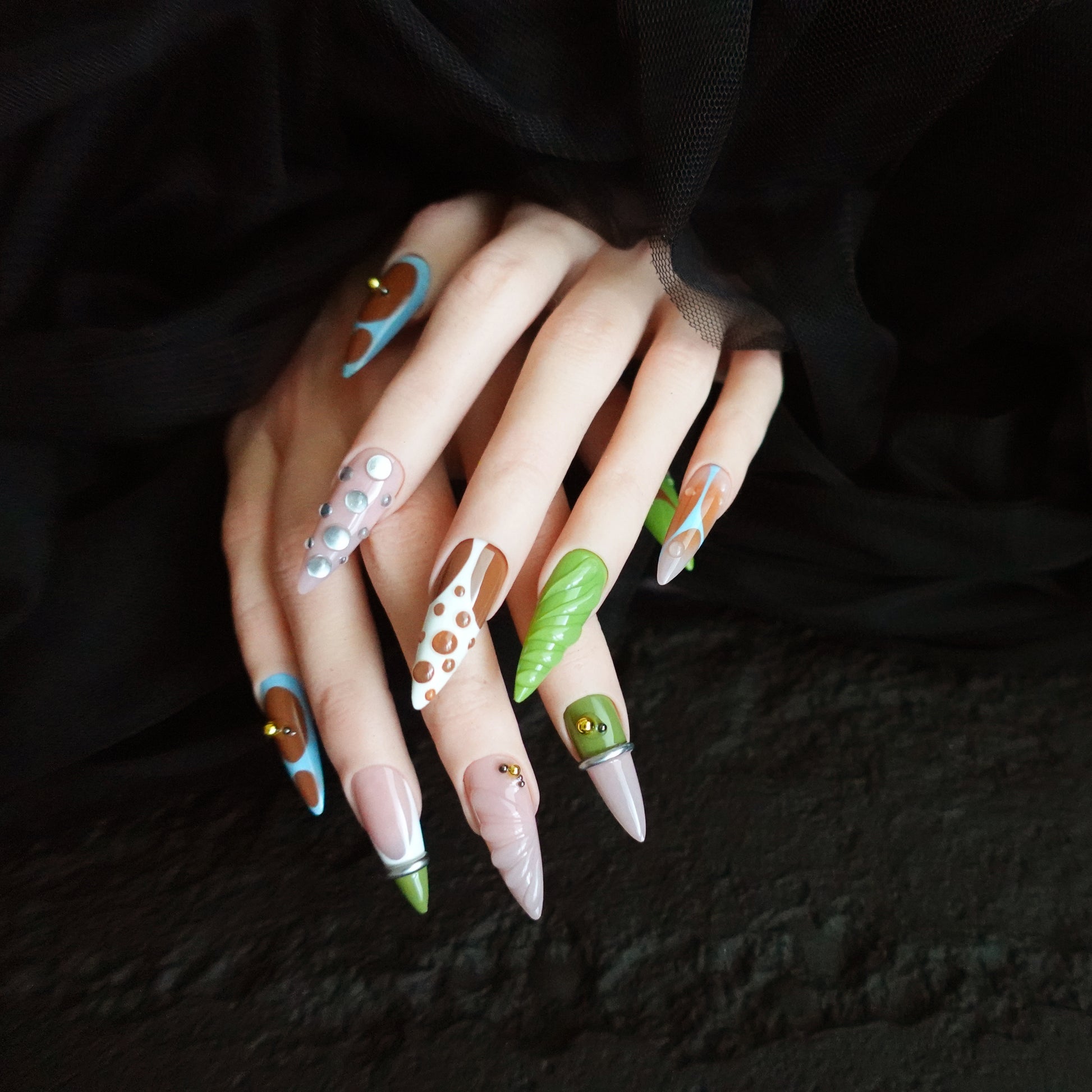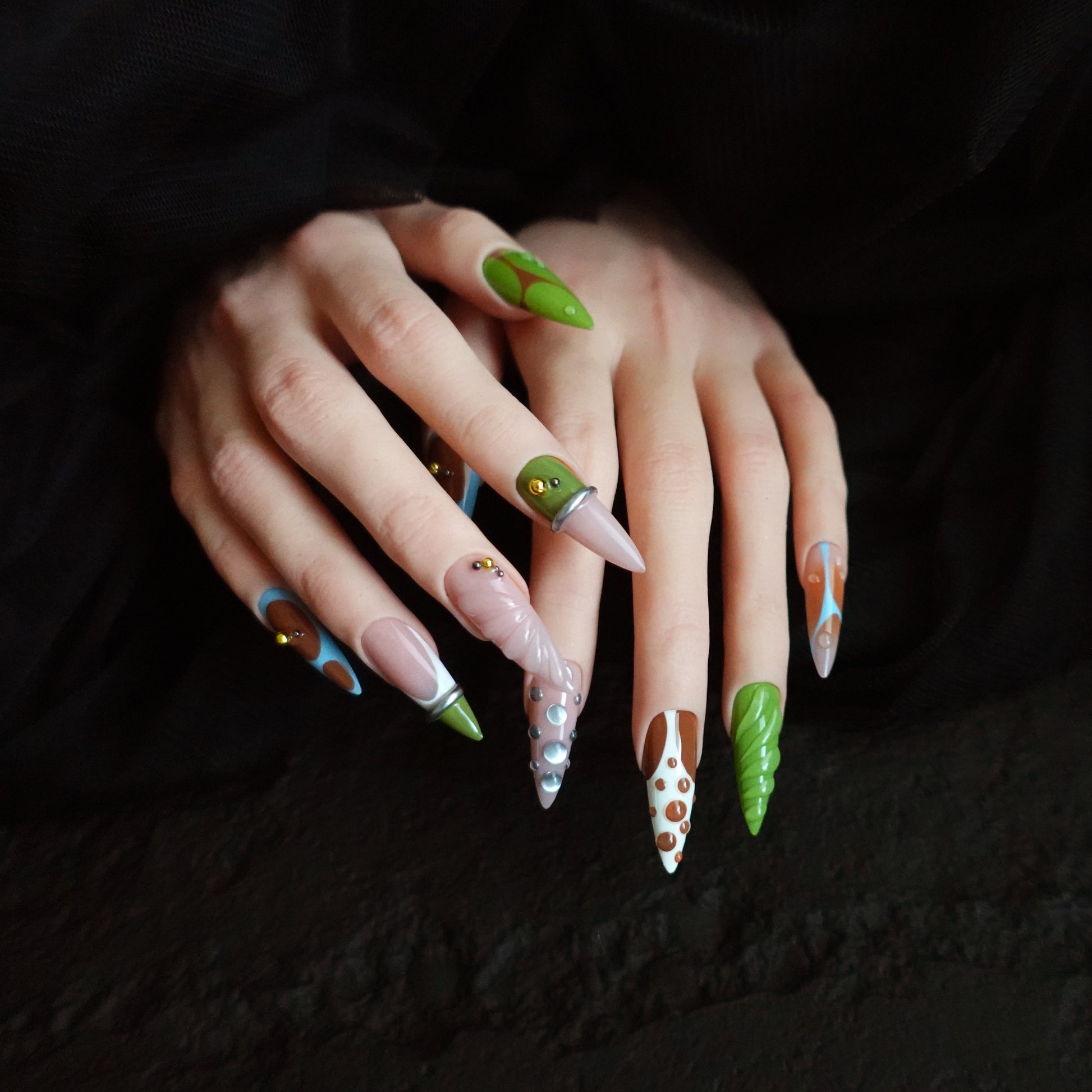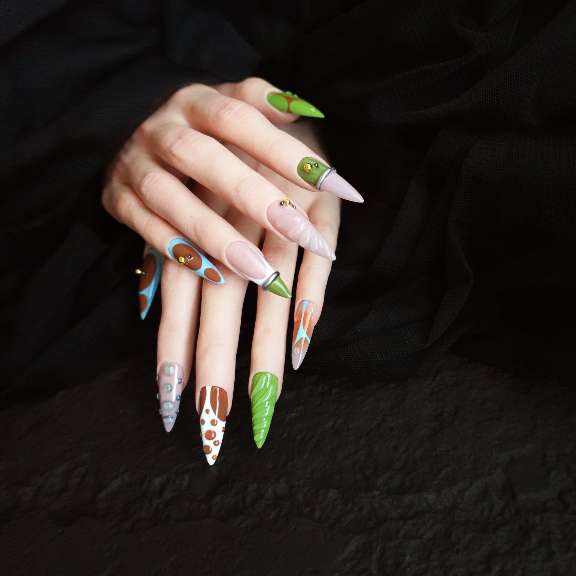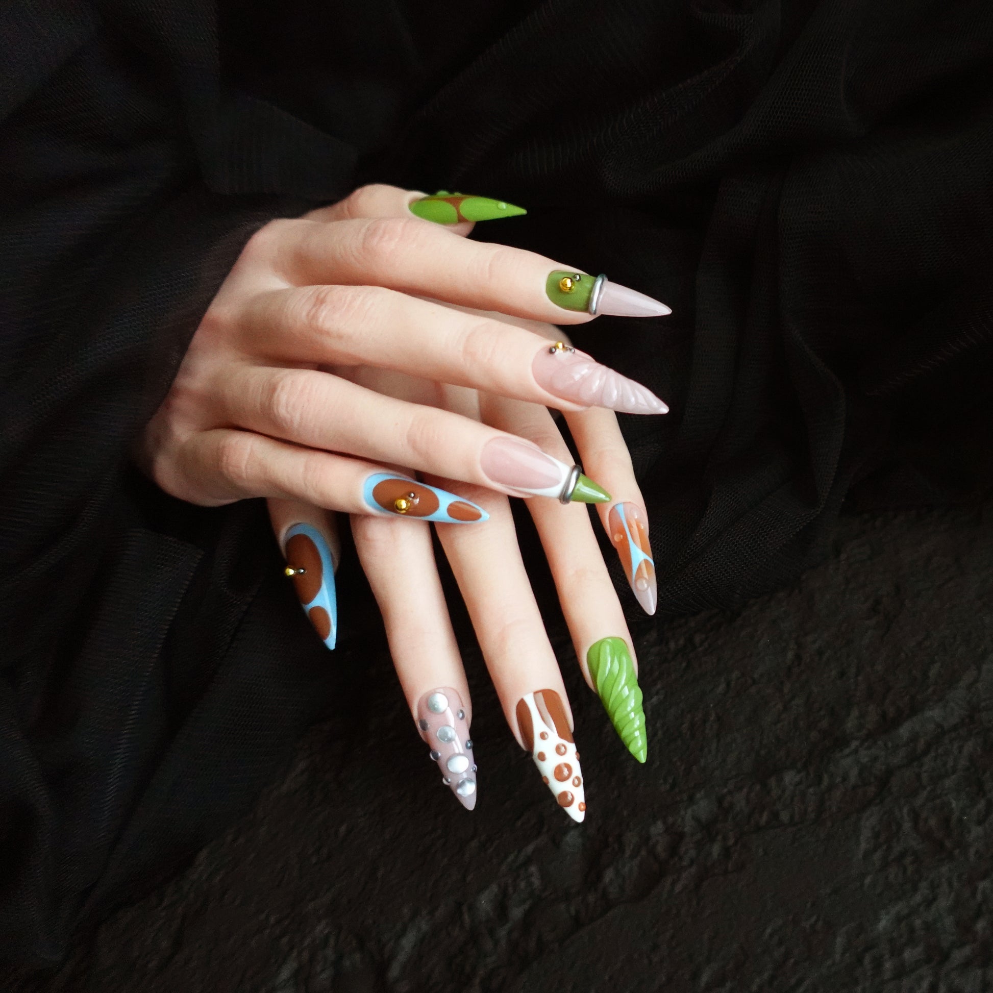 Where earth tones meet future-forward details. Verdant Echo blends sage greens and terracotta clays with sky-blue frames and creamy ivory tips. Sculpted โpodโ droplets, leaf-swirl relief, and petite gold beads are paired with sleek silver ring accents for an organic-meets-modern statement.