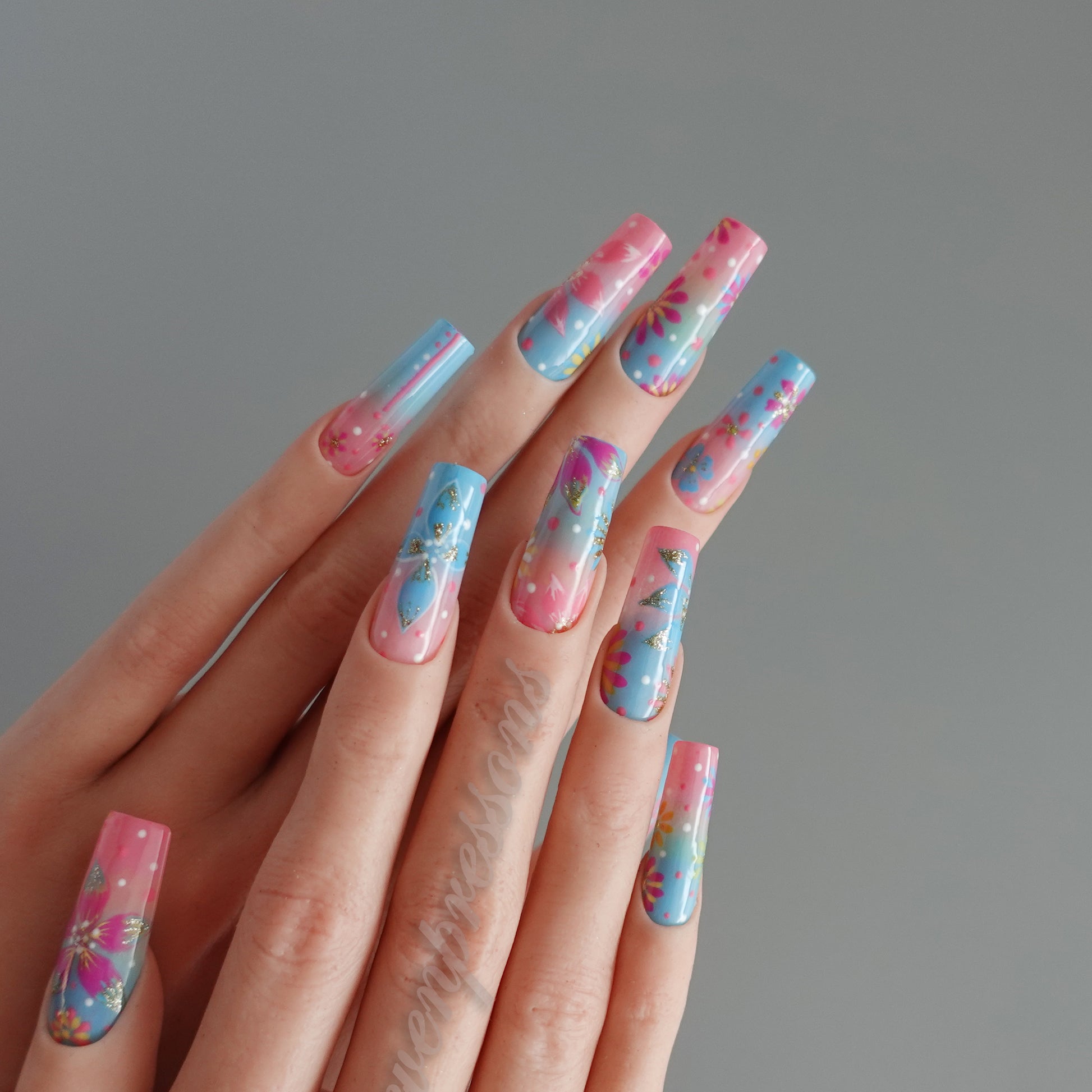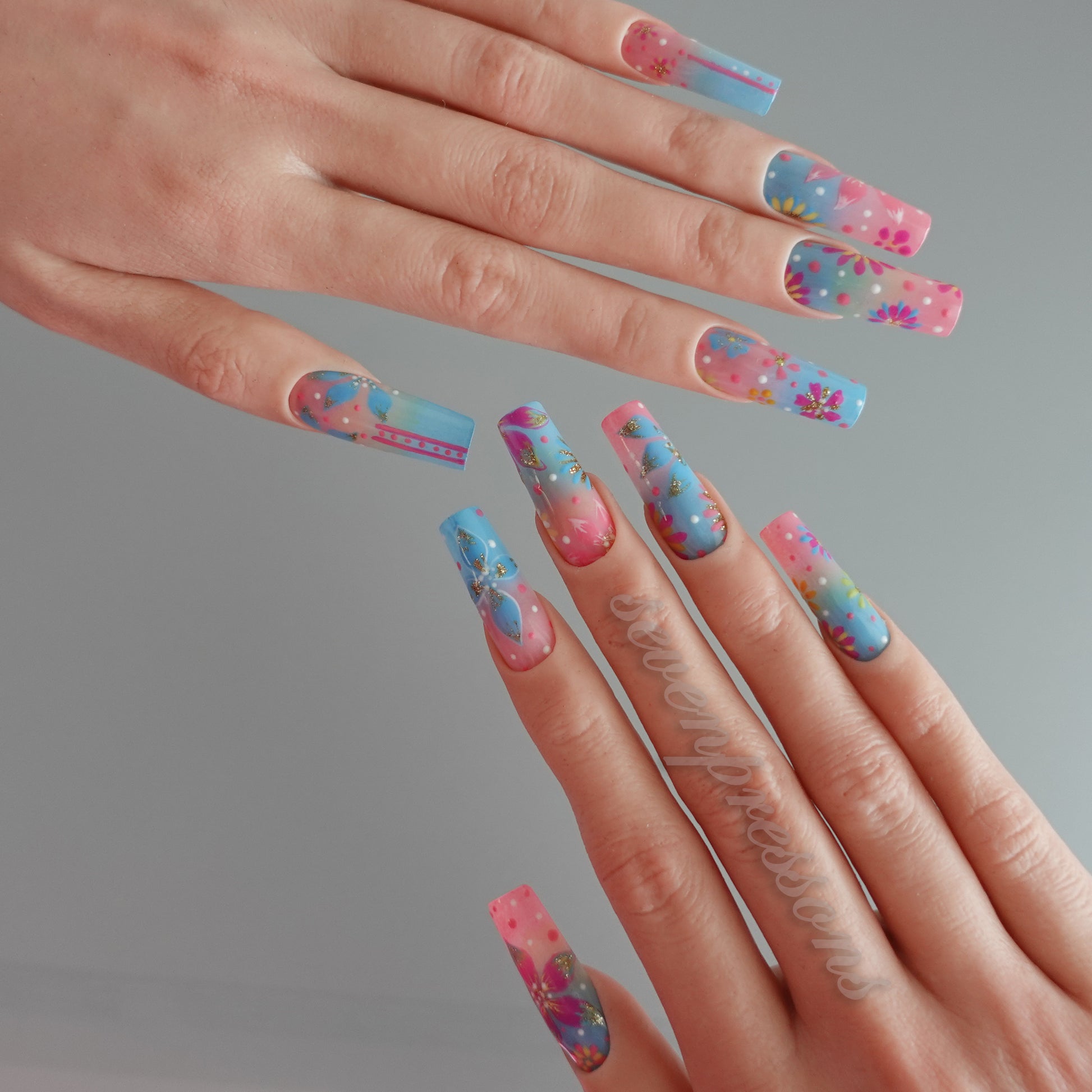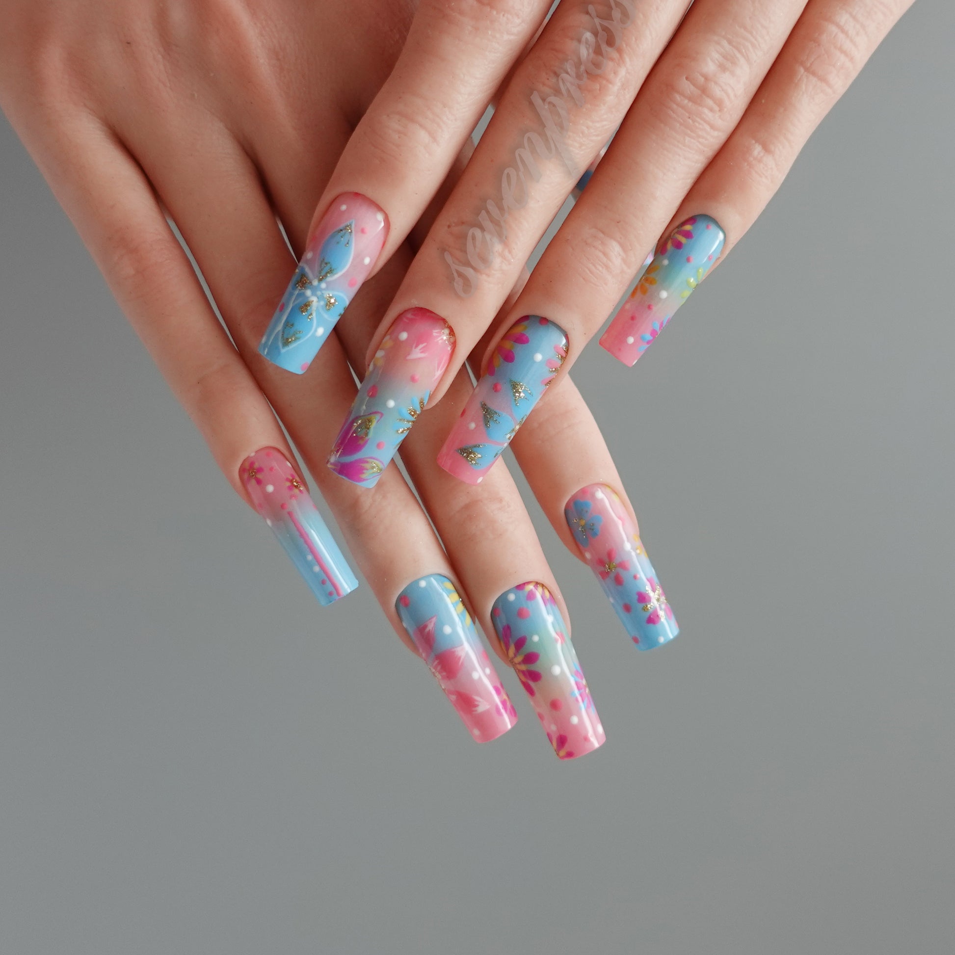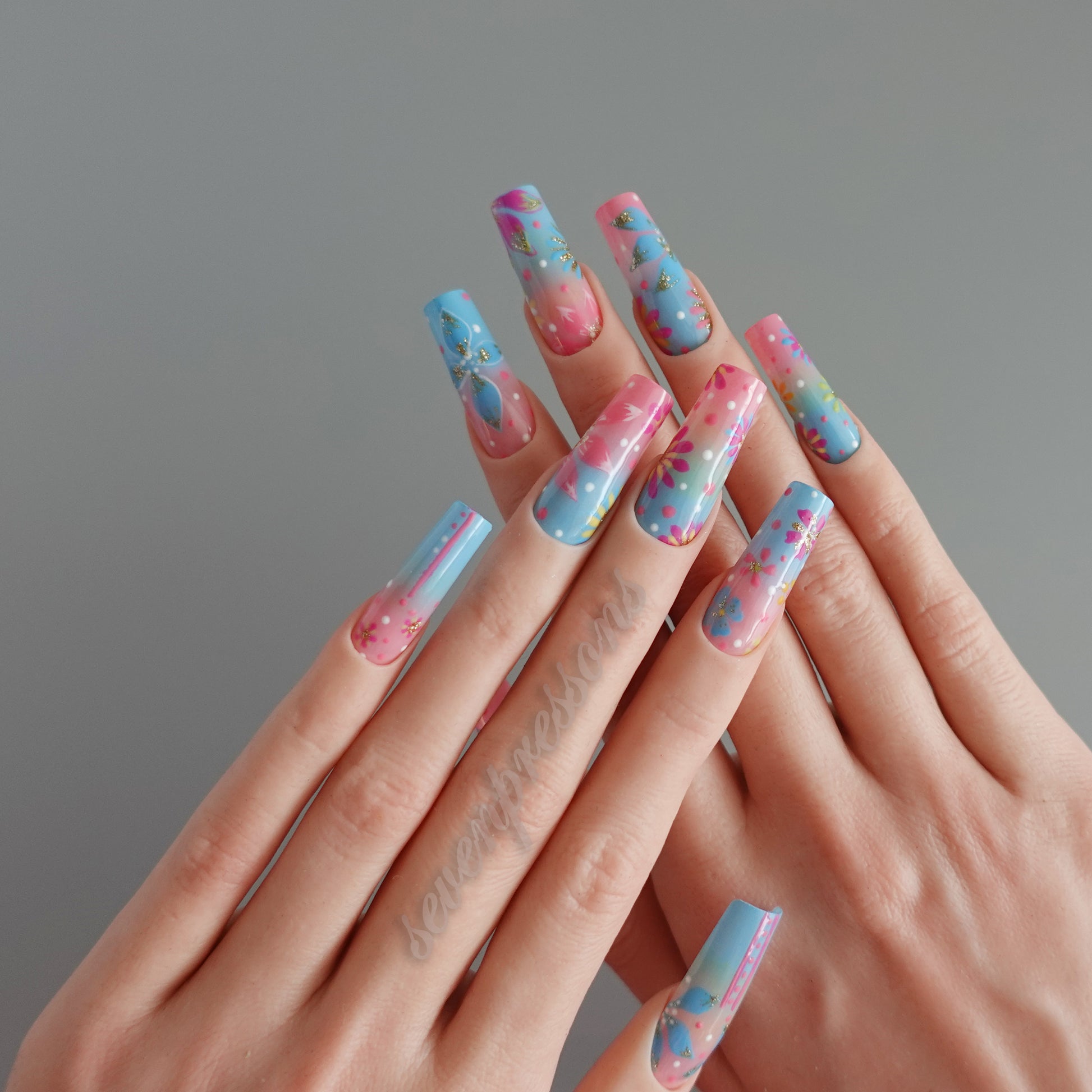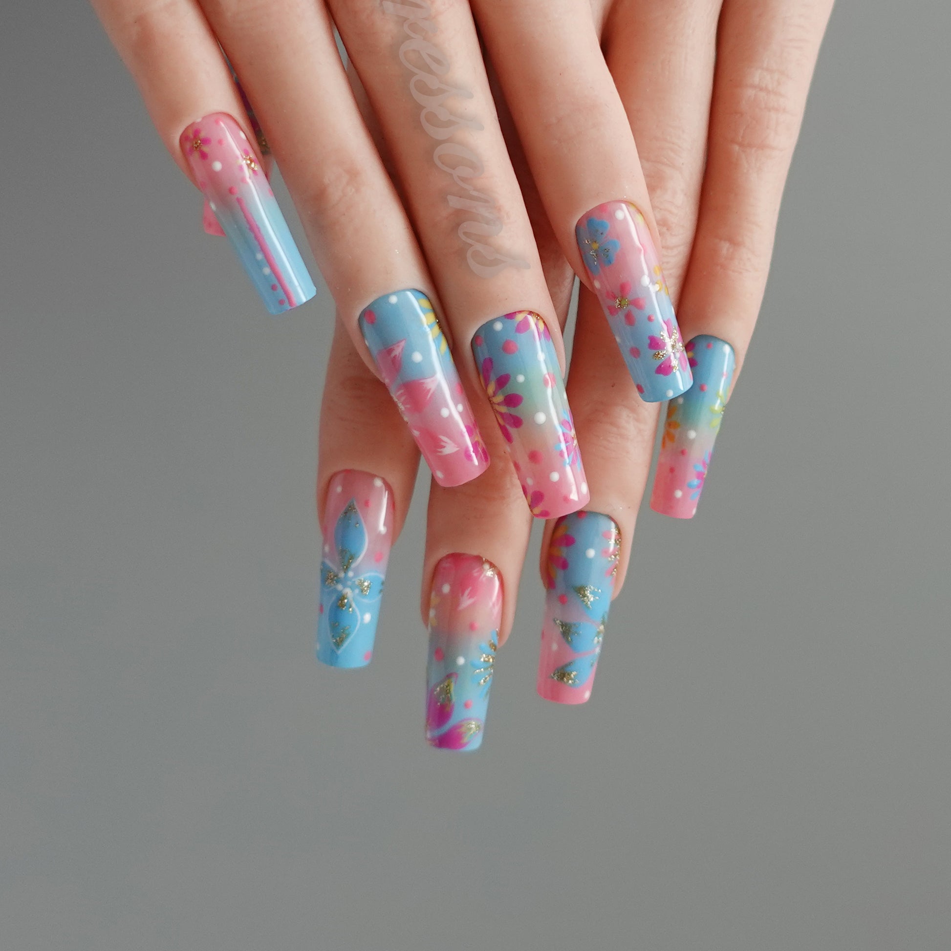 Cotton-candy gradients meet gleaming floral accents โ like confetti dancing under sunshine. Each nail is a tiny carnival of blooming petals and twinkling details, designed for those who live in full color and shine without apology.