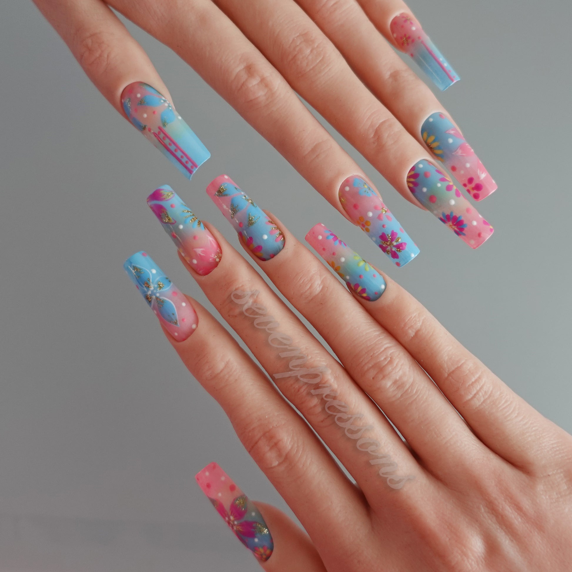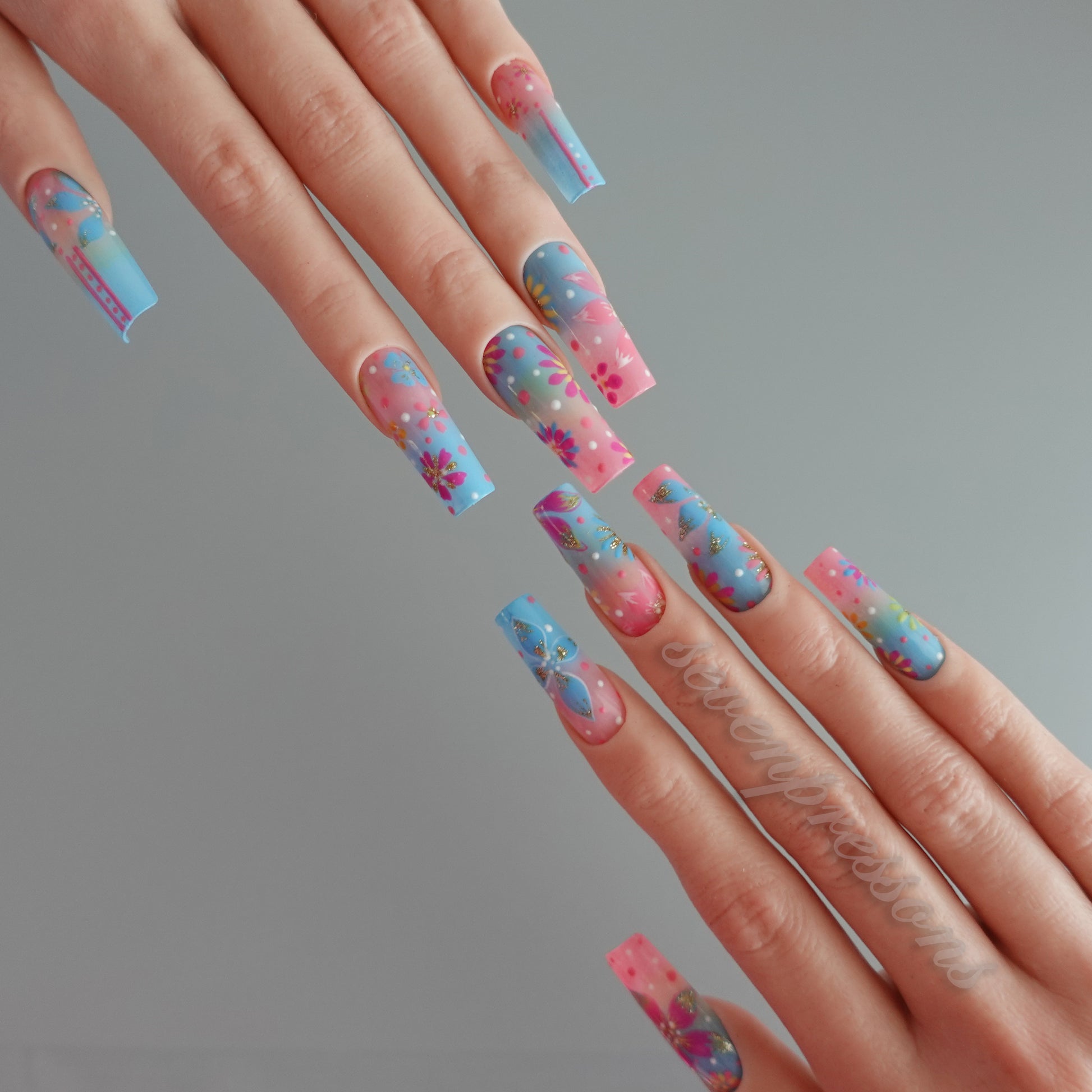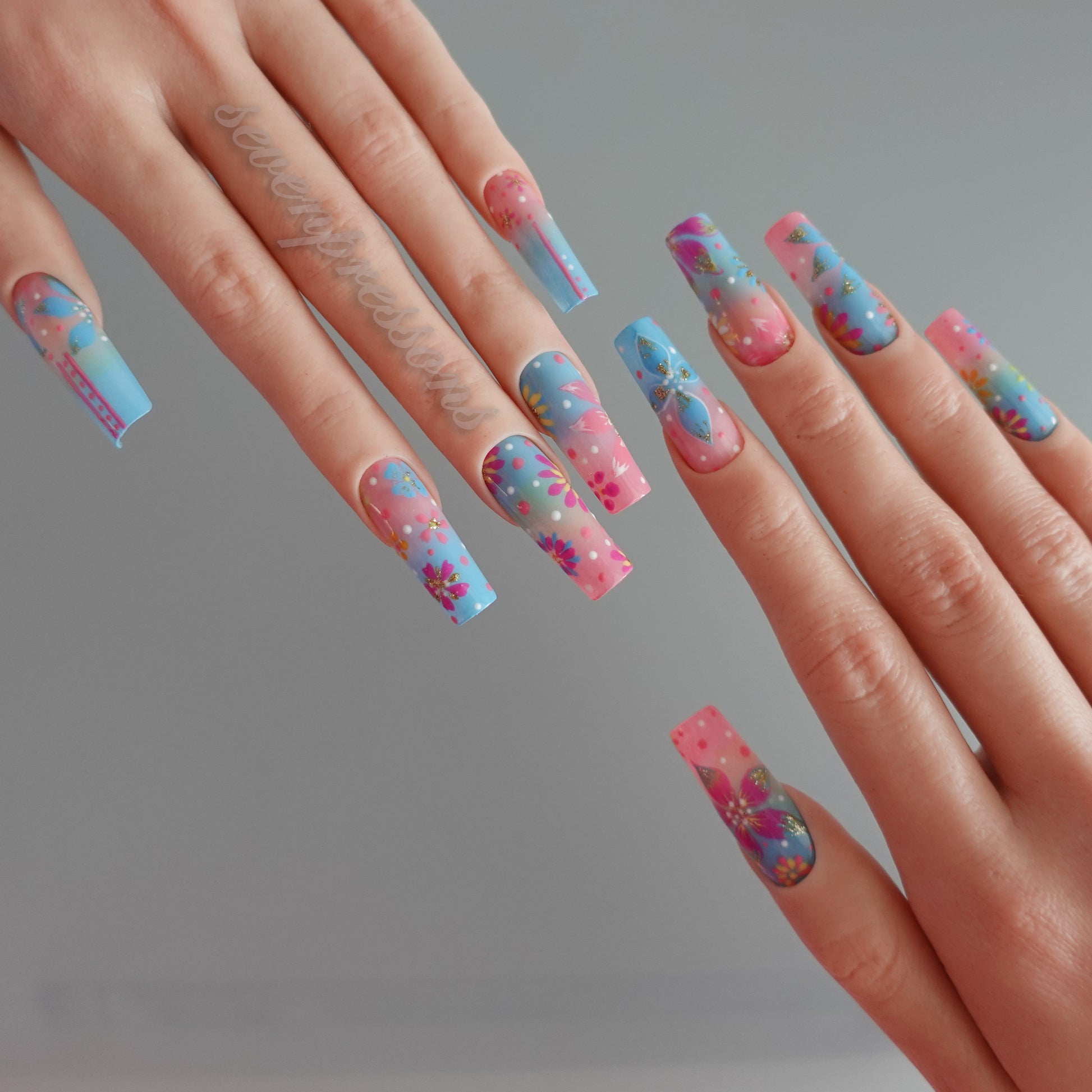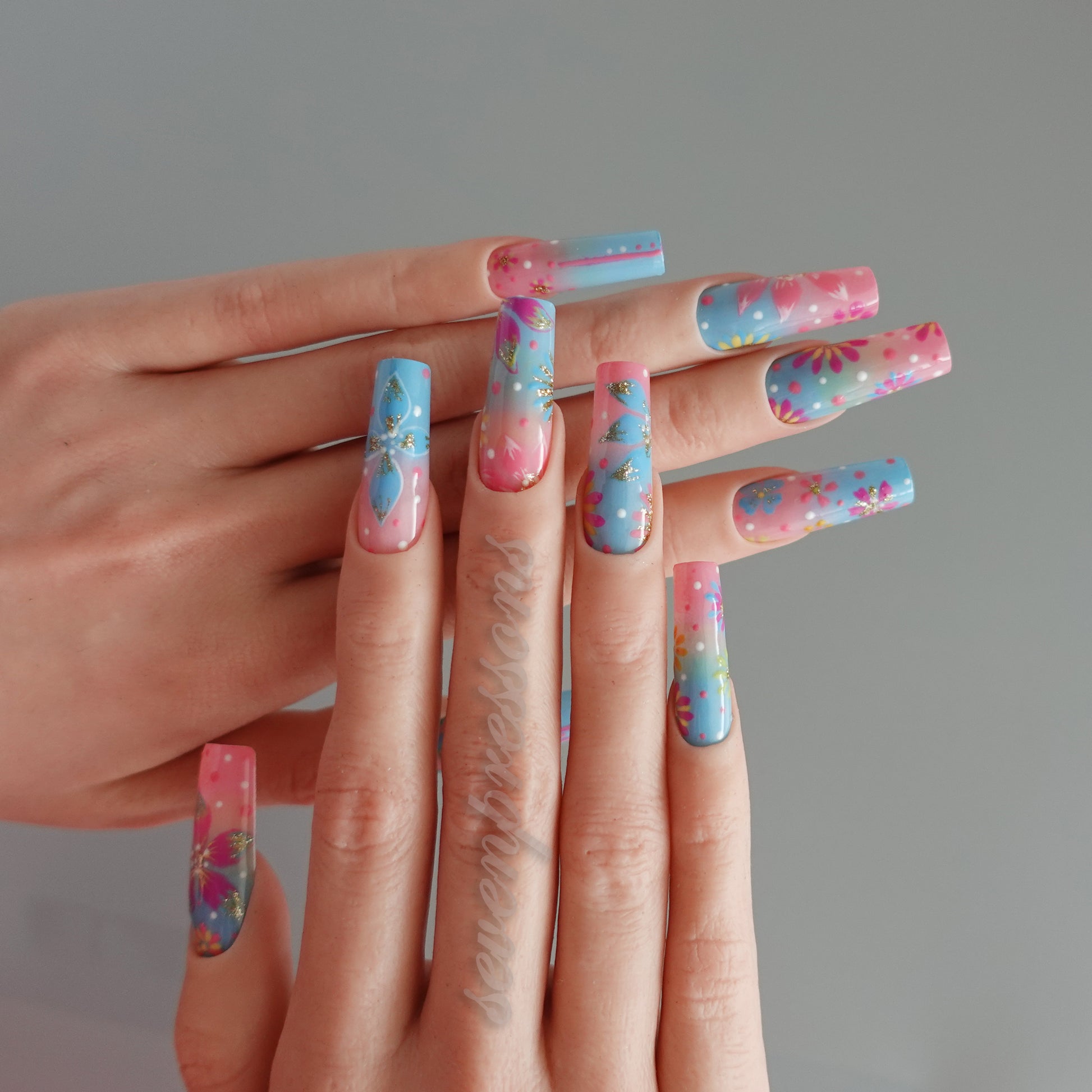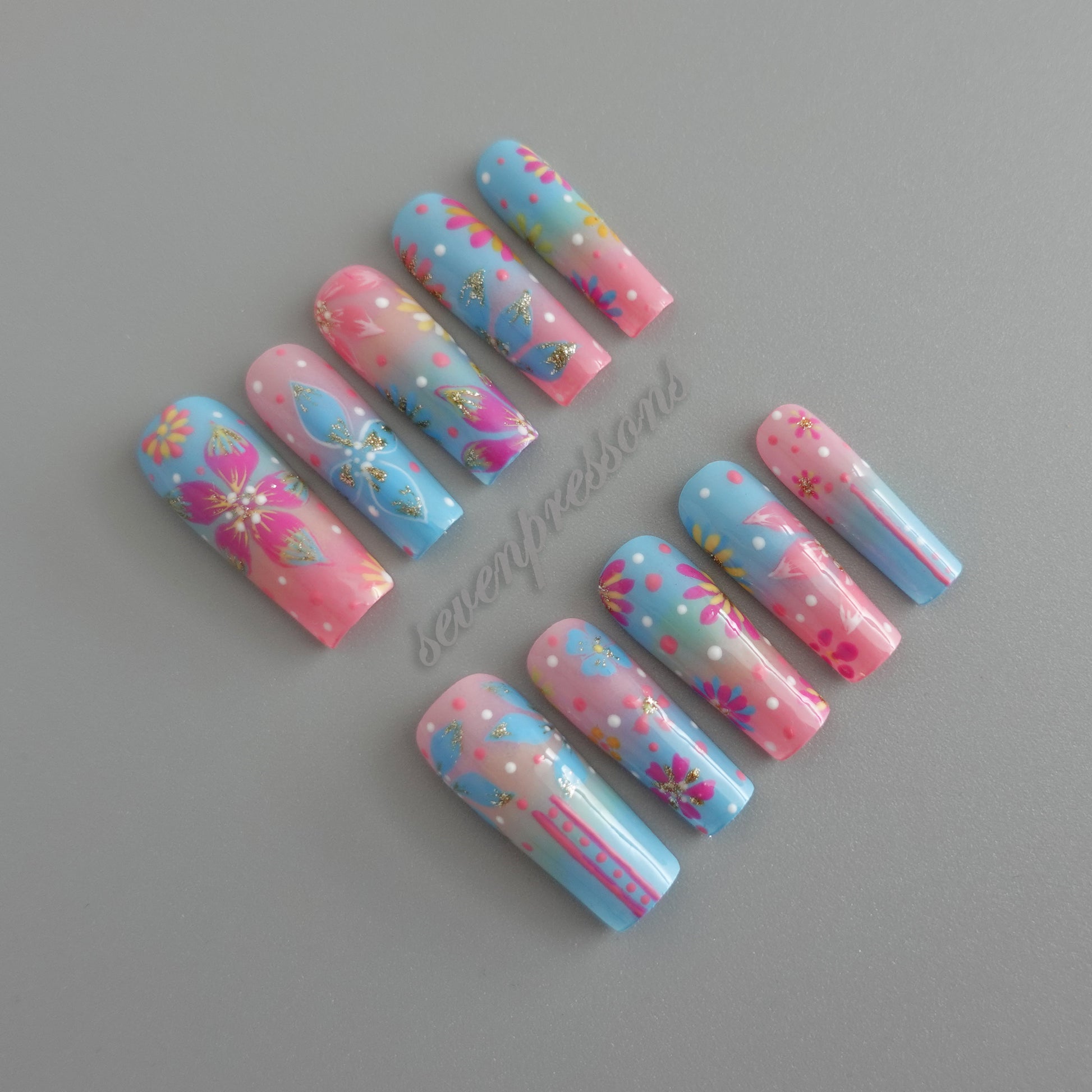 Cotton-candy gradients meet gleaming floral accents โ like confetti dancing under sunshine. Each nail is a tiny carnival of blooming petals and twinkling details, designed for those who live in full color and shine without apology.