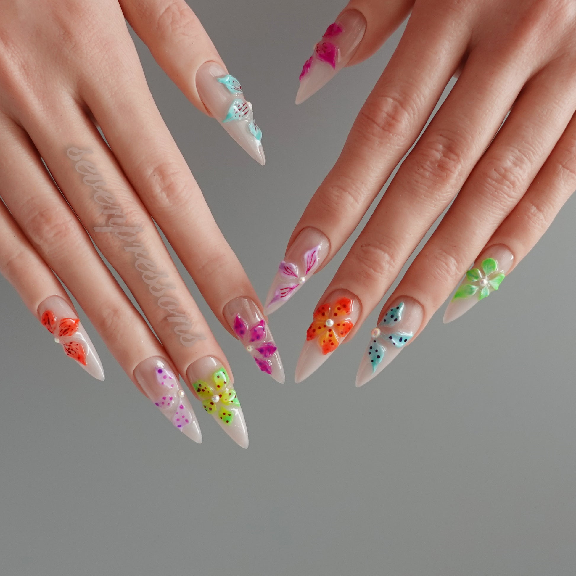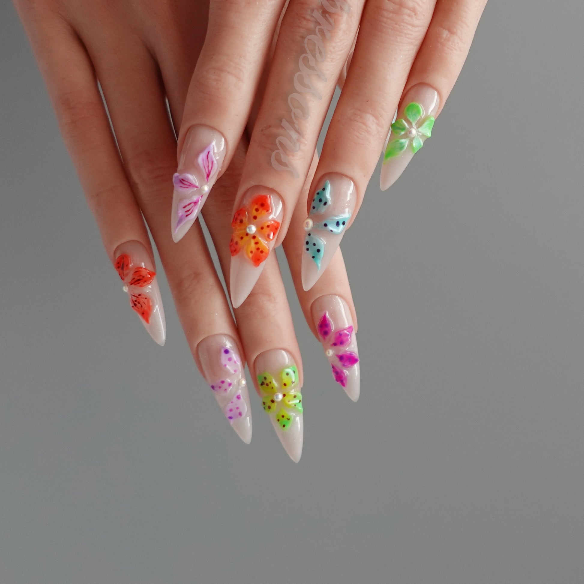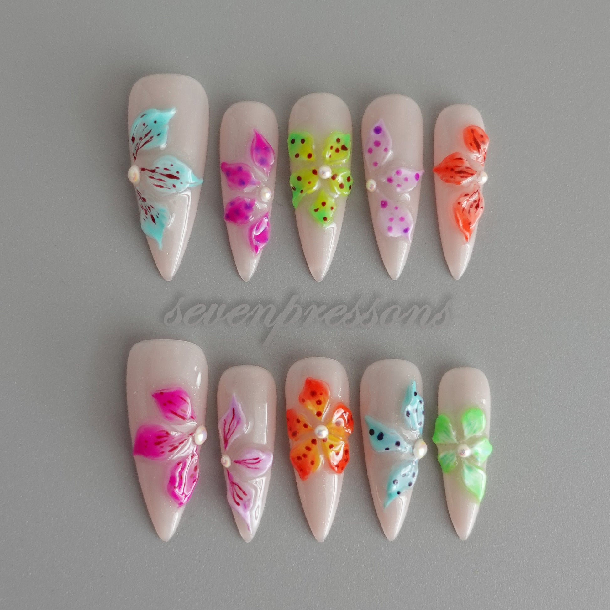 Bloom Pop Mosaic is a playful celebration of color and joy โ each nail blooming with vivid sculpted florals in neon brights. The glossy nude base keeps things chic, while the multicolor petals add a burst of personality โ from punchy orange to dreamy aqua, tropical green, and candy pink.