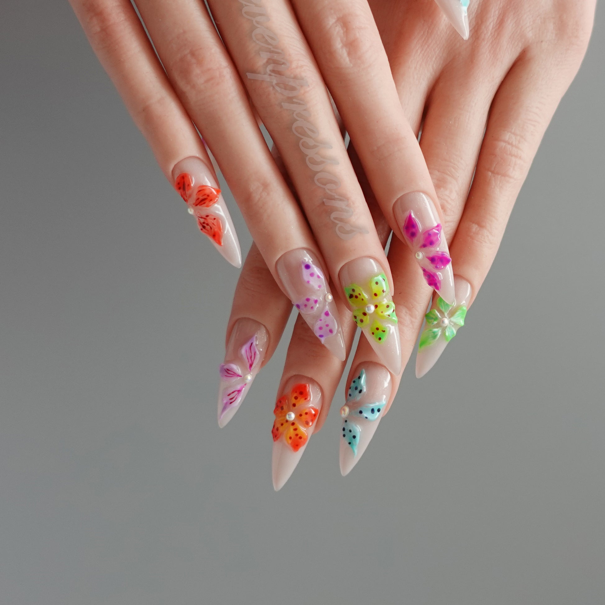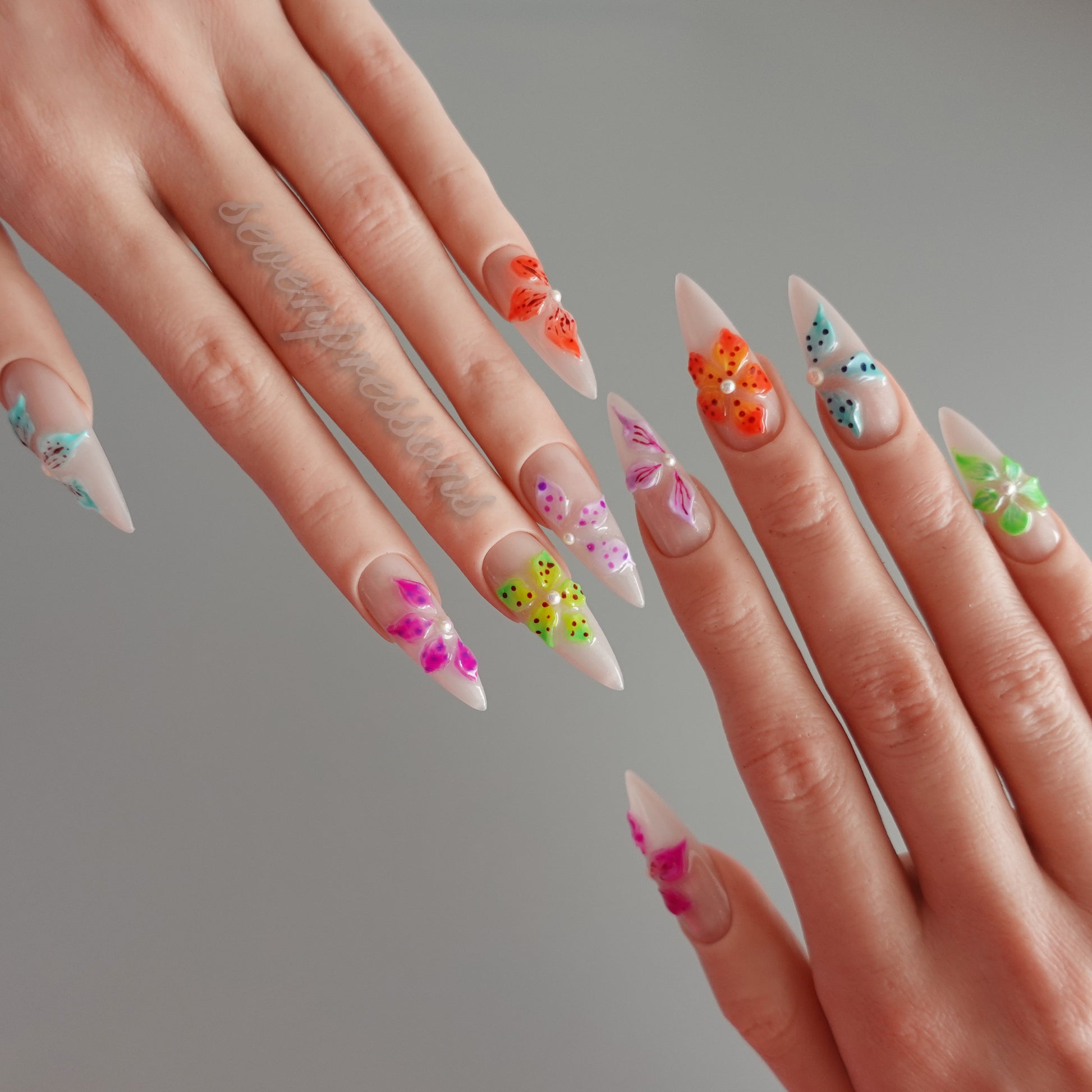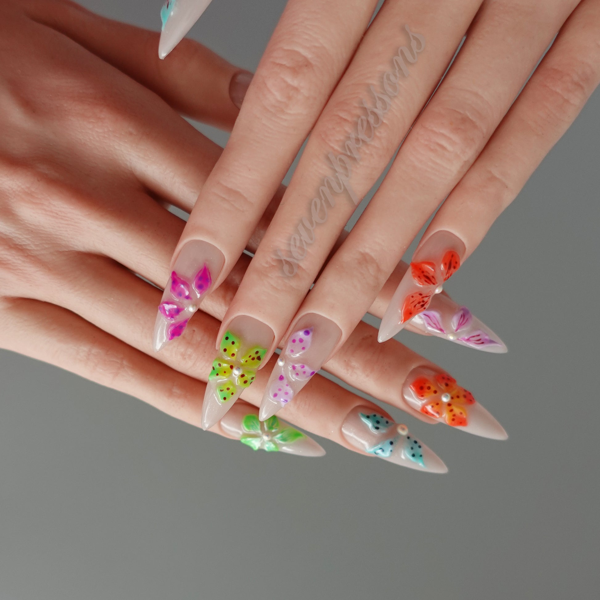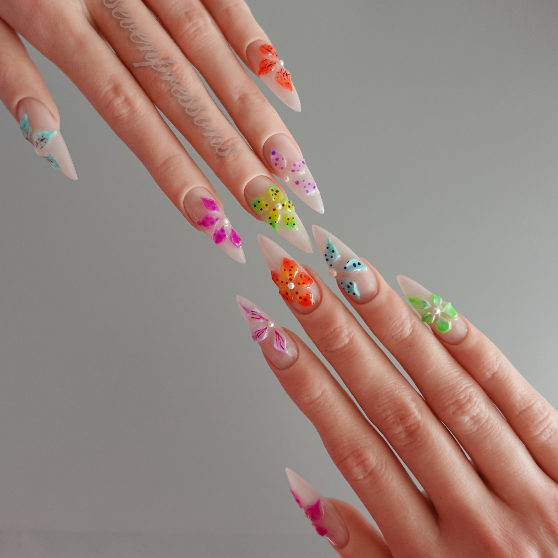 Bloom Pop Mosaic is a playful celebration of color and joy โ each nail blooming with vivid sculpted florals in neon brights. The glossy nude base keeps things chic, while the multicolor petals add a burst of personality โ from punchy orange to dreamy aqua, tropical green, and candy pink.