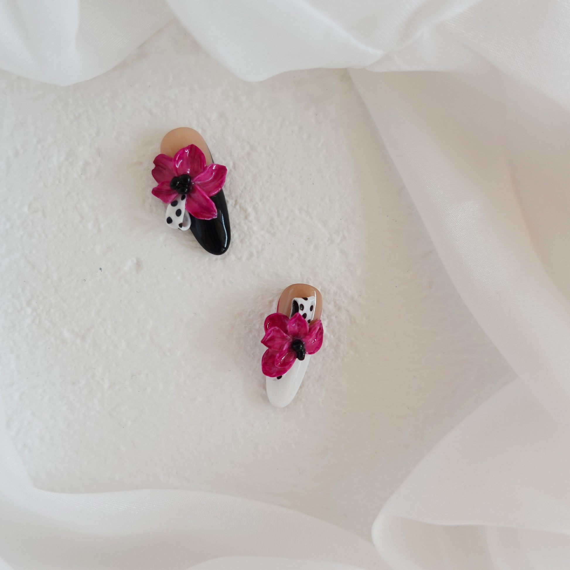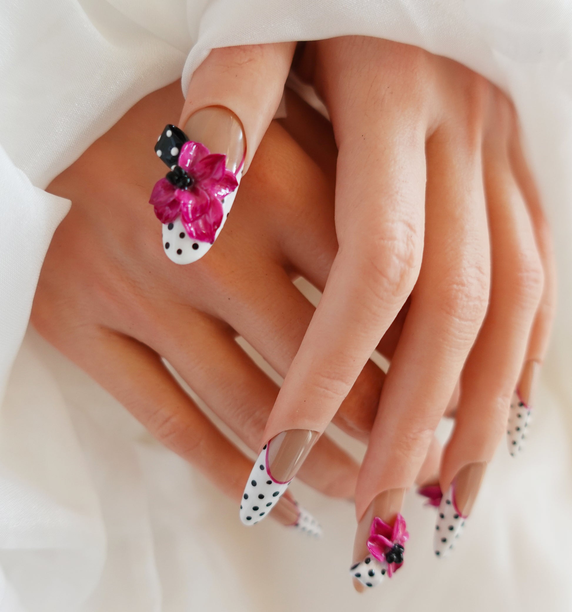 Featuring timeless black-and-white polka dots and chic pink French tips, this handcrafted set is elevated by sculpted 3D hot pink flowers with glossy petals and dramatic bows. The soft nude base adds polish and balance, while the subtle asymmetry in design keeps it fresh, flirty, and fashion-forward.